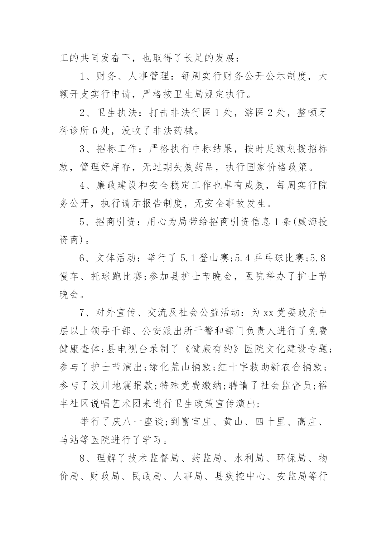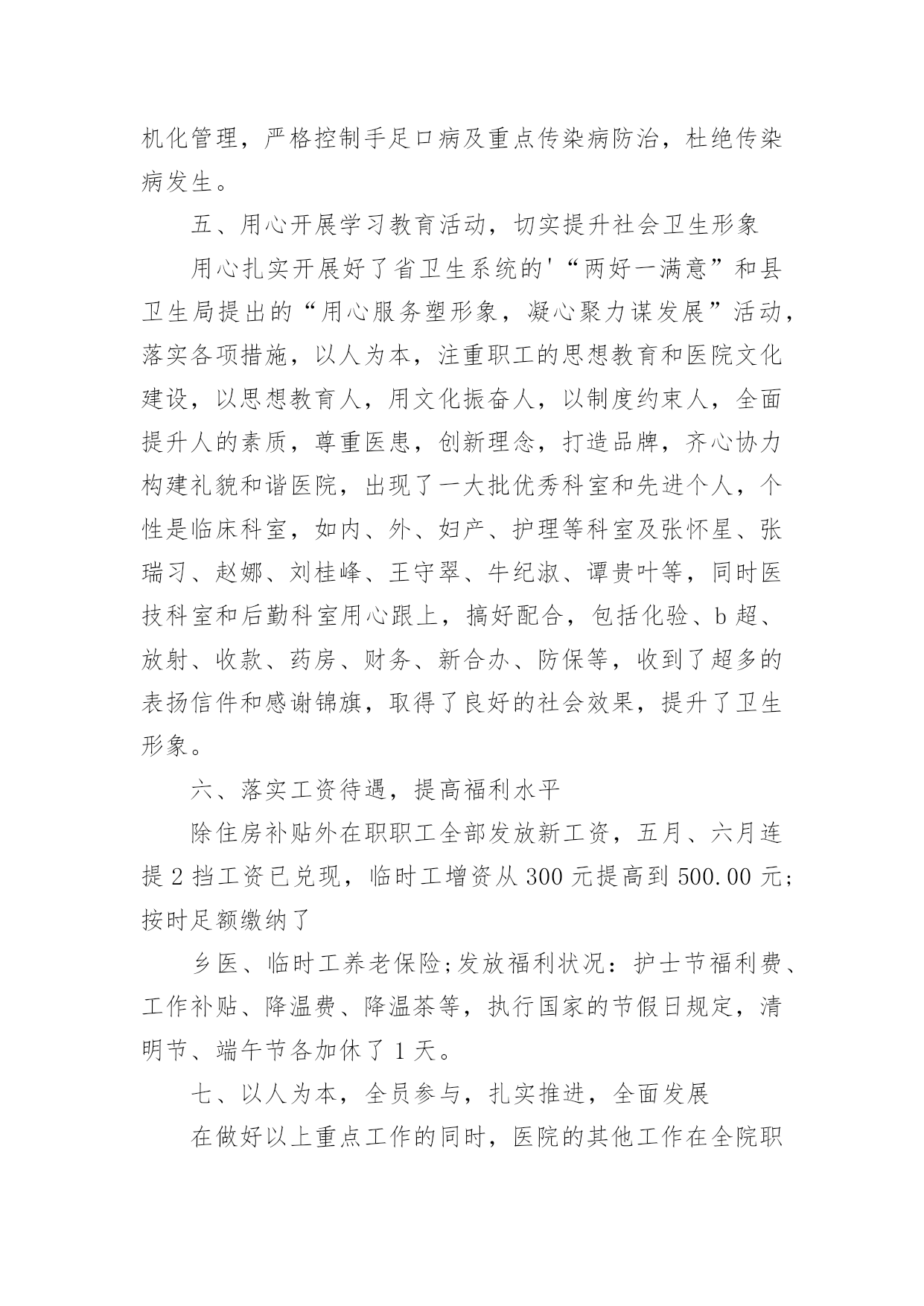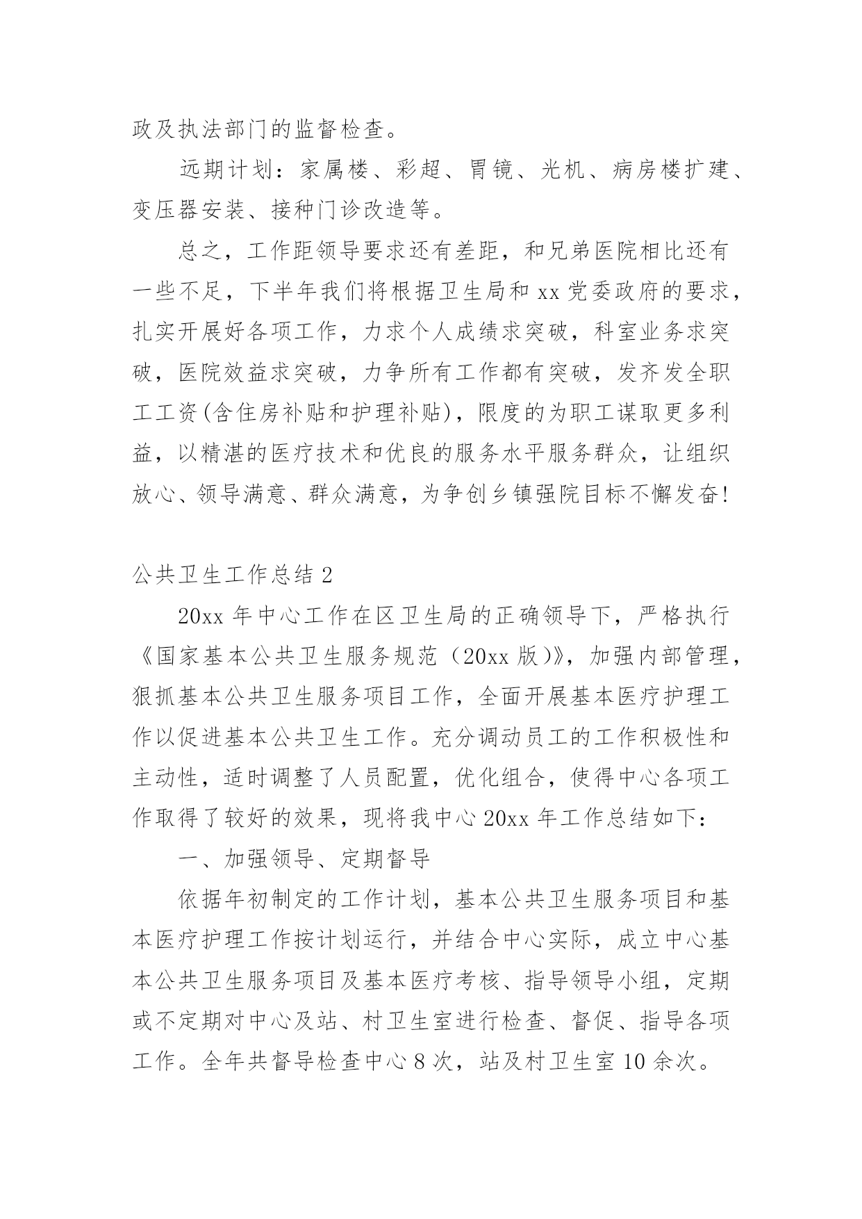 公共卫生工作总结1公共卫生工作总结总结是对过去一定时期的工作、学习或思想情况进行回顾、分析,并做出客观评价的书面材料,它能使我们及时找出错误并改正,让我们一起来学习写总结吧。那么你真的懂得怎么写总结吗?下面是小编整理的公共卫生工作总结,仅供参考,欢迎大家阅读。公共卫生工作总结1xx年,xx中心卫生院在县卫生局和xx镇党委政府的正确领导和大力关心支持下,严格按照卫生局和镇党委政府的指示精神,认真落实卫生局的各项工作要求,以xx为统领,以稳、精、细、实为基础,完善了《xx中心卫生院绩效绩效工资百分制考核方案》,细化了医院管理,以“学习邳州”为契机,结合“两好一满意”和“用心服务塑形象,凝心聚力谋发展”活动,全面落实县乡两级医院业务技术合作,履行年初,深入开展“一切以病人为中心,贯彻完美理念,实施无缝隙服务,争创乡镇强院”活动,真正到达“两好一满意”效果。一、强化医护质量,加快业务发展在原来的基础上,投资余万元,配齐配强设备,加强业务学习,大力发展业务,不断引进新仪器,推广新技术,使用新疗法。如:心电监护仪购进、婴儿辐射台、护理对讲、无痛分娩、骨外手术、心脑血管病防治等;切实提高医护质量,杜绝医疗事故的发生,门诊就诊量及住院人次大幅上升,开展手术208例,临床及医技业务不断提升,总收入元,去年元,比去年同期增长元,同比增长。其中医院收入1xx元,增长元,涨幅;一体化收入元,增长元,涨幅;医疗收入元;药品收入元(药占比)。二、完善基础设施建设,优化医疗服务环境今年共投资余万元,下大力气进行基础设施建设:院内绿化、门诊楼改扩建工程、装修工程(墙面、地面、门窗、窗帘、防水),病房护理单元配备、优抚病房建设(空调、电视配备)、有菌手术室建设、化验室建设(空调配备)、排水、防蝇、30千瓦发电机等,尽发奋优化服务环境,改善服务条件。三、认真落实新农合政策,限度让农民受益xx月份新农合门诊报销元,住院报销元,帐户冲减,共报销金额到达,受益农民为人。截至日,共报销元,受益人次,滚动筹资人,筹集资金元,占参合人口的%。真正落实好新农合政策,切实让参合农民得实惠。四、搞好社会卫生,确保群众健康1、一体化管理:根据卫生局要求卫生室进行了并减,今年建成甲级卫生室5处,社区服务站1处,下半年争取3处。2、防疫及卫生监督:搞好了预防接种及省级示范化门诊运转,启用了预防接种信息卡,适龄儿童免疫规划实行微机化管理,严格控制手足口病及重点传染病防治,杜绝传染病发生。五、用心开展学习教育活动,切实提升社会卫生形象用心扎实开展好了省卫生系统的'“两好一满意”和县卫生局提出的“用心服务塑形象,凝心聚力谋发展”活动,落实各项措施,以人为本,注重职工的思想教育和医院文化建设,以思想教育人,用文化振奋人,以制度约束人,全面提升人的素质,尊重医患,创新理念,打造品牌,齐心协力构建礼貌和谐医院,出现了一大批优秀科室和先进个人,个性是临床科室,如内、外、妇产、护理等科室及张怀星、张瑞习、赵娜、刘桂峰、王守翠、牛纪淑、谭贵叶等,同时医技科室和后勤科室用心跟上,搞好配合,包括化验、b超、放射、收款、药房、财务、新合办、防保等,收到了超多的表扬信件和感谢锦旗,取得了良好的社会效果,提升了卫生形象。六、落实工资待遇,提高福利水平除住房补贴外在职职工全部发放新工资,五月、六月连提2挡工资已兑现,临时工增资从300元提高到500.00元;按时足额缴纳了乡医、临时工养老保险;发放福利状况:护士节福利费、工作补贴、降温费、降温茶等,执行国家的节假日规定,清明节、端午节各加休了1天。七、以人为本,全员参与,扎实推进,全面发展在做好以上重点工作的同时,医院的其他工作在全院职工的共同发奋下,也取得了长足的发展:1、财务、人事管理:每周实行财务公开公示制度,大额开支实行申请,严格按卫生局规定执行。2、卫生执法:打击非法行医1处,游医2处,整顿牙科诊所6处,没收了非法药械。3、招标工作:严格执行中标结果,按时足额划拨招标款,管理好库存,无过期失效药品,执行国家价格政策。4、廉政建设和安全稳定工作也卓有成效,每周实行院务公开,执行请示报告制度,无安全事故发生。5、招商引资:用心为局带给招商引资信息1条(威海投资商)。6、文体活动:举行了5.1登山赛;5.4乒乓球比赛;5.8慢车、托球跑比赛;参加县护士节晚会,医院举办了护士节晚会。7、对外宣传、交流及社会公益活动:为xx党委政府中层以上领导干部、公安派出所干警和部门负责人进行了免费健康查体;县电视台录制了《健康有约》医院文化建设专题;参与了护士节演出;绿化荒山捐款;红十字救助新农合捐款;参与了汶川地震捐款;特殊党费缴纳;聘请了社会监督员;裕丰社区说唱艺术团来进行卫生政策宣传演出;举行了庆八一座谈;到富官庄、黄山、四十里、高庄、马站等医院进行了学习。8、理解了