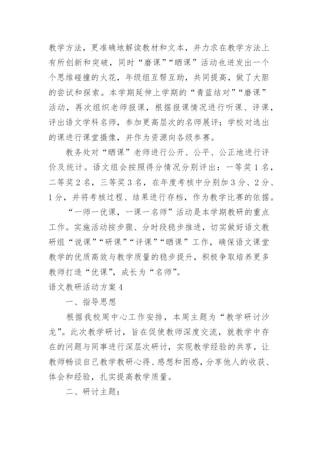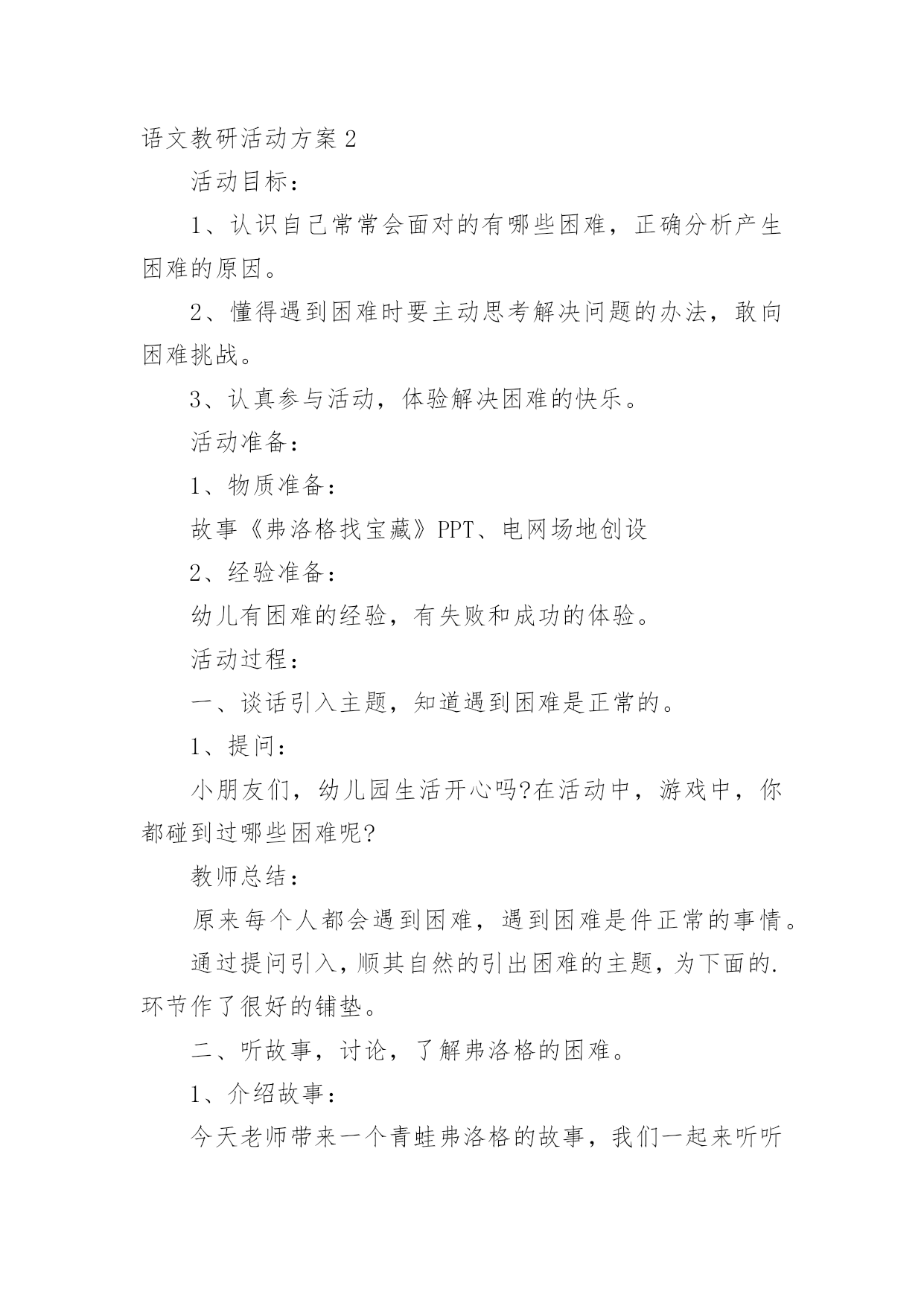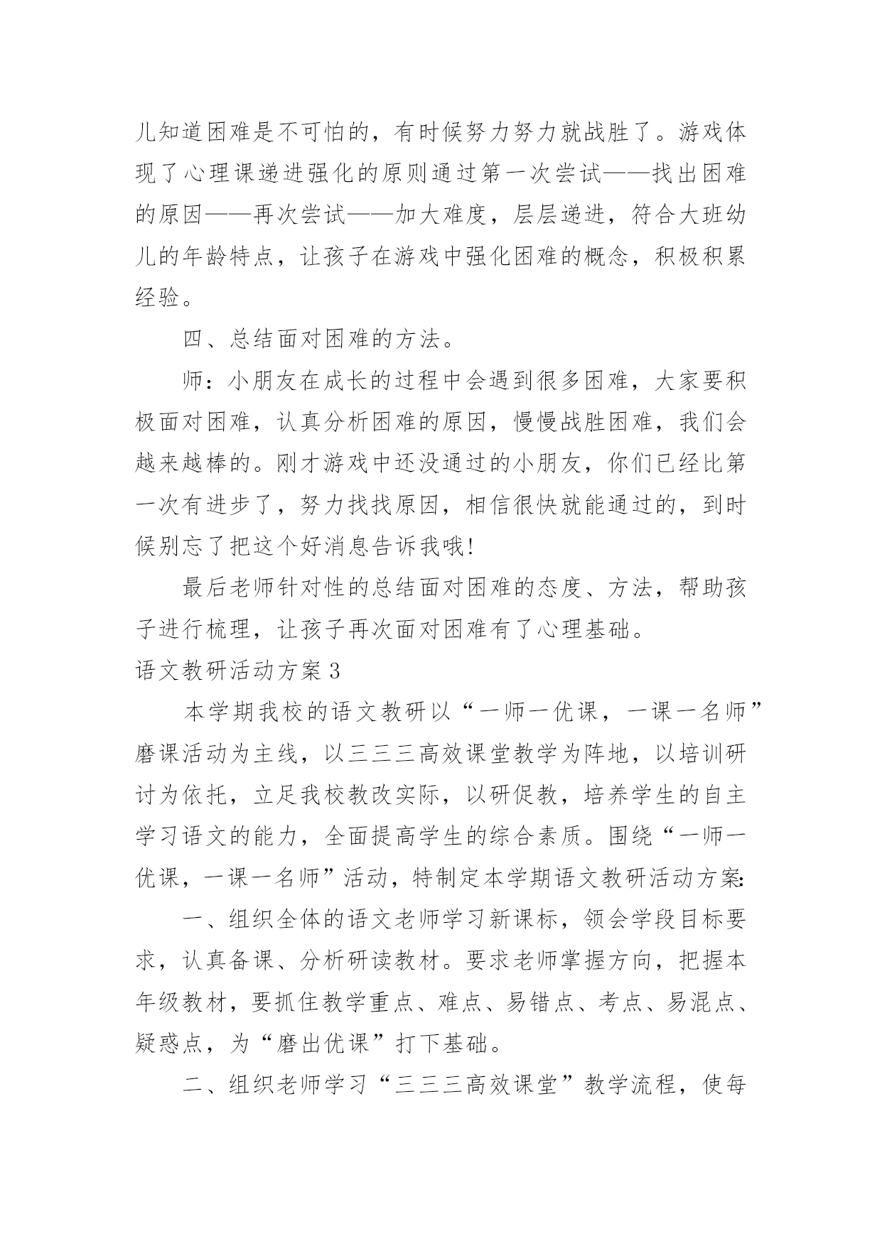 语文教研活动方案语文教研活动方案为了保障事情或工作顺利、圆满进行,预先制定方案是必不可少的,方案一般包括指导思想、主要目标、工作重点、实施步骤、政策措施、具体要求等项目。方案的格式和要求是什么样的呢?以下是小编精心整理的语文教研活动方案,欢迎阅读,希望大家能够喜欢。语文教研活动方案1一、主题教研背景随着信息技术的飞速发展,“微文化”悄然诞生,“微时代”的到来,让人们渐渐了解并熟悉一个新名词——“微课程”,校园里渐渐涌现出一股“微课”的热潮。微课是指基于教学设计思想,使用多媒体技术在五到十分钟左右就一个知识点进行针对性讲解的一段音频或视频。在教育教学中,微课所讲授的内容呈“点”状、碎片化,这些知识点,可以是教材解读、题型精讲、考点归纳;也可以是方法传授、教学经验等技能方面的知识讲解和展示。在语文教学中应用微课,可以推进信息技术与语文教学内容的深层次融合,实现优质教育环境的创建,从而更好的促进素质教育的普及以及学生学习成绩的有效提高。二、主题教研的内容------利用微课突破教学重难点”(一)微课解决的问题是教学中的重点难点一节微课一般讲授一个知识点,对于这个知识点的选择,关乎知识结构的设计,对于教学中的.重点难点用来制作微课,是一个较好的选择,较为符合微课制作的初衷:教学资源分享,为学生(教师)解惑,启发教学。(二)要适合用多媒体表达微课作为一种媒体,内容的设计要适合使用多媒体特性,对于不适合使用多媒体表达的内容,制作的结果也许是徒劳的,因为也许使用黑板教学或进行活动实践的教学效果更佳。同时也会使教学过程平庸无奇,令观看者失去学习欲望。因而微课选题要适合使用多媒体表达,适合加入丰富的图形图像、多姿的动画、声色兼有的视频。(三)微课要适合教学对象对于不同水平的学生,传授的方法乃至内容应该有有差异,进行个别化教学,这也是符合我们微课理念的。(四)活动安排:1、主题学习:进行主题学习,在教研组进行交流。每次发言要有主讲人,课题,时间和地点。2、上课研讨---借公开课对每个小主题的实施情况具体化-----备课上课都也结合自己的主题进行教学活动。3、评课活动-----效率如何,要通过课堂效率评价,力求有效的课堂提问。4、学期总结-----对这学期的主题教研要有个总结。语文教研活动方案2活动目标:1、认识自己常常会面对的有哪些困难,正确分析产生困难的原因。2、懂得遇到困难时要主动思考解决问题的办法,敢向困难挑战。3、认真参与活动,体验解决困难的快乐。活动准备:1、物质准备:故事《弗洛格找宝藏》PPT、电网场地创设2、经验准备:幼儿有困难的经验,有失败和成功的体验。活动过程:一、谈话引入主题,知道遇到困难是正常的。1、提问:小朋友们,幼儿园生活开心吗?在活动中,游戏中,你都碰到过哪些困难呢?教师总结:原来每个人都会遇到困难,遇到困难是件正常的事情。通过提问引入,顺其自然的引出困难的主题,为下面的.环节作了很好的铺垫。二、听故事,讨论,了解弗洛格的困难。1、介绍故事:今天老师带来一个青蛙弗洛格的故事,我们一起来听听弗洛格发生了什么事情?2、教师讲故事,幼儿倾听故事并提问:弗洛格怎么了?它遇到了什么困难?它是怎么做的?最后怎么样了?3、说说自己的困难及做法:小朋友们,你们遇到过困难吗?遇到过什么困难?你是怎么做的。教师总结:小朋友们在生活、游戏中常常会遇到各种困难,有的孩子退缩了,有的孩子坚持下来获得了成功。弗洛格是孩子们很喜欢的一个动物的形象,很多孩子也阅读过它的系列图书。这个环节从幼儿的兴趣出发选择了这个故事,通过故事来让幼儿产生共鸣,从弗洛格的困难联想到自己的困难,激发了孩子们表达的欲望。三、挑战困难。1、介绍游戏内容。师:今天青蛙弗洛格要去其他小动物家,可是在路上它遇到了一个困难,要通过“电网”,弗洛格试了好几次都没有通过,请小朋友们来试试,看看能不能顺利通过。2、组织幼儿进行游戏,并进行讨论,找出失败的原因,分享成功的经验。3、请失败的幼儿再试一次。4、加大难度,请幼儿进行尝试。这个环节遵循“游戏是幼儿的主要活动”的原则,重在激发幼儿参与活动的兴趣。通过这个挑战困难的游戏,让幼儿知道困难是不可怕的,有时候努力努力就战胜了。游戏体现了心理课递进强化的原则通过第一次尝试——找出困难的原因——再次尝试——加大难度,层层递进,符合大班幼儿的年龄特点,让孩子在游戏中强化困难的概念,积极积累经验。四、总结面对困难的方法。师:小朋友在成长的过程中会遇到很多困难,大家要积极面对困难,认真分析困难的原因,慢慢战胜困难,我们会越来越棒的。刚才游戏中还没通过的小朋友,你们已经比第一次有进步了,努力找找原因,相信很快就能通过的,到时候别忘了把这个好消息告诉我哦!最后老师针对性的总结面对困难的态度、方法,帮助孩子进行梳理,让孩子再次面对困难有了心理基础。语文