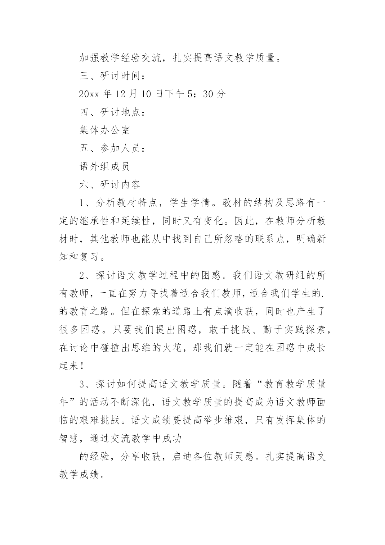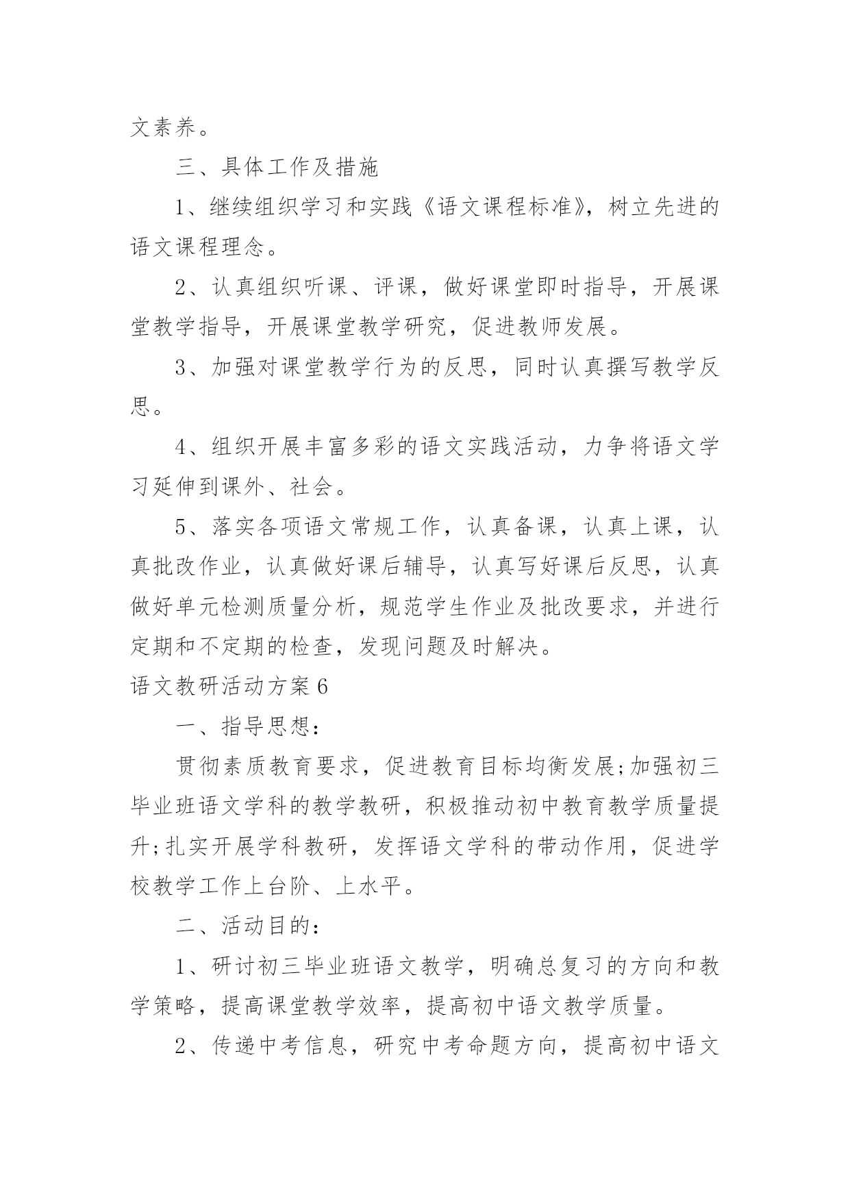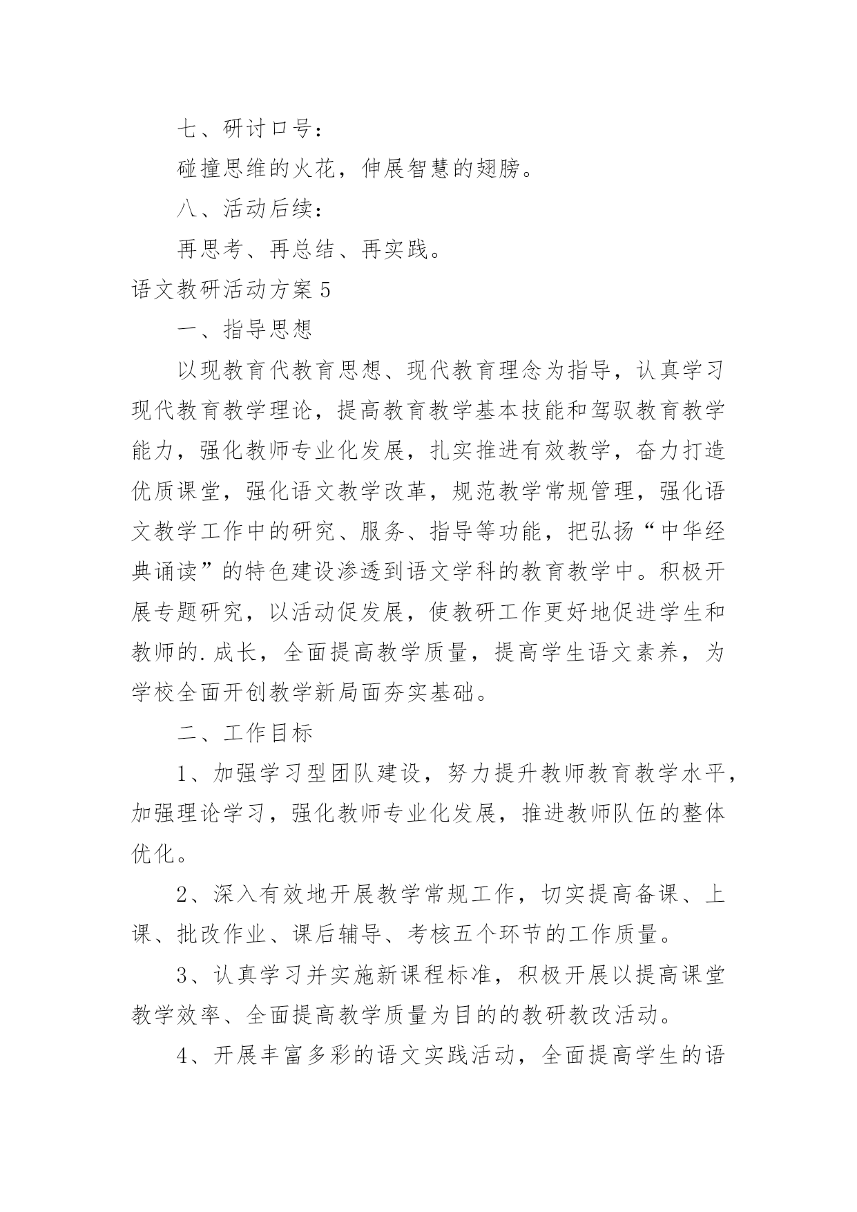 语文教研活动方案语文教研活动方案为了保障事情或工作顺利、圆满进行,预先制定方案是必不可少的,方案一般包括指导思想、主要目标、工作重点、实施步骤、政策措施、具体要求等项目。方案的格式和要求是什么样的呢?以下是小编精心整理的语文教研活动方案,欢迎阅读,希望大家能够喜欢。语文教研活动方案1一、主题教研背景随着信息技术的飞速发展,“微文化”悄然诞生,“微时代”的到来,让人们渐渐了解并熟悉一个新名词——“微课程”,校园里渐渐涌现出一股“微课”的热潮。微课是指基于教学设计思想,使用多媒体技术在五到十分钟左右就一个知识点进行针对性讲解的一段音频或视频。在教育教学中,微课所讲授的内容呈“点”状、碎片化,这些知识点,可以是教材解读、题型精讲、考点归纳;也可以是方法传授、教学经验等技能方面的知识讲解和展示。在语文教学中应用微课,可以推进信息技术与语文教学内容的深层次融合,实现优质教育环境的创建,从而更好的促进素质教育的普及以及学生学习成绩的有效提高。二、主题教研的内容------利用微课突破教学重难点”(一)微课解决的问题是教学中的重点难点一节微课一般讲授一个知识点,对于这个知识点的选择,关乎知识结构的设计,对于教学中的.重点难点用来制作微课,是一个较好的选择,较为符合微课制作的初衷:教学资源分享,为学生(教师)解惑,启发教学。(二)要适合用多媒体表达微课作为一种媒体,内容的设计要适合使用多媒体特性,对于不适合使用多媒体表达的内容,制作的结果也许是徒劳的,因为也许使用黑板教学或进行活动实践的教学效果更佳。同时也会使教学过程平庸无奇,令观看者失去学习欲望。因而微课选题要适合使用多媒体表达,适合加入丰富的图形图像、多姿的动画、声色兼有的视频。(三)微课要适合教学对象对于不同水平的学生,传授的方法乃至内容应该有有差异,进行个别化教学,这也是符合我们微课理念的。(四)活动安排:1、主题学习:进行主题学习,在教研组进行交流。每次发言要有主讲人,课题,时间和地点。2、上课研讨---借公开课对每个小主题的实施情况具体化-----备课上课都也结合自己的主题进行教学活动。3、评课活动-----效率如何,要通过课堂效率评价,力求有效的课堂提问。4、学期总结-----对这学期的主题教研要有个总结。语文教研活动方案2活动目标:1、认识自己常常会面对的有哪些困难,正确分析产生困难的原因。2、懂得遇到困难时要主动思考解决问题的办法,敢向困难挑战。3、认真参与活动,体验解决困难的快乐。活动准备:1、物质准备:故事《弗洛格找宝藏》PPT、电网场地创设2、经验准备:幼儿有困难的经验,有失败和成功的体验。活动过程:一、谈话引入主题,知道遇到困难是正常的。1、提问:小朋友们,幼儿园生活开心吗?在活动中,游戏中,你都碰到过哪些困难呢?教师总结:原来每个人都会遇到困难,遇到困难是件正常的事情。通过提问引入,顺其自然的引出困难的主题,为下面的.环节作了很好的铺垫。二、听故事,讨论,了解弗洛格的困难。1、介绍故事:今天老师带来一个青蛙弗洛格的故事,我们一起来听听弗洛格发生了什么事情?2、教师讲故事,幼儿倾听故事并提问:弗洛格怎么了?它遇到了什么困难?它是怎么做的?最后怎么样了?3、说说自己的困难及做法:小朋友们,你们遇到过困难吗?遇到过什么困难?你是怎么做的。教师总结:小朋友们在生活、游戏中常常会遇到各种困难,有的孩子退缩了,有的孩子坚持下来获得了成功。弗洛格是孩子们很喜欢的一个动物的形象,很多孩子也阅读过它的系列图书。这个环节从幼儿的兴趣出发选择了这个故事,通过故事来让幼儿产生共鸣,从弗洛格的困难联想到自己的困难,激发了孩子们表达的欲望。三、挑战困难。1、介绍游戏内容。师:今天青蛙弗洛格要去其他小动物家,可是在路上它遇到了一个困难,要通过“电网”,弗洛格试了好几次都没有通过,请小朋友们来试试,看看能不能顺利通过。2、组织幼儿进行游戏,并进行讨论,找出失败的原因,分享成功的经验。3、请失败的幼儿再试一次。4、加大难度,请幼儿进行尝试。这个环节遵循“游戏是幼儿的主要活动”的原则,重在激发幼儿参与活动的兴趣。通过这个挑战困难的游戏,让幼儿知道困难是不可怕的,有时候努力努力就战胜了。游戏体现了心理课递进强化的原则通过第一次尝试——找出困难的原因——再次尝试——加大难度,层层递进,符合大班幼儿的年龄特点,让孩子在游戏中强化困难的概念,积极积累经验。四、总结面对困难的方法。师:小朋友在成长的过程中会遇到很多困难,大家要积极面对困难,认真分析困难的原因,慢慢战胜困难,我们会越来越棒的。刚才游戏中还没通过的小朋友,你们已经比第一次有进步了,努力找找原因,相信很快就能通过的,到时候别忘了把这个好消息告诉我哦!最后老师针对性的总结面对困难的态度、方法,帮助孩子进行梳理,让孩子再次面对困难有了心理基础。语文