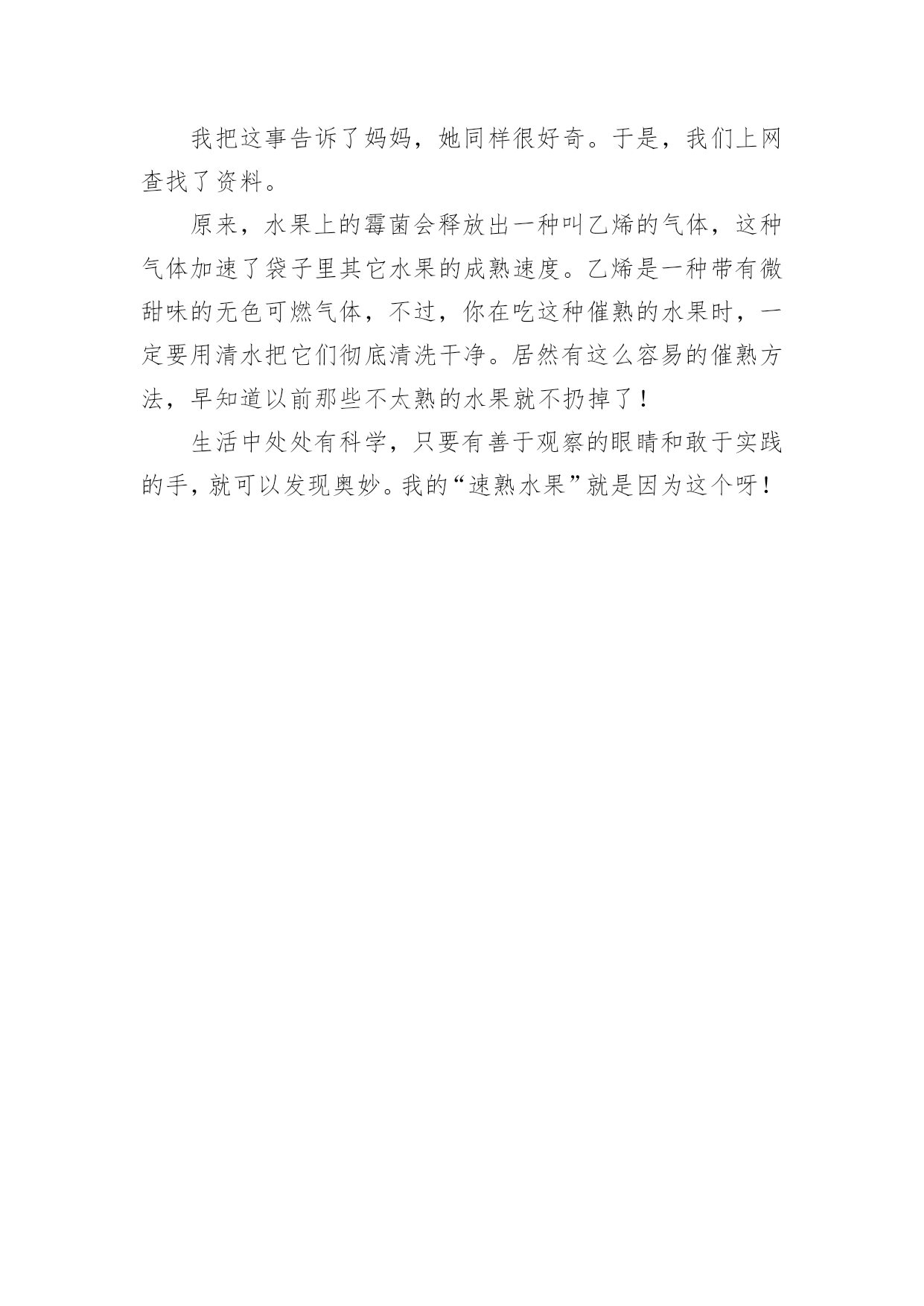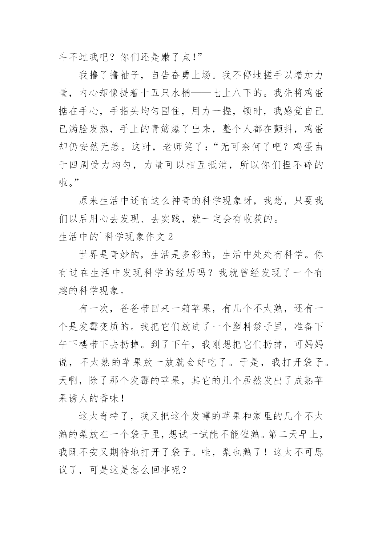 生活中的科学现象作文生活中的科学现象作文在平平淡淡的日常中,大家都有写作文的经历,对作文很是熟悉吧,作文是人们以书面形式表情达意的言语活动。那么你有了解过作文吗?以下是小编帮大家整理的生活中的科学现象作文,欢迎大家借鉴与参考,希望对大家有所帮助。生活中的科学现象作文1“加油,马上就能捏碎了!”从我们班级里传出来阵阵欢呼声,原来作文班的同学们在玩捏鸡蛋的游戏呀,可好玩了!游戏规则是:必须将鸡蛋放在手心里,整只手贴着捏,不可以让鸡蛋碰到硬的东西,也不可以用两个手指头捏。这游戏看似简单,实际却是不小的“拦路虎”呢。不信,你瞧瞧我们班“大力士”与它的对决吧。一个圆溜溜的鸡蛋在我们班的“大力士”手中,我心想:这鸡蛋不就如碰石头般吗?肯定马上要碎了呀。可是结果却让我们目瞪口呆,当我们的“大力士”面红耳赤、气喘吁吁时,鸡蛋却完好无损,“大力士”只好像斗败的公鸡一样耷拉着脑袋走下了台。第二个同学上去了,他把力量集中在手上,使出了吃奶的力气捏,甚至用上了双手,但鸡蛋仍旧像金刚石一般的硬。当同学把完好的鸡蛋放到桌上时,鸡蛋好似在挑衅我们:“哼,斗不过我吧?你们还是嫩了点!”我撸了撸袖子,自告奋勇上场。我不停地搓手以增加力量,内心却像提着十五只水桶——七上八下的。我先将鸡蛋掂在手心,手指头均匀围住,用力一握,顿时,我感觉自己已满脸发热,手上的青筋爆了出来,整个人都在颤抖,鸡蛋却仍安然无恙。这时,老师笑了:“无可奈何了吧?鸡蛋由于四周受力均匀,力量可以相互抵消,所以你们捏不碎的啦。”原来生活中还有这么神奇的科学现象呀,我想,只要我们以后用心去发现、去实践,就一定会有收获的。生活中的`科学现象作文2世界是奇妙的,生活是多彩的,生活中处处有科学。你有过在生活中发现科学的经历吗?我就曾经发现了一个有趣的科学现象。有一次,爸爸带回来一箱苹果,有几个不太熟,还有一个是发霉变质的。我把它们放进了一个塑料袋子里,准备下午下楼带下去扔掉。到了下午,我刚想把它们扔掉,可妈妈说,不太熟的苹果放一放就会好吃了。于是,我打开袋子。天啊,除了那个发霉的苹果,其它的几个居然发出了成熟苹果诱人的香味!这太奇特了,我又把这个发霉的苹果和家里的几个不太熟的梨放在一个袋子里,想试一试能不能催熟。第二天早上,我既不安又期待地打开了袋子。哇,梨也熟了!这太不可思议了,可是这是怎么回事呢?我把这事告诉了妈妈,她同样很好奇。于是,我们上网查找了资料。原来,水果上的霉菌会释放出一种叫乙烯的气体,这种气体加速了袋子里其它水果的成熟速度。乙烯是一种带有微甜味的无色可燃气体,不过,你在吃这种催熟的水果时,一定要用清水把它们彻底清洗干净。居然有这么容易的催熟方法,早知道以前那些不太熟的水果就不扔掉了!生活中处处有科学,只要有善于观察的眼睛和敢于实践的手,就可以发现奥妙。我的“速熟水果”就是因为这个呀!