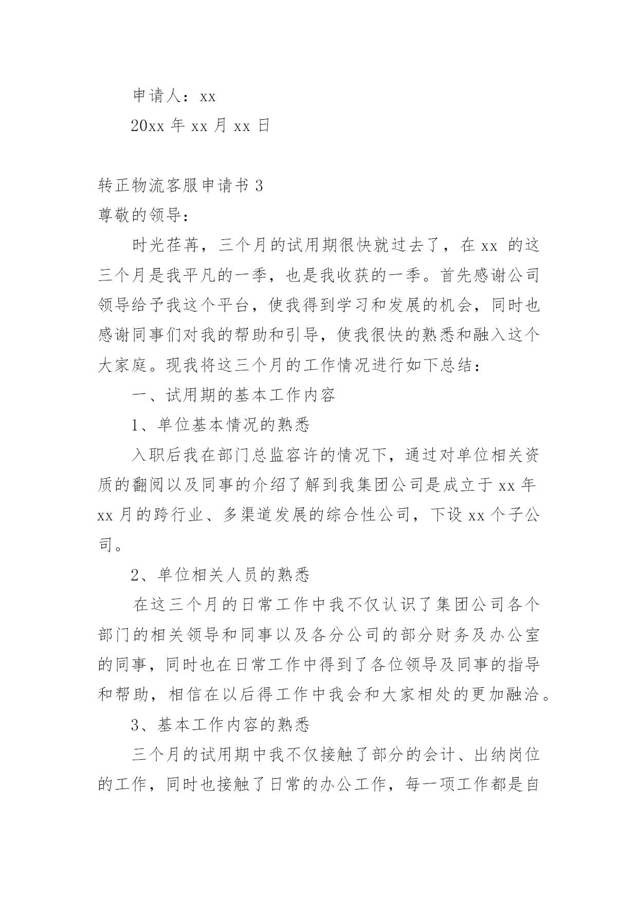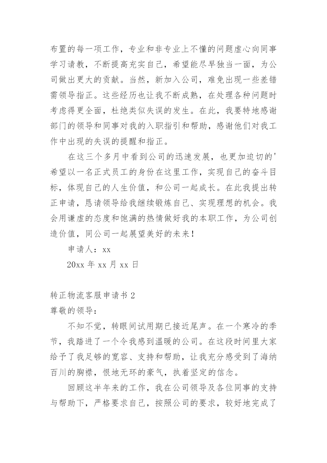 转正物流客服申请书现今社会公众的追求意识不断提升,申请书起到的作用越来越大,申请书是我们平时提出请求的一种书信。为了让您不再为写申请书头疼,以下是小编精心整理的转正物流客服申请书,仅供参考,希望能够帮助到大家。转正物流客服申请书1尊敬的公司领导:我于20xx年11月17日成为公司的试用员工,担任物流部仓储主管一职。到今天三个多月试用期已满,根据公司的规章制度,现申请转为公司正式员工。作为一个刚到公司的新员工,初来公司,曾经很担心该如何做好工作。但是公司宽松融洽的工作氛围、团结向上的企业文化,让我很快完成了从新人到职员的转变。担任仓库主管期间,主要负责仓储、物料的管理。对库存进行管控,合理规划仓库,节约仓储空间。参加公司内部和外部的'审核,组建团队等工作。使我深刻的认识到了团队建设的重要作用,团队精神在企业中的意义,从中提升了个人管理能力,并接触了许多新的工作领域,增加个人的工作经验。三个多月来,部门领导和同事耐心的'帮助下,使我在较短的时间内适应了公司的工作环境,也熟悉了公司的操作流程。在工作中,我一直严格要求自己,认真及时做好领导布置的每一项工作,专业和非专业上不懂的问题虚心向同事学习请教,不断提高充实自己,希望能尽早独当一面,为公司做出更大的贡献。当然,新加入公司,难免出现一些差错需领导指正。这些经历也让我不断成熟,在处理各种问题时考虑得更全面,杜绝类似失误的发生。在此,我要特地感谢部门的领导和同事对我的入职指引和帮助,感谢他们对我工作中出现的失误的提醒和指正。在这三个多月中看到公司的迅速发展,也更加迫切的'希望以一名正式员工的身份在这里工作,实现自己的奋斗目标,体现自己的人生价值,和公司一起成长。在此我提出转正申请,恳请领导给我继续锻炼自己、实现理想的机会。我会用谦虚的态度和饱满的热情做好我的本职工作,为公司创造价值,同公司一起展望美好的未来!申请人:xx20xx年xx月xx日转正物流客服申请书2尊敬的领导:不知不觉,转眼间试用期已接近尾声。在一个寒冷的季节,我踏进了一个令我感到温暖的公司。在这段时间里大家给予了我足够的宽容、支持和帮助,让我充分感受到了海纳百川的胸襟,恨地无环的豪气,执着坚定的信念。回顾这半年来的工作,我在公司领导及各位同事的支持与帮助下,严格要求自己,按照公司的要求,较好地完成了自己的本职工作。通过学习与工作,工作模式上有了新的突破,现将工作情况总结如下:一、办公室的日常管理工作。行政助理是承上启下、沟通内外、协调左右、联系四面八方的枢纽,推动各项工作朝着既定目标前进。办公室的工作千头万绪,简历的初步筛选、接待面试人员、文书处理、档案管理、迎来送往等。面对繁杂琐碎的大量事务性工作,自我强化工作意识,注意加快工作节奏,提高工作效率,冷静办理各项事务,力求周全、准确、适度,避免疏漏和差错,基本做到了事事有序。1、积极和有关人员交流、沟通,及时了解情况、工作进度,将问题反馈到分部主管,以便相关人员在最短时间内掌握工作的进展,并在此基础上进一步安排交付工作。2、认真做好公司的文字工作。及时传达贯彻公司有关会议、文件、批示精神。3、落实公司人事、劳资管理工作。组织落实公司的劳动、人事、工资管理和员工的考勤控制监督工作,体现公司的规范性,解决员工的后顾之忧。4、切实抓好公司的福利、企业管理的日常工作。按照预算审批制度,组织落实公司办公设施、福利等商品的采购、调配和实物管理工作。5、切实做好公司通讯费、水电费、日常用品的购买及购买员工生日礼品等费用的支出情况,严格按照程序核定使用标准。二、加强自身学习,提高工作水平由于感到自己身上的担子很重,而自己的学识、能力和阅历与其任职都有一定的距离,所以总不敢掉以轻心,向周围的领导学习,向同事学习,这样下来感觉自己还是有了一定的`进步。经过不断学习、不断积累,已具备了办公室工作经验,能够比较从容地处理日常工作中出现的问题,在组织管理能力、综合分析能力、协调办事能力和文字言语表达能力等方面,经过锻炼都有了一些的提高,保证了各项工作的正常运行,能够以正确的态度对待各项工作任务,认真努力贯彻到实际工作中去。积极提高自身各项业务素质,争取工作的主动性,具备较强的专业心,责任心,努力提高工作效率和工作质量。三、存在的问题和今后努力方向虽然取得了一些成绩,但也存在一些问题和不足,主要表现在:第一,许多工作都是边干边摸索,以致工作起来不能游刃有余,工作效率有待进一步提高;第二,有些工作还不够细致,一些工作协调的不是十分到位;第三,由于阅历等原因,有时考虑不够周全。我应努力做到:第一,加强学习,要对公司的统筹规划、当前情况做到心中有数;第二,本着实事求是的原则,做到上情下达、下情上报;第三,注重形成良好的工作氛围。不断改进对其他部门的支持能力、服务水平。试用期已结束,现在我的工作技能基本