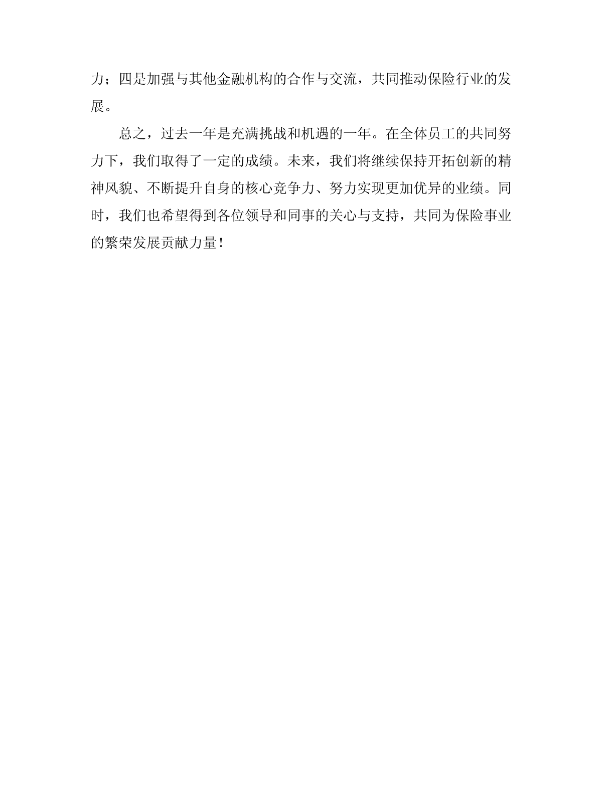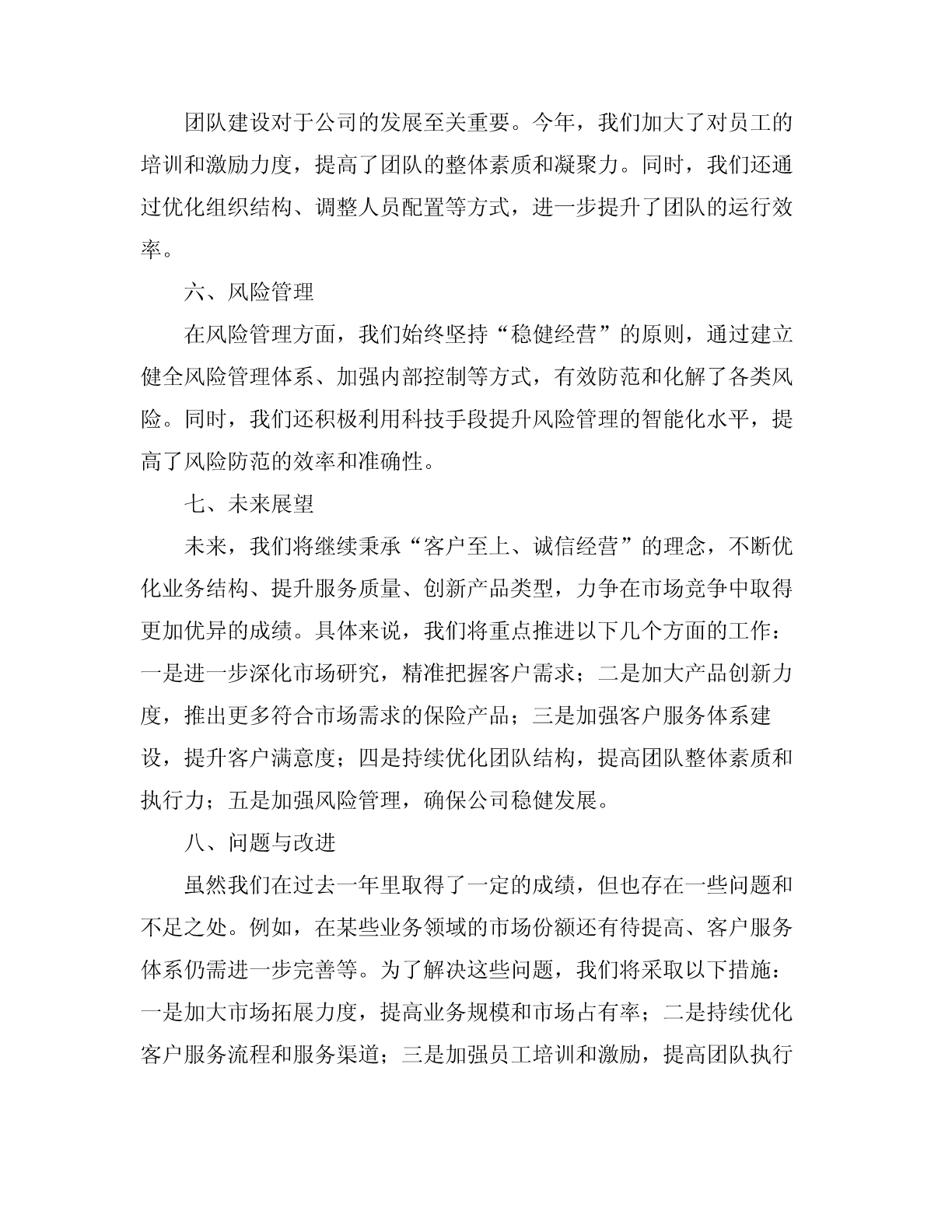 2024保险公司年终述职报告一、业绩回顾在即将过去的一年里,我们公司在各项业务指标上取得了一定的成绩。具体来说,保险业务的增长率达到了XX,市场份额也提升了XX个百分点。其中,个人寿险业务和财产险业务均实现了两位数的增长。此外,我们还成功推出了多款创新型保险产品,得到了市场的积极反馈。二、市场分析当前,保险市场竞争激烈,客户需求日益多样化。为了更好地适应市场变化,我们深入分析了竞争对手的策略和客户的需求。通过这些分析,我们发现,提供个性化、专业化的服务是我们在市场中脱颖而出的关键。三、产品创新在产品创新方面,我们致力于开发符合市场需求的新型保险产品。今年,我们成功推出了多款面向不同客户群体的保险产品,包括XX保险、XX保险等。这些产品在市场上受到了广泛的关注和好评。四、客户服务客户服务一直是我们的核心竞争力之一。今年,我们进一步加强了客户服务体系建设,通过优化服务流程、提高服务人员素质等方式,提升了客户满意度。同时,我们还积极利用大数据和人工智能技术,为客户提供更加智能、便捷的服务。五、团队建设团队建设对于公司的发展至关重要。今年,我们加大了对员工的培训和激励力度,提高了团队的整体素质和凝聚力。同时,我们还通过优化组织结构、调整人员配置等方式,进一步提升了团队的运行效率。六、风险管理在风险管理方面,我们始终坚持“稳健经营”的原则,通过建立健全风险管理体系、加强内部控制等方式,有效防范和化解了各类风险。同时,我们还积极利用科技手段提升风险管理的智能化水平,提高了风险防范的效率和准确性。七、未来展望未来,我们将继续秉承“客户至上、诚信经营”的理念,不断优化业务结构、提升服务质量、创新产品类型,力争在市场竞争中取得更加优异的成绩。具体来说,我们将重点推进以下几个方面的工作:一是进一步深化市场研究,精准把握客户需求;二是加大产品创新力度,推出更多符合市场需求的保险产品;三是加强客户服务体系建设,提升客户满意度;四是持续优化团队结构,提高团队整体素质和执行力;五是加强风险管理,确保公司稳健发展。八、问题与改进虽然我们在过去一年里取得了一定的成绩,但也存在一些问题和不足之处。例如,在某些业务领域的市场份额还有待提高、客户服务体系仍需进一步完善等。为了解决这些问题,我们将采取以下措施:一是加大市场拓展力度,提高业务规模和市场占有率;二是持续优化客户服务流程和服务渠道;三是加强员工培训和激励,提高团队执行力;四是加强与其他金融机构的合作与交流,共同推动保险行业的发展。总之,过去一年是充满挑战和机遇的一年。在全体员工的共同努力下,我们取得了一定的成绩。未来,我们将继续保持开拓创新的精神风貌、不断提升自身的核心竞争力、努力实现更加优异的业绩。同时,我们也希望得到各位领导和同事的关心与支持,共同为保险事业的繁荣发展贡献力量!
