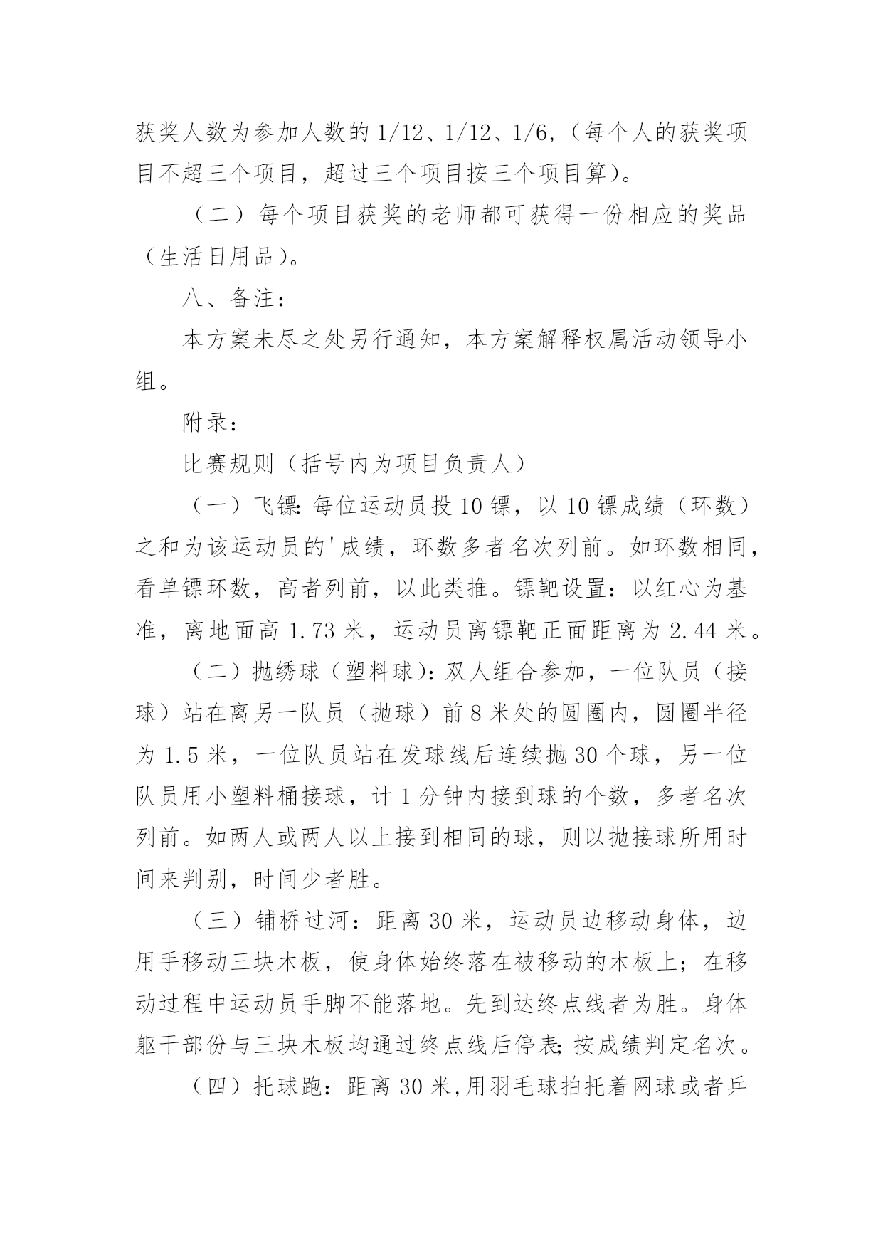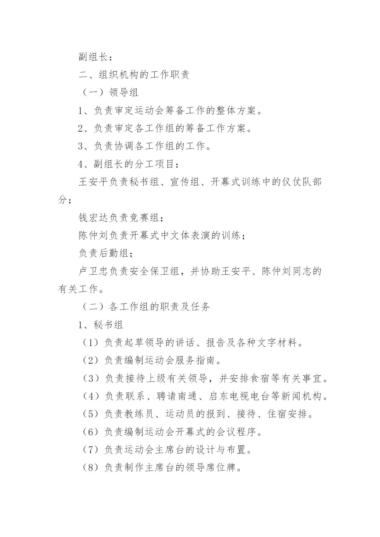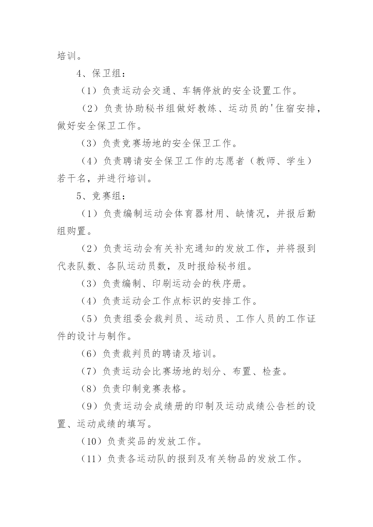 夏季运动会的策划方案为了确保事情或工作得以顺利进行,我们需要提前开始方案制定工作,方案是书面计划,具有内容条理清楚、步骤清晰的特点。方案要怎么制定呢?以下是小编整理的夏季运动会的策划方案,欢迎大家借鉴与参考,希望对大家有所帮助。夏季运动会的策划方案1江苏省第十五届中学生田径运动会(苏北片)(以下简称运动会)是江苏省中学生体育的一次盛会。为了使运动会达到文明、热烈、精彩、圆满的效果,展示学校组织管理水平、名校风采,特制订运动会的筹备工作方案。一、筹备工作机构(一)筹备工作领导组组长:王生副组长:王安平、钱宏达、陈仲刘、卢卫忠成员:(二)筹备工作组1、秘书组组长:陈杰副组长:2、开幕式训练组组长:卢卫忠副组长:二、组织机构的工作职责(一)领导组1、负责审定运动会筹备工作的整体方案。2、负责审定各工作组的筹备工作方案。3、负责协调各工作组的工作。4、副组长的分工项目:王安平负责秘书组、宣传组、开幕式训练中的仪仗队部分;钱宏达负责竞赛组;陈仲刘负责开幕式中文体表演的训练;负责后勤组;卢卫忠负责安全保卫组,并协助王安平、陈仲刘同志的有关工作。(二)各工作组的职责及任务1、秘书组(1)负责起草领导的讲话、报告及各种文字材料。(2)负责编制运动会服务指南。(3)负责接待上级有关领导,并安排食宿等有关事宜。(4)负责联系、聘请南通、启东电视电台等新闻机构。(5)负责教练员、运动员的报到、接待、住宿安排。(6)负责编制运动会开幕式的会议程序。(7)负责运动会主席台的设计与布置。(8)负责制作主席台的领导席位牌。(9)负责主席台背景的设计方案及制作。(10)负责聘任志愿者(教师、学生)若干名,并负责培训。(11)负责寄发各种邀请函。2、开幕式训练组:(1)负责开幕式中仪仗队的训练。(2)负责开幕式中大型文体表演的训练。(3)负责运动员代表队引导员的训练。(4)负责入场式的彩排。(5)负责会徽的设计及制作、国旗的购买。(6)负责聘任擎旗手,抬会徽的武警战士。(7)负责编制训练所用的器材、服装等并上报后勤组。(8)负责聘任训练中的领队、教练员及志愿者等。3、宣传组:(1)负责学校中各种宣传标语的布置。(2)负责学校有关橱窗宣传版面的更换。(3)负责运动会校门口、运动场入场处拱门的设计与放置。(4)负责运动场上气球的标语及放置。(5)负责电子屏的宣传标语及学生宿舍欢迎标语的设置。(6)负责运动会主席台的播音工作。(7)负责学校主要道路彩旗的插置。(8)负责聘任志愿者(教师、学生)若干名,并进行培训。4、保卫组:(1)负责运动会交通、车辆停放的安全设置工作。(2)负责协助秘书组做好教练、运动员的'住宿安排,做好安全保卫工作。(3)负责竞赛场地的安全保卫工作。(4)负责聘请安全保卫工作的志愿者(教师、学生)若干名,并进行培训。5、竞赛组:(1)负责编制运动会体育器材用、缺情况,并报后勤组购置。(2)负责运动会有关补充通知的发放工作,并将报到代表队数、各队运动员数,及时报给秘书组。(3)负责编制、印刷运动会的秩序册。(4)负责运动会工作点标识的安排工作。(5)负责组委会裁判员、运动员、工作人员的工作证件的设计与制作。(6)负责裁判员的聘请及培训。(7)负责运动会比赛场地的划分、布置、检查。(8)负责印制竞赛表格。(9)负责运动会成绩册的印制及运动成绩公告栏的设置、运动成绩的填写。(10)负责奖品的发放工作。(11)负责各运动队的报到及有关物品的发放工作。(12)负责组委会会议召开的时间、地点、程序的确定与发布。(13)负责聘任竞赛所用的志愿者(教师、学生)若干名,并进行培训。6、后勤组:(1)负责运动会所需运动器材的购、借工作。(2)负责学校的绿化、美化工作。(3)负责协助秘书组做好大会主席台装置、鲜花等摆放工作。(4)负责大会主席台音响系统的提供、维护工作。(5)负责运动员宿舍环境的维修、整理工作,协助秘书组做好教练员、运动员的报到工作。(6)负责运动会裁判员、运动员、有关工作人员的伙食工作。(7)负责运动会上茶水的供应工作。(8)负责运动会竞赛所用的(检录等)所需的各种器材的提供、放置工作。(9)负责购置有关工作组提出使用的服装、器材等。(10)负责聘请卫生监督所对伙食工作的安全管理。(11)负责运动会医务工作人员的值班、服务工作。上述各组的工作职责、任务定有不完整之处,请结合制订本组工作方案进行完善。工作组的工作方案必须做到人员、地点、训练时间、完成时间四落实,并在7月1日之前完成,报秘书组。夏季运动会的策划方案2一、活动目的为丰富全校师生课余文化生活,倡导“每天健身一小时,健康生活一辈子”,全面推进我校健身运动的深入开展,增强教师的身体素质和凝聚力,构建“和谐校园”,我校将举办教师趣味运动会,现制定活动方案如下。二、活动领导小组:组长:副组长:成
