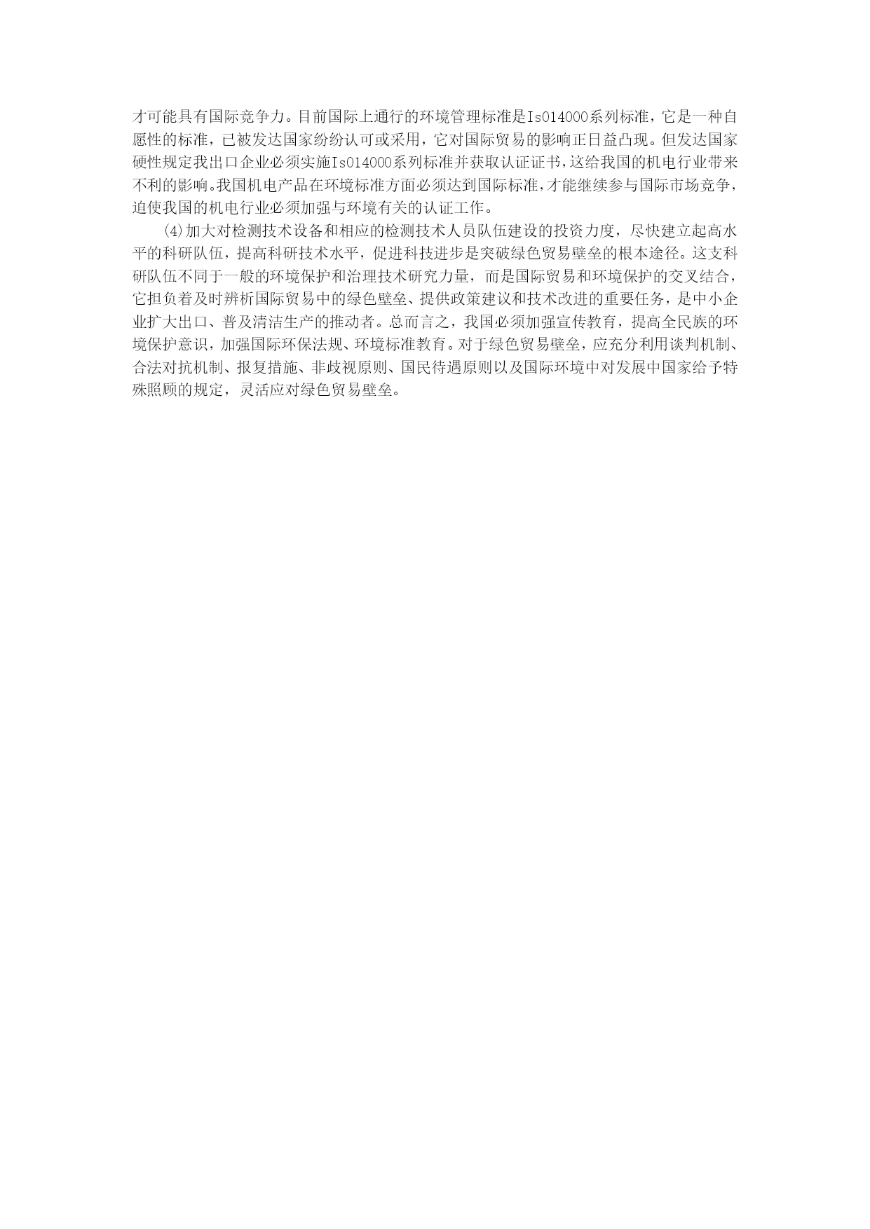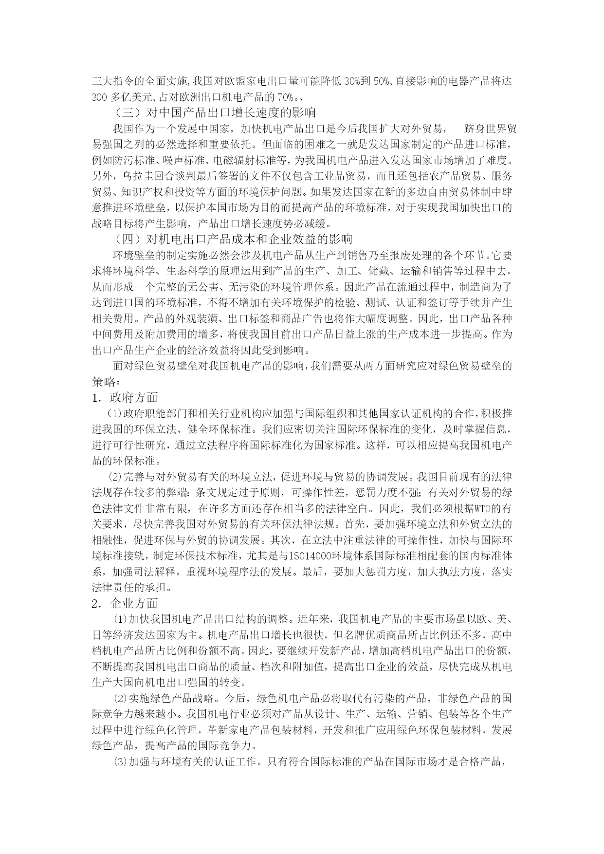 绿色贸易壁垒对我国机电产品的影响及对策随着我国科技水平的提高和生产能力的增强,我国机电产品也更多地走出国门。受我国劳动力价格低廉等原因的影响,我国机电产品在国际市场上和同类产品相比具有价格低廉等方面的竞争优势,这对当地同类产品的生产企业造成一定冲击。当地政府和相关部门把绿色壁垒作为阻止我国产品出口的挡箭牌,尤以欧盟最为明显。绿色壁垒在欧盟盛行的原因绿色壁垒在近几年已经呈现越来越严格的趋势,已经引起了许多国家的高度关注,欧盟是世界上绿色壁垒最严格的地区之一。欧盟是我国机电产品的主要出口市场,但由于欧盟绿色壁垒的限制已经涵盖了机电产品的研究开发、生产、加工、包装、运输、销售和消费的全过程,每年我国机电产品因此损失约20亿美元。绿色壁垒,成为了机电产品出口的一大障碍。绿色壁垒在欧盟之所以盛行,究其原因,一方面是因绿色消费市场的利益驱动。随着全球环保意识的增强,人们对产品的内在和外在的环境质量要求越来越高,人们的思维方式、价值观念、价值行为及消费心理都产生了革命性的变化,市场上兴起了“绿色消费”的热潮,由此出现了环保产品、环保科技和环保服务构成的潜力巨大的新兴市场。目前在常见的几类绿色贸易壁垒中,对我国机电产品冲击最大的是“绿色技术标准”,即欧盟三大“绿色”指令。欧盟三大“绿色”指令的含义(一)WEEE指令(OnWasteofElectronicandElectricalEquipment)WEEE指令,是一个关于报废电子电气设备的指令,也称WEEE-2002/96/EC指令。其目的在于提高报废电子电气产品的回收及再循环率,从而降低最终处理的电子废料的数量,以此减少对环境的污染,提高对自然资源的利用率。(二)ROHS指令(TheRestrictionoftheUseofCer-tainHazardousSubstancesinElectronicalandElec-tronicEquipment)ROHS指令,是一个电子电气设备中限制使用某些有害物质的指令,也称2002/95/EC指令。2005年欧盟又以2005/618/EC决议的形式对其进行补充,明确规定六种有害物质(铅、汞、镉、六价铬、多溴联苯和多溴联苯醚)的最大限量值。(三)EUP指令(TheEnter-priseUnifiedProcess)EUP指令,是一个关于制定耗能产品环保设计要求框架的指令,也称为2005/32/EC指令。该指令对产品的设计、生产、维护到最终淘汰、回收和处理的所有阶段都提出环保要求,以促进生产商采用先进的环境化设计技术来生产耗能的产品,鼓励生产商在产品的整个生命周期内对某些有害物的使用量最小化,并使排放到环境中的排放物最少,从而达到减少对环境的破坏及保护资源的目的。欧盟三大“绿色”指令对我国与欧盟间机电贸易的影响(一)我国机电行业将面临巨大的成本压力欧盟三大“绿色”指令的实施给我国家电企业和经销商带来巨大的成本压力。一是各种管理成本,如供应链管理成本。二是原材料成本,如32英寸液晶电视若采用LED背光源,成本要增加近百美元。三是知识成本。包括必要的环境信息和知识的获取成本及改进现有标准的设计制造成本。四是测试成本。包括产品需赴欧盟检测认证的费用、产品生产环节和废弃物排放的管理及测试成本等。成本的上升是所有对欧出口机电产品企业面临的共同问题,尤其对以低价位取胜的机电产品出口企业而言,企业的赢利能力将会受到重大考验。(二)我国机电产品对欧出口量将相对下降一方面,三大“指令”的实施将使机电产品出口的成本上升和赢利能力下降,使我国机电企业对欧机电产品出口积极性下降。另一方面,三大“指令”提高了欧盟机电产品的技术标准,对一些产品技术落后、应对能力不足的企业会因经营困难而退出欧洲市场。据测算,随着三大指令的全面实施,我国对欧盟家电出口量可能降低30%到50%,直接影响的电器产品将达300多亿美元,占对欧洲出口机电产品的70%。、(三)对中国产品出口增长速度的影响我国作为一个发展中国家,加快机电产品出口是今后我国扩大对外贸易,跻身世界贸易强国之列的必然选择和重要依托。但面临的困难之一就是发达国家制定的产品进口标准,例如防污标准、噪声标准、电磁辐射标准等,为我国机电产品进入发达国家市场增加了难度。另外,乌拉圭回合谈判最后签署的文件不仅包含工业品贸易,而且还包括农产品贸易、服务贸易、知识产权和投资等方面的环境保护问题。如果发达国家在新的多边自由贸易体制中肆意推进环境壁垒,以保护本国市场为目的而提高产品的环境标准,对于实现我国加快出口的战略目标将产生影响,产品出口增长速度势必减缓。(四)对机电出口产品成本和企业效益的影响环境壁垒的制定实施必然会涉及机电产品从生产到销售乃至报废处理的各个环节。它要求将环境科学、生态科学的原理运用到产品的生