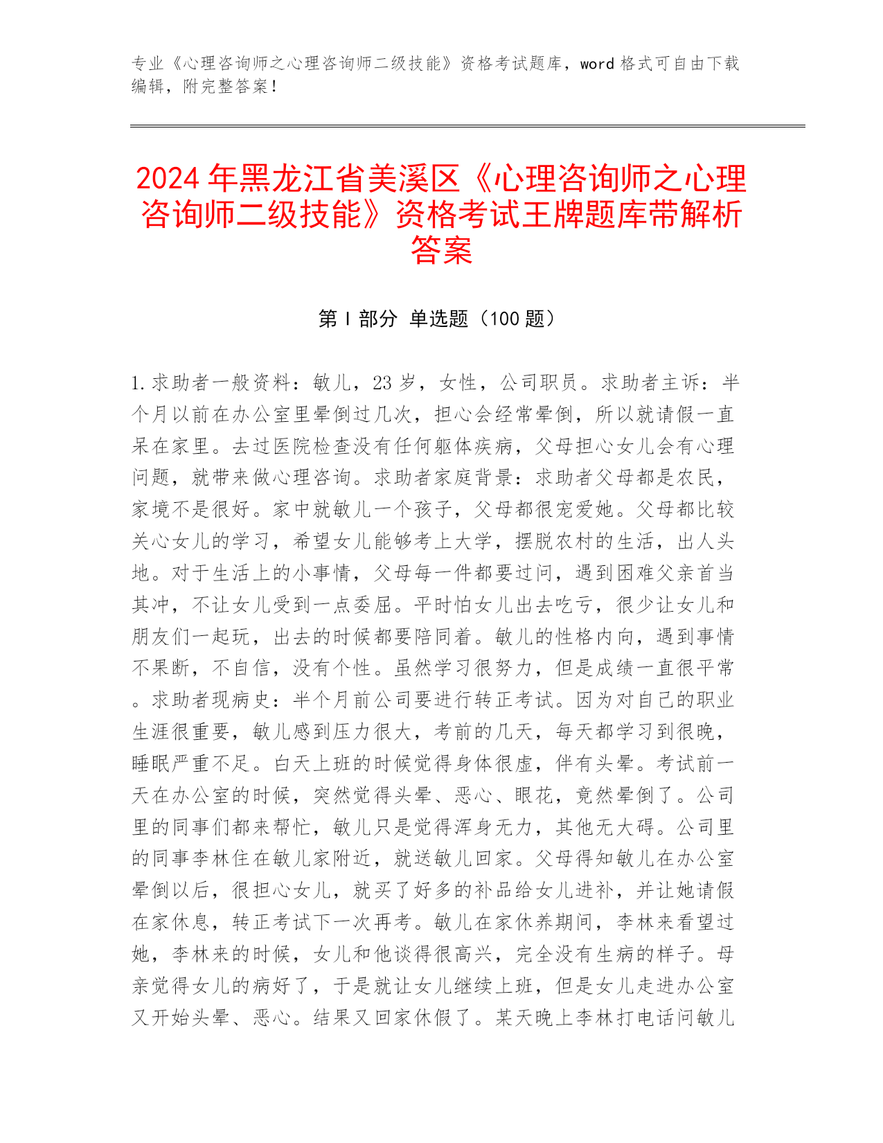 2024年黑龙江省美溪区《心理咨询师之心理咨询师二级技能》资格考试王牌题库带解析答案