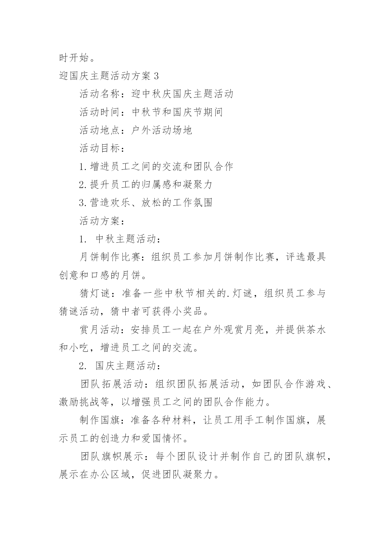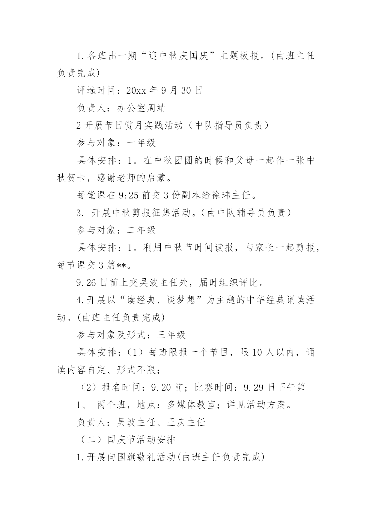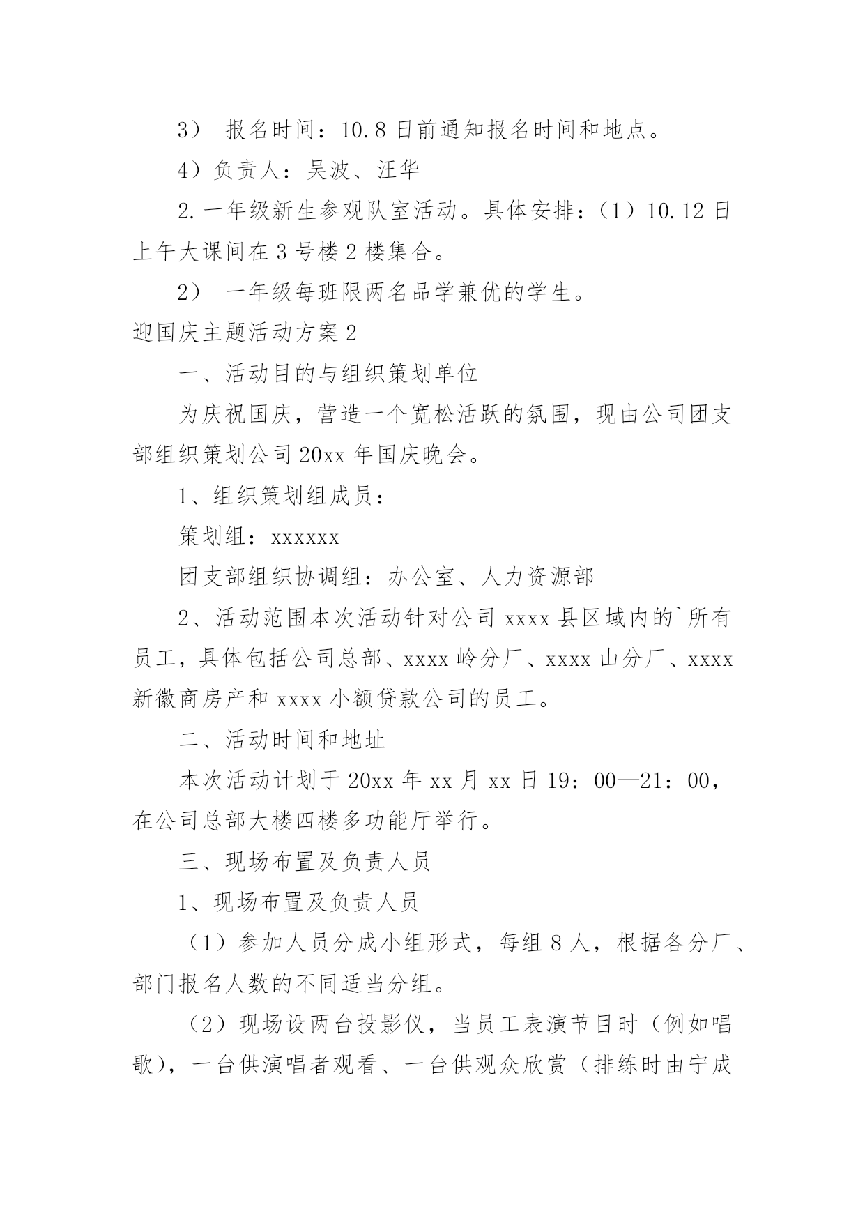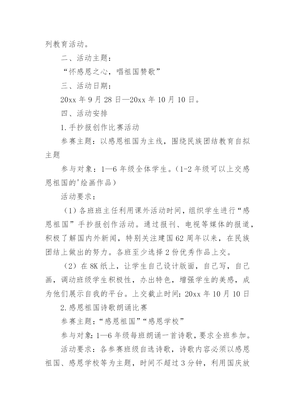 迎国庆主题活动方案迎国庆主题活动方案[范例15篇]为了确保事情或工作安全顺利进行,通常需要提前准备好一份方案,方案是阐明行动的时间,地点,目的,预期效果,预算及方法等的书面计划。优秀的方案都具备一些什么特点呢?以下是小编整理的迎国庆主题活动方案,希望能够帮助到大家。迎国庆主题活动方案1我们的节日新区实验小学“庆中秋、迎国庆”主题活动方案一、活动目的:为弘扬中华民族优秀传统文化,丰富节日期间师生文化生活,营造欢乐祥和、和谐文明的节日氛围,使节日更加贴近实际、贴近生活,根据省、市、县文明办及市、县教体局的工作安排,按照《关于印发20xx全市教体系统“我们的节日”系列活动实施方案的通知》(滁教体办〔20xx〕7号)要求,结合我校实际,特开展以下庆祝活动。二、活动主题:“我们的节日”三、活动对象:全体师生4、时间:20xx年9月16日-20xx年10月16日五、活动要求:1.强化领导,精心组织。学校把这次主题教育活动作为精神文明建设的一项重要内容,高度重视,精心组织,成立由校长任组长,少先队辅导员为成员的领导小组,制定切实可行活动方案,使主题教育活动有声势,有规模,有成效。组长:李永书副组长:周琼、吴德清、汪秀芝、周友良成员:刘元、周伟伟、郑家伟、吴波、汪华,班主任2.深入宣传,营造氛围。少先队要积极发挥主动性和创造性,在校园内充分利用橱窗、校园广播等形式,全方位、多角度开展宣传报道工作,努力使广大少年学生积极行动起来,参与其中,受到教育。3.创新形式,突出特色。围绕活动主题,结合学校实际情况,不断创新主题教育活动的方法和形式,组织特色活动,打造特色载体,增强主题教育活动的针对性、实效性。4.注重质量,务求实效。要坚持贴近未成年人思想实际、贴近未成年人生活、贴近未成年人群体的原则,注重活动的.趣味性、参与性、互动性和体验性,努力满足青少年的精神文化需求,确保各项活动有声有色。5.强化责任,确保安全。在整个活动中,各班要牢固树立安全意识,把未成年人的安全放在首位。6.及时总结,扩大影响。活动结束后,各部门要向学校少先队汇报活动总结。六、活动内容:(一)中秋节活动安排1.各班出一期“迎中秋庆国庆”主题板报。(由班主任负责完成)评选时间:20xx年9月30日负责人:办公室周靖2开展节日赏月实践活动(中队指导员负责)参与对象:一年级具体安排:1。在中秋团圆的时候和父母一起作一张中秋贺卡,感谢老师的启蒙。每堂课在9:25前交3份副本给徐玮主任。3.开展中秋剪报征集活动。(由中队辅导员负责)参与对象:二年级具体安排:1。利用中秋节时间读报,与家长一起剪报,每节课交3篇**。9.26日前上交吴波主任处,届时组织评比。4.开展以“读经典、谈梦想”为主题的中华经典诵读活动。(由班主任负责完成)参与对象及形式:三年级具体安排:(1)每班限报一个节目,限10人以内,诵读内容自定、形式不限;(2)报名时间:9.20前;比赛时间:9.29日下午第1、两个班,地点:多媒体教室;详见活动方案。负责人:吴波主任、王庆主任(二)国庆节活动安排1.开展向国旗敬礼活动(由班主任负责完成)参与对象:1-6年级具体安排:⑴各班在9.26日召开一次“祖国我爱您”的主题中队会,队会及资料上交徐玮主任处。⑵国庆期间开展“向国旗敬礼”网上签名活动,具体参与方式见汪华信息通知。2.开展一次“祖国,我爱您”主题手抄报比赛。(由班主任负责完成)参与对象:四年级具体安排:每堂课在10.10天前交4份给汪华。5.开展一次“祖国,我爱您”书画比赛。(由班主任负责完成)参与对象:五年级具体安排:1。每堂课应提交2幅软笔书法作品和2幅绘画作品。作品大小不得超过一张宣纸(4对开本);软笔纸张自备、绘画形式不限。10月15日前交给张梅先生。(三)建队日活动安排1.开展红色经典人人唱活动。(由中队辅导员负责)参与对象:2-3年级具体安排:(1)二年级举行《中国少年先锋队队歌》比赛;二—四年级举行红歌比赛;敬标准队礼。具体详见活动方案。2)每班以团体形式参赛,限20人以内。3)报名时间:10.8日前通知报名时间和地点。4)负责人:吴波、汪华2.一年级新生参观队室活动。具体安排:(1)10.12日上午大课间在3号楼2楼集合。2)一年级每班限两名品学兼优的学生。迎国庆主题活动方案2一、活动目的与组织策划单位为庆祝国庆,营造一个宽松活跃的氛围,现由公司团支部组织策划公司20xx年国庆晚会。1、组织策划组成员:策划组:xxxxxx团支部组织协调组:办公室、人力资源部2、活动范围本次活动针对公司xxxx县区域内的`所有员工,具体包括公司总部、xxxx岭分厂、xxxx山分厂、xxxx新徽商房产和xxxx小额贷款公司的员工。二、活动时间和地址本次活动计划于20xx年xx月xx日19:00—21:00,在公司总部大楼四