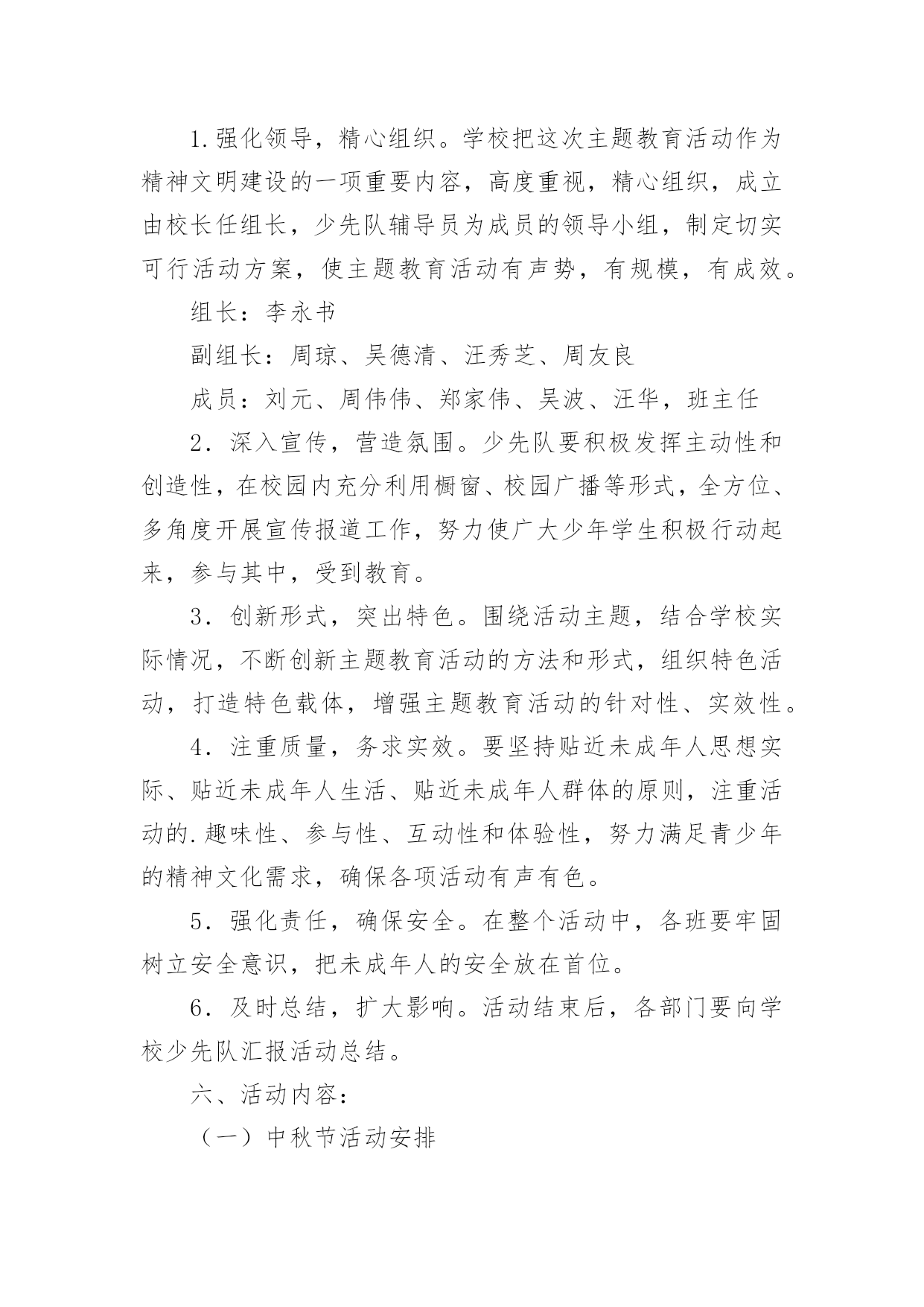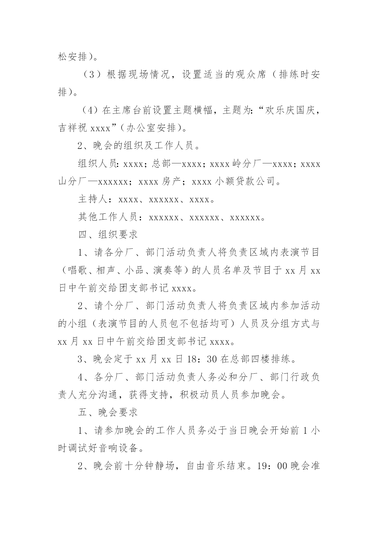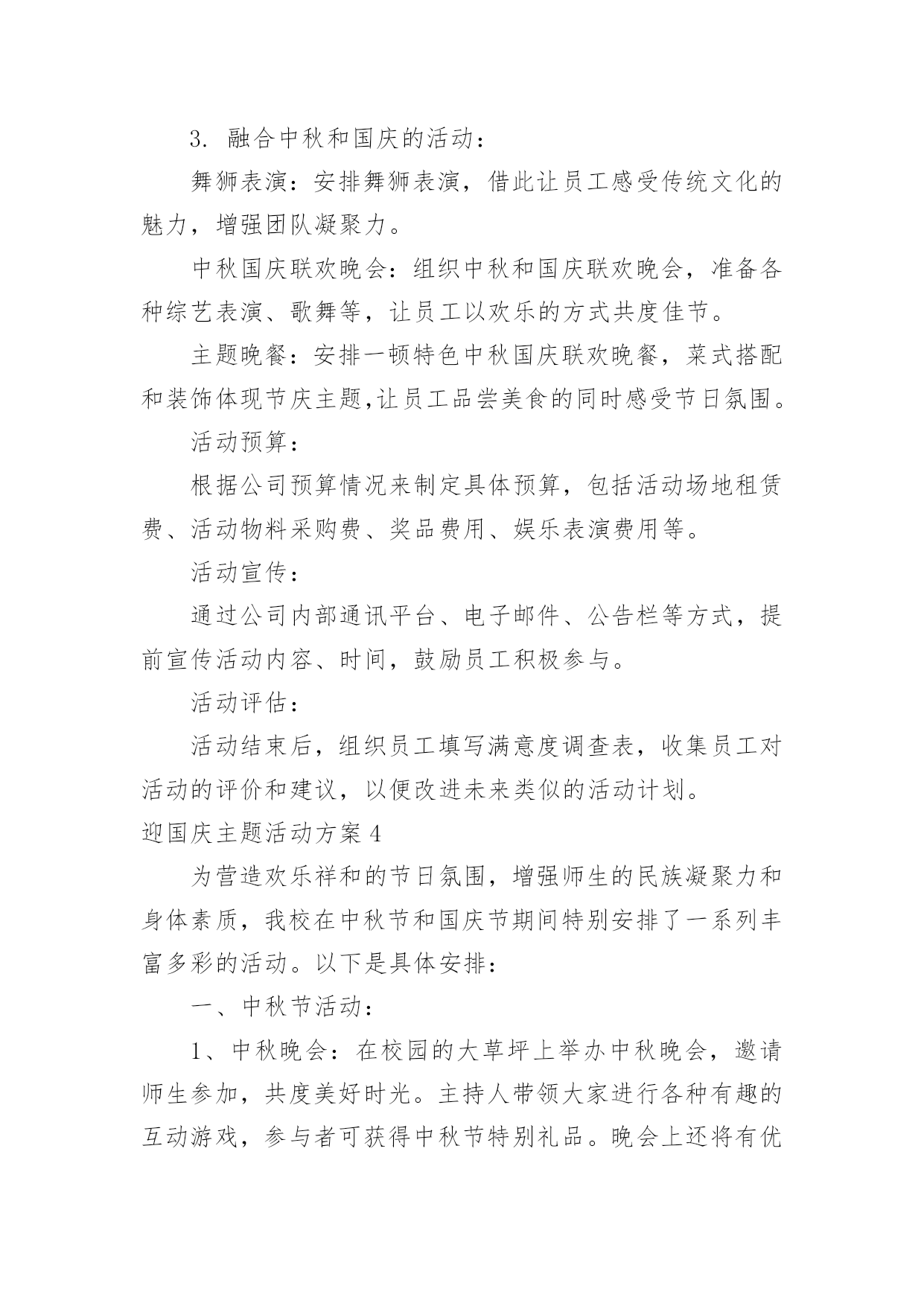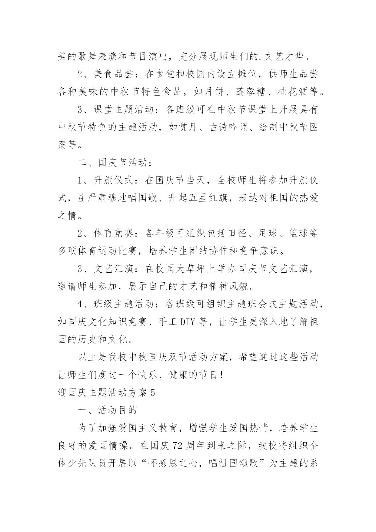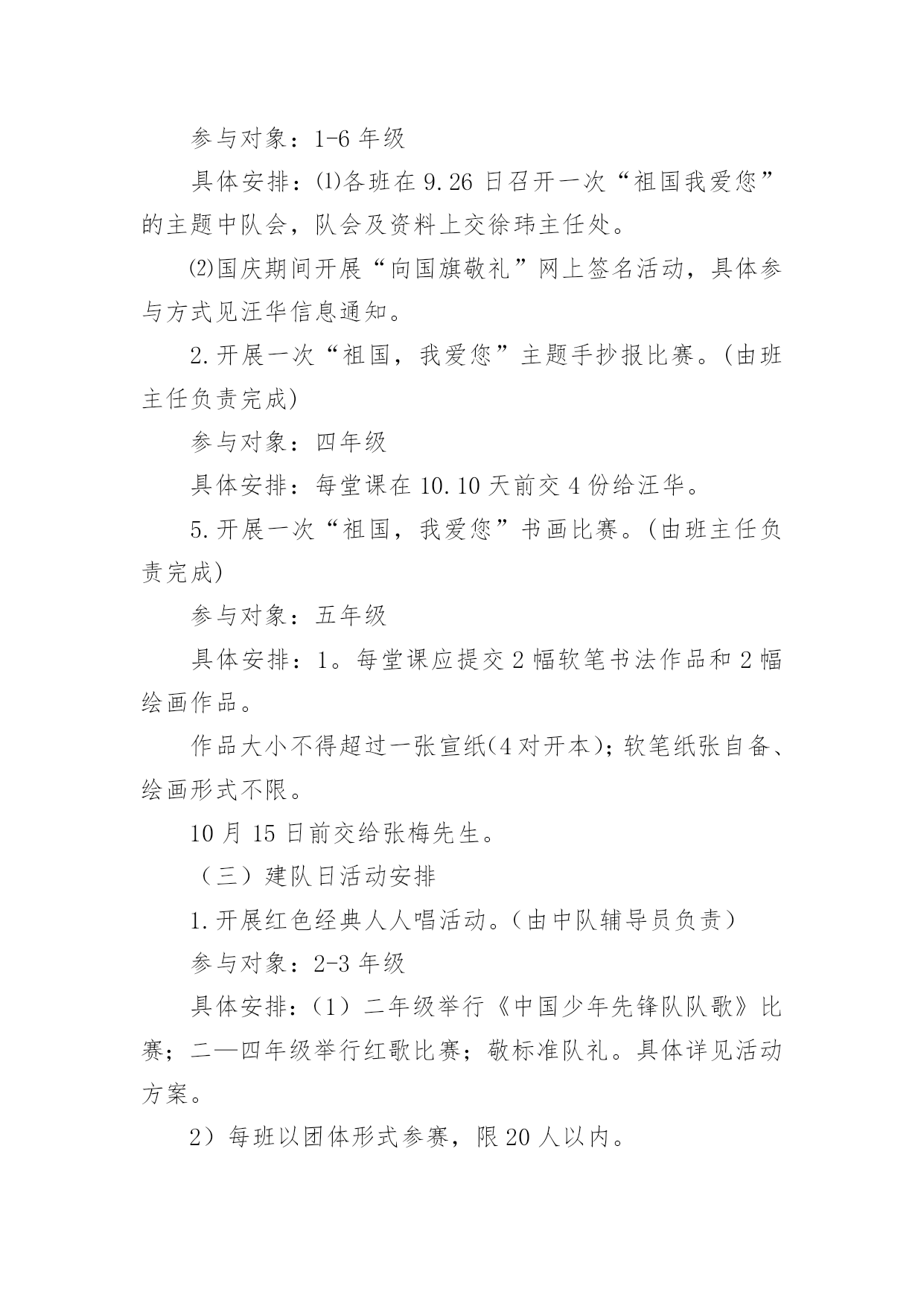 迎国庆主题活动方案迎国庆主题活动方案[范例15篇]为了确保事情或工作安全顺利进行,通常需要提前准备好一份方案,方案是阐明行动的时间,地点,目的,预期效果,预算及方法等的书面计划。优秀的方案都具备一些什么特点呢?以下是小编整理的迎国庆主题活动方案,希望能够帮助到大家。迎国庆主题活动方案1我们的节日新区实验小学“庆中秋、迎国庆”主题活动方案一、活动目的:为弘扬中华民族优秀传统文化,丰富节日期间师生文化生活,营造欢乐祥和、和谐文明的节日氛围,使节日更加贴近实际、贴近生活,根据省、市、县文明办及市、县教体局的工作安排,按照《关于印发20xx全市教体系统“我们的节日”系列活动实施方案的通知》(滁教体办〔20xx〕7号)要求,结合我校实际,特开展以下庆祝活动。二、活动主题:“我们的节日”三、活动对象:全体师生4、时间:20xx年9月16日-20xx年10月16日五、活动要求:1.强化领导,精心组织。学校把这次主题教育活动作为精神文明建设的一项重要内容,高度重视,精心组织,成立由校长任组长,少先队辅导员为成员的领导小组,制定切实可行活动方案,使主题教育活动有声势,有规模,有成效。组长:李永书副组长:周琼、吴德清、汪秀芝、周友良成员:刘元、周伟伟、郑家伟、吴波、汪华,班主任2.深入宣传,营造氛围。少先队要积极发挥主动性和创造性,在校园内充分利用橱窗、校园广播等形式,全方位、多角度开展宣传报道工作,努力使广大少年学生积极行动起来,参与其中,受到教育。3.创新形式,突出特色。围绕活动主题,结合学校实际情况,不断创新主题教育活动的方法和形式,组织特色活动,打造特色载体,增强主题教育活动的针对性、实效性。4.注重质量,务求实效。要坚持贴近未成年人思想实际、贴近未成年人生活、贴近未成年人群体的原则,注重活动的.趣味性、参与性、互动性和体验性,努力满足青少年的精神文化需求,确保各项活动有声有色。5.强化责任,确保安全。在整个活动中,各班要牢固树立安全意识,把未成年人的安全放在首位。6.及时总结,扩大影响。活动结束后,各部门要向学校少先队汇报活动总结。六、活动内容:(一)中秋节活动安排1.各班出一期“迎中秋庆国庆”主题板报。(由班主任负责完成)评选时间:20xx年9月30日负责人:办公室周靖2开展节日赏月实践活动(中队指导员负责)参与对象:一年级具体安排:1。在中秋团圆的时候和父母一起作一张中秋贺卡,感谢老师的启蒙。每堂课在9:25前交3份副本给徐玮主任。3.开展中秋剪报征集活动。(由中队辅导员负责)参与对象:二年级具体安排:1。利用中秋节时间读报,与家长一起剪报,每节课交3篇**。9.26日前上交吴波主任处,届时组织评比。4.开展以“读经典、谈梦想”为主题的中华经典诵读活动。(由班主任负责完成)参与对象及形式:三年级具体安排:(1)每班限报一个节目,限10人以内,诵读内容自定、形式不限;(2)报名时间:9.20前;比赛时间:9.29日下午第1、两个班,地点:多媒体教室;详见活动方案。负责人:吴波主任、王庆主任(二)国庆节活动安排1.开展向国旗敬礼活动(由班主任负责完成)参与对象:1-6年级具体安排:⑴各班在9.26日召开一次“祖国我爱您”的主题中队会,队会及资料上交徐玮主任处。⑵国庆期间开展“向国旗敬礼”网上签名活动,具体参与方式见汪华信息通知。2.开展一次“祖国,我爱您”主题手抄报比赛。(由班主任负责完成)参与对象:四年级具体安排:每堂课在10.10天前交4份给汪华。5.开展一次“祖国,我爱您”书画比赛。(由班主任负责完成)参与对象:五年级具体安排:1。每堂课应提交2幅软笔书法作品和2幅绘画作品。作品大小不得超过一张宣纸(4对开本);软笔纸张自备、绘画形式不限。10月15日前交给张梅先生。(三)建队日活动安排1.开展红色经典人人唱活动。(由中队辅导员负责)参与对象:2-3年级具体安排:(1)二年级举行《中国少年先锋队队歌》比赛;二—四年级举行红歌比赛;敬标准队礼。具体详见活动方案。2)每班以团体形式参赛,限20人以内。3)报名时间:10.8日前通知报名时间和地点。4)负责人:吴波、汪华2.一年级新生参观队室活动。具体安排:(1)10.12日上午大课间在3号楼2楼集合。2)一年级每班限两名品学兼优的学生。迎国庆主题活动方案2一、活动目的与组织策划单位为庆祝国庆,营造一个宽松活跃的氛围,现由公司团支部组织策划公司20xx年国庆晚会。1、组织策划组成员:策划组:xxxxxx团支部组织协调组:办公室、人力资源部2、活动范围本次活动针对公司xxxx县区域内的`所有员工,具体包括公司总部、xxxx岭分厂、xxxx山分厂、xxxx新徽商房产和xxxx小额贷款公司的员工。二、活动时间和地址本次活动计划于20xx年xx月xx日19:00—21:00,在公司总部大楼四