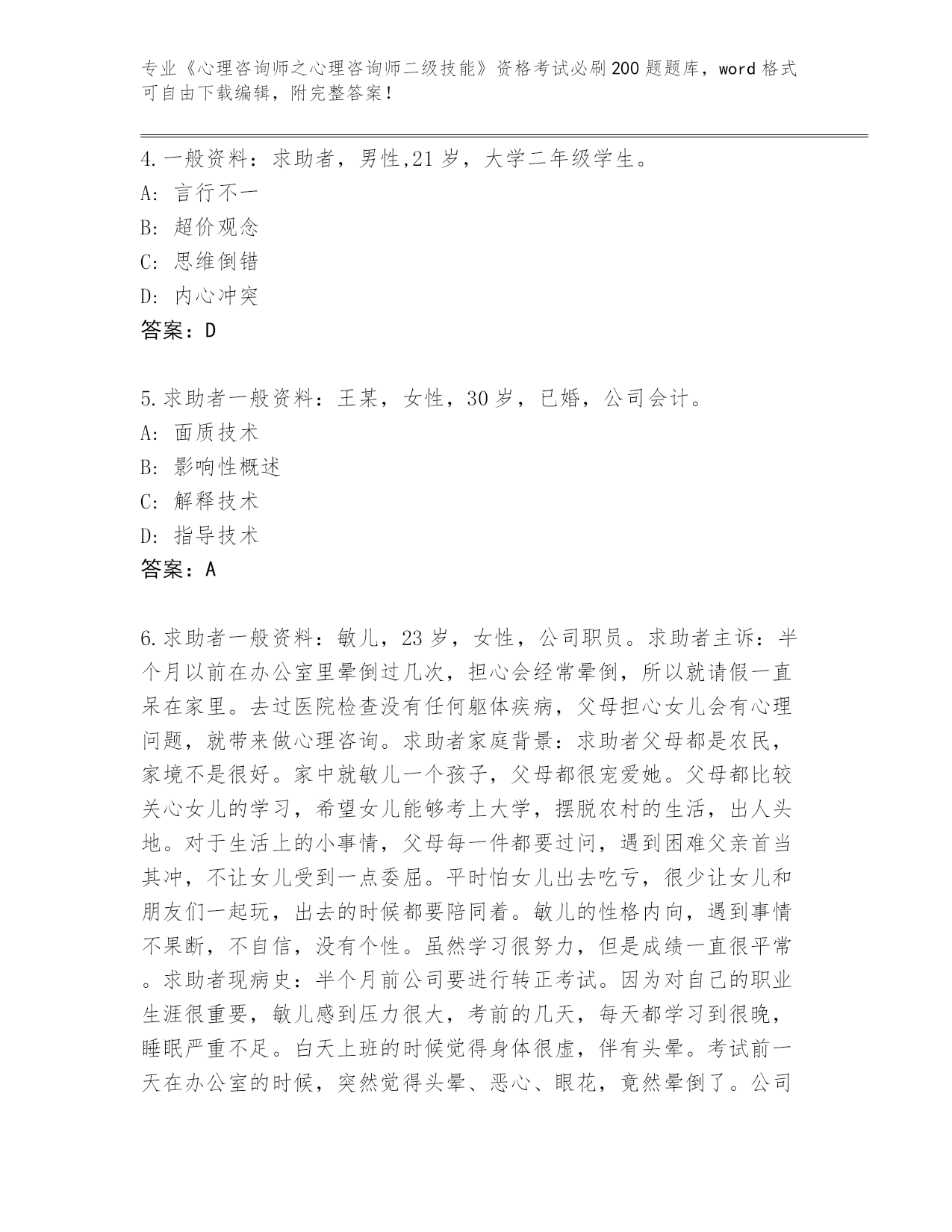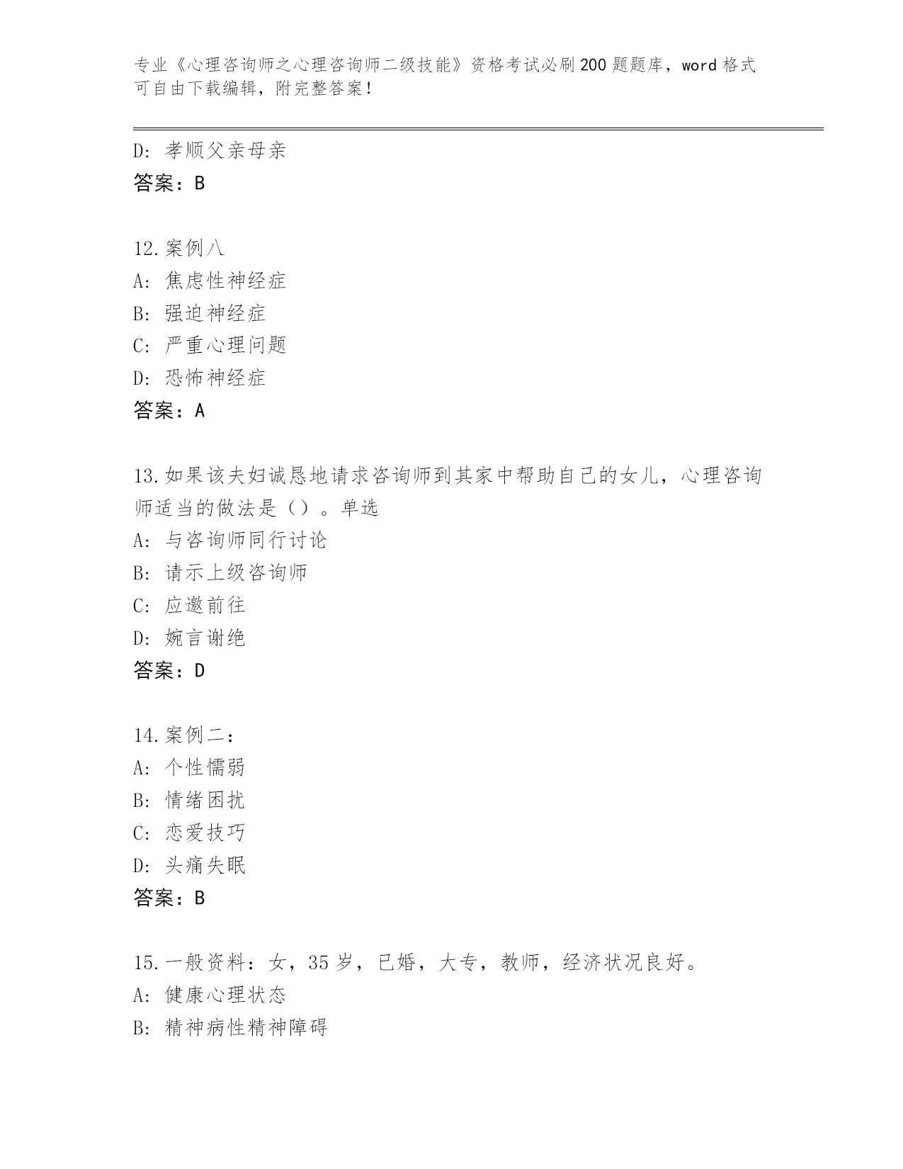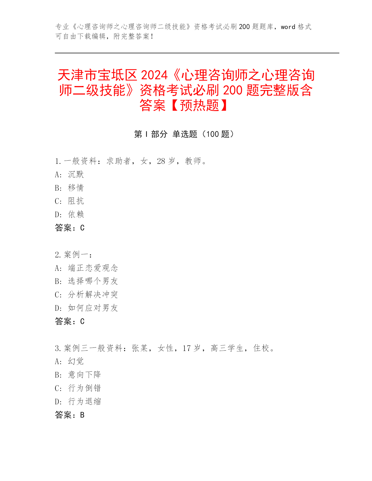 天津市宝坻区2024年《心理咨询师之心理咨询师二级技能》考试必刷200题真题题库参考答案