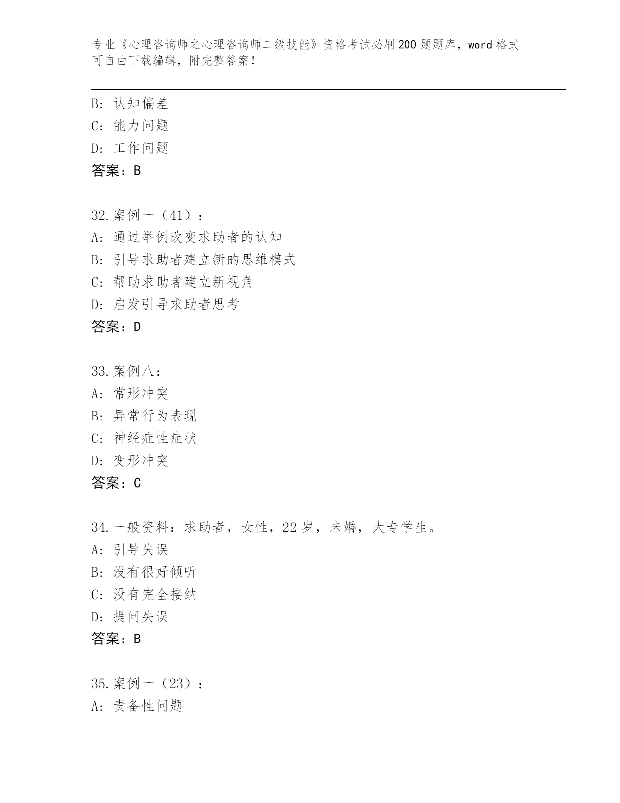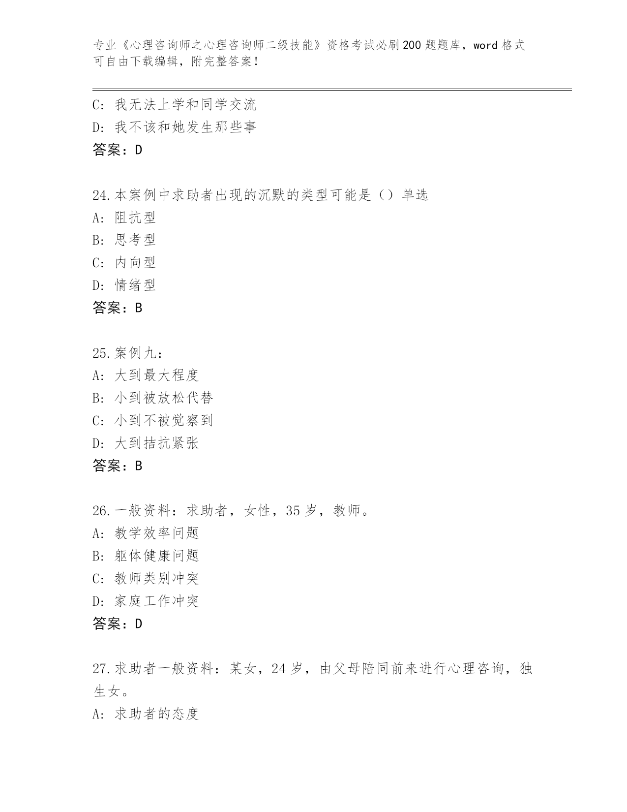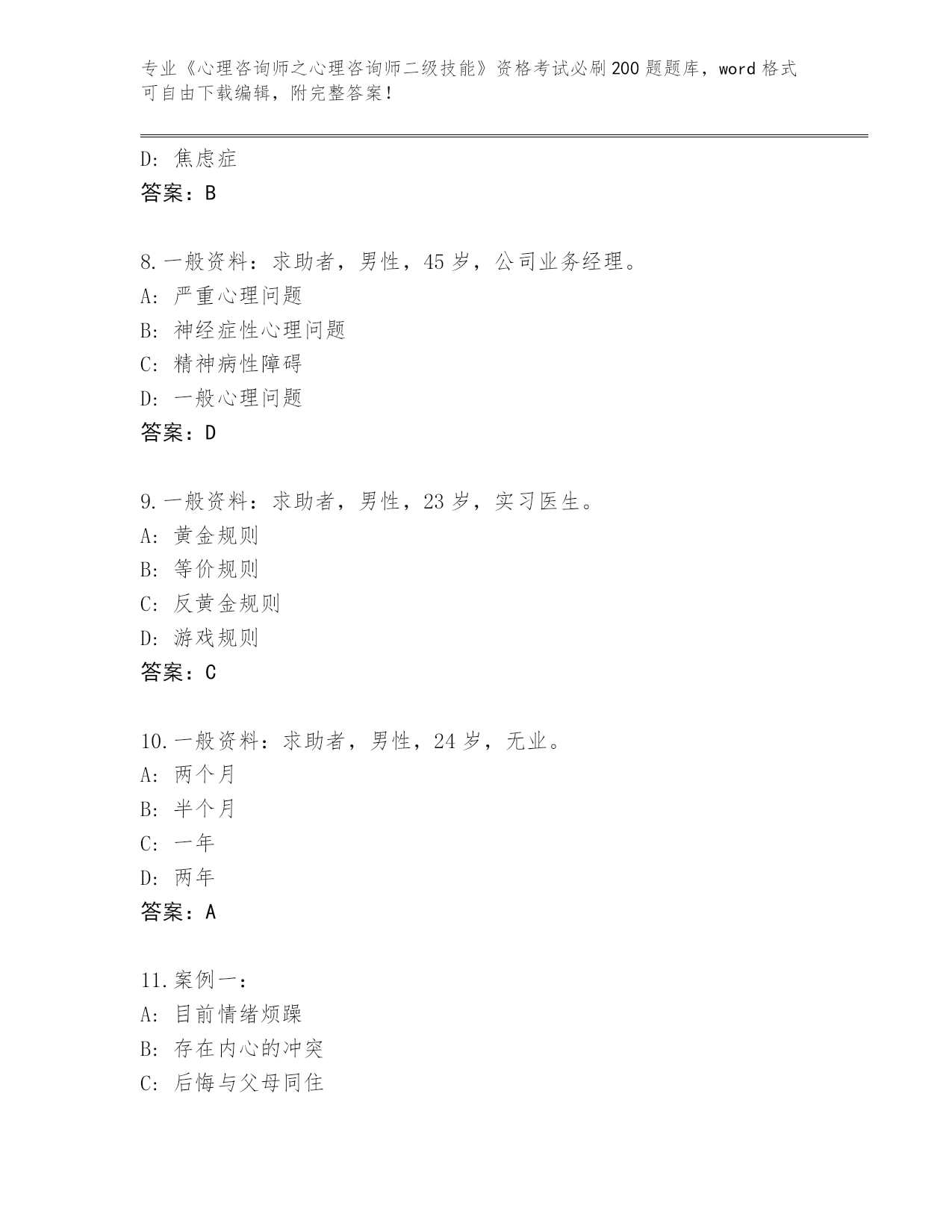 天津市宝坻区2024年《心理咨询师之心理咨询师二级技能》考试必刷200题真题题库参考答案
