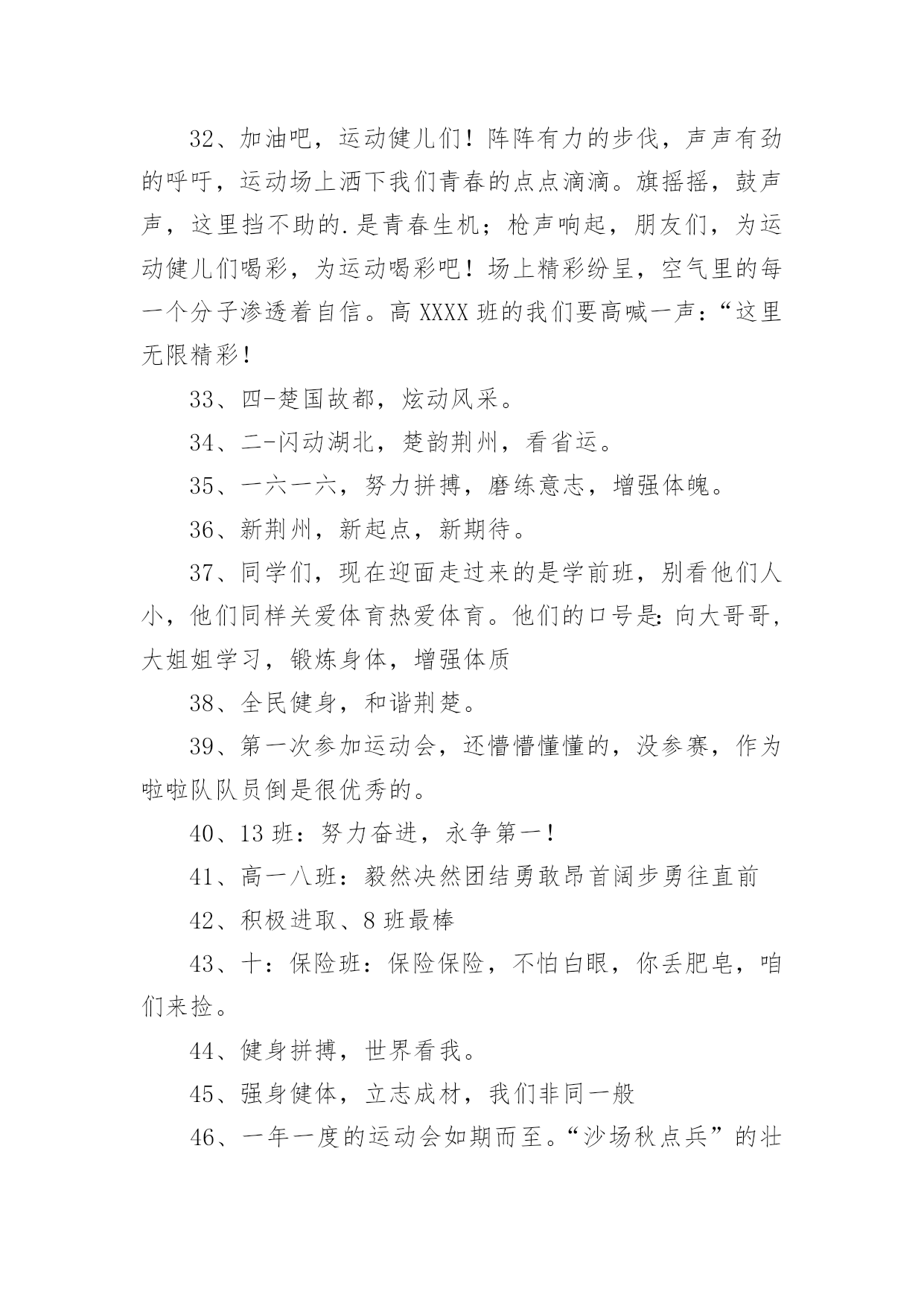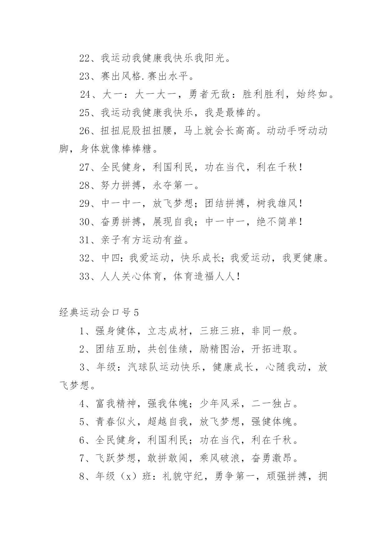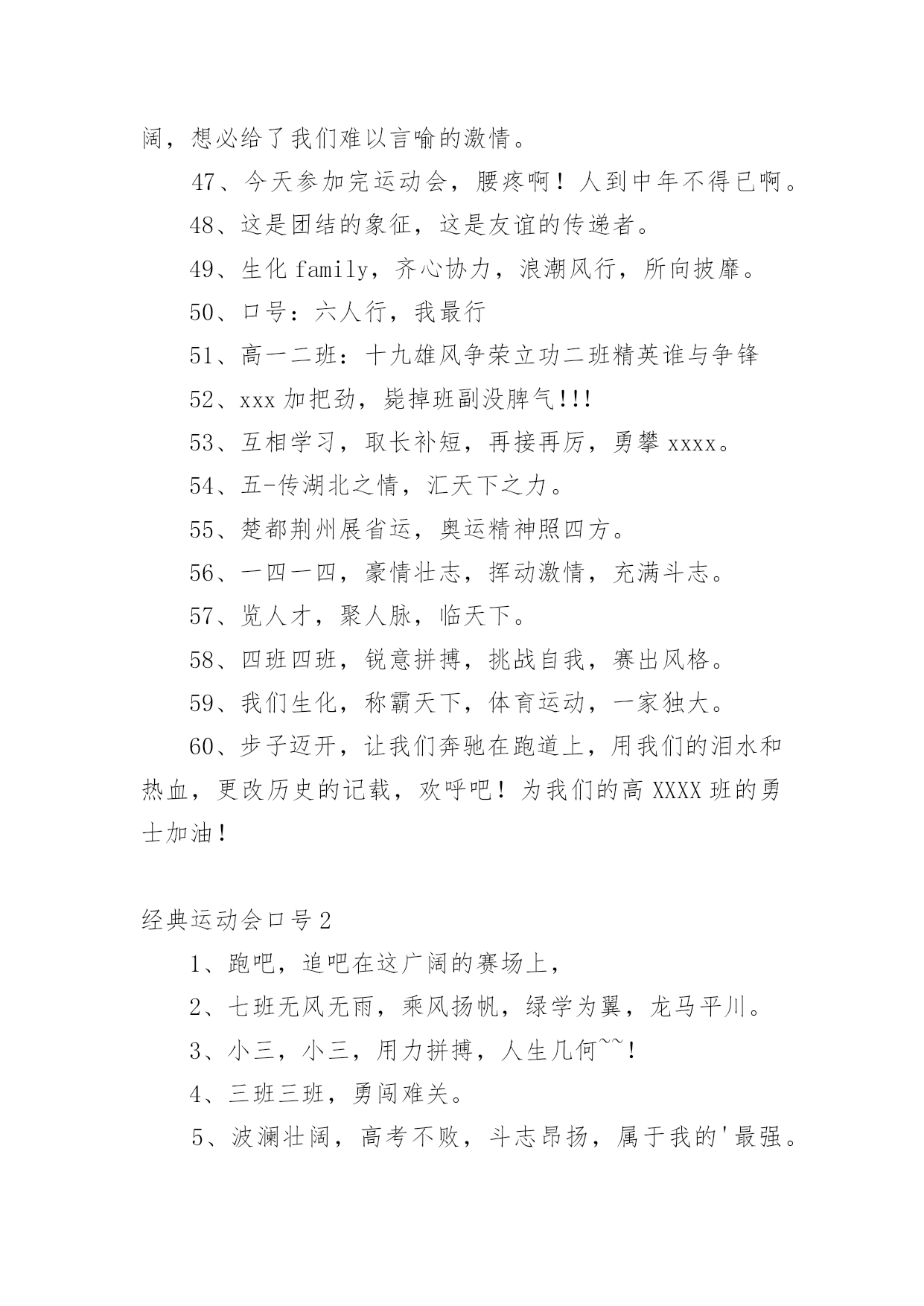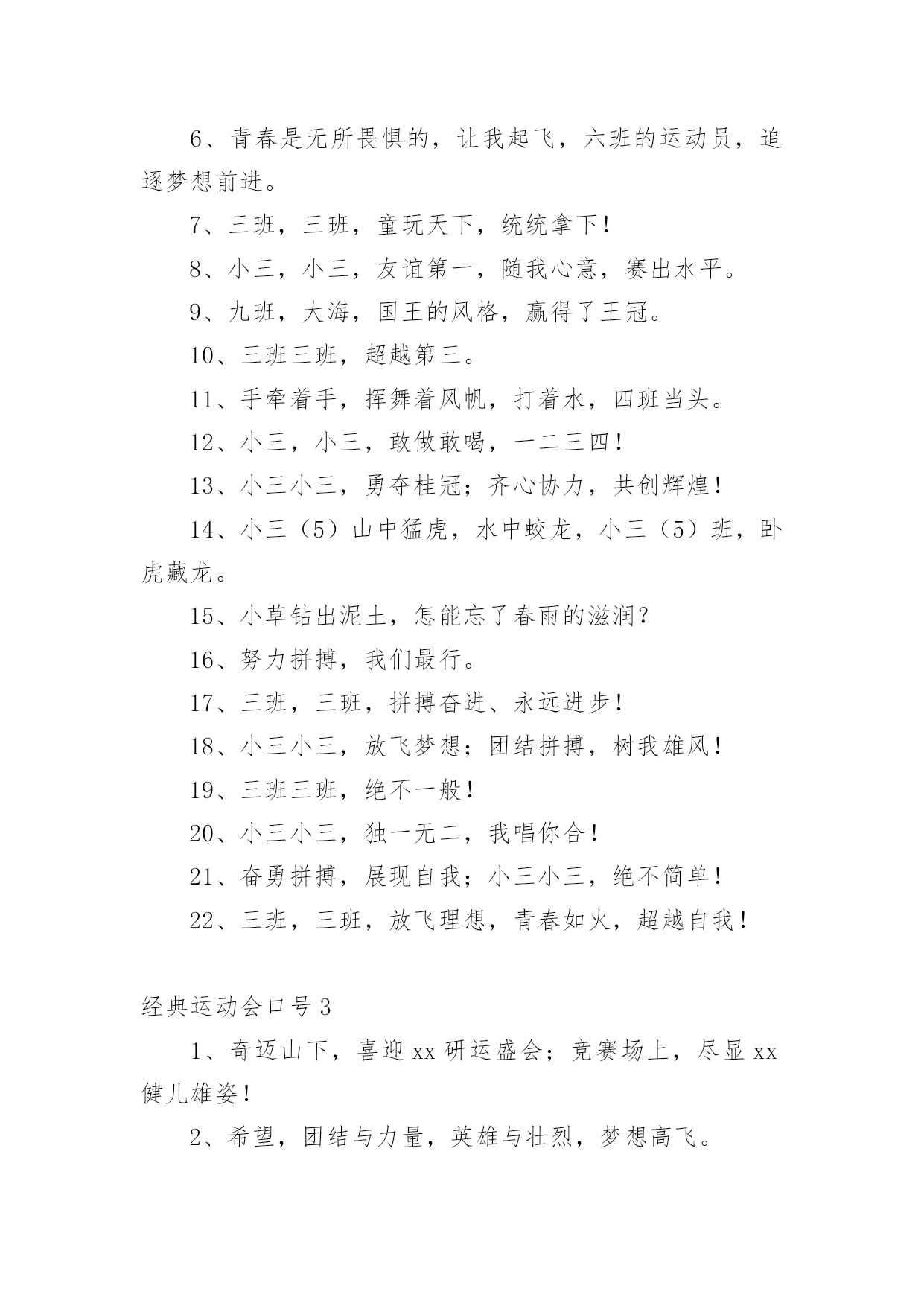 运动会口号经典运动会口号在生活、工作和学习中,大家都接触过比较经典的口号吧,口号对人们的思维是有一定的感性作用的。那什么样的口号才具有启发意义呢?下面是小编整理的经典运动会口号,仅供参考,欢迎大家阅读。经典运动会口号11、运动盛世,凝于荆州。2、不断超越,追求卓越,奋发拼搏,生化加油。3、高一一班:二0一0百炮争鸣一班扬帆傲立冰川4、六班六班,独一无二,我唱你合——!5、六班六班非同一般齐心协力勇争第一初一七班6、准备出战运动会,虽然你不是星星可在我的生命里你会发光。7、十六:九五九五,生龙活虎。建生建生(班主任),一米六五。8、秀出自信,中班最强,健康快乐是最棒!ye!9、生化一家亿,人人把心齐,团结进取,力争第一。10、三年努力,只在一搏11、不曾激越,怎能成功,生化一家,一起向前冲。12、你的汗水洒在跑道,浇灌着胜利的花朵开放。你的欢笑飞扬在赛场,XXXX班的------,为班争光数你最棒。在这宽广的赛场上,你似骏马似离铉的箭。向终点冲刺吧!13、六十:一七一七,齐心协力,咱们一齐,勇夺第一。14、二-爱我荆州,放飞奥运精神。15、青春写下我们的召唤,青春编织我们的诺言。16、礼貌四班,鳌头独占。17、41.顽强拼搏,勇夺第一,挑战自我,突破极限18、动起来,更运财。19、生化一家,团结一心,追梦扬威,青春无畏。20、五十九:真我风采,非同一般,发奋拼搏,创造辉煌。21、奋勇拼搏齐心协力22、荆楚荣耀,竞技启航。23、运动温州,“众”在有你。24、靠运动,搏世界。25、一年一度的校运会开始了,各班的运动员们擦拳磨掌,准备就绪,首先在这里预祝各班都能取得好成绩。26、星宿老仙,法力无边。掐指一算,今年夺冠。27、运动场上袜子飘,28、参加完运动会的我,像被毒打了一顿,还是那种装进麻袋的打。29、紫云至荆州,风起云涌。30、零束缚,爽感觉。31、即使落后,也顽强不屈,永不退缩!败者的心声32、加油吧,运动健儿们!阵阵有力的步伐,声声有劲的呼吁,运动场上洒下我们青春的点点滴滴。旗摇摇,鼓声声,这里挡不助的.是青春生机;枪声响起,朋友们,为运动健儿们喝彩,为运动喝彩吧!场上精彩纷呈,空气里的每一个分子渗透着自信。高XXXX班的我们要高喊一声:“这里无限精彩!33、四-楚国故都,炫动风采。34、二-闪动湖北,楚韵荆州,看省运。35、一六一六,努力拼搏,磨练意志,增强体魄。36、新荆州,新起点,新期待。37、同学们,现在迎面走过来的是学前班,别看他们人小,他们同样关爱体育热爱体育。他们的口号是:向大哥哥,大姐姐学习,锻炼身体,增强体质38、全民健身,和谐荆楚。39、第一次参加运动会,还懵懵懂懂的,没参赛,作为啦啦队队员倒是很优秀的。40、13班:努力奋进,永争第一!41、高一八班:毅然决然团结勇敢昂首阔步勇往直前42、积极进取、8班最棒43、十:保险班:保险保险,不怕白眼,你丢肥皂,咱们来捡。44、健身拼搏,世界看我。45、强身健体,立志成材,我们非同一般46、一年一度的运动会如期而至。“沙场秋点兵”的壮阔,想必给了我们难以言喻的激情。47、今天参加完运动会,腰疼啊!人到中年不得已啊。48、这是团结的象征,这是友谊的传递者。49、生化family,齐心协力,浪潮风行,所向披靡。50、口号:六人行,我最行51、高一二班:十九雄风争荣立功二班精英谁与争锋52、xxx加把劲,毙掉班副没脾气!!!53、互相学习,取长补短,再接再厉,勇攀xxxx。54、五-传湖北之情,汇天下之力。55、楚都荆州展省运,奥运精神照四方。56、一四一四,豪情壮志,挥动激情,充满斗志。57、览人才,聚人脉,临天下。58、四班四班,锐意拼搏,挑战自我,赛出风格。59、我们生化,称霸天下,体育运动,一家独大。60、步子迈开,让我们奔驰在跑道上,用我们的泪水和热血,更改历史的记载,欢呼吧!为我们的高XXXX班的勇士加油!经典运动会口号21、跑吧,追吧在这广阔的赛场上,2、七班无风无雨,乘风扬帆,绿学为翼,龙马平川。3、小三,小三,用力拼搏,人生几何~~!4、三班三班,勇闯难关。5、波澜壮阔,高考不败,斗志昂扬,属于我的'最强。6、青春是无所畏惧的,让我起飞,六班的运动员,追逐梦想前进。7、三班,三班,童玩天下,统统拿下!8、小三,小三,友谊第一,随我心意,赛出水平。9、九班,大海,国王的风格,赢得了王冠。10、三班三班,超越第三。11、手牵着手,挥舞着风帆,打着水,四班当头。12、小三,小三,敢做敢喝,一二三四!13、小三小三,勇夺桂冠;齐心协力,共创辉煌!14、小三(5)山中猛虎,水中蛟龙,小三(5)班,卧虎藏龙。15、小草钻出泥土,怎能忘了春雨的滋润?16、努力拼搏,我们最行。17、三班,三班,拼搏奋进、永远进步!18、小三小三,放飞梦想;团结拼搏,树我雄风!1
