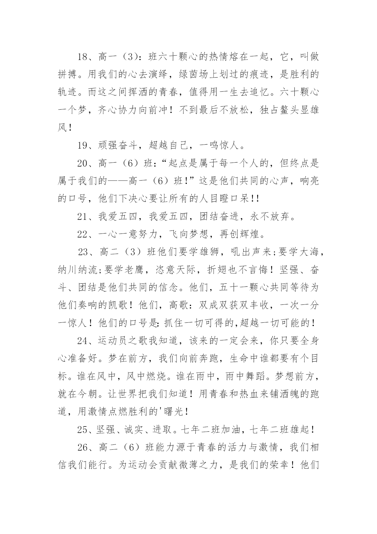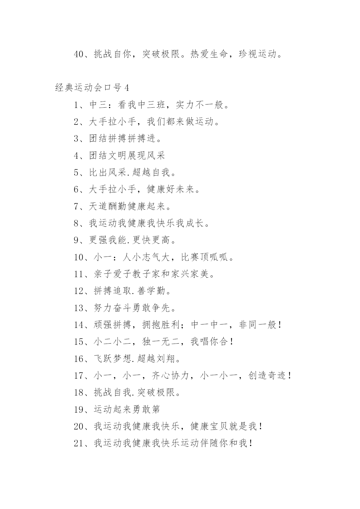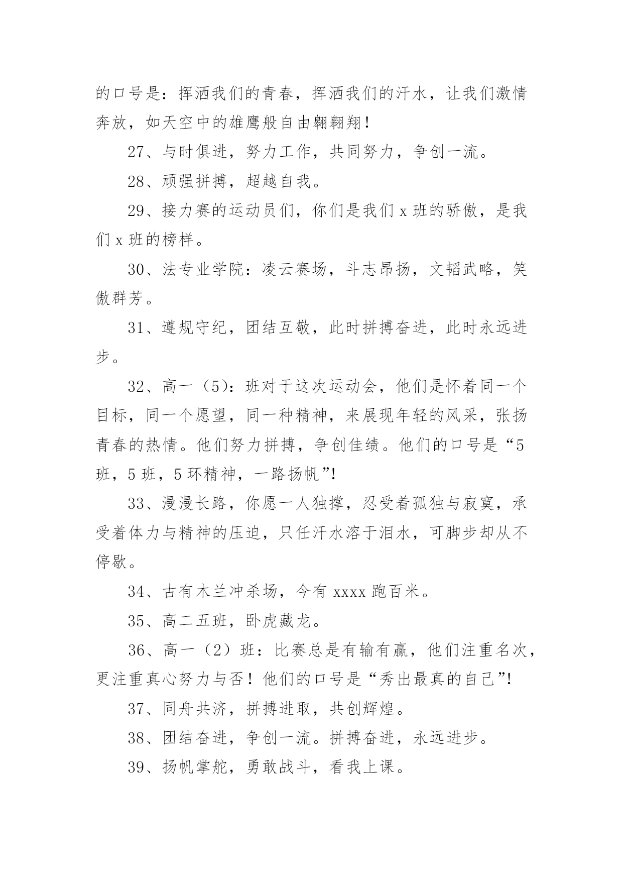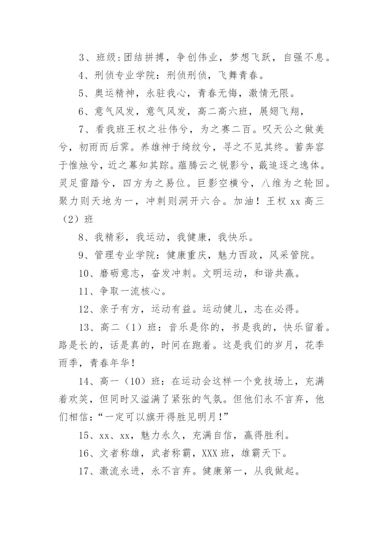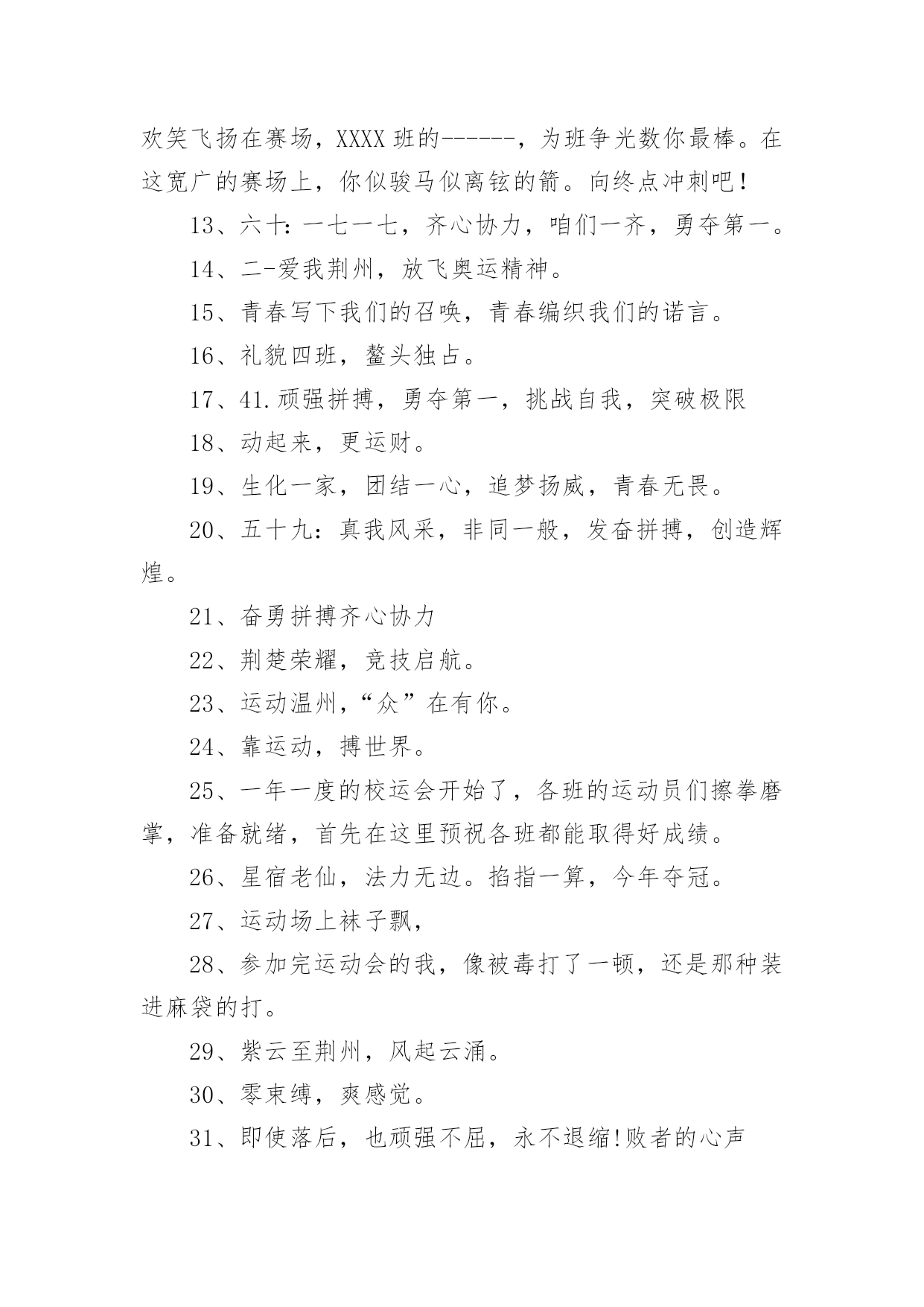 运动会口号经典运动会口号在生活、工作和学习中,大家都接触过比较经典的口号吧,口号对人们的思维是有一定的感性作用的。那什么样的口号才具有启发意义呢?下面是小编整理的经典运动会口号,仅供参考,欢迎大家阅读。经典运动会口号11、运动盛世,凝于荆州。2、不断超越,追求卓越,奋发拼搏,生化加油。3、高一一班:二0一0百炮争鸣一班扬帆傲立冰川4、六班六班,独一无二,我唱你合——!5、六班六班非同一般齐心协力勇争第一初一七班6、准备出战运动会,虽然你不是星星可在我的生命里你会发光。7、十六:九五九五,生龙活虎。建生建生(班主任),一米六五。8、秀出自信,中班最强,健康快乐是最棒!ye!9、生化一家亿,人人把心齐,团结进取,力争第一。10、三年努力,只在一搏11、不曾激越,怎能成功,生化一家,一起向前冲。12、你的汗水洒在跑道,浇灌着胜利的花朵开放。你的欢笑飞扬在赛场,XXXX班的------,为班争光数你最棒。在这宽广的赛场上,你似骏马似离铉的箭。向终点冲刺吧!13、六十:一七一七,齐心协力,咱们一齐,勇夺第一。14、二-爱我荆州,放飞奥运精神。15、青春写下我们的召唤,青春编织我们的诺言。16、礼貌四班,鳌头独占。17、41.顽强拼搏,勇夺第一,挑战自我,突破极限18、动起来,更运财。19、生化一家,团结一心,追梦扬威,青春无畏。20、五十九:真我风采,非同一般,发奋拼搏,创造辉煌。21、奋勇拼搏齐心协力22、荆楚荣耀,竞技启航。23、运动温州,“众”在有你。24、靠运动,搏世界。25、一年一度的校运会开始了,各班的运动员们擦拳磨掌,准备就绪,首先在这里预祝各班都能取得好成绩。26、星宿老仙,法力无边。掐指一算,今年夺冠。27、运动场上袜子飘,28、参加完运动会的我,像被毒打了一顿,还是那种装进麻袋的打。29、紫云至荆州,风起云涌。30、零束缚,爽感觉。31、即使落后,也顽强不屈,永不退缩!败者的心声32、加油吧,运动健儿们!阵阵有力的步伐,声声有劲的呼吁,运动场上洒下我们青春的点点滴滴。旗摇摇,鼓声声,这里挡不助的.是青春生机;枪声响起,朋友们,为运动健儿们喝彩,为运动喝彩吧!场上精彩纷呈,空气里的每一个分子渗透着自信。高XXXX班的我们要高喊一声:“这里无限精彩!33、四-楚国故都,炫动风采。34、二-闪动湖北,楚韵荆州,看省运。35、一六一六,努力拼搏,磨练意志,增强体魄。36、新荆州,新起点,新期待。37、同学们,现在迎面走过来的是学前班,别看他们人小,他们同样关爱体育热爱体育。他们的口号是:向大哥哥,大姐姐学习,锻炼身体,增强体质38、全民健身,和谐荆楚。39、第一次参加运动会,还懵懵懂懂的,没参赛,作为啦啦队队员倒是很优秀的。40、13班:努力奋进,永争第一!41、高一八班:毅然决然团结勇敢昂首阔步勇往直前42、积极进取、8班最棒43、十:保险班:保险保险,不怕白眼,你丢肥皂,咱们来捡。44、健身拼搏,世界看我。45、强身健体,立志成材,我们非同一般46、一年一度的运动会如期而至。“沙场秋点兵”的壮阔,想必给了我们难以言喻的激情。47、今天参加完运动会,腰疼啊!人到中年不得已啊。48、这是团结的象征,这是友谊的传递者。49、生化family,齐心协力,浪潮风行,所向披靡。50、口号:六人行,我最行51、高一二班:十九雄风争荣立功二班精英谁与争锋52、xxx加把劲,毙掉班副没脾气!!!53、互相学习,取长补短,再接再厉,勇攀xxxx。54、五-传湖北之情,汇天下之力。55、楚都荆州展省运,奥运精神照四方。56、一四一四,豪情壮志,挥动激情,充满斗志。57、览人才,聚人脉,临天下。58、四班四班,锐意拼搏,挑战自我,赛出风格。59、我们生化,称霸天下,体育运动,一家独大。60、步子迈开,让我们奔驰在跑道上,用我们的泪水和热血,更改历史的记载,欢呼吧!为我们的高XXXX班的勇士加油!经典运动会口号21、跑吧,追吧在这广阔的赛场上,2、七班无风无雨,乘风扬帆,绿学为翼,龙马平川。3、小三,小三,用力拼搏,人生几何~~!4、三班三班,勇闯难关。5、波澜壮阔,高考不败,斗志昂扬,属于我的'最强。6、青春是无所畏惧的,让我起飞,六班的运动员,追逐梦想前进。7、三班,三班,童玩天下,统统拿下!8、小三,小三,友谊第一,随我心意,赛出水平。9、九班,大海,国王的风格,赢得了王冠。10、三班三班,超越第三。11、手牵着手,挥舞着风帆,打着水,四班当头。12、小三,小三,敢做敢喝,一二三四!13、小三小三,勇夺桂冠;齐心协力,共创辉煌!14、小三(5)山中猛虎,水中蛟龙,小三(5)班,卧虎藏龙。15、小草钻出泥土,怎能忘了春雨的滋润?16、努力拼搏,我们最行。17、三班,三班,拼搏奋进、永远进步!18、小三小三,放飞梦想;团结拼搏,树我雄风!1