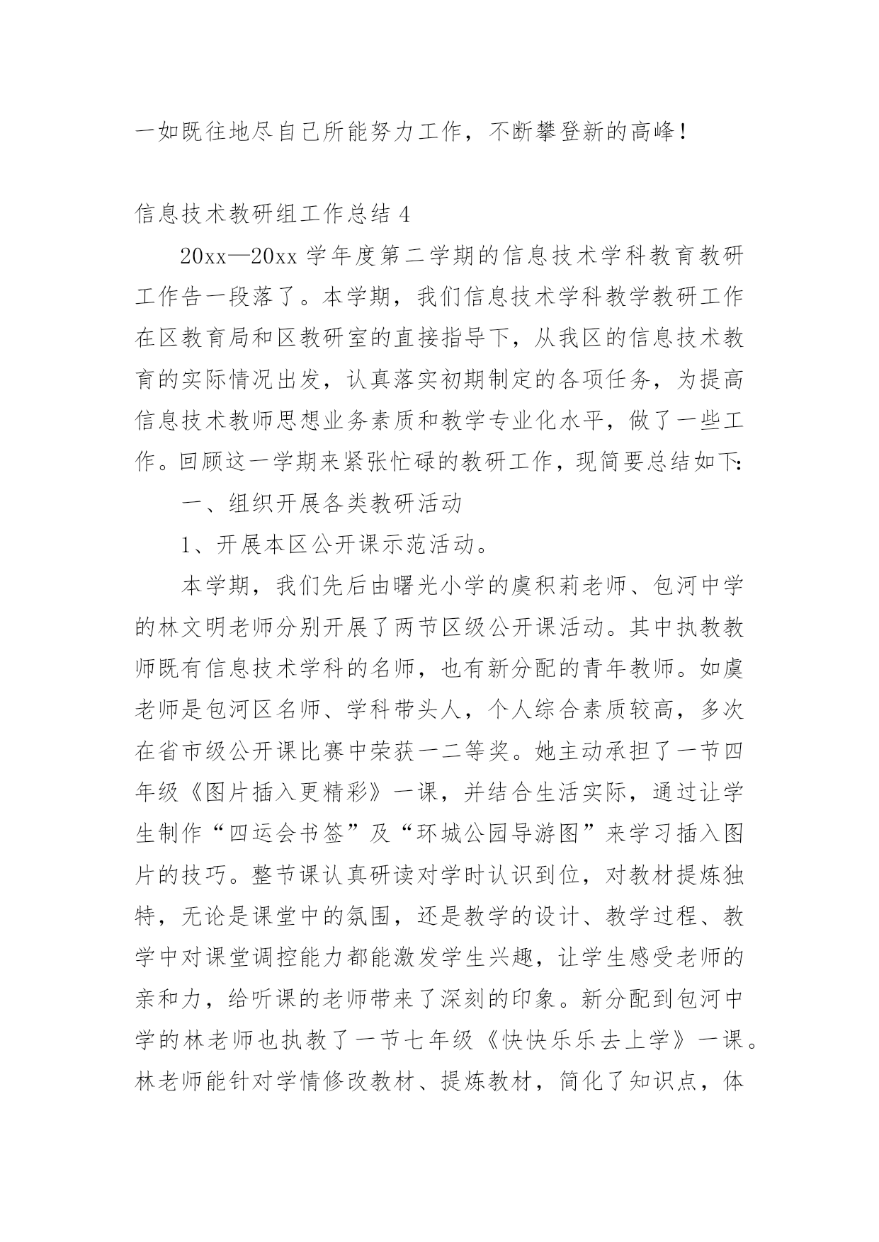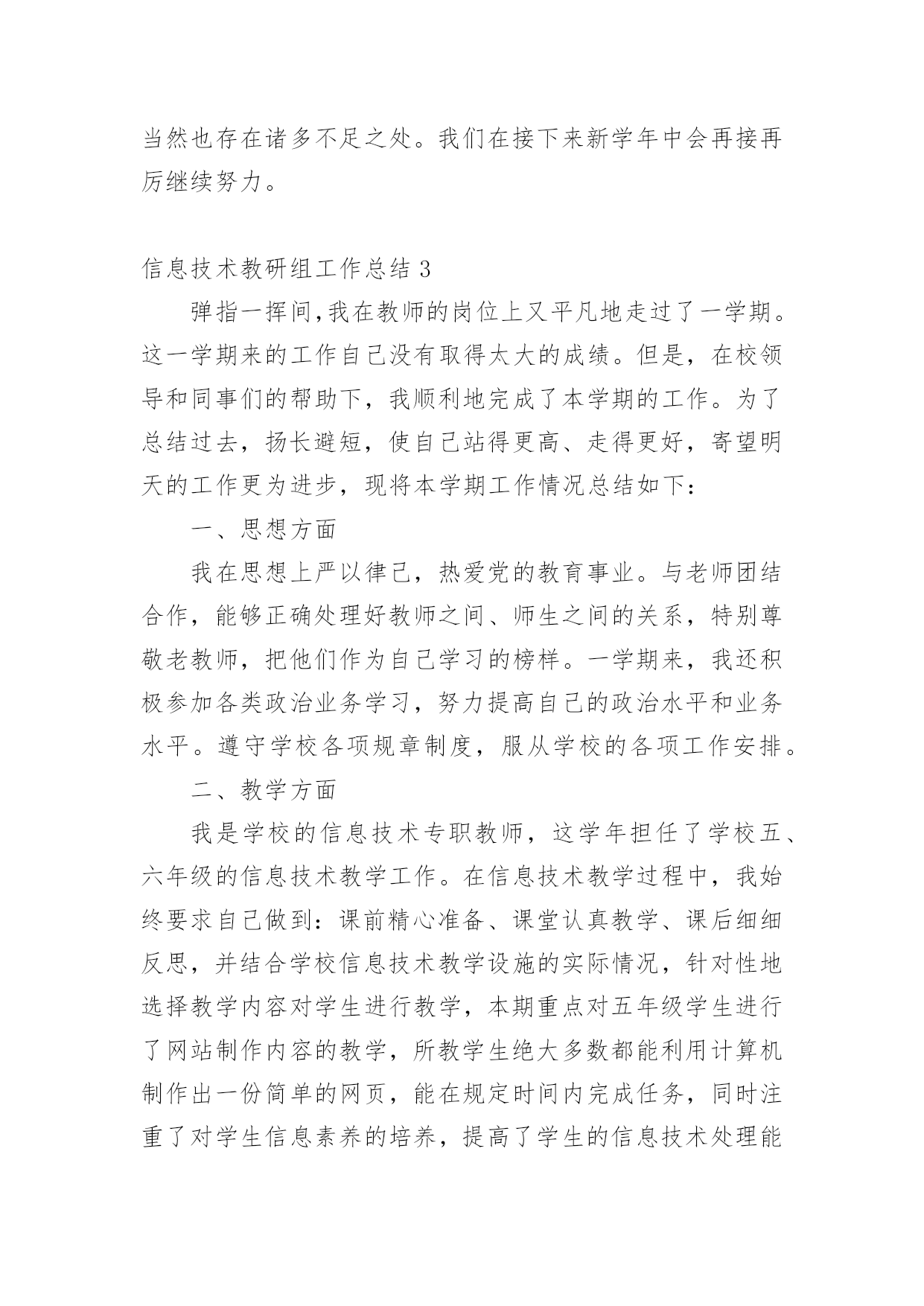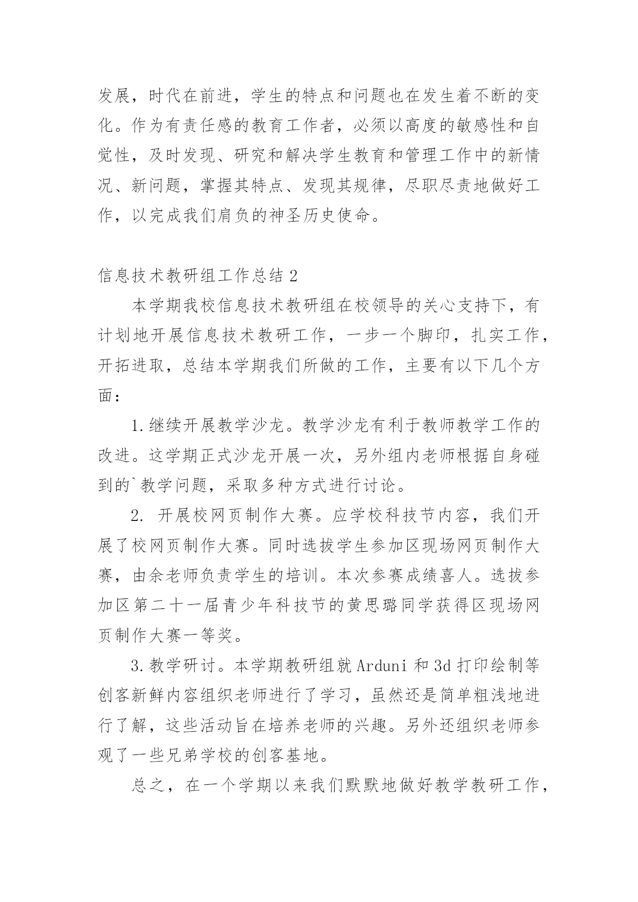 信息技术教研组工作总结总结是把一定阶段内的有关情况分析研究,做出有指导性结论的书面材料,他能够提升我们的书面表达能力,让我们抽出时间写写总结吧。你想知道总结怎么写吗?下面是小编精心整理的信息技术教研组工作总结,仅供参考,欢迎大家阅读。信息技术教研组工作总结1学年即将结束,回顾这一学期,本人能够努力工作,从多方面进行计算机教学工作。有辛勤的耕耘,有收获的喜悦,也有不足与遗憾,现总结如下:一、取得的成绩1、讲课时使用孩子们喜欢的语言,和他们融为一体。有效的调节课堂教学的气氛。灵活多样的使用各种教学方法。多开展一些比赛,刺激孩子们学习。在学生中开展互助小组,优秀的带动困难学生,让孩子们在学习中培养团结互助的精神,达到教书育人的目的精炼教授过程,小孩子一般精力集中的时间有限,抓住有限的时间让他们掌握更多的知识,提高课堂效率。2、在教学中,我经常研究学生的思想发展变化,为了提高学生学习信息技术的兴趣,在不影响教学的情况下,我们从光盘上或到网上去找了一些有利于学生智力发展的小游戏,把这些游戏在学生完成学习任务后给学生玩,让学生既巩固了所学知识,又提高了学习兴趣,并有助于学生智力发展。经本期实践,取得了很好的效果。学生不但掌握了规定的信息技术知识和达到了规定的操作技能水平,而且还从游戏中学到了许多其它的知识。信息技术课已经成了学生十分喜欢的课程之一。3、在教学之余,我们还努力搞好我们的第二课堂,在第二课堂里,学生学到许多平时在信息技术课上学不到的知识,比如有的.学生学会用计算机来解决一些其它学科学习中遇到的问题。二、存在的不足信息技术是一门不断发展的学科,展望学校的发展和学科的发展,我觉得还有许多知识要学,还有许多事情要做。在今后的教育教学工作中,我将更严格要求自己,努力工作,发扬优点,改正缺点,开拓前进,争取取得更大的进步。三、努力方向1、加强自身基本功的训练,课堂上做到精讲精练,注重对学生能力的培养。2、对差生多些关心,多点爱心,再多一些耐心,使他们在对计算机的认识上有更大进步。3、加强机房纪律和机器使用道德方面的教育,使学生不仅在班级集中注意力学习,在机房上机时也要按规定严格约束自己。4、利用各种方法,训练学生提高、集中注意力。教育工作,是一项常做常新、永无止境的工作。社会在发展,时代在前进,学生的特点和问题也在发生着不断的变化。作为有责任感的教育工作者,必须以高度的敏感性和自觉性,及时发现、研究和解决学生教育和管理工作中的新情况、新问题,掌握其特点、发现其规律,尽职尽责地做好工作,以完成我们肩负的神圣历史使命。信息技术教研组工作总结2本学期我校信息技术教研组在校领导的关心支持下,有计划地开展信息技术教研工作,一步一个脚印,扎实工作,开拓进取,总结本学期我们所做的工作,主要有以下几个方面:1.继续开展教学沙龙。教学沙龙有利于教师教学工作的改进。这学期正式沙龙开展一次,另外组内老师根据自身碰到的`教学问题,采取多种方式进行讨论。2.开展校网页制作大赛。应学校科技节内容,我们开展了校网页制作大赛。同时选拔学生参加区现场网页制作大赛,由余老师负责学生的培训。本次参赛成绩喜人。选拔参加区第二十一届青少年科技节的黄思璐同学获得区现场网页制作大赛一等奖。3.教学研讨。本学期教研组就Arduni和3d打印绘制等创客新鲜内容组织老师进行了学习,虽然还是简单粗浅地进行了解,这些活动旨在培养老师的兴趣。另外还组织老师参观了一些兄弟学校的创客基地。总之,在一个学期以来我们默默地做好教学教研工作,当然也存在诸多不足之处。我们在接下来新学年中会再接再厉继续努力。信息技术教研组工作总结3弹指一挥间,我在教师的岗位上又平凡地走过了一学期。这一学期来的工作自己没有取得太大的成绩。但是,在校领导和同事们的帮助下,我顺利地完成了本学期的工作。为了总结过去,扬长避短,使自己站得更高、走得更好,寄望明天的工作更为进步,现将本学期工作情况总结如下:一、思想方面我在思想上严以律己,热爱党的教育事业。与老师团结合作,能够正确处理好教师之间、师生之间的关系,特别尊敬老教师,把他们作为自己学习的榜样。一学期来,我还积极参加各类政治业务学习,努力提高自己的政治水平和业务水平。遵守学校各项规章制度,服从学校的各项工作安排。二、教学方面我是学校的信息技术专职教师,这学年担任了学校五、六年级的信息技术教学工作。在信息技术教学过程中,我始终要求自己做到:课前精心准备、课堂认真教学、课后细细反思,并结合学校信息技术教学设施的实际情况,针对性地选择教学内容对学生进行教学,本期重点对五年级学生进行了网站制作内容的教学,所教学生绝大多数都能利用计算机制作出一份简单的网页,能在规定时间内完成任务,同时注重了对学生信息素养的培养,提高了学生的信息技术处理能力。此外,我还负责学校远程教育资源的'接收工作