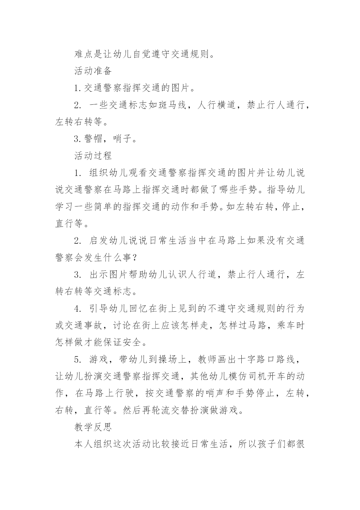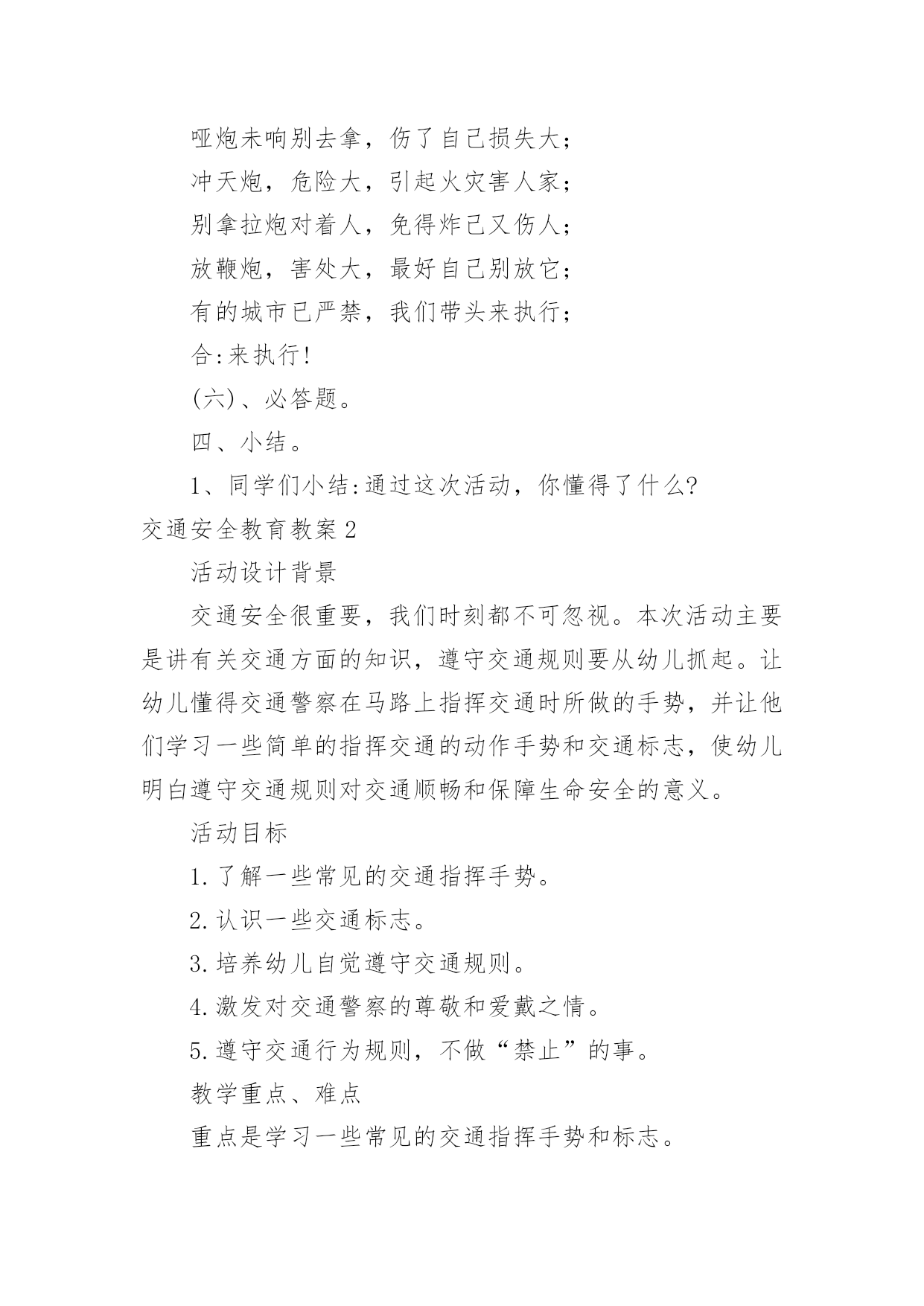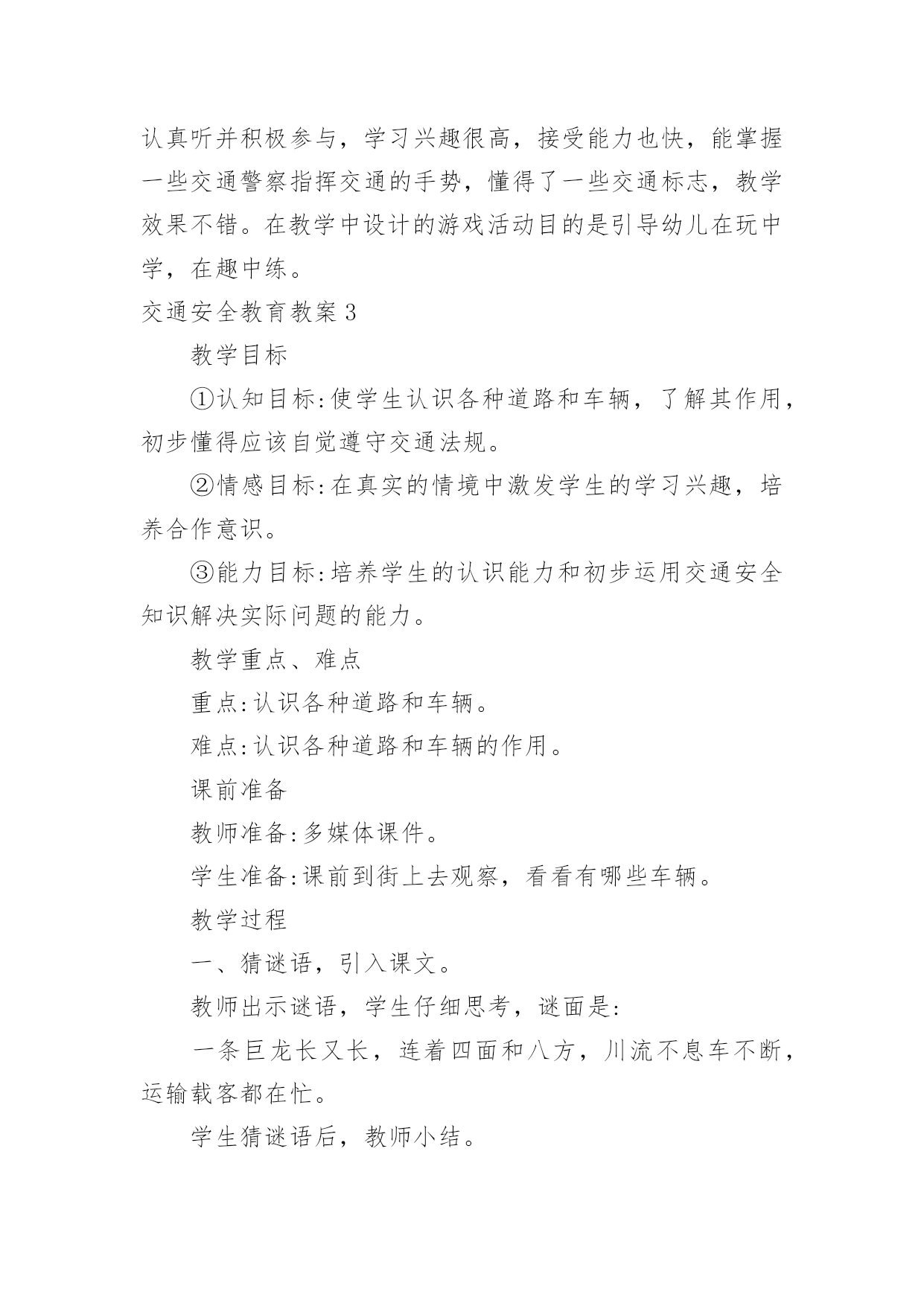 交通安全教育教案交通安全教育教案19篇作为一名专为他人授业解惑的人民教师,通常会被要求编写教案,教案有助于顺利而有效地开展教学活动。写教案需要注意哪些格式呢?下面是小编整理的交通安全教育教案,供大家参考借鉴,希望可以帮助到有需要的朋友。交通安全教育教案1一、教学目的:1、通过读新闻、抢答、演小品等形式引起同学们对交通安全的重视。2、通过本次班会活动,是同学们了解一些基本的交通规则及交通标志,并逐步形成自觉遵守交通规则的良好的行为习惯。二、课前准备:1、让同学们收集有关交通事故的新闻。2、组织学生排演小品。3、选好及训练班会主持。4、了解一些基本的交通规则。5、了解一些常见的标志。三、活动过程:(一)、主持读有关交通事故的新闻以引入主题。1、主持a读新闻。2、主持b:大家听了这则新闻有什么感想?3、同学们各抒己见。4、主持小结:a:生命在你手中,交通安全不容忽视。b:所以今天我们就一起来学习交通安全,时时刻刻注意安全,并要养成自觉遵守交通规则的好习惯。(二)、知识竞赛(抢答形式)(三)、看小品,议一议。1、小品内容:一名小学生放学回家由于不遵守交通规则,结果出了车祸。2、小品内容:两名小学生在马路上踢球,结果拣球的时候,出了车祸。3、议一议。这几个小朋友违反了哪些交通规则?我们应如何遵守交通安全?4、把小朋友的错误纠正过来。5、由小品、谈心得体会。(四)、轻松一笑。小合唱《祖国、祖国我爱你》(五)、板板。合:节日到,真热闹,小朋友,放鞭炮;柴草旁,屋前后,严格禁止放鞭炮;点炮引,要用香,别用火柴打火机;哑炮未响别去拿,伤了自己损失大;冲天炮,危险大,引起火灾害人家;别拿拉炮对着人,免得炸己又伤人;放鞭炮,害处大,最好自己别放它;有的城市已严禁,我们带头来执行;合:来执行!(六)、必答题。四、小结。1、同学们小结:通过这次活动,你懂得了什么?交通安全教育教案2活动设计背景交通安全很重要,我们时刻都不可忽视。本次活动主要是讲有关交通方面的知识,遵守交通规则要从幼儿抓起。让幼儿懂得交通警察在马路上指挥交通时所做的手势,并让他们学习一些简单的指挥交通的动作手势和交通标志,使幼儿明白遵守交通规则对交通顺畅和保障生命安全的意义。活动目标1.了解一些常见的交通指挥手势。2.认识一些交通标志。3.培养幼儿自觉遵守交通规则。4.激发对交通警察的尊敬和爱戴之情。5.遵守交通行为规则,不做“禁止”的事。教学重点、难点重点是学习一些常见的交通指挥手势和标志。难点是让幼儿自觉遵守交通规则。活动准备1.交通警察指挥交通的图片。2.一些交通标志如斑马线,人行横道,禁止行人通行,左转右转等。3.警帽,哨子。活动过程1.组织幼儿观看交通警察指挥交通的图片并让幼儿说说交通警察在马路上指挥交通时都做了哪些手势。指导幼儿学习一些简单的指挥交通的动作和手势。如左转右转,停止,直行等。2.启发幼儿说说日常生活当中在马路上如果没有交通警察会发生什么事?3.出示图片帮助幼儿认识人行道,禁止行人通行,左转右转等交通标志。4.引导幼儿回忆在街上见到的不遵守交通规则的行为或交通事故,讨论在街上应该怎样走,怎样过马路,乘车时怎样做才能保证安全。5.游戏,带幼儿到操场上,教师画出十字路口路线,让幼儿扮演交通警察指挥交通,其他幼儿模仿司机开车的动作,在马路上行驶,按交通警察的哨声和手势停止,左转,右转,直行等。然后再轮流交替扮演做游戏。教学反思本人组织这次活动比较接近日常生活,所以孩子们都很认真听并积极参与,学习兴趣很高,接受能力也快,能掌握一些交通警察指挥交通的手势,懂得了一些交通标志,教学效果不错。在教学中设计的游戏活动目的是引导幼儿在玩中学,在趣中练。交通安全教育教案3教学目标①认知目标:使学生认识各种道路和车辆,了解其作用,初步懂得应该自觉遵守交通法规。②情感目标:在真实的情境中激发学生的学习兴趣,培养合作意识。③能力目标:培养学生的认识能力和初步运用交通安全知识解决实际问题的能力。教学重点、难点重点:认识各种道路和车辆。难点:认识各种道路和车辆的作用。课前准备教师准备:多媒体课件。学生准备:课前到街上去观察,看看有哪些车辆。教学过程一、猜谜语,引入课文。教师出示谜语,学生仔细思考,谜面是:一条巨龙长又长,连着四面和八方,川流不息车不断,运输载客都在忙。学生猜谜语后,教师小结。板书课题:让我们来认识道路和车辆。二、认识道路多媒体演示各种城市道路,思考:什么是道路?学生交流:你应该怎样安全行走?说一说,你平时看到的那些城市道路?三、认识车辆A、思考:①车辆是指什么?你认识哪些车辆?②什么是特种车辆和非机动车?你知道的非机动车有哪些?它们各有什么作用?B、小组进行讨论,交流学习体会;c、检查自学效果,小组长汇报;d、引导小结:通过学习,我们懂得了一些简单的道路设施和车辆名称,知道