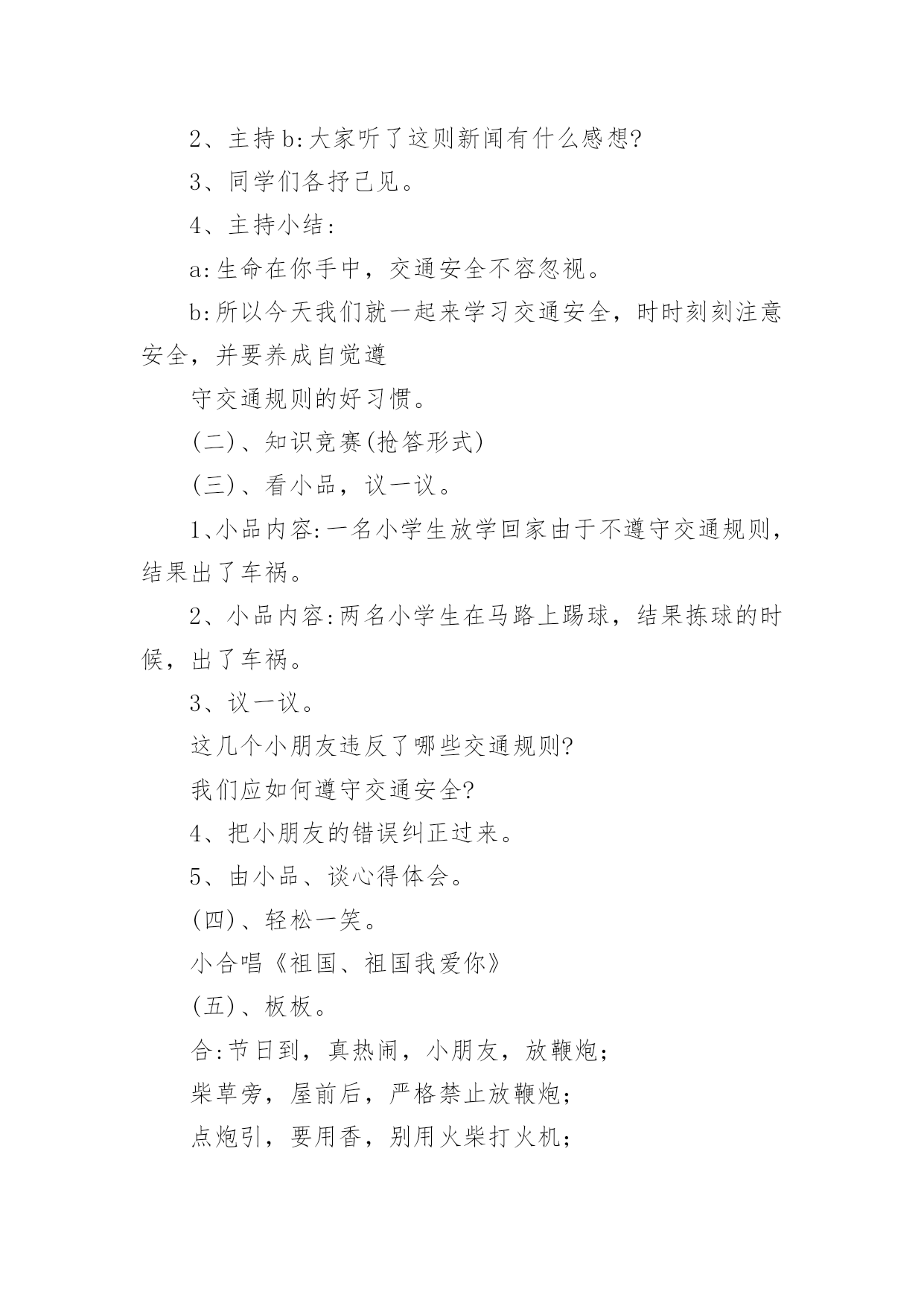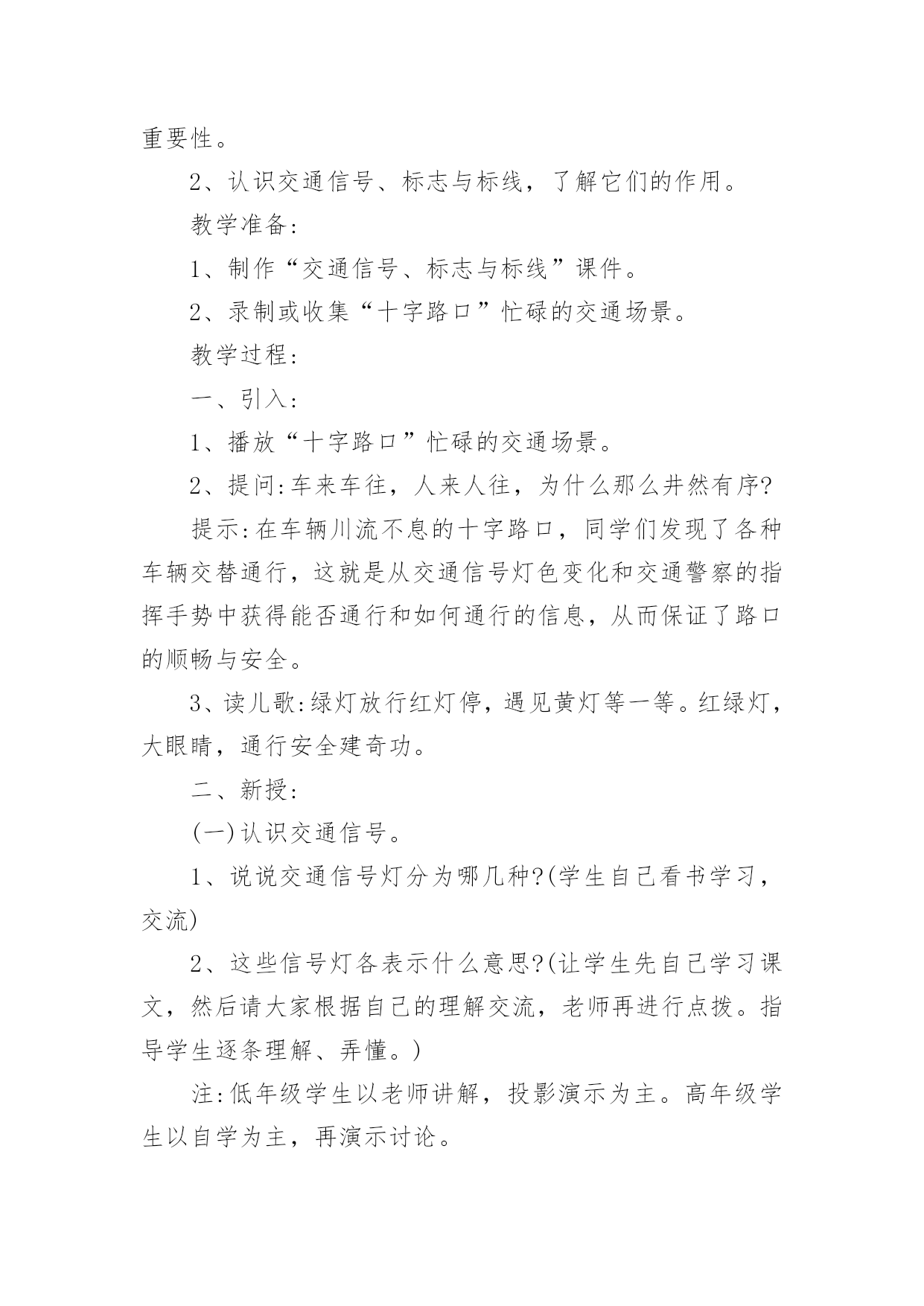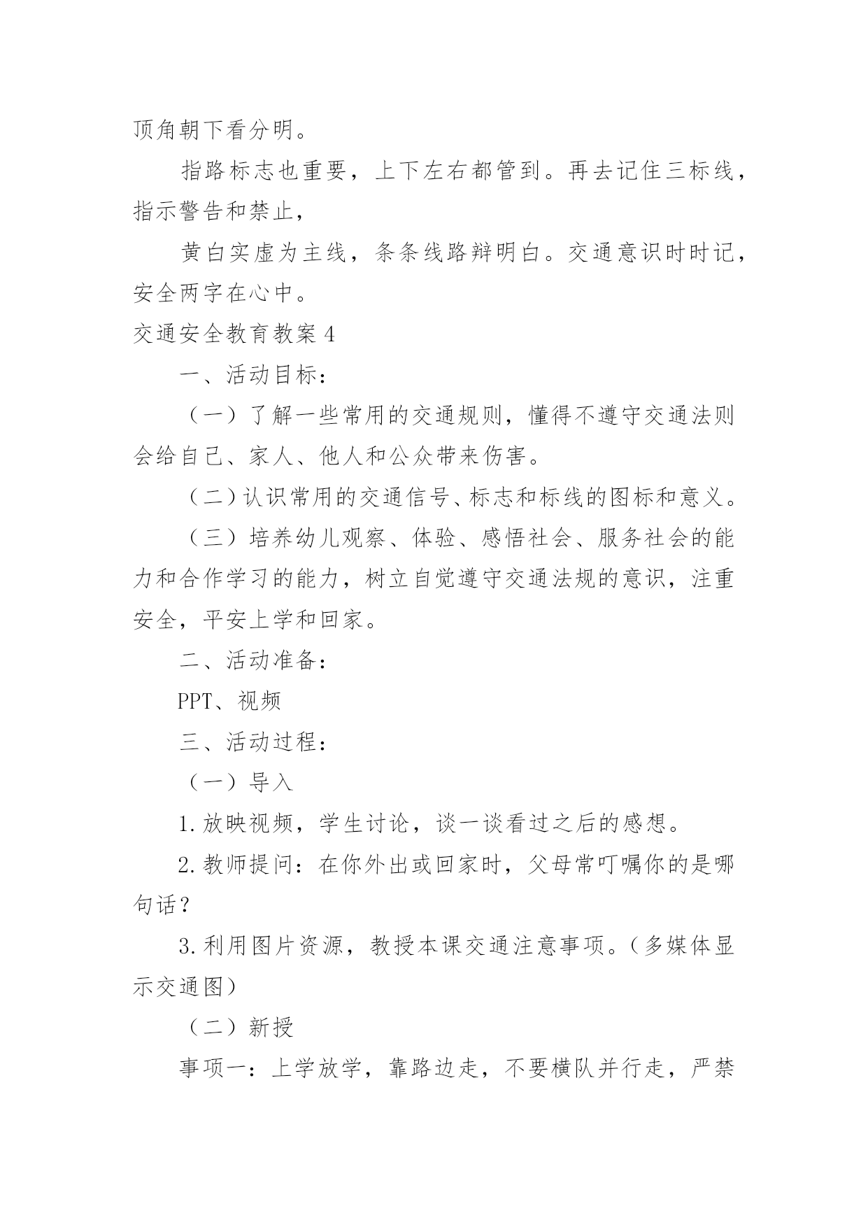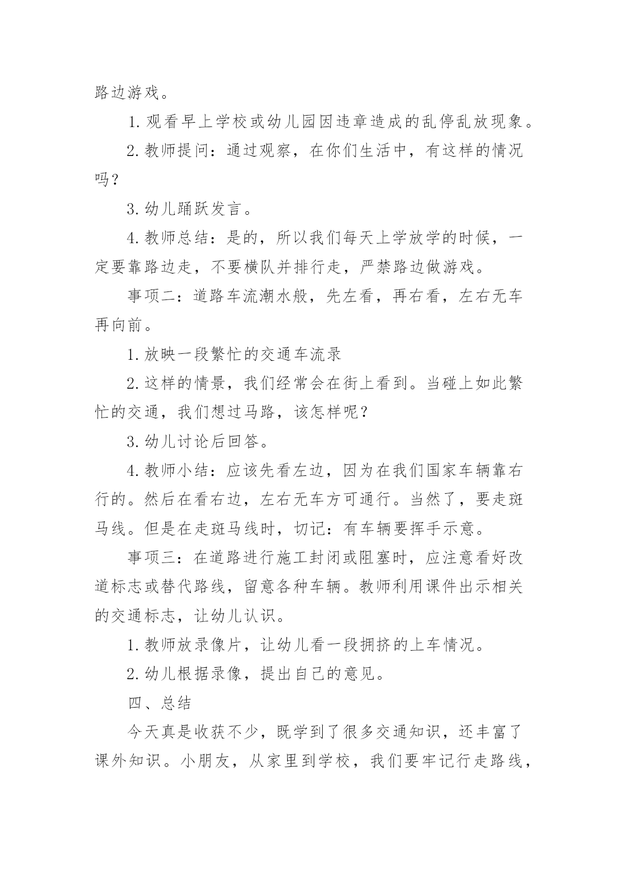 交通安全教育教案交通安全教育教案19篇作为一名专为他人授业解惑的人民教师,通常会被要求编写教案,教案有助于顺利而有效地开展教学活动。写教案需要注意哪些格式呢?下面是小编整理的交通安全教育教案,供大家参考借鉴,希望可以帮助到有需要的朋友。交通安全教育教案1一、教学目的:1、通过读新闻、抢答、演小品等形式引起同学们对交通安全的重视。2、通过本次班会活动,是同学们了解一些基本的交通规则及交通标志,并逐步形成自觉遵守交通规则的良好的行为习惯。二、课前准备:1、让同学们收集有关交通事故的新闻。2、组织学生排演小品。3、选好及训练班会主持。4、了解一些基本的交通规则。5、了解一些常见的标志。三、活动过程:(一)、主持读有关交通事故的新闻以引入主题。1、主持a读新闻。2、主持b:大家听了这则新闻有什么感想?3、同学们各抒己见。4、主持小结:a:生命在你手中,交通安全不容忽视。b:所以今天我们就一起来学习交通安全,时时刻刻注意安全,并要养成自觉遵守交通规则的好习惯。(二)、知识竞赛(抢答形式)(三)、看小品,议一议。1、小品内容:一名小学生放学回家由于不遵守交通规则,结果出了车祸。2、小品内容:两名小学生在马路上踢球,结果拣球的时候,出了车祸。3、议一议。这几个小朋友违反了哪些交通规则?我们应如何遵守交通安全?4、把小朋友的错误纠正过来。5、由小品、谈心得体会。(四)、轻松一笑。小合唱《祖国、祖国我爱你》(五)、板板。合:节日到,真热闹,小朋友,放鞭炮;柴草旁,屋前后,严格禁止放鞭炮;点炮引,要用香,别用火柴打火机;哑炮未响别去拿,伤了自己损失大;冲天炮,危险大,引起火灾害人家;别拿拉炮对着人,免得炸己又伤人;放鞭炮,害处大,最好自己别放它;有的城市已严禁,我们带头来执行;合:来执行!(六)、必答题。四、小结。1、同学们小结:通过这次活动,你懂得了什么?交通安全教育教案2活动设计背景交通安全很重要,我们时刻都不可忽视。本次活动主要是讲有关交通方面的知识,遵守交通规则要从幼儿抓起。让幼儿懂得交通警察在马路上指挥交通时所做的手势,并让他们学习一些简单的指挥交通的动作手势和交通标志,使幼儿明白遵守交通规则对交通顺畅和保障生命安全的意义。活动目标1.了解一些常见的交通指挥手势。2.认识一些交通标志。3.培养幼儿自觉遵守交通规则。4.激发对交通警察的尊敬和爱戴之情。5.遵守交通行为规则,不做“禁止”的事。教学重点、难点重点是学习一些常见的交通指挥手势和标志。难点是让幼儿自觉遵守交通规则。活动准备1.交通警察指挥交通的图片。2.一些交通标志如斑马线,人行横道,禁止行人通行,左转右转等。3.警帽,哨子。活动过程1.组织幼儿观看交通警察指挥交通的图片并让幼儿说说交通警察在马路上指挥交通时都做了哪些手势。指导幼儿学习一些简单的指挥交通的动作和手势。如左转右转,停止,直行等。2.启发幼儿说说日常生活当中在马路上如果没有交通警察会发生什么事?3.出示图片帮助幼儿认识人行道,禁止行人通行,左转右转等交通标志。4.引导幼儿回忆在街上见到的不遵守交通规则的行为或交通事故,讨论在街上应该怎样走,怎样过马路,乘车时怎样做才能保证安全。5.游戏,带幼儿到操场上,教师画出十字路口路线,让幼儿扮演交通警察指挥交通,其他幼儿模仿司机开车的动作,在马路上行驶,按交通警察的哨声和手势停止,左转,右转,直行等。然后再轮流交替扮演做游戏。教学反思本人组织这次活动比较接近日常生活,所以孩子们都很认真听并积极参与,学习兴趣很高,接受能力也快,能掌握一些交通警察指挥交通的手势,懂得了一些交通标志,教学效果不错。在教学中设计的游戏活动目的是引导幼儿在玩中学,在趣中练。交通安全教育教案3教学目标①认知目标:使学生认识各种道路和车辆,了解其作用,初步懂得应该自觉遵守交通法规。②情感目标:在真实的情境中激发学生的学习兴趣,培养合作意识。③能力目标:培养学生的认识能力和初步运用交通安全知识解决实际问题的能力。教学重点、难点重点:认识各种道路和车辆。难点:认识各种道路和车辆的作用。课前准备教师准备:多媒体课件。学生准备:课前到街上去观察,看看有哪些车辆。教学过程一、猜谜语,引入课文。教师出示谜语,学生仔细思考,谜面是:一条巨龙长又长,连着四面和八方,川流不息车不断,运输载客都在忙。学生猜谜语后,教师小结。板书课题:让我们来认识道路和车辆。二、认识道路多媒体演示各种城市道路,思考:什么是道路?学生交流:你应该怎样安全行走?说一说,你平时看到的那些城市道路?三、认识车辆A、思考:①车辆是指什么?你认识哪些车辆?②什么是特种车辆和非机动车?你知道的非机动车有哪些?它们各有什么作用?B、小组进行讨论,交流学习体会;c、检查自学效果,小组长汇报;d、引导小结:通过学习,我们懂得了一些简单的道路设施和车辆名称,知道