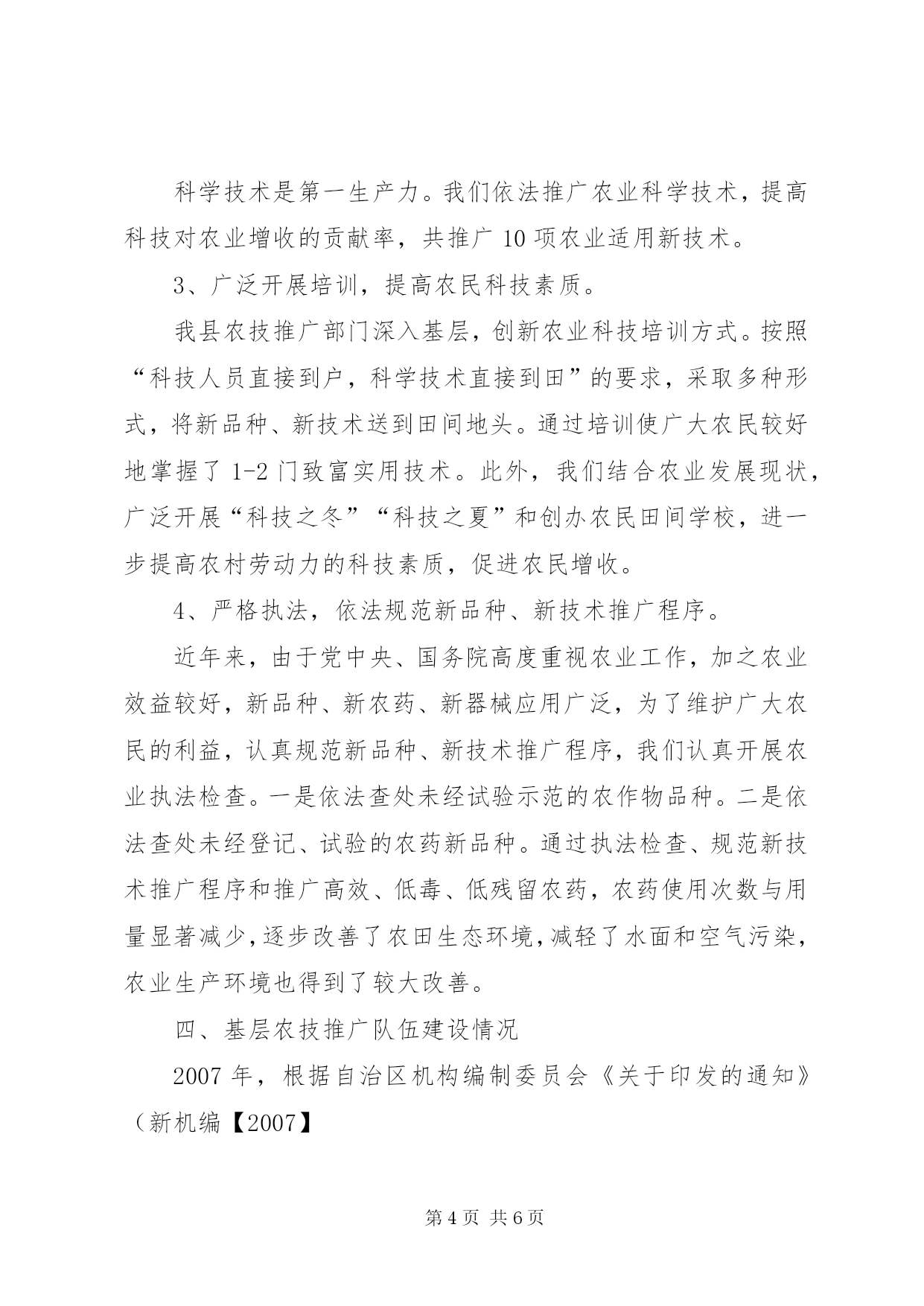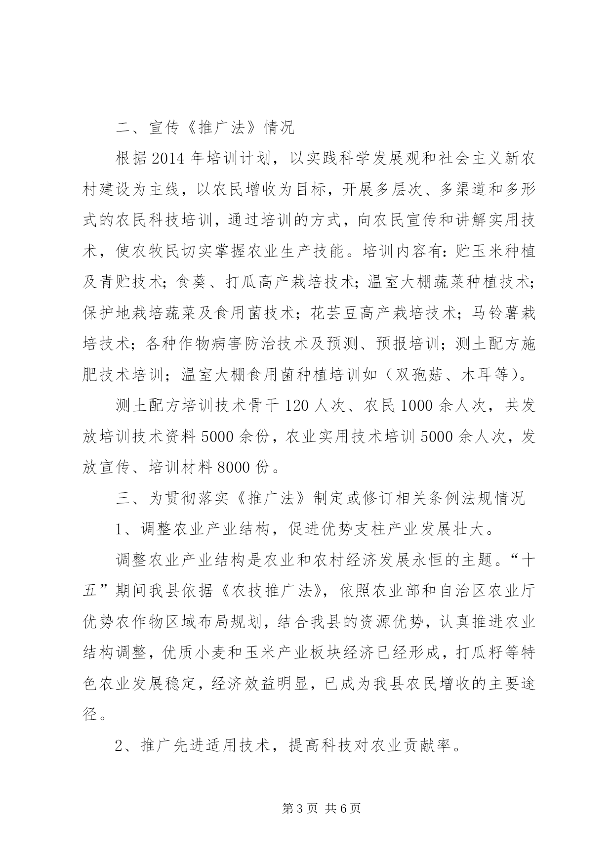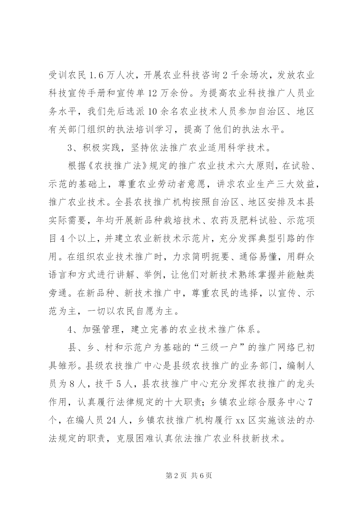 第PAGE\*Arabic\*MERGEFORMAT6页共NUMPAGES\*MERGEFORMAT6页XX年贯彻落实《农业技术推广法》总结一、基本情况《农技推广法》于1993年7月2日颁布实施以来,我县坚持依法推广农业科学技术,良种繁育、施用肥料、病虫防治、栽培和养殖等十大农业技术得到了全面普及和应用,为我县农业和农村经济的稳步发展做出了贡献。1、多渠道开展宣传、普及《农技推广法》知识。一是认真组织学习。《农技推广法》颁布后,我们通过召开委属单位负责人和各级农技人员会议,组织学习该法,并召开学习研讨会,深入学习理解《农技推广法》的条文,使农业系统的工作人员更加知法、用法、护法。此外,我们每年均召开农资经营人员会议,学习《农技推广法》,要求农资经营户依法经营,依法推广农业科学技术。二是营造知法、护法的良好氛围。《农技推广法》颁布实施后,为了让该法深入人心,我们借助墙报、宣传单等形式向全社会广泛宣传该法,大造声势,让农技推广法深入基层,使全社会形成一种守法、护法的良好氛围。2、强化培训,提高依法推广农业技术水平。农业科技推广工作是提高农产品品质、产量和市场占有率的关键,是加快农业和农村经济发展的关键。近年来,我们广泛开展农业科学培训活动,广泛开展农技推广法的宣传活动。据统计,仅2013-2014年开展不同形式的送农业科技下乡活动20余场次,受训农民1.6万人次,开展农业科技咨询2千余场次,发放农业科技宣传手册和宣传单12万余份。为提高农业科技推广人员业务水平,我们先后选派10余名农业技术人员参加自治区、地区有关部门组织的执法培训学习,提高了他们的执法水平。3、积极实践,坚持依法推广农业适用科学技术。根据《农技推广法》规定的推广农业技术六大原则,在试验、示范的基础上,尊重农业劳动者意愿,讲求农业生产三大效益,推广农业技术。全县农技推广机构按照自治区、地区安排及本县实际需要,年均开展新品种栽培技术、农药及肥料试验、示范项目4个以上,并建立农业新技术示范片,充分发挥典型引路的作用。在组织农业技术推广时,力求简明扼要、通俗易懂,用群众语言和方式进行讲解、举例,让他们对新技术熟练掌握并能触类旁通。在新品种、新技术推广中,尊重农民的选择,以宣传、示范为主,一切以农民自愿为主。4、加强管理,建立完善的农业技术推广体系。县、乡、村和示范户为基础的“三级一户”的推广网络已初具雏形。县级农技推广中心是县级农技推广的业务部门,编制人员为8人,技干5人,县农技推广中心充分发挥农技推广的龙头作用,认真履行法律规定的十大职责;乡镇农业综合服务中心7个,在编人员24人,乡镇农技推广机构履行xx区实施该法的办法规定的职责,克服困难认真依法推广农业科技新技术。二、宣传《推广法》情况根据2014年培训计划,以实践科学发展观和社会主义新农村建设为主线,以农民增收为目标,开展多层次、多渠道和多形式的农民科技培训,通过培训的方式,向农民宣传和讲解实用技术,使农牧民切实掌握农业生产技能。培训内容有:贮玉米种植及青贮技术;食葵、打瓜高产栽培技术;温室大棚蔬菜种植技术;保护地栽培蔬菜及食用菌技术;花芸豆高产栽培技术;马铃薯栽培技术;各种作物病害防治技术及预测、预报培训;测土配方施肥技术培训;温室大棚食用菌种植培训如(双孢菇、木耳等)。测土配方培训技术骨干120人次、农民1000余人次,共发放培训技术资料5000余份,农业实用技术培训5000余人次,发放宣传、培训材料8000份。三、为贯彻落实《推广法》制定或修订相关条例法规情况1、调整农业产业结构,促进优势支柱产业发展壮大。调整农业产业结构是农业和农村经济发展永恒的主题。“十五”期间我县依据《农技推广法》,依照农业部和自治区农业厅优势农作物区域布局规划,结合我县的资源优势,认真推进农业结构调整,优质小麦和玉米产业板块经济已经形成,打瓜籽等特色农业发展稳定,经济效益明显,已成为我县农民增收的主要途径。2、推广先进适用技术,提高科技对农业贡献率。科学技术是第一生产力。我们依法推广农业科学技术,提高科技对农业增收的贡献率,共推广10项农业适用新技术。3、广泛开展培训,提高农民科技素质。我县农技推广部门深入基层,创新农业科技培训方式。按照“科技人员直接到户,科学技术直接到田”的要求,采取多种形式,将新品种、新技术送到田间地头。通过培训使广大农民较好地掌握了1-2门致富实用技术。此外,我们结合农业发展现状,广泛开展“科技之冬”“科技之夏”和创办农民田间学校,进一步提高农村劳动力的科技素质,促进农民增收。4、严格执法,依法规范新品种、新技术推广程序。近年来,由于党中央、国务院高度重视农业工作,加之农业效益较好,新品种、新农药、新器械应用广泛,为了维护广大农民的利益,认真规范新品种、新技术推广程序,我们认真开展农业