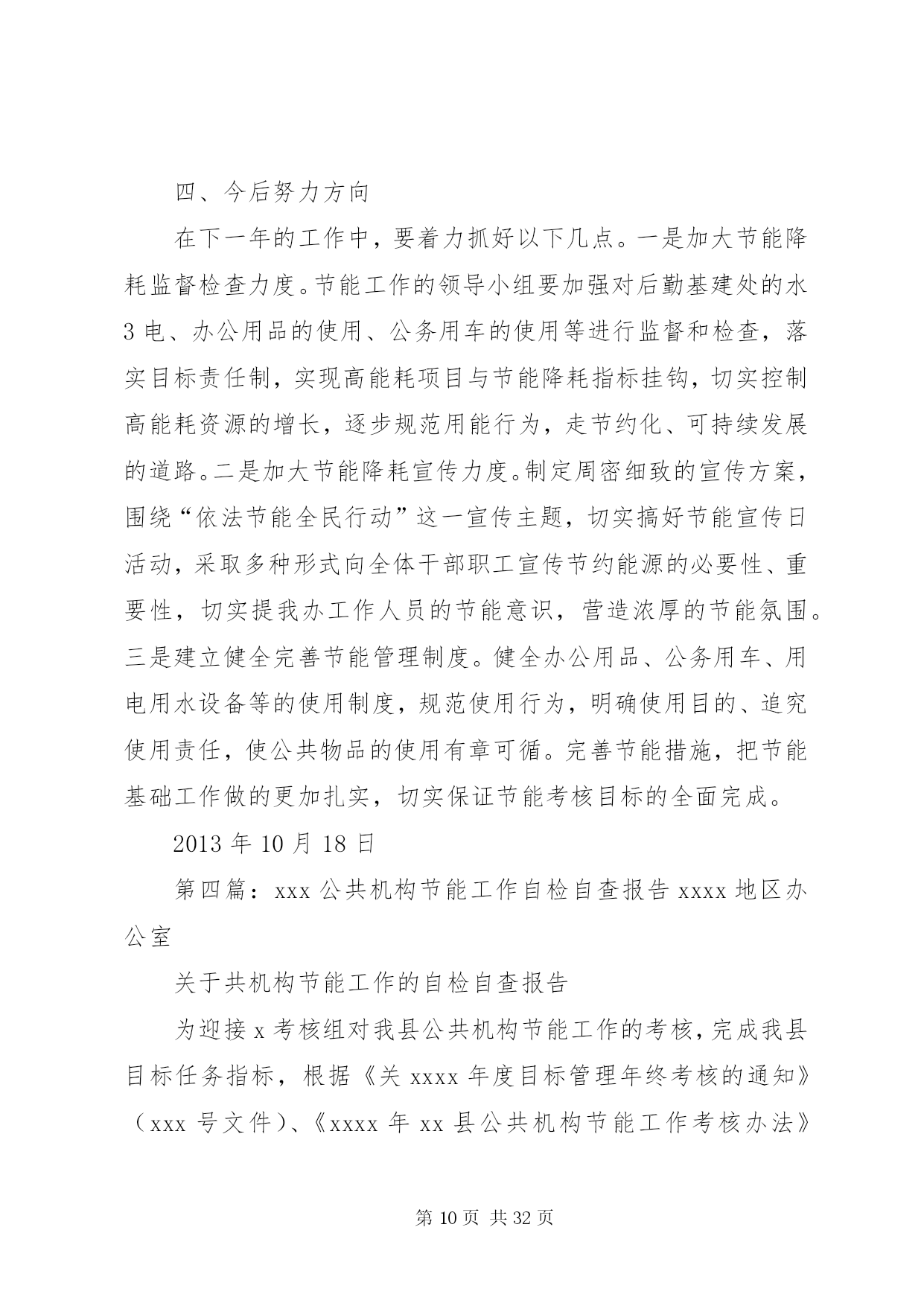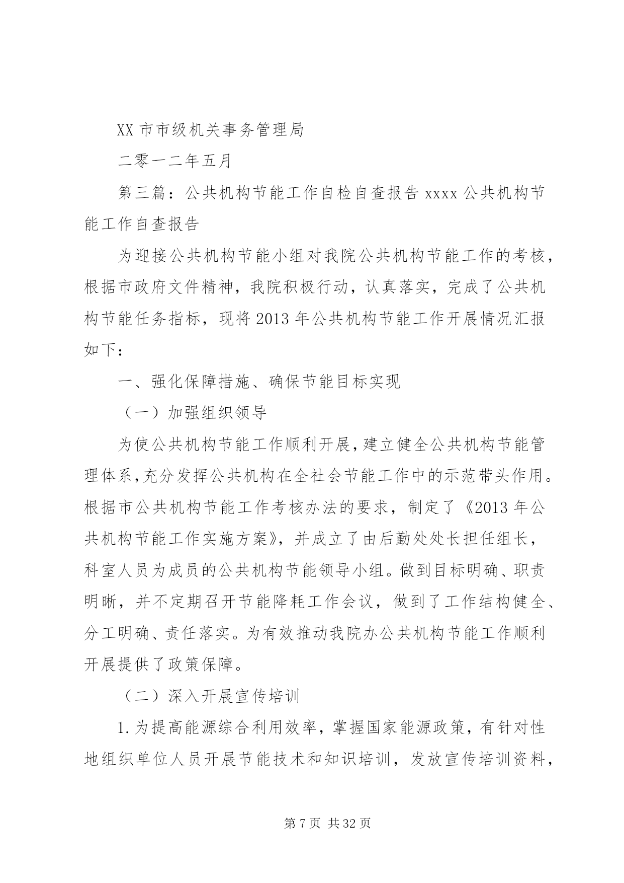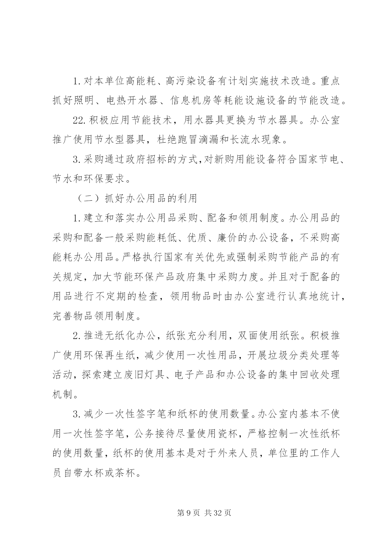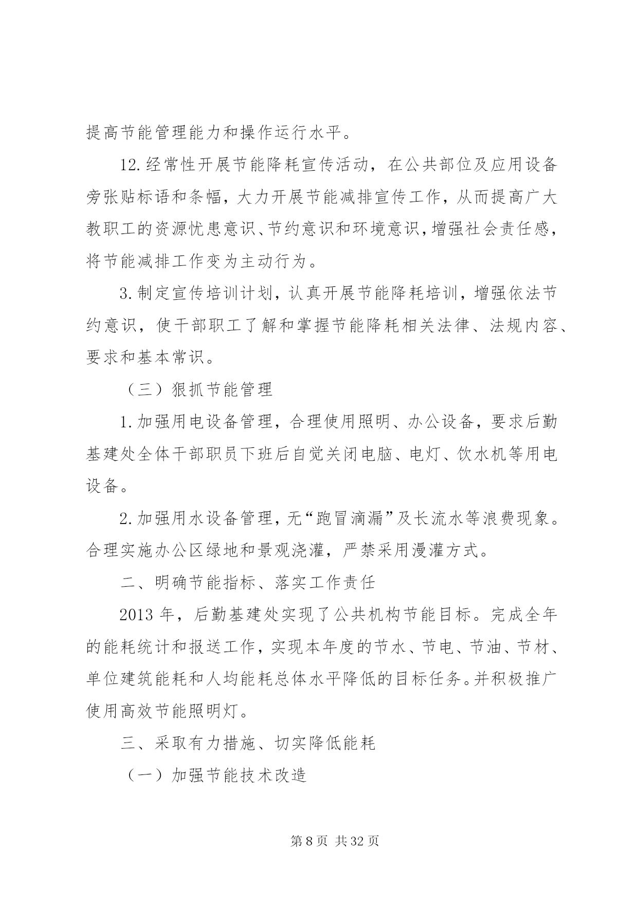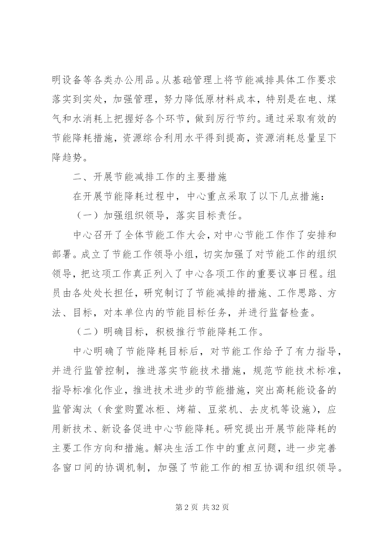 第PAGE\*Arabic\*MERGEFORMAT32页共NUMPAGES\*MERGEFORMAT32页公共机构节能降耗自查自评(新)第一篇:公共机构节能降耗自查自评(新)公共机构节能降耗自查自评(XX市公共行政服务中心)2012年,中心认真贯彻落实省《关于开展2012年度公共机构节能绩效考评工作的通知》(辽公节组办〔2012〕8号),及节能办有关规定和要求,全面贯彻落实科学发展观,把节能的各项指标合理科学、合理利用能源、保护环境,切实推进中心节能管理。取得了一定效果,现将中心2012年1—11月份节能降耗工作开展自查情况汇报如下:一、领导重视,加强对节能减排工作的组织领导年初中心与市政府签订了《2012年工作目标责任书》和市绩效办下发各单位绩效管理考评细则的要求,其中涉及到公共机构节能降耗问题,中心领导比较重视,立即成立了中心节能工作领导小组,由李德惠主任任组长,周晓飞副主任任副组长,各处处长任成员。下设办公室,办公室设在管理处。一、中心节能降耗目标完成情况中心年初成立节能降耗办公室,按照目标分工合作,由李德惠主任牵头负总责,领导协调,监管推进,做好规划纲要和年度目标,落实技改、节能项目,适时淘汰落后设备,明确专职人员抓落实。中心还拨出专项经费,修缮了房顶及更换了大厅所有照明设备等各类办公用品。从基础管理上将节能减排具体工作要求落实到实处,加强管理,努力降低原材料成本,特别是在电、煤气和水消耗上把握好各个环节,做到厉行节约。通过采取有效的节能降耗措施,资源综合利用水平得到提高,资源消耗总量呈下降趋势。二、开展节能减排工作的主要措施在开展节能降耗过程中,中心重点采取了以下几点措施:(一)加强组织领导,落实目标责任。中心召开了全体节能工作大会,对中心节能工作作了安排和部署。成立了节能工作领导小组,切实加强了对节能工作的组织领导,把这项工作真正列入了中心各项工作的重要议事日程。组员由各处处长担任,研究制订了节能减排的措施、工作思路、方法、目标,对本单位内的节能目标任务,并进行监督检查。(二)明确目标,积极推行节能降耗工作。中心明确了节能降耗目标后,对节能工作给予了有力指导,并进行监管控制,推进落实节能技术措施,规范节能技术标准,指导标准化作业,推进技术进步的节能措施,突出高耗能设备的监管淘汰(食堂购置冰柜、烤箱、豆浆机、去皮机等设施),应用新技术、新设备促进中心节能降耗。研究提出开展节能降耗的主要工作方向和措施。解决生活工作中的重点问题,进一步完善各窗口间的协调机制,加强了节能工作的相互协调和组织领导。确保节能降耗工作落到实处。(三)重视大厅管理,提高节能工作水平。1、坚持节约用电。严格控制照明用电,做到人走灯灭;自然光照较好时,办公室一般不使用照明灯具;走廊、通道等照明需求较低的场所,尽量设定隔盏开灯,减少灯管数或安装自动控制开关。使用更换节能灯具,节约用电。在使用电脑、打印机、传真机、复印机等办公自动化设备时,尽量减少待机时间,下班前关闭各类电器设备的电源(特殊设备除外)。2、坚持节约用水。切实加强用水管理,严禁跑、冒、滴、漏,坚决避免长流水现象。严禁用高压自来水龙头冲洗车辆,严禁使用自来水龙头直接冲洗拖布。3、坚持节约用油。严格执行公务用车配备标准;科学安排工作任务,减少车辆使用次数。严格执行定点加油、定点维修和定点保险制度,实行单车核算。4、坚持节约办公用品。严格经费管理,千方百计节约办公经费开支。逐步规范办公用品设施的配备、采购和领用管理,提倡修旧利废。提倡电子政务,减少纸质文件印发,信息传递、会议通知、会议材料等一般性文件通过网络传递。加强电话费的管理,尽量减少通话次数和通话时间。节约使用办公用品,推行无纸化办公,推广使用再生纸,减少一次性办公用品的使用。文件材料坚持实行双面复印。开展废旧电脑及各种办公用品耗材的回收利用,促进办公用品的高效利用和循环利用。5、坚持节约会议、差旅费用。严格控制会议数量、规模及会议接待标准,严格执行工作出差食宿标准,按标准用餐、住房,按规定标准乘坐交通工具。三、存在的问题中心节能降耗方面仍存在不少问题。中心节能降耗工作困难多、难度大,一方面,虽然节能降耗工作开展得较好,但在节能降耗上应采取什么措施还找不到合理的方案,虽然也想引进先进技术和设备来降低用电量、用气量和用水量,但却苦于缺少资金,在节能技术上的投入明显不足。另一方面,大家在应用推广上也缺乏热情。同时,还存在工作中管理水平不高、技能低下等问题,这都对节能降耗带来了一定困难。这些问题给节能降耗工作的进一步推进带来了一定的困难。四、开展节能降耗工作的建议和下步工作打算为了有效推进节能降耗工作的开展,中心需要进行改造和吸纳先进技术都是必不可少的。一是加大节能降耗方面的扶持引导力度和技术指导,妥善安排和落实节能