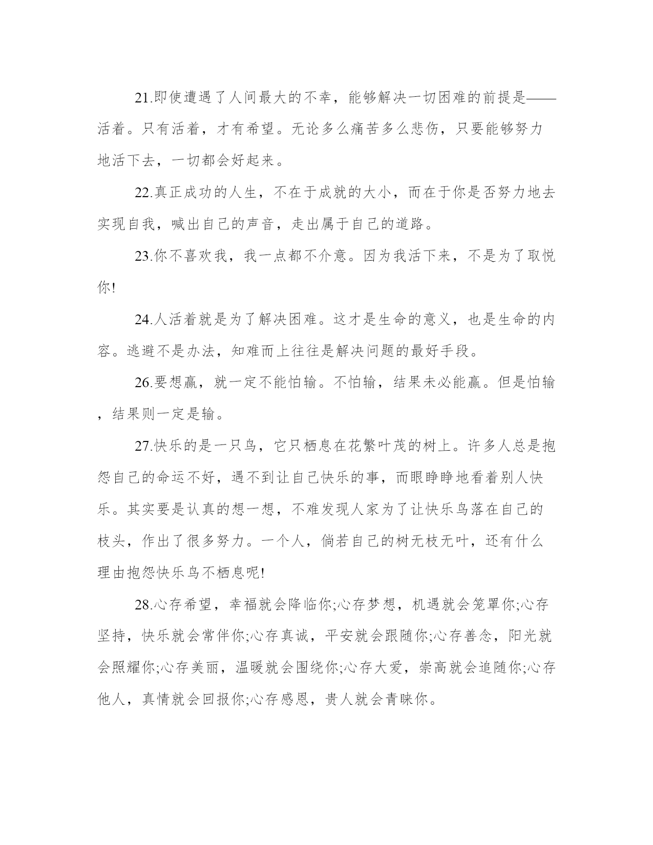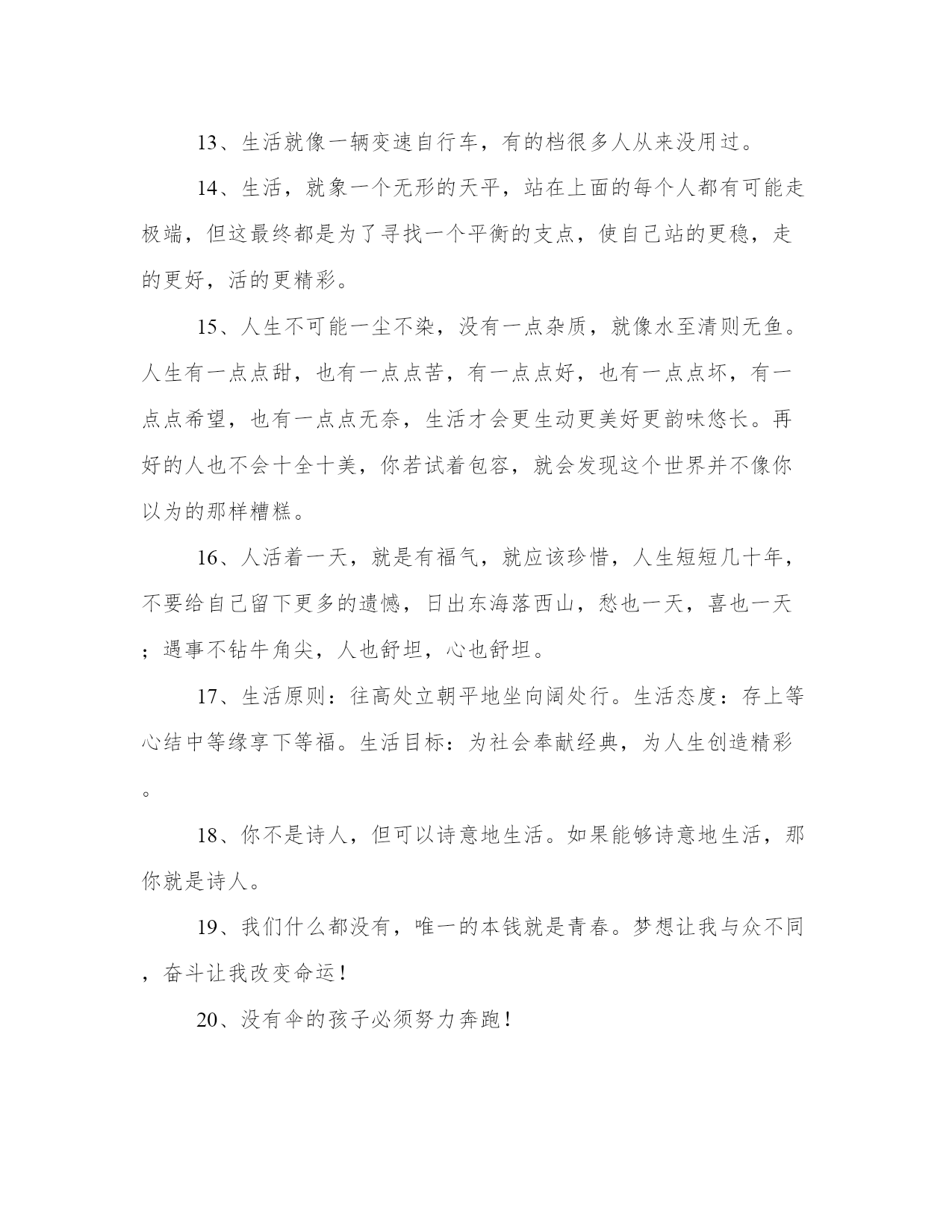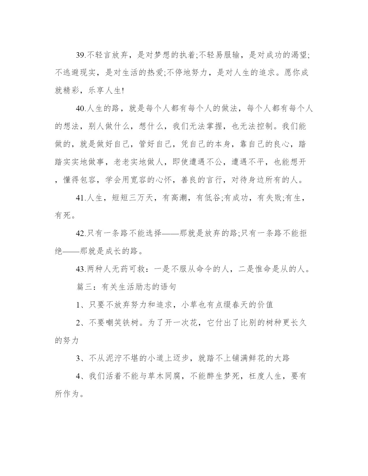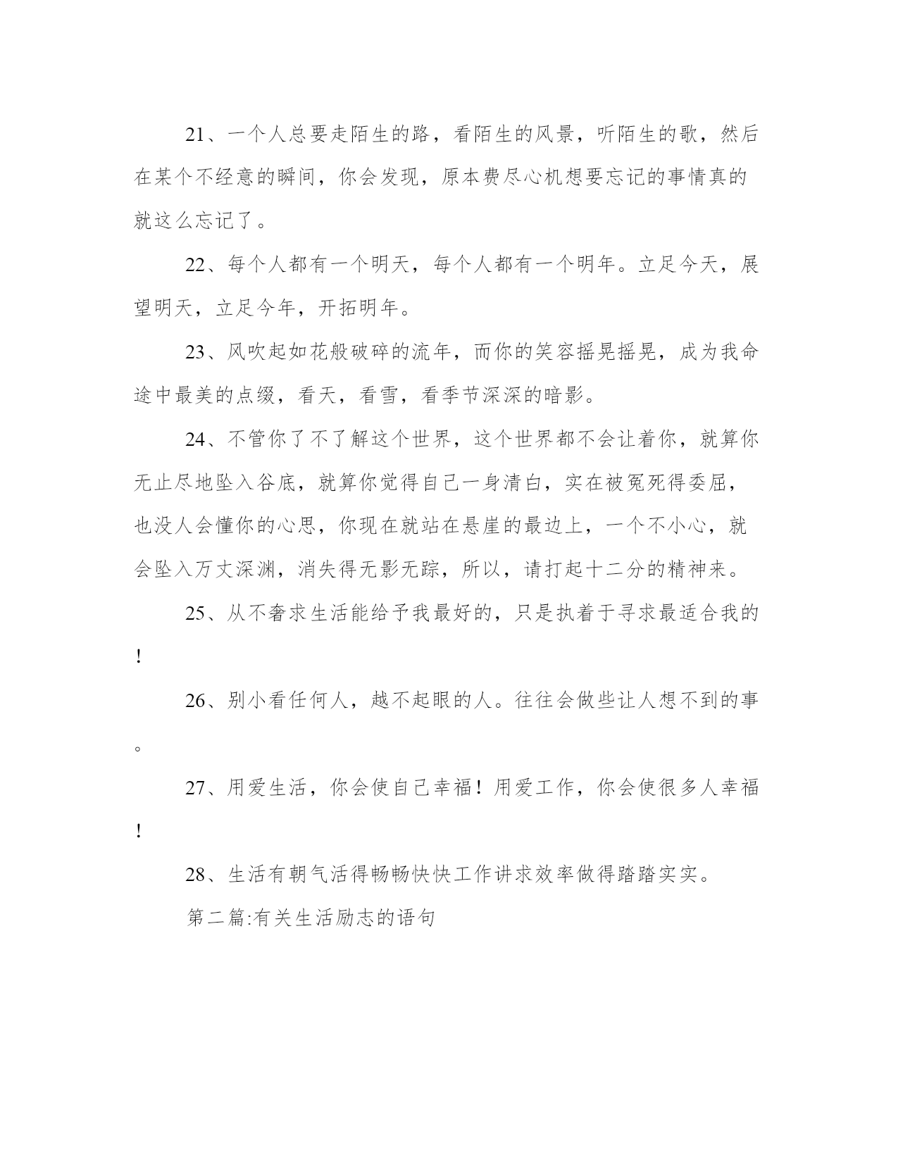 有关生活励志的语句大全第一篇:有关生活励志的语句2、工作是工作,生活是生活。工作上,自己扮演的是职务角色;生活里,自己扮演的是自我。工作只是生命中一小部分,切勿把谋生工具当成人生的全部生活!3、当你感到悲哀痛苦时,最好是去学些什么东西。学习会使你永远立于不败之地。4、你不勇敢,没人替你坚强!5、无痛不快,无苦何甜,活着,本就是一种修行!6、学会知足,人生最大的烦恼是从最没有意义的比较开始,这世界总有不如你的人,也总有比你强的人,当我哭泣我没有鞋子穿的时候,我发现有人却没有了脚。7、微笑拥抱每一天,做像向日葵般温暖的女子。8、天再高又怎样,踮起脚尖就更接近阳光。9、幸福和幸运是需要代价的,天下没有免费的午餐!10、世界上那些最容易的事情中,拖延时间最不费力。11、别把工作当负担,与其生气埋怨,不如积极快乐的去面对,当你把工作当作生活和艺术,你就会享受到工作的乐趣。12、世上没有绝望的处境,只有对处境绝望的人。13、生活就像一辆变速自行车,有的档很多人从来没用过。14、生活,就象一个无形的天平,站在上面的每个人都有可能走极端,但这最终都是为了寻找一个平衡的支点,使自己站的更稳,走的更好,活的更精彩。15、人生不可能一尘不染,没有一点杂质,就像水至清则无鱼。人生有一点点甜,也有一点点苦,有一点点好,也有一点点坏,有一点点希望,也有一点点无奈,生活才会更生动更美好更韵味悠长。再好的人也不会十全十美,你若试着包容,就会发现这个世界并不像你以为的那样糟糕。16、人活着一天,就是有福气,就应该珍惜,人生短短几十年,不要给自己留下更多的遗憾,日出东海落西山,愁也一天,喜也一天;遇事不钻牛角尖,人也舒坦,心也舒坦。17、生活原则:往高处立朝平地坐向阔处行。生活态度:存上等心结中等缘享下等福。生活目标:为社会奉献经典,为人生创造精彩。18、你不是诗人,但可以诗意地生活。如果能够诗意地生活,那你就是诗人。19、我们什么都没有,唯一的本钱就是青春。梦想让我与众不同,奋斗让我改变命运!20、没有伞的孩子必须努力奔跑!21、一个人总要走陌生的路,看陌生的风景,听陌生的歌,然后在某个不经意的瞬间,你会发现,原本费尽心机想要忘记的事情真的就这么忘记了。22、每个人都有一个明天,每个人都有一个明年。立足今天,展望明天,立足今年,开拓明年。23、风吹起如花般破碎的流年,而你的笑容摇晃摇晃,成为我命途中最美的点缀,看天,看雪,看季节深深的暗影。24、不管你了不了解这个世界,这个世界都不会让着你,就算你无止尽地坠入谷底,就算你觉得自己一身清白,实在被冤死得委屈,也没人会懂你的心思,你现在就站在悬崖的最边上,一个不小心,就会坠入万丈深渊,消失得无影无踪,所以,请打起十二分的精神来。25、从不奢求生活能给予我最好的,只是执着于寻求最适合我的!26、别小看任何人,越不起眼的人。往往会做些让人想不到的事。27、用爱生活,你会使自己幸福!用爱工作,你会使很多人幸福!28、生活有朝气活得畅畅快快工作讲求效率做得踏踏实实。第二篇:有关生活励志的语句团队具备进取的积极能量,才能带领企业走向一个新的高度,在这时,一句具有激励作用的正能量的口号句子,是必不可少的!小编下面为您搜集了一些关于团队正能量的句子,希望能让您喜欢!1.人只有在布满陡峭的路上,才能使自己的脚跟变的更稳;人只有在布满荆棘的路上,才能使自己的身体变的不怕伤痕;人只有在布满危险的路上,才能使自己的战斗力变的无比之强!2.选择自信,就是选择豁达坦然,就是选择在名利面前岿然不动,就是选择在势力面前昂首挺胸,撑开自信的帆破流向前,展示搏击的风采。3.年征程的路荆刺密布,留下辛酸的回忆,年成长的心充满沧桑,留下难舍的温情,年灿烂的笑透着成熟,留下快乐的祝福,祝福充满激情的年:幸福围着你的生活!成功伴着你的工作!4.天下之事常成于困约,而败于奢靡。陆游5.只要信心足,蜀道变通途;只要肯努力,铁棒磨成针;只要恒心在,滴水能穿石;只要站得起,明天就有戏!不要被眼前的困难吓倒,站起来,走出阴影就又会是一片明媚的天地!6.当我觉得我倒霉了,我就会想:这是在挥洒我的霉运,挥洒之后,剩下的就全都是幸运了!7.如果你的面前有阴影,那是因为你的背后有阳光。8.我不怕千万人阻挡,只怕自己投降。励志明天会更好的句子9.每天都冒出很多念头,那些不死的才叫做梦想。10.不要为小事遮住视线,我们还有更大的世界。12.低头是一种能力,它不是自卑,也不是怯弱,它是清醒中的嬗变。有时,稍微低一下头,或者我们的人生路会更精彩。13.很多时候,不快乐并不是因为快乐的条件没有齐备,而是因为活得还不够简单。14.你的遇事慌乱抱怨一脸苦相不敢扛事儿推脱找借口逻辑不清没有反馈不拘小节