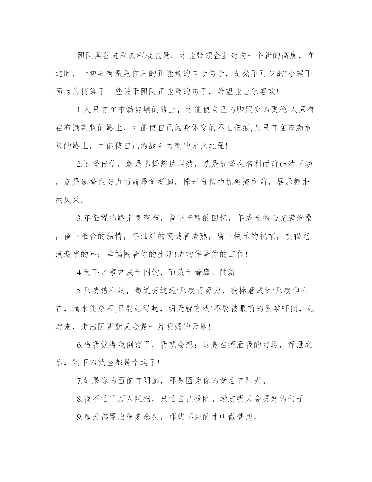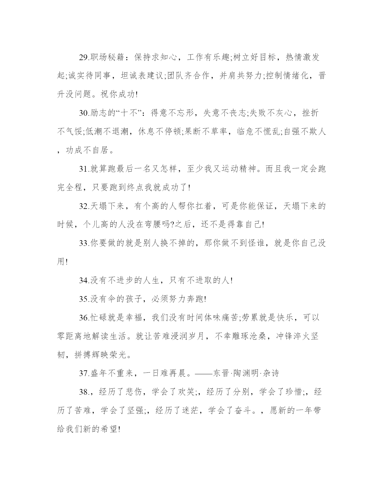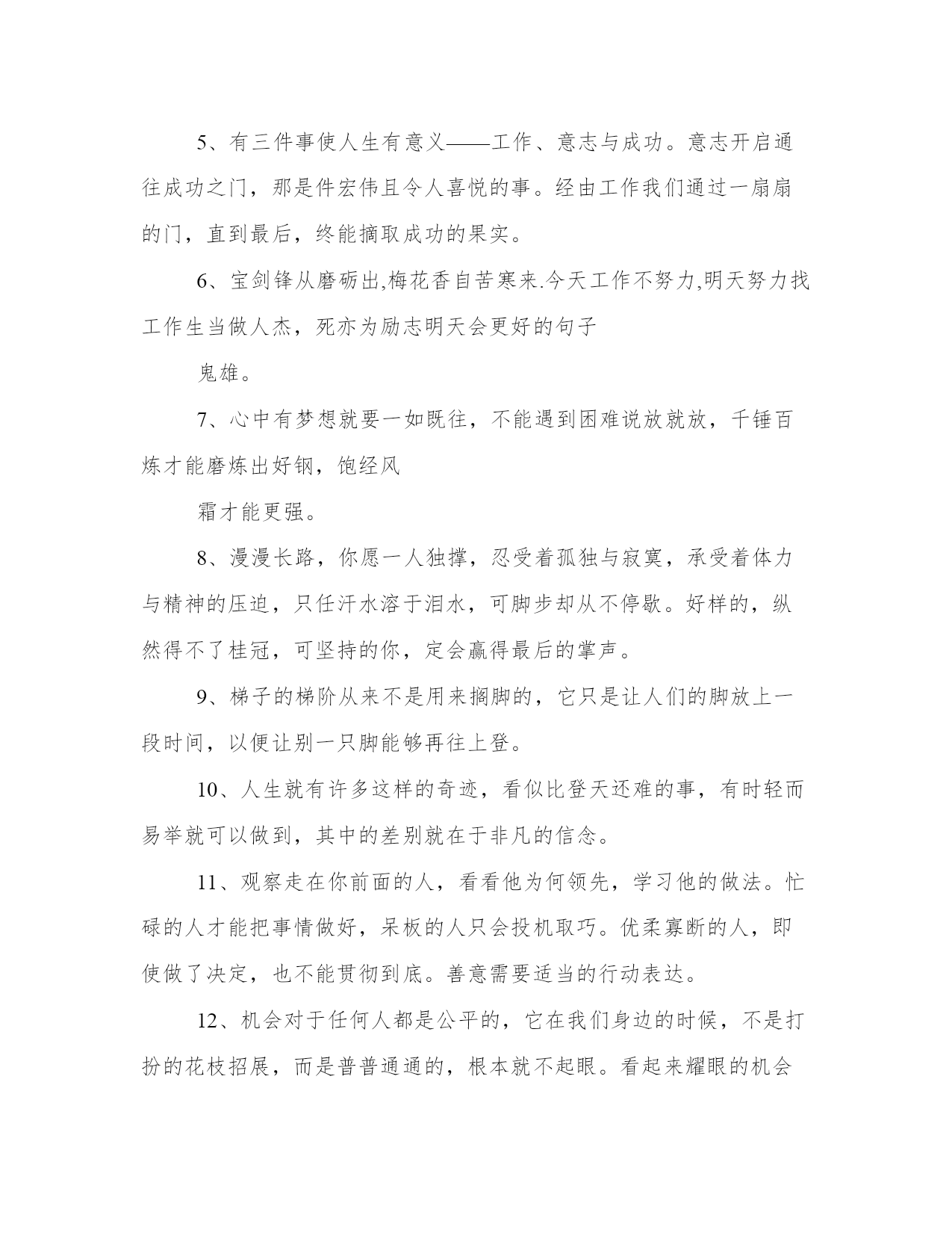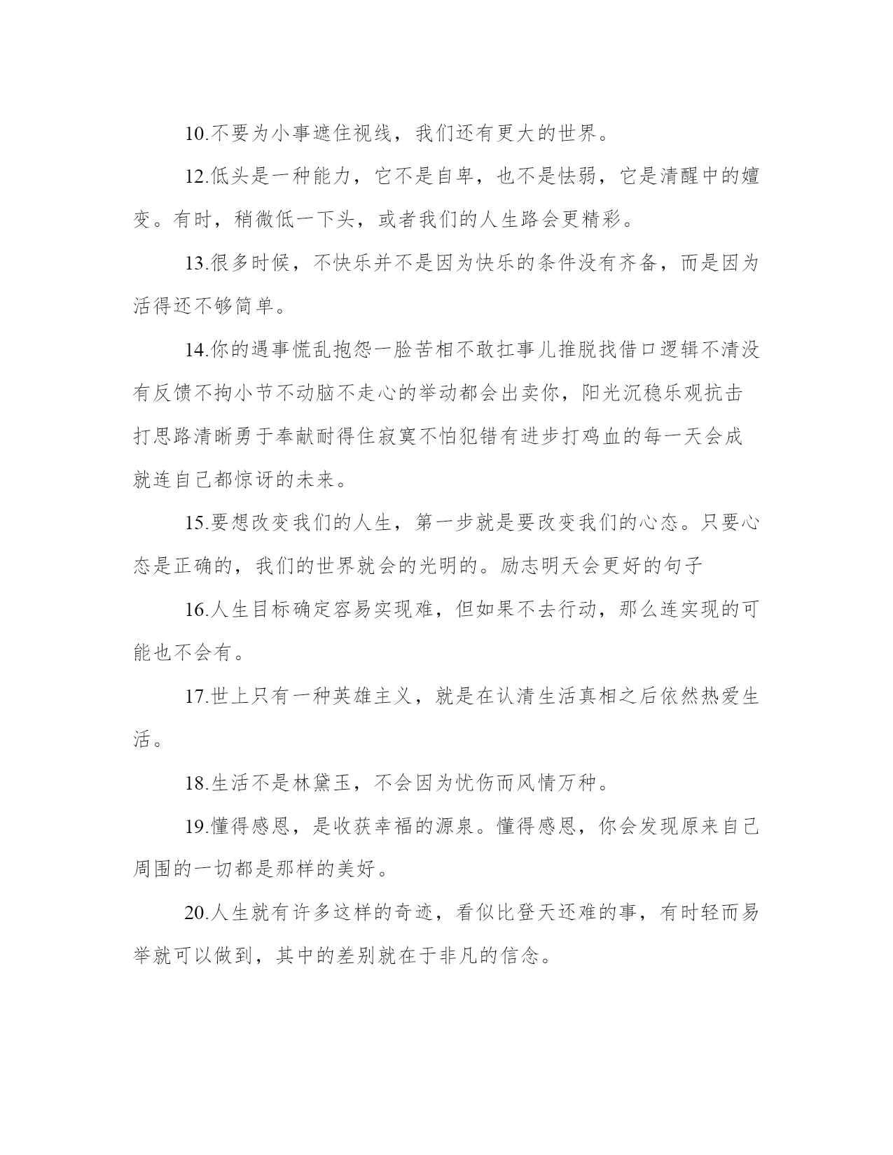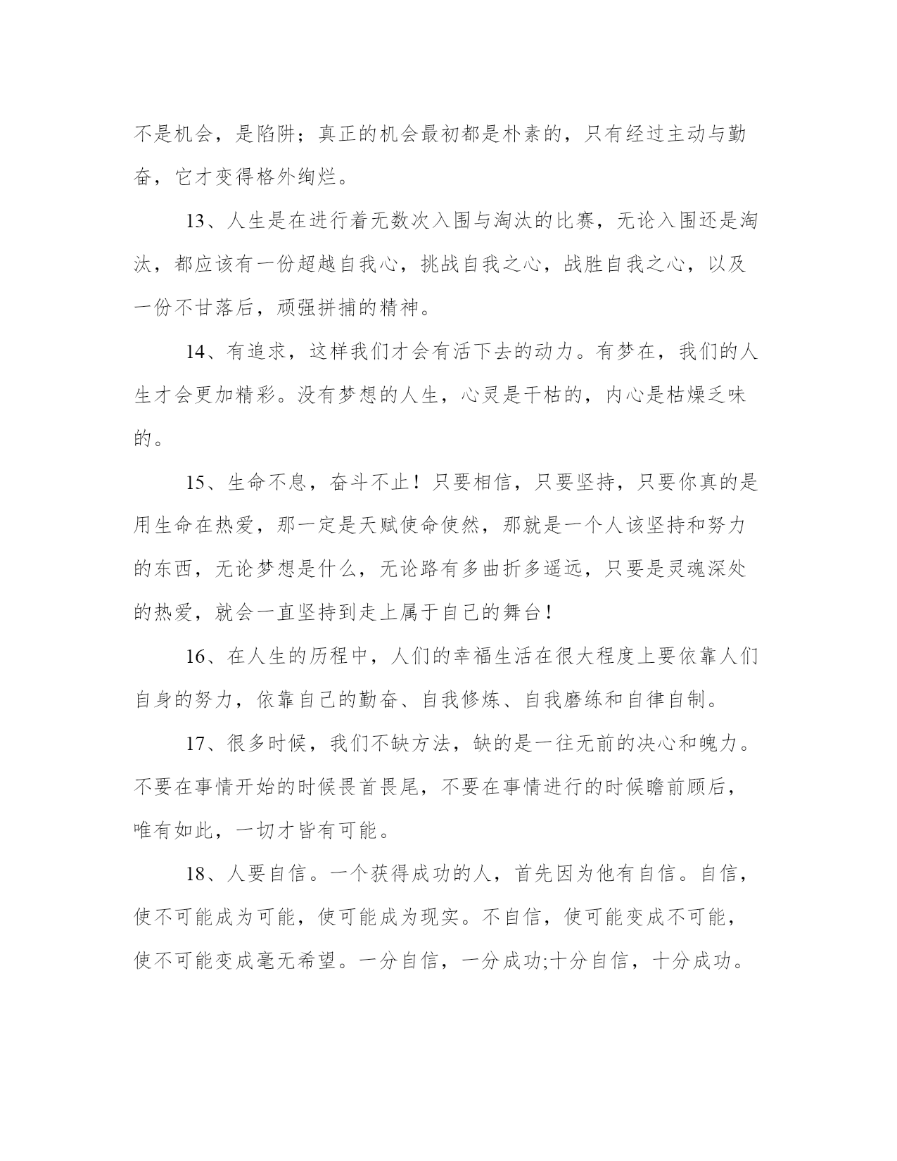 有关生活励志的语句大全第一篇:有关生活励志的语句2、工作是工作,生活是生活。工作上,自己扮演的是职务角色;生活里,自己扮演的是自我。工作只是生命中一小部分,切勿把谋生工具当成人生的全部生活!3、当你感到悲哀痛苦时,最好是去学些什么东西。学习会使你永远立于不败之地。4、你不勇敢,没人替你坚强!5、无痛不快,无苦何甜,活着,本就是一种修行!6、学会知足,人生最大的烦恼是从最没有意义的比较开始,这世界总有不如你的人,也总有比你强的人,当我哭泣我没有鞋子穿的时候,我发现有人却没有了脚。7、微笑拥抱每一天,做像向日葵般温暖的女子。8、天再高又怎样,踮起脚尖就更接近阳光。9、幸福和幸运是需要代价的,天下没有免费的午餐!10、世界上那些最容易的事情中,拖延时间最不费力。11、别把工作当负担,与其生气埋怨,不如积极快乐的去面对,当你把工作当作生活和艺术,你就会享受到工作的乐趣。12、世上没有绝望的处境,只有对处境绝望的人。13、生活就像一辆变速自行车,有的档很多人从来没用过。14、生活,就象一个无形的天平,站在上面的每个人都有可能走极端,但这最终都是为了寻找一个平衡的支点,使自己站的更稳,走的更好,活的更精彩。15、人生不可能一尘不染,没有一点杂质,就像水至清则无鱼。人生有一点点甜,也有一点点苦,有一点点好,也有一点点坏,有一点点希望,也有一点点无奈,生活才会更生动更美好更韵味悠长。再好的人也不会十全十美,你若试着包容,就会发现这个世界并不像你以为的那样糟糕。16、人活着一天,就是有福气,就应该珍惜,人生短短几十年,不要给自己留下更多的遗憾,日出东海落西山,愁也一天,喜也一天;遇事不钻牛角尖,人也舒坦,心也舒坦。17、生活原则:往高处立朝平地坐向阔处行。生活态度:存上等心结中等缘享下等福。生活目标:为社会奉献经典,为人生创造精彩。18、你不是诗人,但可以诗意地生活。如果能够诗意地生活,那你就是诗人。19、我们什么都没有,唯一的本钱就是青春。梦想让我与众不同,奋斗让我改变命运!20、没有伞的孩子必须努力奔跑!21、一个人总要走陌生的路,看陌生的风景,听陌生的歌,然后在某个不经意的瞬间,你会发现,原本费尽心机想要忘记的事情真的就这么忘记了。22、每个人都有一个明天,每个人都有一个明年。立足今天,展望明天,立足今年,开拓明年。23、风吹起如花般破碎的流年,而你的笑容摇晃摇晃,成为我命途中最美的点缀,看天,看雪,看季节深深的暗影。24、不管你了不了解这个世界,这个世界都不会让着你,就算你无止尽地坠入谷底,就算你觉得自己一身清白,实在被冤死得委屈,也没人会懂你的心思,你现在就站在悬崖的最边上,一个不小心,就会坠入万丈深渊,消失得无影无踪,所以,请打起十二分的精神来。25、从不奢求生活能给予我最好的,只是执着于寻求最适合我的!26、别小看任何人,越不起眼的人。往往会做些让人想不到的事。27、用爱生活,你会使自己幸福!用爱工作,你会使很多人幸福!28、生活有朝气活得畅畅快快工作讲求效率做得踏踏实实。第二篇:有关生活励志的语句团队具备进取的积极能量,才能带领企业走向一个新的高度,在这时,一句具有激励作用的正能量的口号句子,是必不可少的!小编下面为您搜集了一些关于团队正能量的句子,希望能让您喜欢!1.人只有在布满陡峭的路上,才能使自己的脚跟变的更稳;人只有在布满荆棘的路上,才能使自己的身体变的不怕伤痕;人只有在布满危险的路上,才能使自己的战斗力变的无比之强!2.选择自信,就是选择豁达坦然,就是选择在名利面前岿然不动,就是选择在势力面前昂首挺胸,撑开自信的帆破流向前,展示搏击的风采。3.年征程的路荆刺密布,留下辛酸的回忆,年成长的心充满沧桑,留下难舍的温情,年灿烂的笑透着成熟,留下快乐的祝福,祝福充满激情的年:幸福围着你的生活!成功伴着你的工作!4.天下之事常成于困约,而败于奢靡。陆游5.只要信心足,蜀道变通途;只要肯努力,铁棒磨成针;只要恒心在,滴水能穿石;只要站得起,明天就有戏!不要被眼前的困难吓倒,站起来,走出阴影就又会是一片明媚的天地!6.当我觉得我倒霉了,我就会想:这是在挥洒我的霉运,挥洒之后,剩下的就全都是幸运了!7.如果你的面前有阴影,那是因为你的背后有阳光。8.我不怕千万人阻挡,只怕自己投降。励志明天会更好的句子9.每天都冒出很多念头,那些不死的才叫做梦想。10.不要为小事遮住视线,我们还有更大的世界。12.低头是一种能力,它不是自卑,也不是怯弱,它是清醒中的嬗变。有时,稍微低一下头,或者我们的人生路会更精彩。13.很多时候,不快乐并不是因为快乐的条件没有齐备,而是因为活得还不够简单。14.你的遇事慌乱抱怨一脸苦相不敢扛事儿推脱找借口逻辑不清没有反馈不拘小节