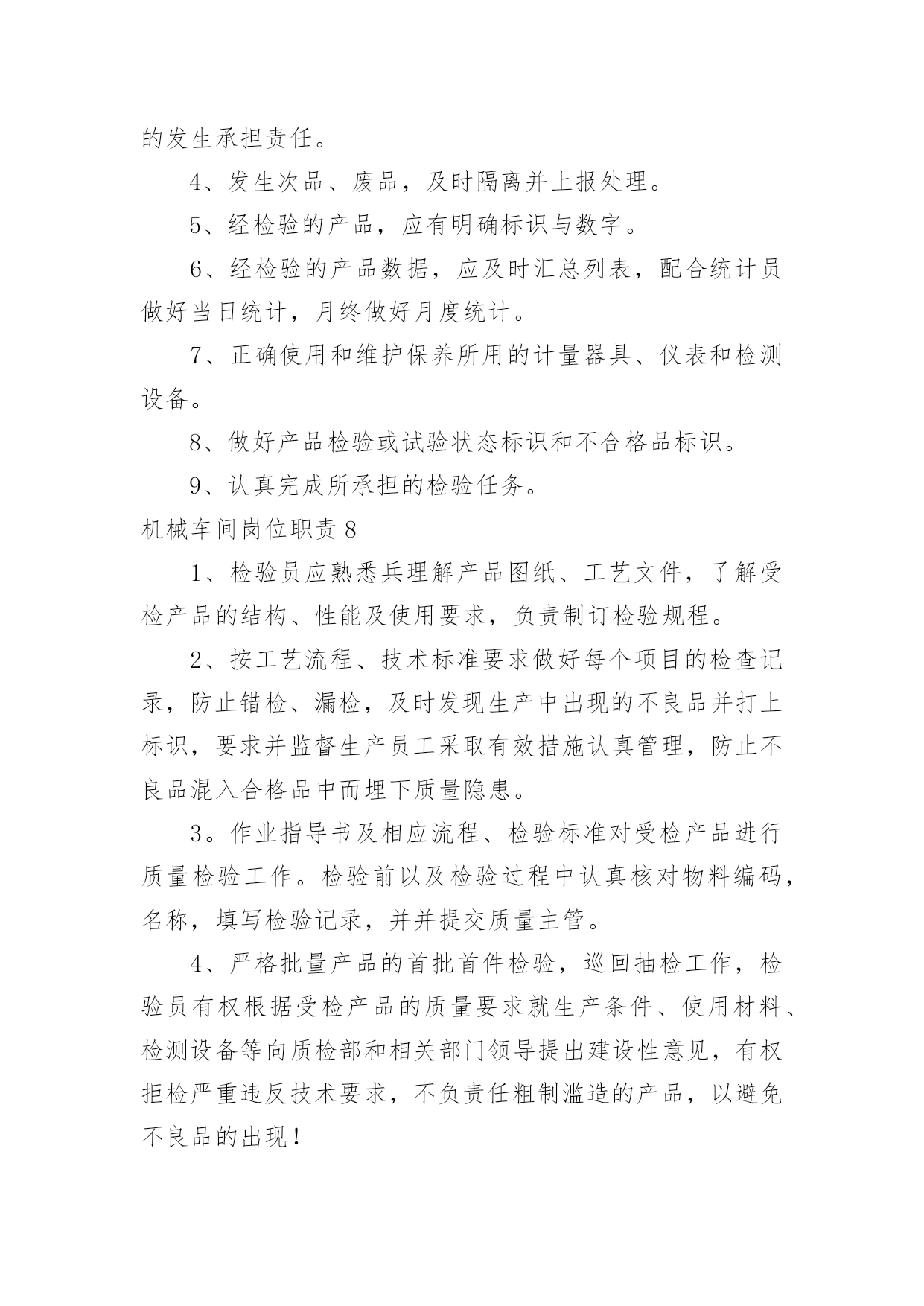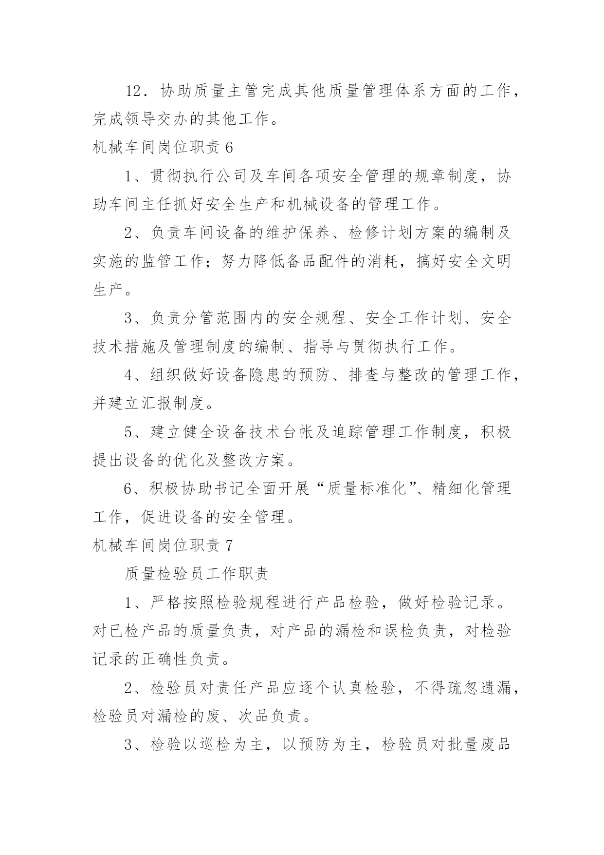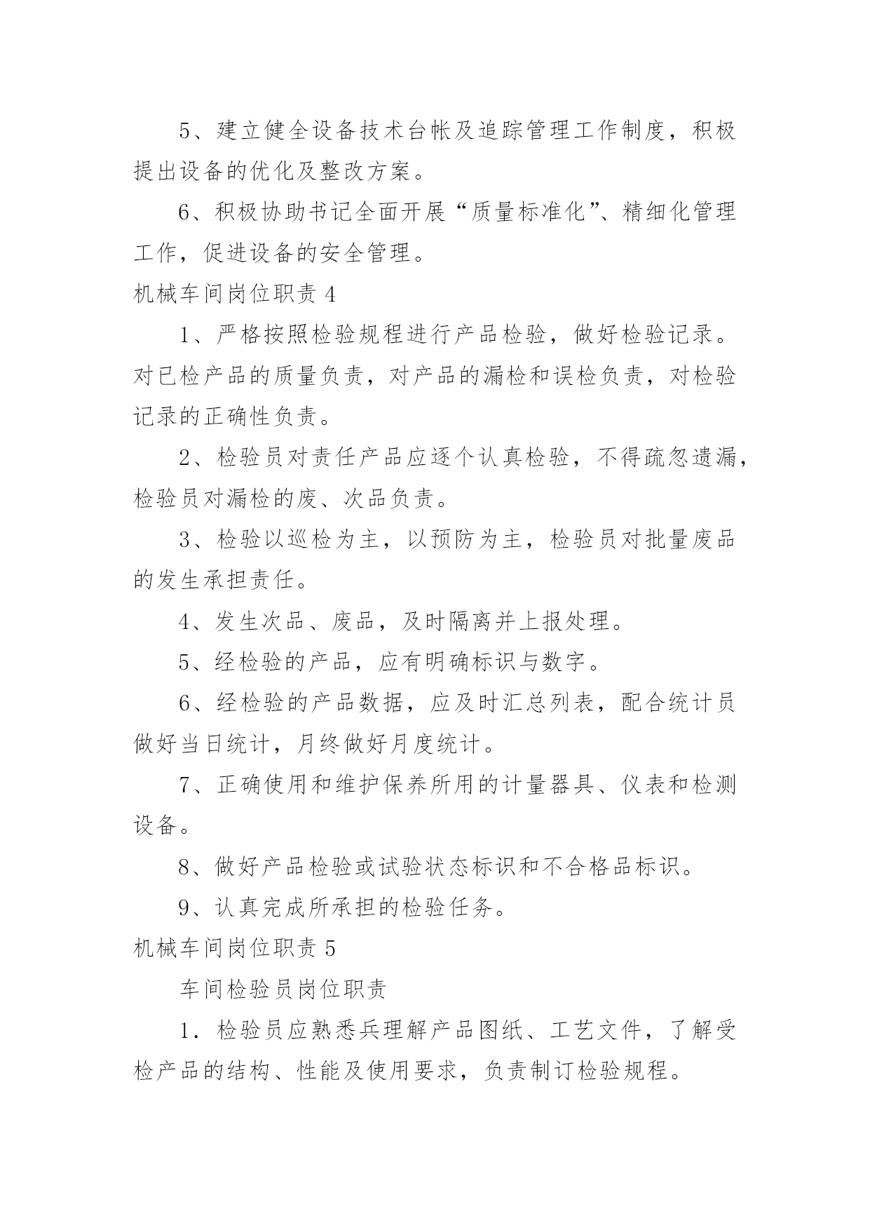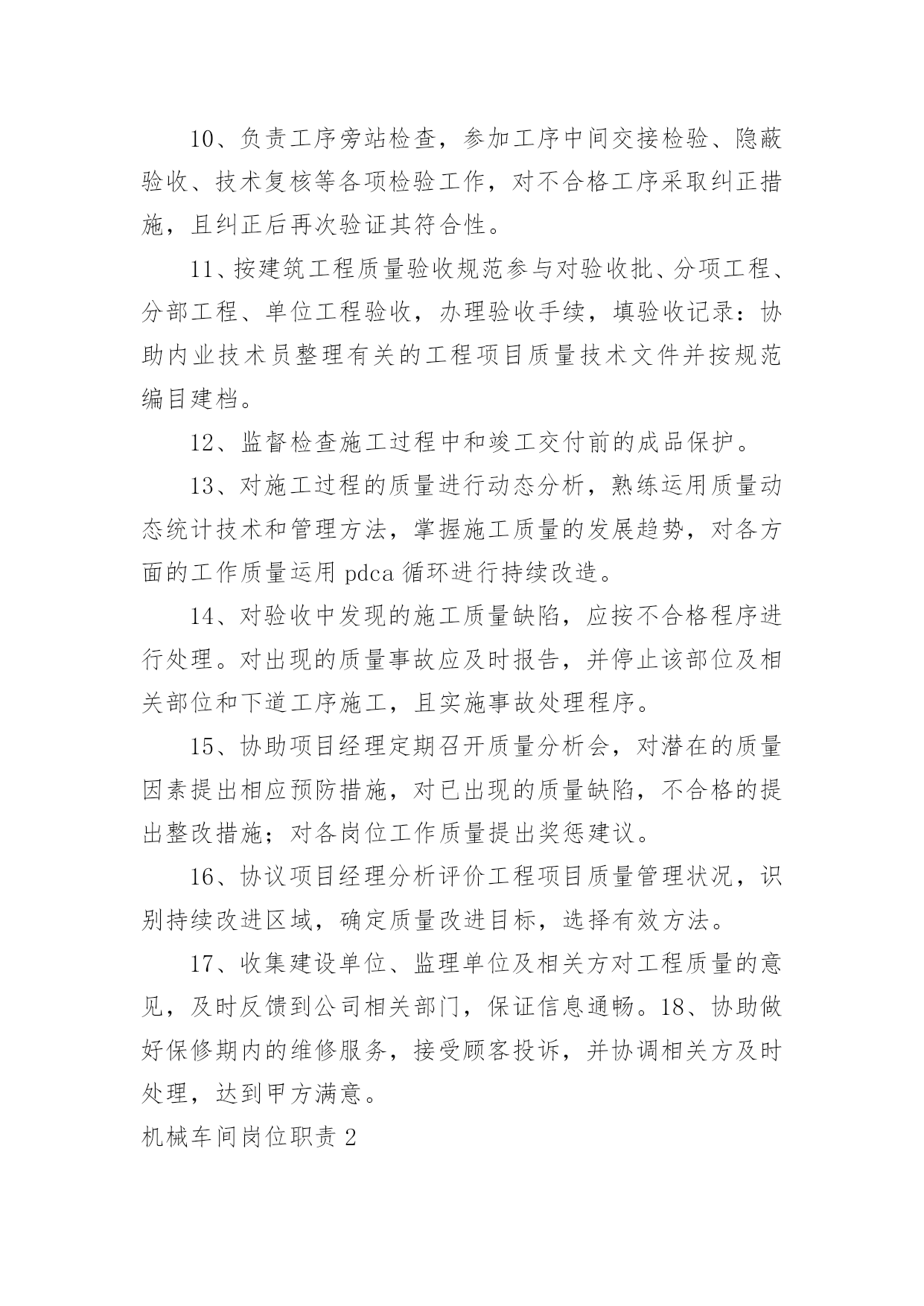 机械车间岗位职责机械车间岗位职责在快速变化和不断变革的今天,接触到岗位职责的地方越来越多,制定岗位职责能够有效的地防止因为职位分配不合理而导致部门之间或是员工之间出现工作推脱、责任推卸等现象发生。那么你真正懂得怎么制定岗位职责吗?以下是小编为大家整理的机械车间岗位职责,欢迎大家分享。机械车间岗位职责11、熟悉并认真贯彻执行现行国家、行业、企业颁发的与工程质量有关的各项法律、法规、强制性条文、规范、标准化;熟悉施工图设计文件、合同文件中有关对工程质量的要求。2、参与制定工程项目的现场质量管理制度、质量检验制度、质量统计报表制度、质量事故报告制度、质量文件管理制度等,建立健全质量管理体系:参与编制质量目标和质量计划;检查分包单位现场质量管理体系,使整个工程项目保质保量完成。3、协助项目经理对进场人员进行操作技术和质量意识培训,检查特殊、专业工种和关键施工工艺或新技术、新工艺、新材料等应用方面的操作人员能力范围;检查分包单位的资质,了解分包单位的质量管理水平和管理能力。4、参与施工组织设计、施工方案的会审、施工图的会审、设计交底及技术交底;掌握施工方法、工艺流程、质量标准、检验手段和关键部位的质量要求;掌握新工艺、新材料、新结构的特殊质量要求。5、参加进场材料、设备、半成品的检验,仔细核对品种、规格、型号、性能等。对新材料应用必须通过试验和鉴定,并提供验收标准;代用材料应用通过规定的审批程序:现场配制材料应先试配后使用;甲方供应材料、设备经检查确认合格。掌握材料检验、试验项目及指标,参与见证取样,严禁使用不合格品。6、协助施工组长检查施工机械设备型号、技术性能是否与施工组织设计所列机械、设备一致,是否处于完好状态:检查用与质量检测、试验、计量仪器、设备和仪表是否满足使用需要,是否定期进行校验,处于良好状态。7、检查项目所处的自然环境,提出在施工期内可能出现的对工程质量的不利影响及保证质量的有效措施;检查工程管理环境、劳动环境是否符合相关规定;检查外委检测、试验机构资质是否符合要求:复核工程原始基准点、基准线、相对高程、施工测量放线网并报监理工程师审核确认。8、掌握施工中关键工序,薄弱环节及对后续工程质量有影响的工序施工作业指导书,确定工程质量控制点。对列为特殊过程质量控制点(停止点),负责在该点到来之前通知监理工程师到现场监督检查,未经检查不准超越该点施工。9、监督施工过程中自检、互检、交接检制度的执行情况。10、负责工序旁站检查,参加工序中间交接检验、隐蔽验收、技术复核等各项检验工作,对不合格工序采取纠正措施,且纠正后再次验证其符合性。11、按建筑工程质量验收规范参与对验收批、分项工程、分部工程、单位工程验收,办理验收手续,填验收记录:协助内业技术员整理有关的工程项目质量技术文件并按规范编目建档。12、监督检查施工过程中和竣工交付前的成品保护。13、对施工过程的质量进行动态分析,熟练运用质量动态统计技术和管理方法,掌握施工质量的发展趋势,对各方面的工作质量运用pdca循环进行持续改造。14、对验收中发现的施工质量缺陷,应按不合格程序进行处理。对出现的质量事故应及时报告,并停止该部位及相关部位和下道工序施工,且实施事故处理程序。15、协助项目经理定期召开质量分析会,对潜在的质量因素提出相应预防措施,对已出现的质量缺陷,不合格的提出整改措施;对各岗位工作质量提出奖惩建议。16、协议项目经理分析评价工程项目质量管理状况,识别持续改进区域,确定质量改进目标,选择有效方法。17、收集建设单位、监理单位及相关方对工程质量的意见,及时反馈到公司相关部门,保证信息通畅。18、协助做好保修期内的维修服务,接受顾客投诉,并协调相关方及时处理,达到甲方满意。机械车间岗位职责2质量员岗位职责1、熟悉并认真贯彻执行现行国家、行业、企业颁发的与工程质量有关的各项法律、法规、强制性条文、规范、标准化;熟悉施工图设计文件、合同文件中有关对工程质量的要求。2、参与制定工程项目的现场质量管理制度、质量检验制度、质量统计报表制度、质量事故报告制度、质量文件管理制度等,建立健全质量管理体系:参与编制质量目标和质量计划;检查分包单位现场质量管理体系,使整个工程项目保质保量完成。3、协助项目经理对进场人员进行操作技术和质量意识培训,检查特殊、专业工种和关键施工工艺或新技术、新工艺、新材料等应用方面的操作人员能力范围;检查分包单位的资质,了解分包单位的质量管理水平和管理能力。4、参与施工组织设计、施工方案的会审、施工图的会审、设计交底及技术交底;掌握施工方法、工艺流程、质量标准、检验手段和关键部位的质量要求;掌握新工艺、新材料、新结构的特殊质量要求。5、参加进场材料、设备、半成品的检验,仔细核对品种、规格、型号、性能等。对新材料应用必须通过试验和鉴定,并提供验收标准;代用