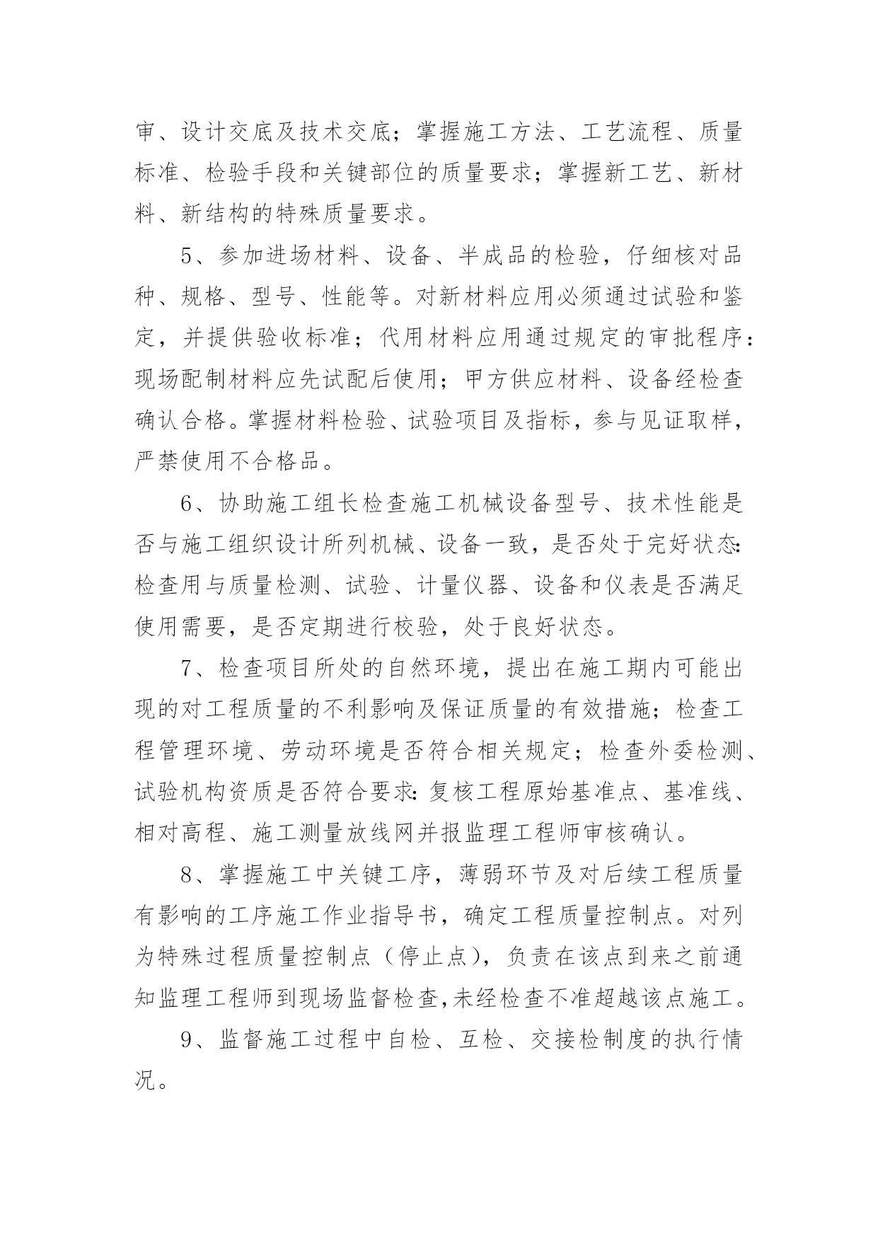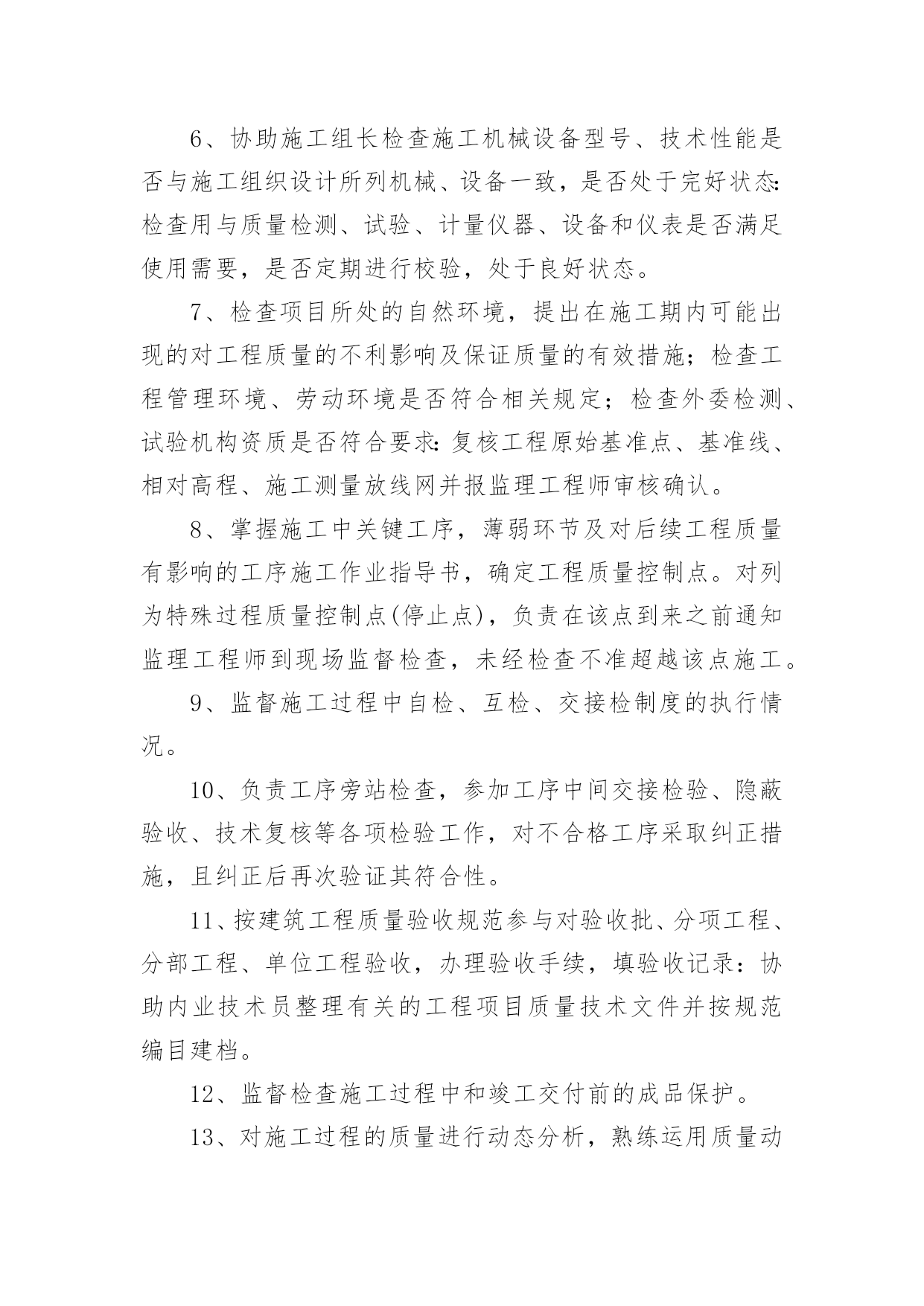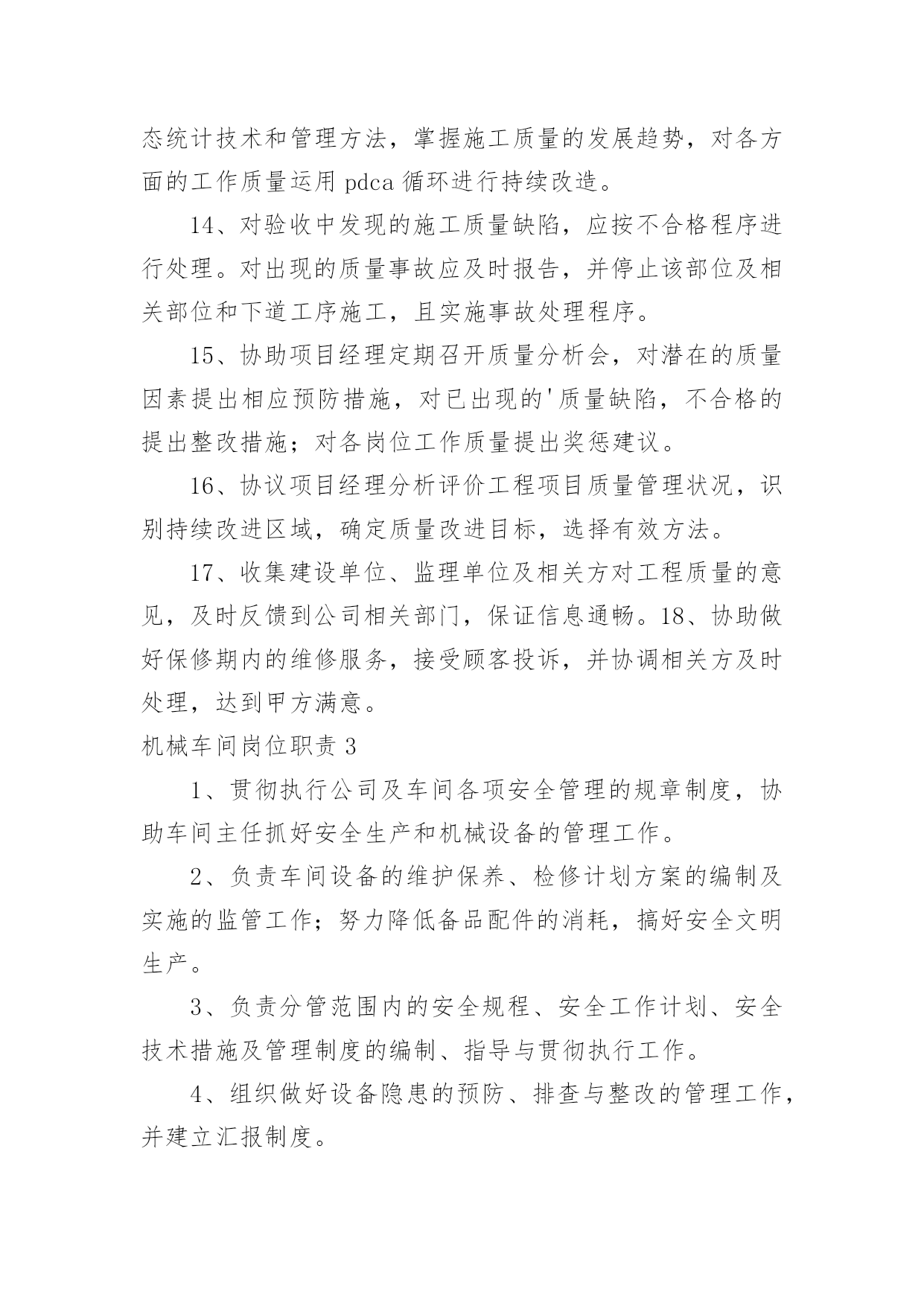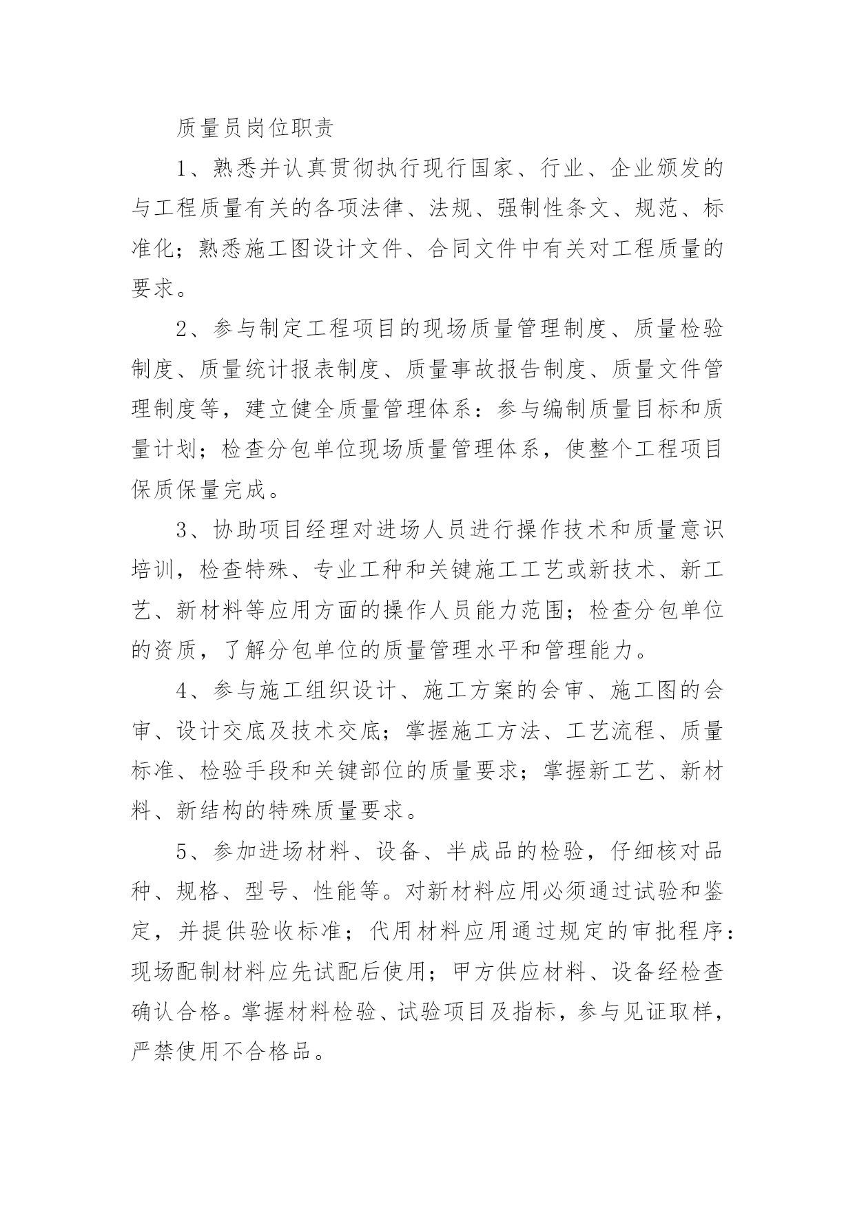 机械车间岗位职责机械车间岗位职责在快速变化和不断变革的今天,接触到岗位职责的地方越来越多,制定岗位职责能够有效的地防止因为职位分配不合理而导致部门之间或是员工之间出现工作推脱、责任推卸等现象发生。那么你真正懂得怎么制定岗位职责吗?以下是小编为大家整理的机械车间岗位职责,欢迎大家分享。机械车间岗位职责11、熟悉并认真贯彻执行现行国家、行业、企业颁发的与工程质量有关的各项法律、法规、强制性条文、规范、标准化;熟悉施工图设计文件、合同文件中有关对工程质量的要求。2、参与制定工程项目的现场质量管理制度、质量检验制度、质量统计报表制度、质量事故报告制度、质量文件管理制度等,建立健全质量管理体系:参与编制质量目标和质量计划;检查分包单位现场质量管理体系,使整个工程项目保质保量完成。3、协助项目经理对进场人员进行操作技术和质量意识培训,检查特殊、专业工种和关键施工工艺或新技术、新工艺、新材料等应用方面的操作人员能力范围;检查分包单位的资质,了解分包单位的质量管理水平和管理能力。4、参与施工组织设计、施工方案的会审、施工图的会审、设计交底及技术交底;掌握施工方法、工艺流程、质量标准、检验手段和关键部位的质量要求;掌握新工艺、新材料、新结构的特殊质量要求。5、参加进场材料、设备、半成品的检验,仔细核对品种、规格、型号、性能等。对新材料应用必须通过试验和鉴定,并提供验收标准;代用材料应用通过规定的审批程序:现场配制材料应先试配后使用;甲方供应材料、设备经检查确认合格。掌握材料检验、试验项目及指标,参与见证取样,严禁使用不合格品。6、协助施工组长检查施工机械设备型号、技术性能是否与施工组织设计所列机械、设备一致,是否处于完好状态:检查用与质量检测、试验、计量仪器、设备和仪表是否满足使用需要,是否定期进行校验,处于良好状态。7、检查项目所处的自然环境,提出在施工期内可能出现的对工程质量的不利影响及保证质量的有效措施;检查工程管理环境、劳动环境是否符合相关规定;检查外委检测、试验机构资质是否符合要求:复核工程原始基准点、基准线、相对高程、施工测量放线网并报监理工程师审核确认。8、掌握施工中关键工序,薄弱环节及对后续工程质量有影响的工序施工作业指导书,确定工程质量控制点。对列为特殊过程质量控制点(停止点),负责在该点到来之前通知监理工程师到现场监督检查,未经检查不准超越该点施工。9、监督施工过程中自检、互检、交接检制度的执行情况。10、负责工序旁站检查,参加工序中间交接检验、隐蔽验收、技术复核等各项检验工作,对不合格工序采取纠正措施,且纠正后再次验证其符合性。11、按建筑工程质量验收规范参与对验收批、分项工程、分部工程、单位工程验收,办理验收手续,填验收记录:协助内业技术员整理有关的工程项目质量技术文件并按规范编目建档。12、监督检查施工过程中和竣工交付前的成品保护。13、对施工过程的质量进行动态分析,熟练运用质量动态统计技术和管理方法,掌握施工质量的发展趋势,对各方面的工作质量运用pdca循环进行持续改造。14、对验收中发现的施工质量缺陷,应按不合格程序进行处理。对出现的质量事故应及时报告,并停止该部位及相关部位和下道工序施工,且实施事故处理程序。15、协助项目经理定期召开质量分析会,对潜在的质量因素提出相应预防措施,对已出现的质量缺陷,不合格的提出整改措施;对各岗位工作质量提出奖惩建议。16、协议项目经理分析评价工程项目质量管理状况,识别持续改进区域,确定质量改进目标,选择有效方法。17、收集建设单位、监理单位及相关方对工程质量的意见,及时反馈到公司相关部门,保证信息通畅。18、协助做好保修期内的维修服务,接受顾客投诉,并协调相关方及时处理,达到甲方满意。机械车间岗位职责2质量员岗位职责1、熟悉并认真贯彻执行现行国家、行业、企业颁发的与工程质量有关的各项法律、法规、强制性条文、规范、标准化;熟悉施工图设计文件、合同文件中有关对工程质量的要求。2、参与制定工程项目的现场质量管理制度、质量检验制度、质量统计报表制度、质量事故报告制度、质量文件管理制度等,建立健全质量管理体系:参与编制质量目标和质量计划;检查分包单位现场质量管理体系,使整个工程项目保质保量完成。3、协助项目经理对进场人员进行操作技术和质量意识培训,检查特殊、专业工种和关键施工工艺或新技术、新工艺、新材料等应用方面的操作人员能力范围;检查分包单位的资质,了解分包单位的质量管理水平和管理能力。4、参与施工组织设计、施工方案的会审、施工图的会审、设计交底及技术交底;掌握施工方法、工艺流程、质量标准、检验手段和关键部位的质量要求;掌握新工艺、新材料、新结构的特殊质量要求。5、参加进场材料、设备、半成品的检验,仔细核对品种、规格、型号、性能等。对新材料应用必须通过试验和鉴定,并提供验收标准;代用