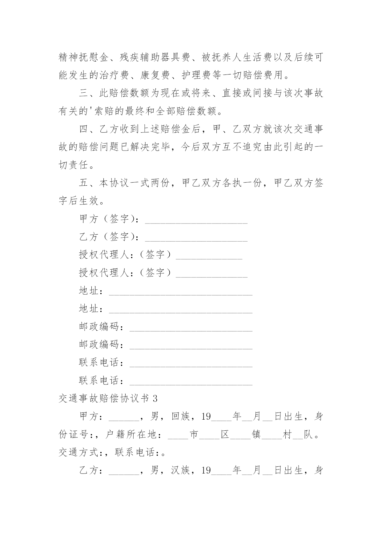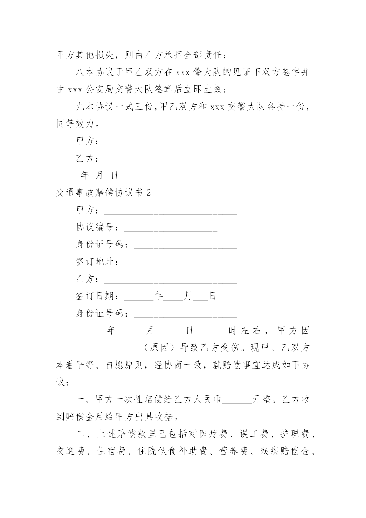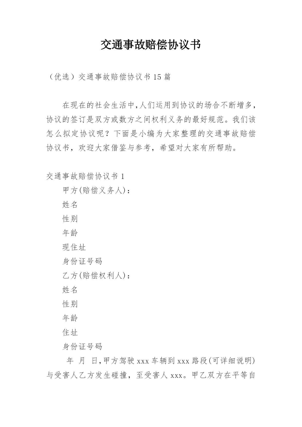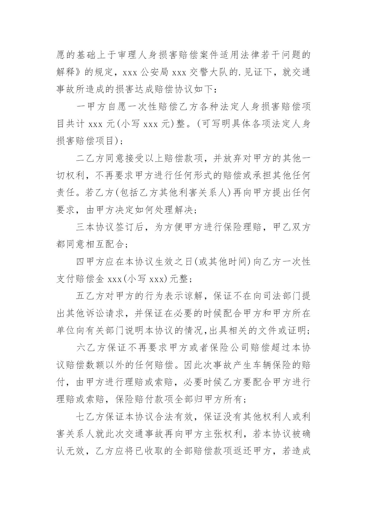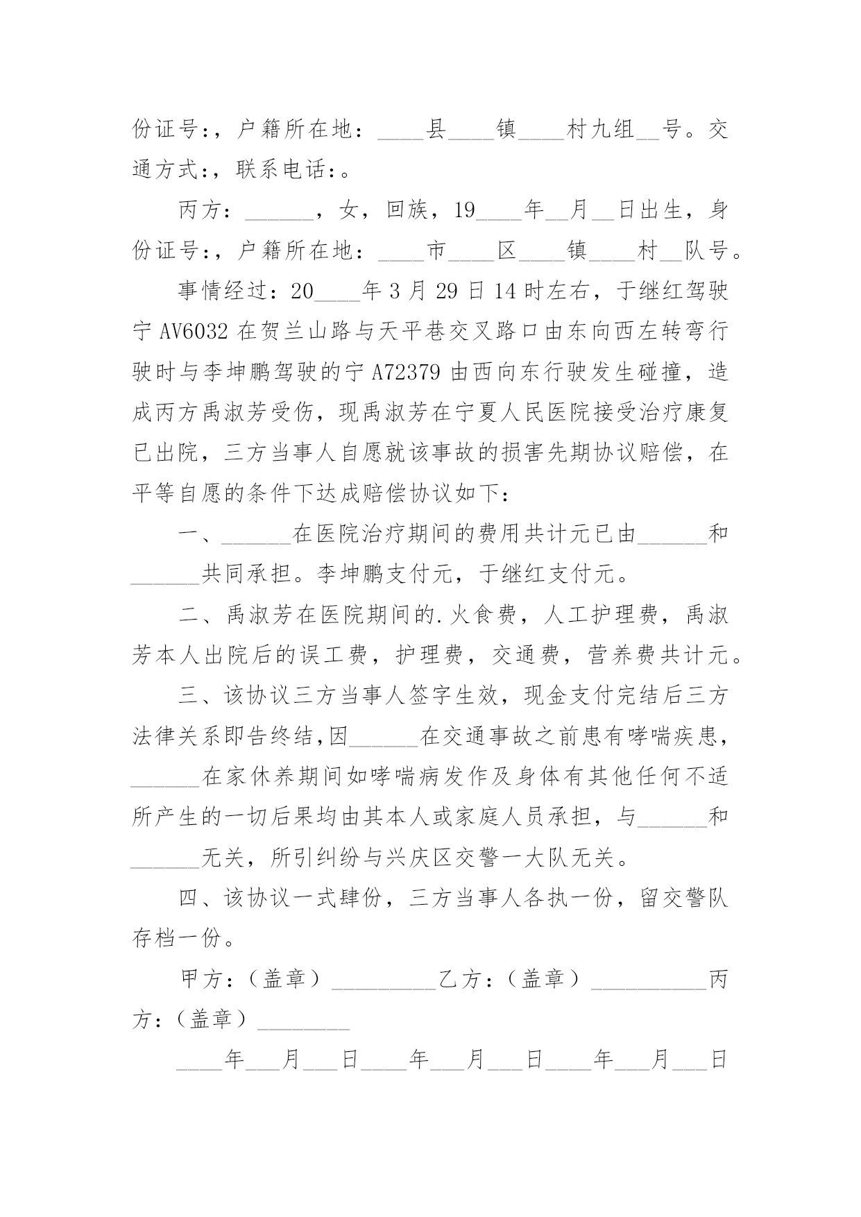 交通事故赔偿协议书(优选)交通事故赔偿协议书15篇在现在的社会生活中,人们运用到协议的场合不断增多,协议的签订是双方或数方之间权利义务的最好规范。我们该怎么拟定协议呢?下面是小编为大家整理的交通事故赔偿协议书,欢迎大家借鉴与参考,希望对大家有所帮助。交通事故赔偿协议书1甲方(赔偿义务人):姓名性别年龄现住址身份证号码乙方(赔偿权利人):姓名性别年龄住址身份证号码年月日,甲方驾驶xxx车辆到xxx路段(可详细说明)与受害人乙方发生碰撞,至受害人xxx。甲乙双方在平等自愿的基础上于审理人身损害赔偿案件适用法律若干问题的解释》的规定,xxx公安局xxx交警大队的.见证下,就交通事故所造成的损害达成赔偿协议如下:一甲方自愿一次性赔偿乙方各种法定人身损害赔偿项目共计xxx元(小写xxx元)整。(可写明具体各项法定人身损害赔偿项目);二乙方同意接受以上赔偿款项,并放弃对甲方的其他一切权利,不再要求甲方进行任何形式的赔偿或承担其他任何责任。若乙方(包括乙方其他利害关系人)再向甲方提出任何要求,由甲方决定如何处理解决;三本协议签订后,为方便甲方进行保险理赔,甲乙双方都同意相互配合;四甲方应在本协议生效之日(或其他时间)向乙方一次性支付赔偿金xxx(小写xxx)元整;五乙方对甲方的行为表示谅解,保证不在向司法部门提出其他诉讼请求,并保证在必要的时候配合甲方和甲方所在单位向有关部门说明本协议的情况,出具相关的文件或证明;六乙方保证不再要求甲方或者保险公司赔偿超过本协议赔偿数额以外的任何赔偿。因此次事故产生车辆保险的赔付,由甲方进行理赔或索赔,必要时候乙方要配合甲方进行理赔或索赔,保险赔付款项全部归甲方所有;七乙方保证本协议合法有效,保证没有其他权利人或利害关系人就此次交通事故再向甲方主张权利,若本协议被确认无效,乙方应将已收取的全部赔偿款项返还甲方,若造成甲方其他损失,则由乙方承担全部责任;八本协议于甲乙双方在xxx警大队的见证下双方签字并由xxx公安局交警大队签章后立即生效;九本协议一式三份,甲乙双方和xxx交警大队各持一份,同等效力。甲方:乙方:年月日交通事故赔偿协议书2甲方:___________________________协议编号:___________________身份证号码:_____________________签订地址:___________________乙方:___________________________签订日期:______年____月___日身份证号码:__________________________年_____月_____日______时左右,甲方因_________________(原因)导致乙方受伤。现甲、乙双方本着平等、自愿原则,经协商一致,就赔偿事宜达成如下协议:一、甲方一次性赔偿给乙方人民币______元整。乙方收到赔偿金后给甲方出具收据。二、上述赔偿款里已包括对医疗费、误工费、护理费、交通费、住宿费、住院伙食补助费、营养费、残疾赔偿金、精神抚慰金、残疾辅助器具费、被抚养人生活费以及后续可能发生的治疗费、康复费、护理费等一切赔偿费用。三、此赔偿数额为现在或将来、直接或间接与该次事故有关的'索赔的最终和全部赔偿数额。四、乙方收到上述赔偿金后,甲、乙双方就该次交通事故的赔偿问题已解决完毕,今后双方互不追究由此引起的一切责任。五、本协议一式两份,甲乙双方各执一份,甲乙双方签字后生效。甲方(签字):____________________乙方(签字):____________________授权代理人:(签字)_____________授权代理人:(签字)______________地址:____________________________地址:____________________________邮政编码:________________________邮政编码:________________________联系电话:________________________联系电话:________________________交通事故赔偿协议书3甲方:______,男,回族,19____年__月__日出生,身份证号:,户籍所在地:____市____区____镇____村__队。交通方式:,联系电话:。乙方:______,男,汉族,19____年__月__日出生,身份证号:,户籍所在地:____县____镇____村九组__号。交通方式:,联系电话:。丙方:______,女,回族,19____年__月__日出生,身份证号:,户籍所在地:____市____区____镇____村__队号。事情经过:20____年3月29日14时左右,于继红驾驶宁AV6032在贺兰山路与天平巷交叉路口由东向西左转