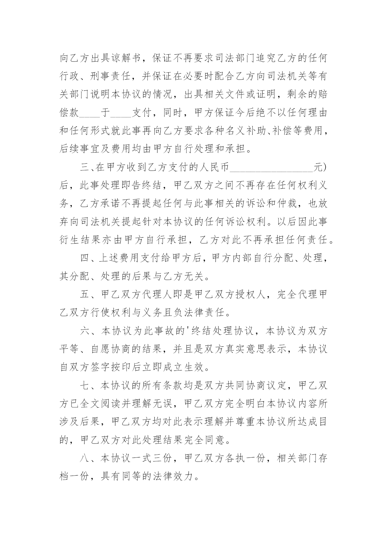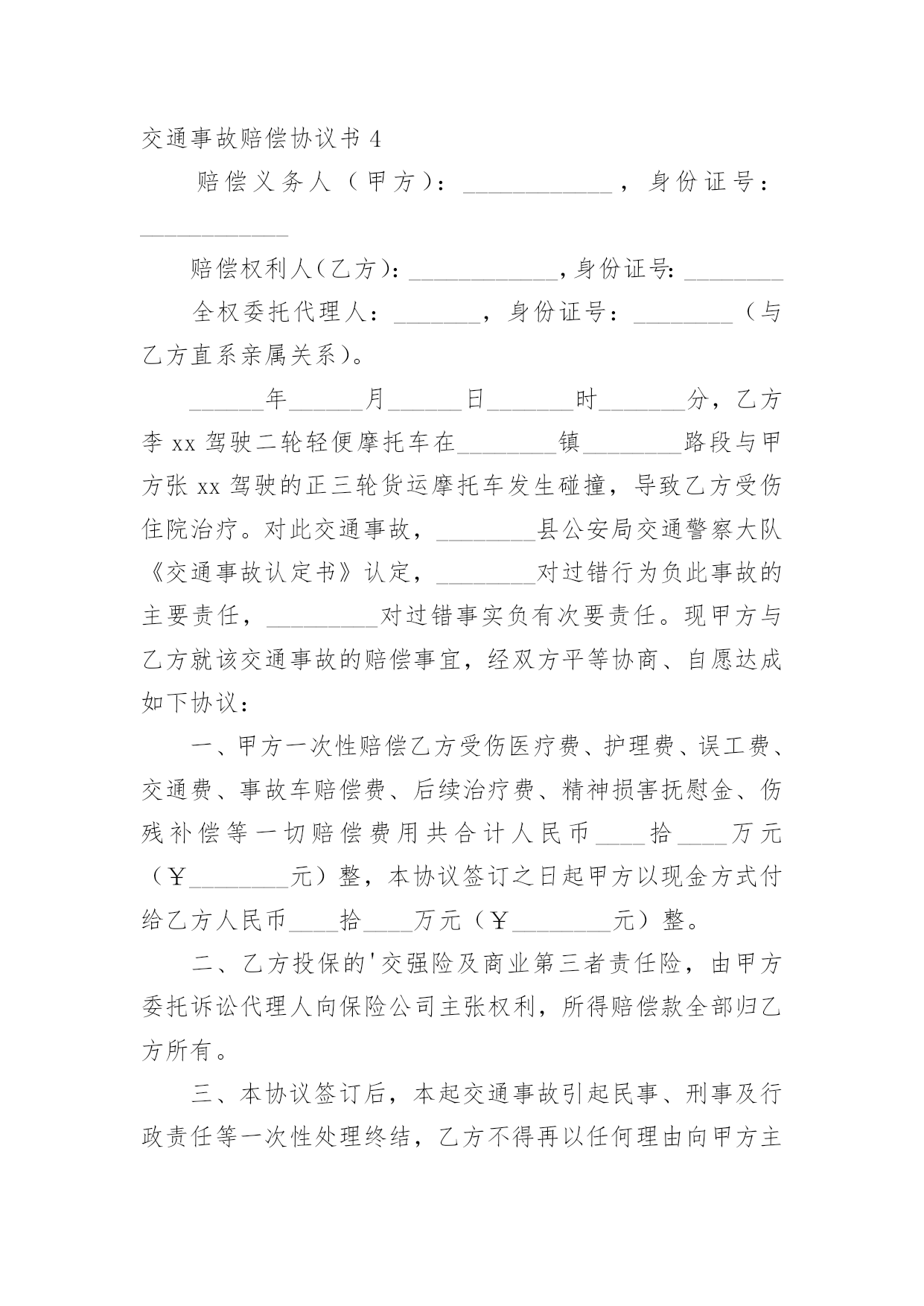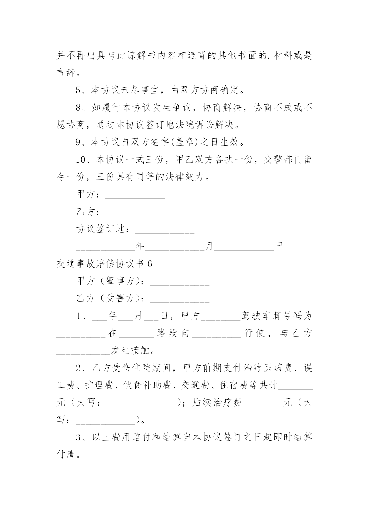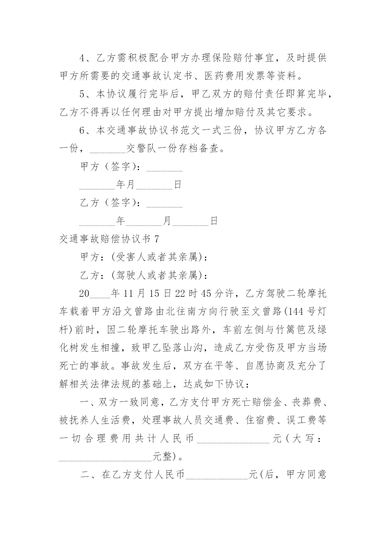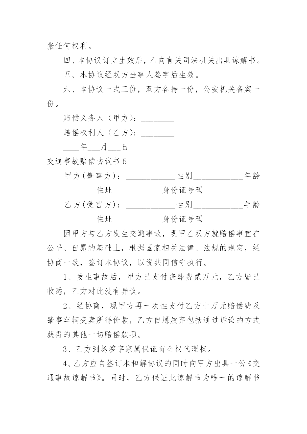 交通事故赔偿协议书(优选)交通事故赔偿协议书15篇在现在的社会生活中,人们运用到协议的场合不断增多,协议的签订是双方或数方之间权利义务的最好规范。我们该怎么拟定协议呢?下面是小编为大家整理的交通事故赔偿协议书,欢迎大家借鉴与参考,希望对大家有所帮助。交通事故赔偿协议书1甲方(赔偿义务人):姓名性别年龄现住址身份证号码乙方(赔偿权利人):姓名性别年龄住址身份证号码年月日,甲方驾驶xxx车辆到xxx路段(可详细说明)与受害人乙方发生碰撞,至受害人xxx。甲乙双方在平等自愿的基础上于审理人身损害赔偿案件适用法律若干问题的解释》的规定,xxx公安局xxx交警大队的.见证下,就交通事故所造成的损害达成赔偿协议如下:一甲方自愿一次性赔偿乙方各种法定人身损害赔偿项目共计xxx元(小写xxx元)整。(可写明具体各项法定人身损害赔偿项目);二乙方同意接受以上赔偿款项,并放弃对甲方的其他一切权利,不再要求甲方进行任何形式的赔偿或承担其他任何责任。若乙方(包括乙方其他利害关系人)再向甲方提出任何要求,由甲方决定如何处理解决;三本协议签订后,为方便甲方进行保险理赔,甲乙双方都同意相互配合;四甲方应在本协议生效之日(或其他时间)向乙方一次性支付赔偿金xxx(小写xxx)元整;五乙方对甲方的行为表示谅解,保证不在向司法部门提出其他诉讼请求,并保证在必要的时候配合甲方和甲方所在单位向有关部门说明本协议的情况,出具相关的文件或证明;六乙方保证不再要求甲方或者保险公司赔偿超过本协议赔偿数额以外的任何赔偿。因此次事故产生车辆保险的赔付,由甲方进行理赔或索赔,必要时候乙方要配合甲方进行理赔或索赔,保险赔付款项全部归甲方所有;七乙方保证本协议合法有效,保证没有其他权利人或利害关系人就此次交通事故再向甲方主张权利,若本协议被确认无效,乙方应将已收取的全部赔偿款项返还甲方,若造成甲方其他损失,则由乙方承担全部责任;八本协议于甲乙双方在xxx警大队的见证下双方签字并由xxx公安局交警大队签章后立即生效;九本协议一式三份,甲乙双方和xxx交警大队各持一份,同等效力。甲方:乙方:年月日交通事故赔偿协议书2甲方:___________________________协议编号:___________________身份证号码:_____________________签订地址:___________________乙方:___________________________签订日期:______年____月___日身份证号码:__________________________年_____月_____日______时左右,甲方因_________________(原因)导致乙方受伤。现甲、乙双方本着平等、自愿原则,经协商一致,就赔偿事宜达成如下协议:一、甲方一次性赔偿给乙方人民币______元整。乙方收到赔偿金后给甲方出具收据。二、上述赔偿款里已包括对医疗费、误工费、护理费、交通费、住宿费、住院伙食补助费、营养费、残疾赔偿金、精神抚慰金、残疾辅助器具费、被抚养人生活费以及后续可能发生的治疗费、康复费、护理费等一切赔偿费用。三、此赔偿数额为现在或将来、直接或间接与该次事故有关的'索赔的最终和全部赔偿数额。四、乙方收到上述赔偿金后,甲、乙双方就该次交通事故的赔偿问题已解决完毕,今后双方互不追究由此引起的一切责任。五、本协议一式两份,甲乙双方各执一份,甲乙双方签字后生效。甲方(签字):____________________乙方(签字):____________________授权代理人:(签字)_____________授权代理人:(签字)______________地址:____________________________地址:____________________________邮政编码:________________________邮政编码:________________________联系电话:________________________联系电话:________________________交通事故赔偿协议书3甲方:______,男,回族,19____年__月__日出生,身份证号:,户籍所在地:____市____区____镇____村__队。交通方式:,联系电话:。乙方:______,男,汉族,19____年__月__日出生,身份证号:,户籍所在地:____县____镇____村九组__号。交通方式:,联系电话:。丙方:______,女,回族,19____年__月__日出生,身份证号:,户籍所在地:____市____区____镇____村__队号。事情经过:20____年3月29日14时左右,于继红驾驶宁AV6032在贺兰山路与天平巷交叉路口由东向西左转