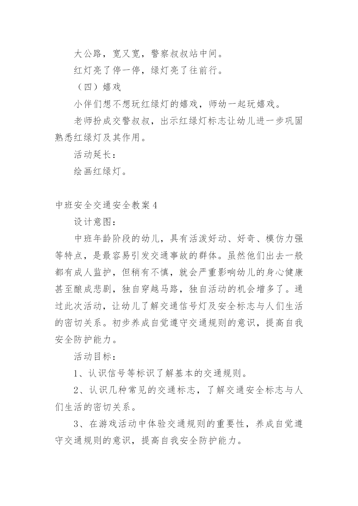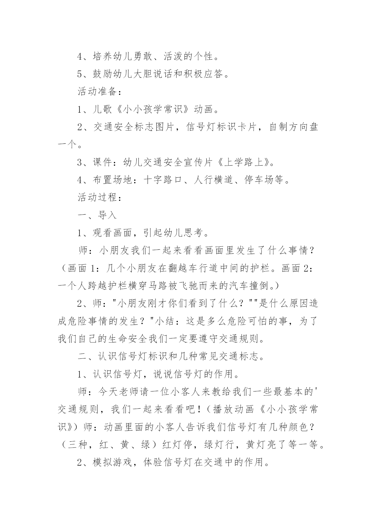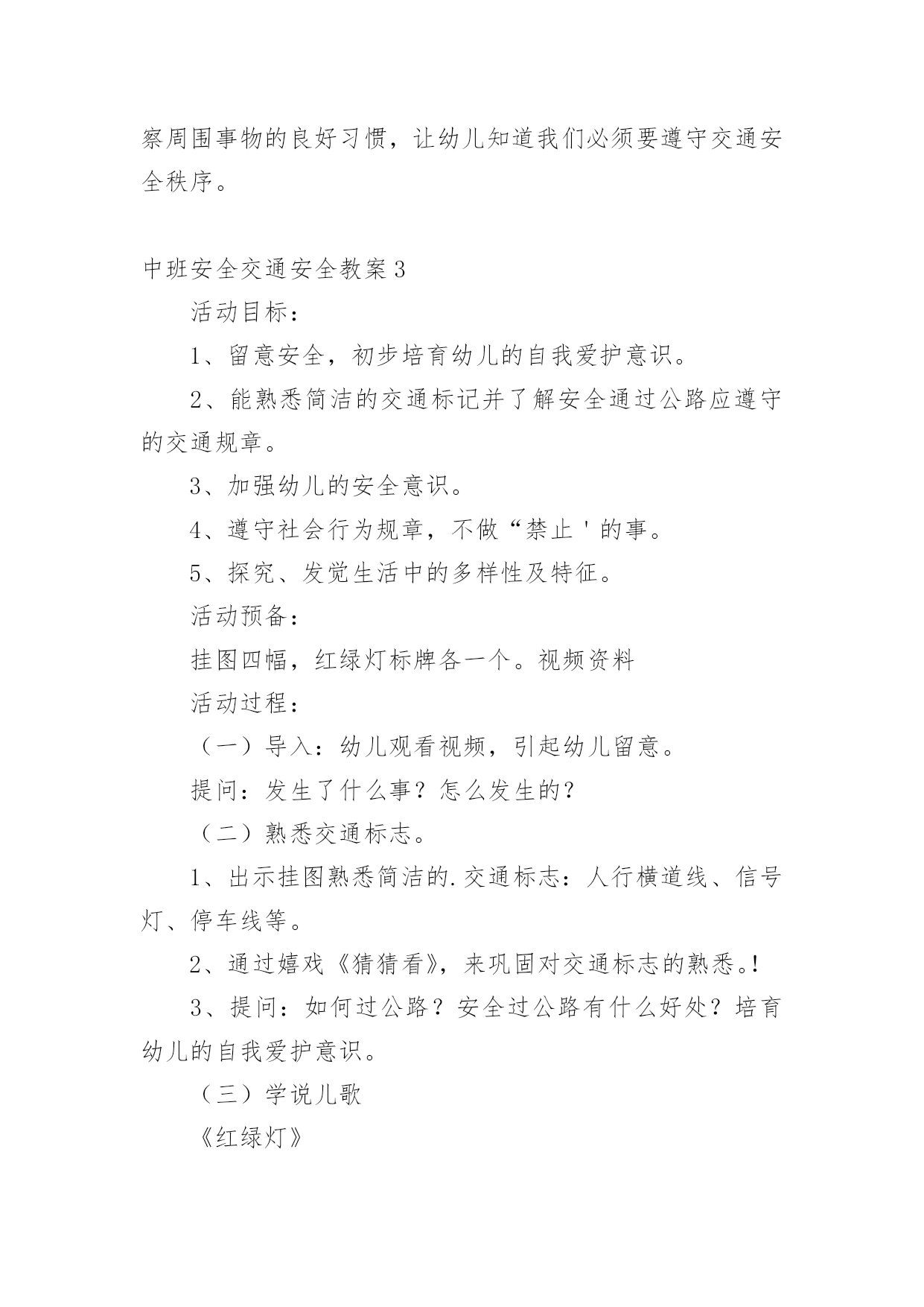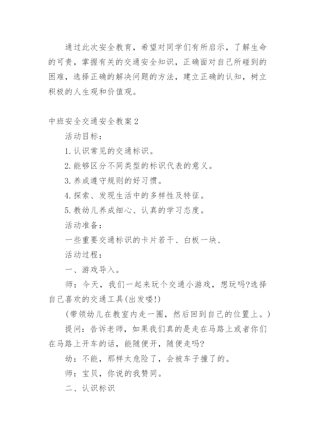 中班安全交通安全教案作为一名人民教师,时常需要用到教案,借助教案可以有效提升自己的教学能力。教案应该怎么写呢?下面是小编为大家整理的中班安全交通安全教案,欢迎大家借鉴与参考,希望对大家有所帮助。中班安全交通安全教案1教学目标:1、通过交通安全的教育使学生了解生命的可贵,掌握有关的交通安全知识,认清学习目的,增强学生安全意识2、引导学生在活动中认识生命的意义,在自我体验中发挥潜能,丰富自我生命,提升生命意义。热爱生命、保护生命3、为加强对学生法制与交通安全的教育与管理,使学生增加法制观念,做到懂法、知法、守法,确保身心健康,平安完成学业,教学重点:让学生知道各种常见的交通信号、标志和标线,知道有关交通常识,懂得应自觉遵守交通规则。教学难点:加强交通法规知识的学习,遵守交通法规教学过程:讲解交通安全事故案例一、导入:通过一系列的.活动,让学生树立交通安全意识,从精神上远离交通安全隐患,加强自身的素质培养.为了贯彻落实公安部、教育部《关于加强中职学校交通安全工作的通知》精神,继续进一步搞好我校的交通安全教育,减少交通违章,杜绝交通事故。让学生了解交通活动中必备的安全知识,懂得安全的重要,并把自己学到的知识传达给周围的人们二、交通法规法律条文法规篇:1、道路、交通2、交通安全3、交通法规4、道路交通标志和交通信号5、看图识标志常识篇:1、行人为什么要在人行道上行走,没有人行道要靠路边行走?2、行人横过马路为什么要走人行横道?3、没有划设人行横道的马路应该注意哪些?4、为什么不能翻越护栏?5、为什么不准扒车、追车、强行拦车?6、为什么走路时不能看书或做其它活动?7、骑自行车应该注意什么?8、乘汽车时要注意什么?9、遇到交通事故怎么办?警示篇:1、骑自行车违反交通法规2、行走时违反交通法规3、铁路或铁路口违反交通法规4、交通安全教育卡三、观看小品--《爸妈,对不起》情景一:一个孩子要出去上学,他的爸妈一个劲的叮嘱,路在一定要小心……,他却一个劲地说爸妈罗嗦情景二:一次来学校,他因在路在耽搁了一些时间,快迟到了,在横过学校门口的的马路时,他因心急,不走人行横道,想快速地跑向对面,就在这时,悲剧上演了,就在他横冲时,一辆车直接撞上了他,他倒在了血泊里。情景三:因医院抢救他保住了生命,可从此他再也站不起来了,生活也不能自理。他看着为他悲痛伤心的爸爸妈妈,留下了深深悔过的泪水。老师提问:看完小品后,有什么感受?同时你觉得我们应该怎么做,才会尽量避免这些悲剧的发生?小组成员进行讨论,说出感受本课小结同学们,我们通过一系列的活动,让学生树立交通安全意识,从精神上远离交通安全隐患,加强自身的素质培养.继续进一步搞好我们的交通安全教育,减少交通违章,杜绝交通事故。四、交通知识问答课堂练习1、行人在经过人行横道时,怎样走才最安全?()a、一直向右看b、一直向左看c、先向左看,再向右看2、行人在没有交通信号灯和人行横道的路口应如何通过?()a、跑步快速通过b、示意机动车让行后直行通过c、确认安全后直行通过3、黄灯持续闪烁时表示()a、有危险,车辆、行人不准通过b、车辆、行人须注意观望,确认安全后通过c、车辆、行人可以优先通过4、当路口信号灯为红灯和黄灯同时亮时,它表示的是什么含义?()a、即将变为绿灯,做好起步准备b、清理路口,不准通行c、道路通畅,快速通过5、机动车行驶时,除驾驶人应当按规定使用安全带外,同车还有哪些人要使用安全带?()a、前排乘车人b、后排乘车人c、全部乘车人六、课后作业1、当你需要乘坐出租车时,你可以()a、站在机动车道上拦乘b、站在路口拦乘c、站在人行道上拦乘2、当机动车停在机动车道上时,你应当怎样上下车?()a、从机动车左侧下车b、从机动车右侧上下车c、只要不妨碍其他车辆和行人通行,左右侧上下车都可以3、小红在等候乘坐公共汽车时,应该站在(),依次排队a.机动车道上b.站台或指定位置c.非机动车道上d.人行道上4、小杨每天都经过铁路道口,他在经过铁路道口时应该()a.快速跨越铁轨b.进入到口,观察后通过c.一停,二看,三通过d.在栏杆放下时抢先通过5、明明在晚自习课后骑自行车回家途中,迎面遇到一辆驶来的汽车,灯光非常耀眼,为了安全明明应该()a.用手遮挡风光b.闭目缓慢形式c.下车靠边避让d.迎着灯光行驶七、应采取的措施1、提高学生交通安全意识2、知道交通安全有些行为是不安全的3、引导青少年树立正确的价值观、人生观、择业观4、培养青少年自我防范交通安全意识5、一旦不安全的事情发生了,知道应该如何去处理总结:通过此次安全教育,希望对同学们有所启示,了解生命的可贵,掌握有关的交通安全知识,正确面对自己所碰到的困难,选择正确的解决问题的方法,建立正确的认知,树立积极的人生观和价值观。中班安全交通安全教案2活动目标:1.认识常见的交通标