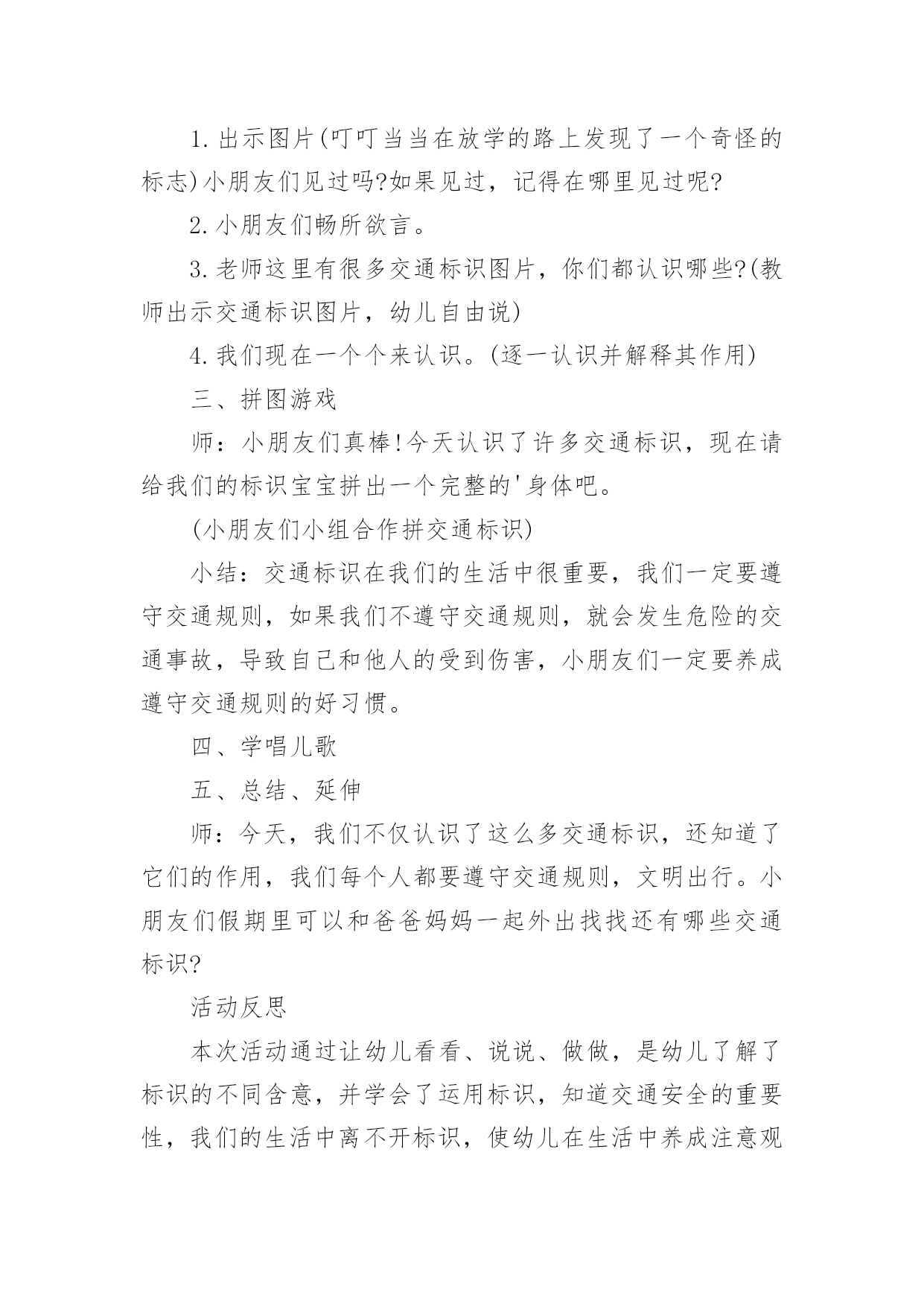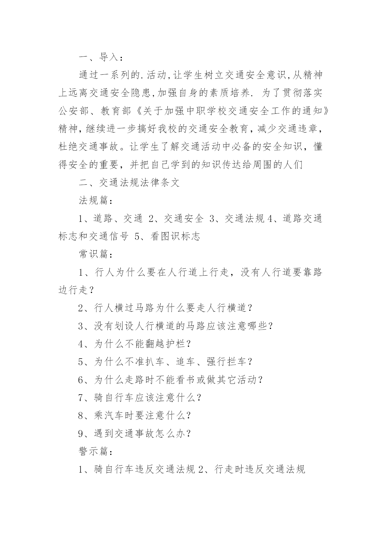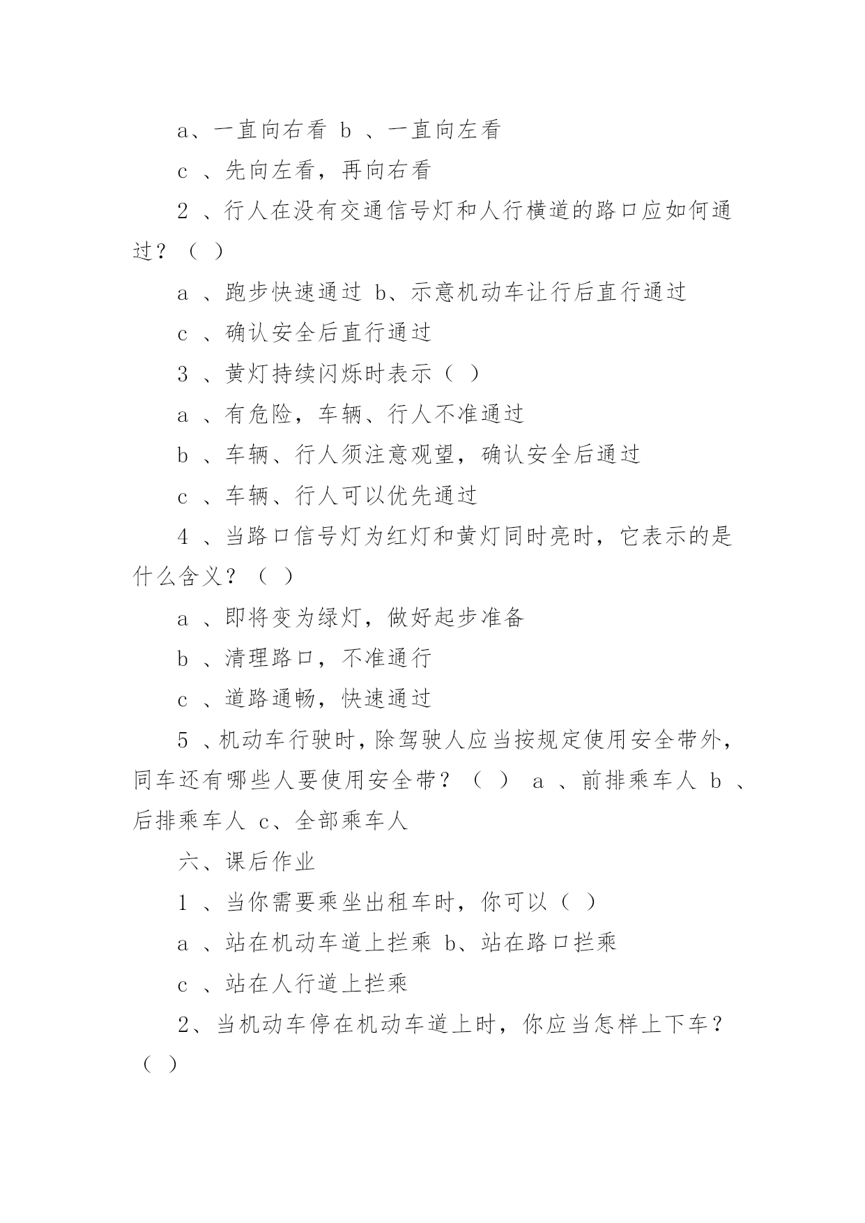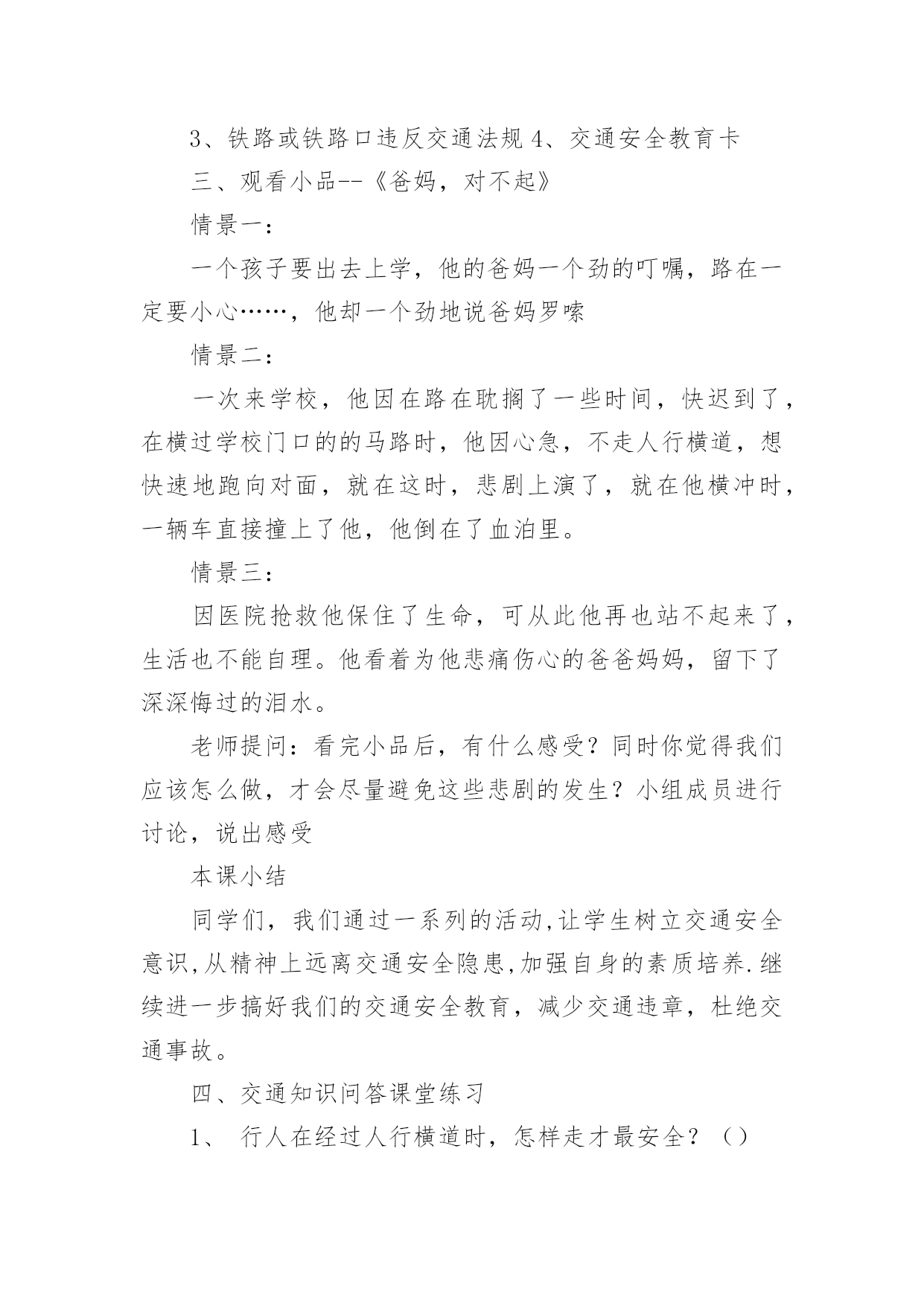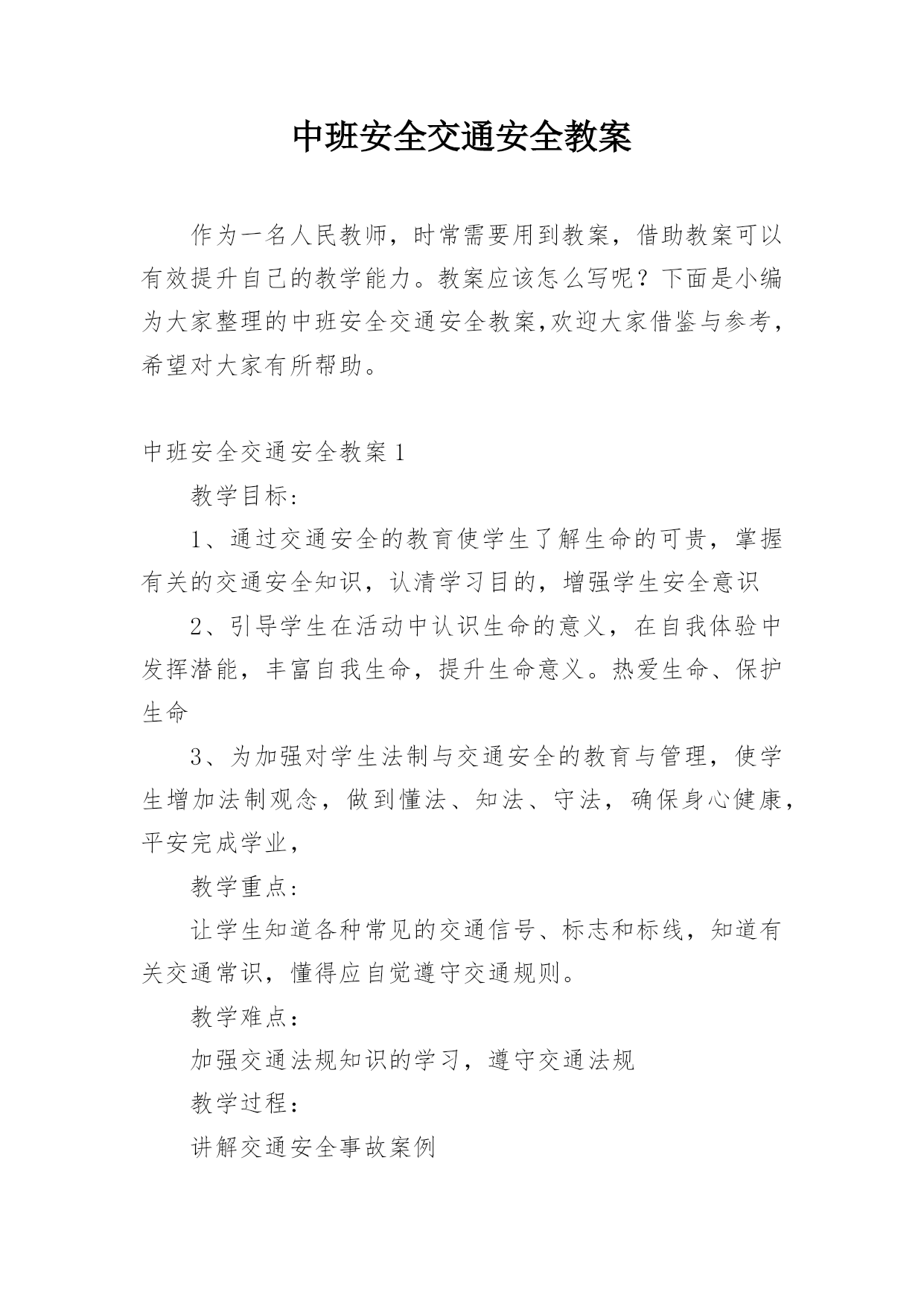 中班安全交通安全教案作为一名人民教师,时常需要用到教案,借助教案可以有效提升自己的教学能力。教案应该怎么写呢?下面是小编为大家整理的中班安全交通安全教案,欢迎大家借鉴与参考,希望对大家有所帮助。中班安全交通安全教案1教学目标:1、通过交通安全的教育使学生了解生命的可贵,掌握有关的交通安全知识,认清学习目的,增强学生安全意识2、引导学生在活动中认识生命的意义,在自我体验中发挥潜能,丰富自我生命,提升生命意义。热爱生命、保护生命3、为加强对学生法制与交通安全的教育与管理,使学生增加法制观念,做到懂法、知法、守法,确保身心健康,平安完成学业,教学重点:让学生知道各种常见的交通信号、标志和标线,知道有关交通常识,懂得应自觉遵守交通规则。教学难点:加强交通法规知识的学习,遵守交通法规教学过程:讲解交通安全事故案例一、导入:通过一系列的.活动,让学生树立交通安全意识,从精神上远离交通安全隐患,加强自身的素质培养.为了贯彻落实公安部、教育部《关于加强中职学校交通安全工作的通知》精神,继续进一步搞好我校的交通安全教育,减少交通违章,杜绝交通事故。让学生了解交通活动中必备的安全知识,懂得安全的重要,并把自己学到的知识传达给周围的人们二、交通法规法律条文法规篇:1、道路、交通2、交通安全3、交通法规4、道路交通标志和交通信号5、看图识标志常识篇:1、行人为什么要在人行道上行走,没有人行道要靠路边行走?2、行人横过马路为什么要走人行横道?3、没有划设人行横道的马路应该注意哪些?4、为什么不能翻越护栏?5、为什么不准扒车、追车、强行拦车?6、为什么走路时不能看书或做其它活动?7、骑自行车应该注意什么?8、乘汽车时要注意什么?9、遇到交通事故怎么办?警示篇:1、骑自行车违反交通法规2、行走时违反交通法规3、铁路或铁路口违反交通法规4、交通安全教育卡三、观看小品--《爸妈,对不起》情景一:一个孩子要出去上学,他的爸妈一个劲的叮嘱,路在一定要小心……,他却一个劲地说爸妈罗嗦情景二:一次来学校,他因在路在耽搁了一些时间,快迟到了,在横过学校门口的的马路时,他因心急,不走人行横道,想快速地跑向对面,就在这时,悲剧上演了,就在他横冲时,一辆车直接撞上了他,他倒在了血泊里。情景三:因医院抢救他保住了生命,可从此他再也站不起来了,生活也不能自理。他看着为他悲痛伤心的爸爸妈妈,留下了深深悔过的泪水。老师提问:看完小品后,有什么感受?同时你觉得我们应该怎么做,才会尽量避免这些悲剧的发生?小组成员进行讨论,说出感受本课小结同学们,我们通过一系列的活动,让学生树立交通安全意识,从精神上远离交通安全隐患,加强自身的素质培养.继续进一步搞好我们的交通安全教育,减少交通违章,杜绝交通事故。四、交通知识问答课堂练习1、行人在经过人行横道时,怎样走才最安全?()a、一直向右看b、一直向左看c、先向左看,再向右看2、行人在没有交通信号灯和人行横道的路口应如何通过?()a、跑步快速通过b、示意机动车让行后直行通过c、确认安全后直行通过3、黄灯持续闪烁时表示()a、有危险,车辆、行人不准通过b、车辆、行人须注意观望,确认安全后通过c、车辆、行人可以优先通过4、当路口信号灯为红灯和黄灯同时亮时,它表示的是什么含义?()a、即将变为绿灯,做好起步准备b、清理路口,不准通行c、道路通畅,快速通过5、机动车行驶时,除驾驶人应当按规定使用安全带外,同车还有哪些人要使用安全带?()a、前排乘车人b、后排乘车人c、全部乘车人六、课后作业1、当你需要乘坐出租车时,你可以()a、站在机动车道上拦乘b、站在路口拦乘c、站在人行道上拦乘2、当机动车停在机动车道上时,你应当怎样上下车?()a、从机动车左侧下车b、从机动车右侧上下车c、只要不妨碍其他车辆和行人通行,左右侧上下车都可以3、小红在等候乘坐公共汽车时,应该站在(),依次排队a.机动车道上b.站台或指定位置c.非机动车道上d.人行道上4、小杨每天都经过铁路道口,他在经过铁路道口时应该()a.快速跨越铁轨b.进入到口,观察后通过c.一停,二看,三通过d.在栏杆放下时抢先通过5、明明在晚自习课后骑自行车回家途中,迎面遇到一辆驶来的汽车,灯光非常耀眼,为了安全明明应该()a.用手遮挡风光b.闭目缓慢形式c.下车靠边避让d.迎着灯光行驶七、应采取的措施1、提高学生交通安全意识2、知道交通安全有些行为是不安全的3、引导青少年树立正确的价值观、人生观、择业观4、培养青少年自我防范交通安全意识5、一旦不安全的事情发生了,知道应该如何去处理总结:通过此次安全教育,希望对同学们有所启示,了解生命的可贵,掌握有关的交通安全知识,正确面对自己所碰到的困难,选择正确的解决问题的方法,建立正确的认知,树立积极的人生观和价值观。中班安全交通安全教案2活动目标:1.认识常见的交通标