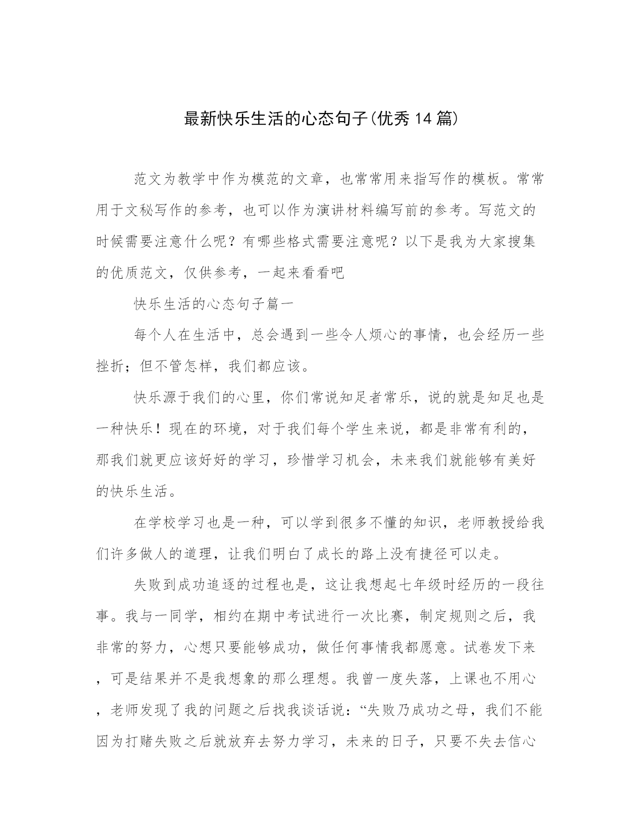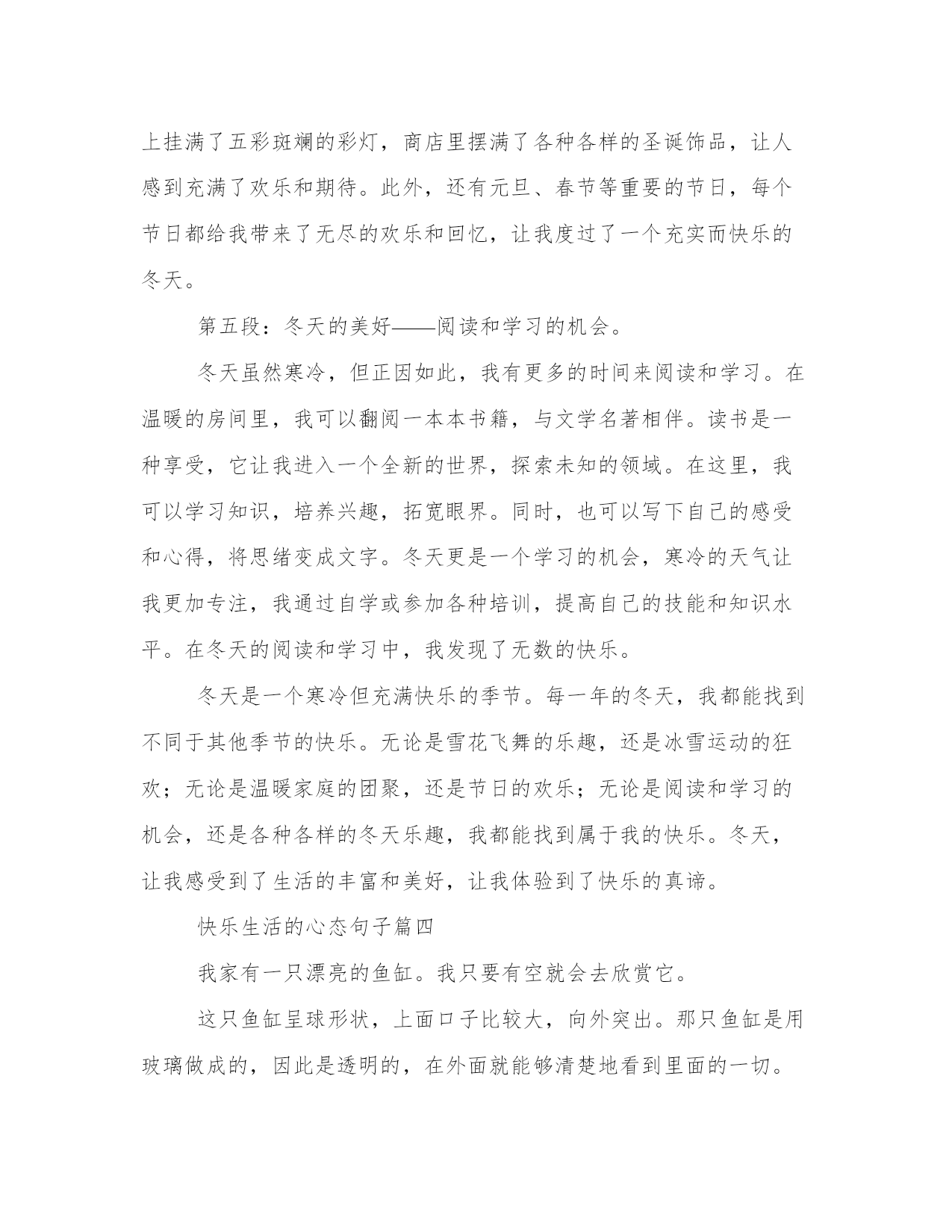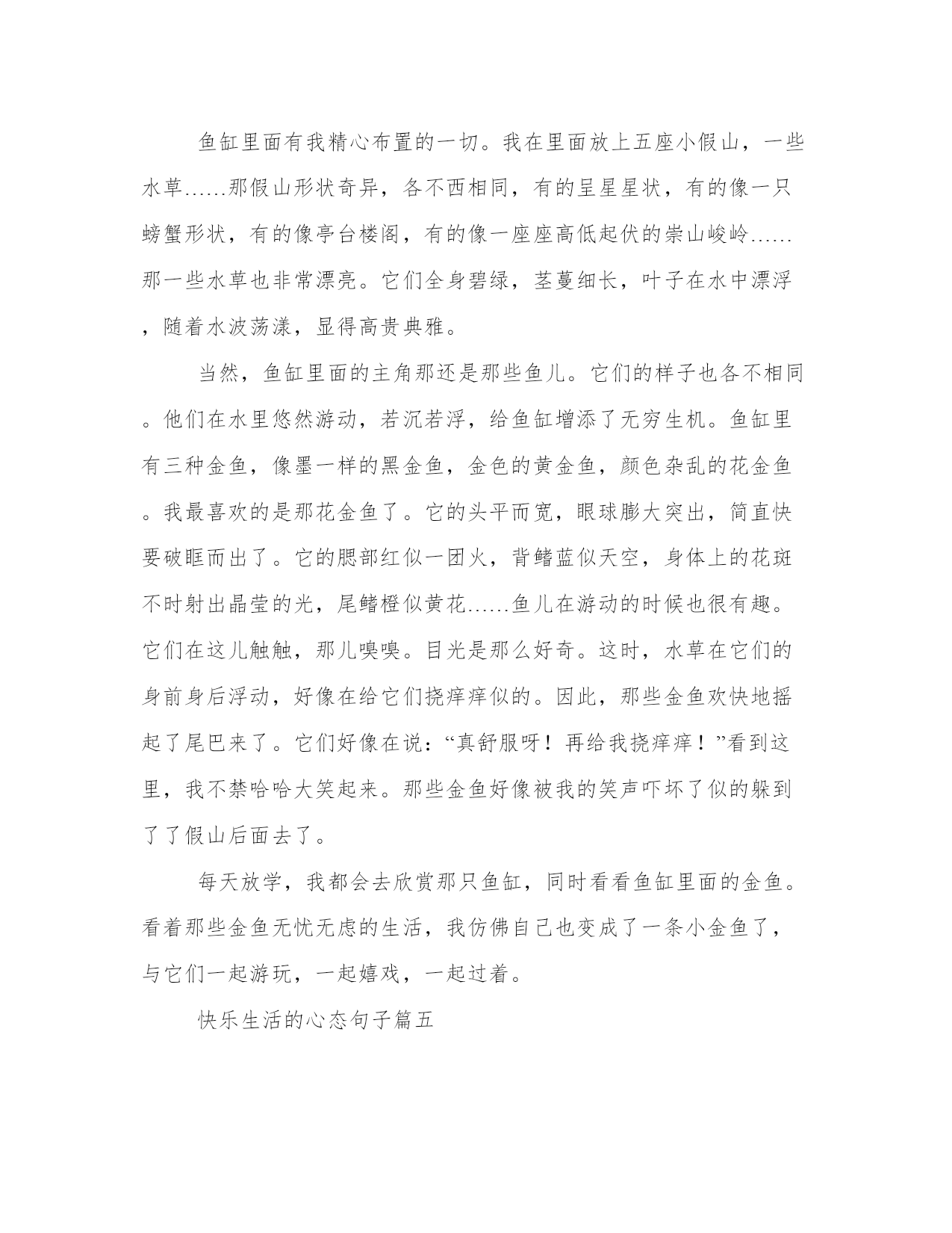 最新快乐生活的心态句子(优秀14篇)范文为教学中作为模范的文章,也常常用来指写作的模板。常常用于文秘写作的参考,也可以作为演讲材料编写前的参考。写范文的时候需要注意什么呢?有哪些格式需要注意呢?以下是我为大家搜集的优质范文,仅供参考,一起来看看吧快乐生活的心态句子篇一每个人在生活中,总会遇到一些令人烦心的事情,也会经历一些挫折;但不管怎样,我们都应该。快乐源于我们的心里,你们常说知足者常乐,说的就是知足也是一种快乐!现在的环境,对于我们每个学生来说,都是非常有利的,那我们就更应该好好的学习,珍惜学习机会,未来我们就能够有美好的快乐生活。在学校学习也是一种,可以学到很多不懂的知识,老师教授给我们许多做人的道理,让我们明白了成长的路上没有捷径可以走。失败到成功追逐的过程也是,这让我想起七年级时经历的一段往事。我与一同学,相约在期中考试进行一次比赛,制定规则之后,我非常的努力,心想只要能够成功,做任何事情我都愿意。试卷发下来,可是结果并不是我想象的那么理想。我曾一度失落,上课也不用心,老师发现了我的问题之后找我谈话说:“失败乃成功之母,我们不能因为打赌失败之后就放弃去努力学习,未来的日子,只要不失去信心,持之以恒并坚持努力,相信成功会离你不远,老师期待你的每一次进步。”后来的日子,我每天做到课前预习,课中认真听讲,课后认真地复习。时间在流逝,期末考试到了,最终我与同学又迎来了一次比试的机会,结果是令人满意的。通过这件事情,我明白了只要付出艰辛,努力,在任何考验面前,不轻言放弃,即便失败也能从中获取到快乐,毕竟付出的过程就是追寻快乐的过程。也许,就是这么简单!快乐生活的心态句子篇二家庭是一个人一生中最温暖、最重要的港湾。一个和谐的家庭,不仅能够给予每个家庭成员心灵的慰藉和情感的力量,还能让人们享受到快乐的生活。多年来,我在自己的家庭中不断探索和实践,积累了一些关于和谐家庭快乐生活的心得体会。第一段:关注沟通与理解。沟通与理解是维系家庭和谐的基石。在家庭中,每个人都有自己的思想、情感和需求,如果不能与家人进行有效的沟通和理解,就容易产生误解和冲突。因此,我们要时刻关注家庭成员之间的沟通,学会倾听和换位思考。在我们的家庭中,每个人都有权利表达自己的观点和感受,并且其他成员要尊重和包容。通过及时的沟通和理解,我们的家庭关系更加紧密,家庭更加和谐。第二段:共同分担家庭责任。家庭是一个共同生活和共同成长的小社会,每个家庭成员都应该对家庭承担起责任。在我们家庭中,我和我的配偶意识到共同承担家庭责任的重要性,我们共同管理家庭的财务、照顾孩子的教育和成长、照料父母的健康等。我们相互支持,共同努力,分担家庭责任,让每个家庭成员感到被重视。这样的共同分担家庭责任的做法,不仅让家庭更加和谐,也增强了家庭成员之间的信任和彼此的依赖。第三段:关注个人需求。尽管家庭是一个集体,但每个家庭成员也有自己的需求和个性。为了保持家庭的和谐,我们要关注每个人的个人需求。在我们的家庭中,我们鼓励每个家庭成员积极追求自己的兴趣爱好和事业发展,并给予支持和鼓励。在个人需求与家庭利益之间寻求平衡是保持家庭和谐的关键。只有当每个人都感到满足和快乐时,整个家庭才能真正进入快乐生活的状态。第四段:培养家庭亲密关系。建立亲密的家庭关系是家庭和谐的重要因素。在家庭中,我们需要投入时间和精力去培养亲密关系。我们每天都坚持共进晚餐,利用这段时间分享彼此的经历、感受和快乐。在周末,我们会安排一些家庭活动,如一起做手工、郊游或看电影。这些亲密关系的培养不仅让家庭成员之间更加亲近,也增加了家庭成员之间的联结感和归属感。和谐家庭的真正乐趣在于每个成员的快乐。在我们家庭中,每个人都有自己的笑声和欢乐。我们经常一起制定家庭目标,如旅游、学习新技能等,以实现我们的愿望和快乐。我们懂得享受生活中的小细节,每日与家人相处的时光变得温馨而充实。家庭的和谐和快乐不仅能给予成员们幸福感和满足感,也会在家庭之外为他们带来信心和积极的能量。总结:和谐家庭快乐生活需要家庭成员共同努力和付出,但它也是值得的。通过关注沟通与理解、共同分担家庭责任、关注个人需求、培养家庭亲密关系和尽享家庭快乐,我们能够让家庭充满和谐和快乐,成为人生中最美好的一部分。只有拥有和谐的家庭,我们才能真正实现快乐的生活。快乐生活的心态句子篇三冬天是一年当中最寒冷的季节,但是对于我来说,冬天却是我最快乐的时光。每当寒风咆哮,雪花飘飞,我总能找到属于自己的快乐。下面,我将与大家分享我的冬天生活心得体会。第一段:冬天的喜乐——雪花飞舞的乐趣。冬天的快乐,源于雪花飞舞的美妙。那些洁白的雪花,在阳光的照耀下闪烁着晶莹的光芒,如天使的鬓发轻轻飘散。每当我看到这美丽的景象,我就充满了快乐的心情。雪花是冬天最好的装