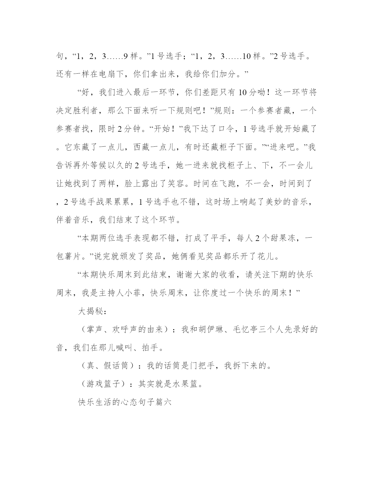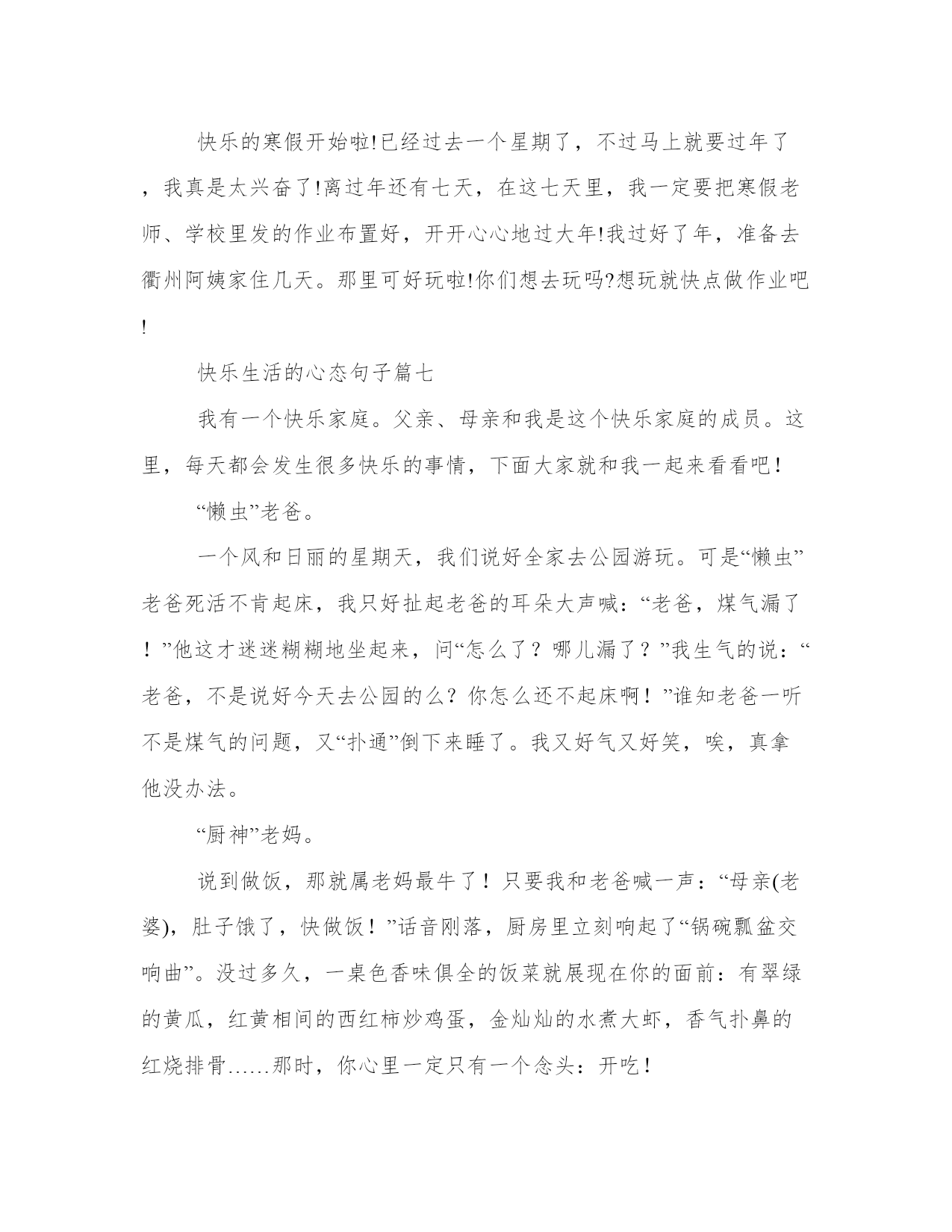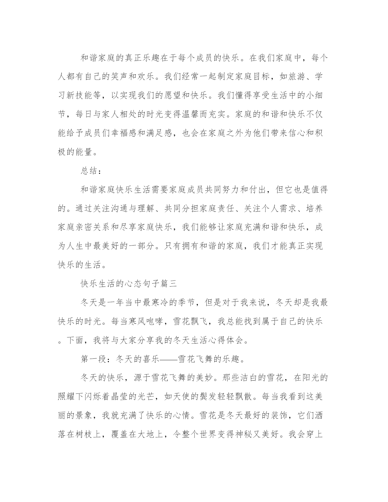 最新快乐生活的心态句子(优秀14篇)范文为教学中作为模范的文章,也常常用来指写作的模板。常常用于文秘写作的参考,也可以作为演讲材料编写前的参考。写范文的时候需要注意什么呢?有哪些格式需要注意呢?以下是我为大家搜集的优质范文,仅供参考,一起来看看吧快乐生活的心态句子篇一每个人在生活中,总会遇到一些令人烦心的事情,也会经历一些挫折;但不管怎样,我们都应该。快乐源于我们的心里,你们常说知足者常乐,说的就是知足也是一种快乐!现在的环境,对于我们每个学生来说,都是非常有利的,那我们就更应该好好的学习,珍惜学习机会,未来我们就能够有美好的快乐生活。在学校学习也是一种,可以学到很多不懂的知识,老师教授给我们许多做人的道理,让我们明白了成长的路上没有捷径可以走。失败到成功追逐的过程也是,这让我想起七年级时经历的一段往事。我与一同学,相约在期中考试进行一次比赛,制定规则之后,我非常的努力,心想只要能够成功,做任何事情我都愿意。试卷发下来,可是结果并不是我想象的那么理想。我曾一度失落,上课也不用心,老师发现了我的问题之后找我谈话说:“失败乃成功之母,我们不能因为打赌失败之后就放弃去努力学习,未来的日子,只要不失去信心,持之以恒并坚持努力,相信成功会离你不远,老师期待你的每一次进步。”后来的日子,我每天做到课前预习,课中认真听讲,课后认真地复习。时间在流逝,期末考试到了,最终我与同学又迎来了一次比试的机会,结果是令人满意的。通过这件事情,我明白了只要付出艰辛,努力,在任何考验面前,不轻言放弃,即便失败也能从中获取到快乐,毕竟付出的过程就是追寻快乐的过程。也许,就是这么简单!快乐生活的心态句子篇二家庭是一个人一生中最温暖、最重要的港湾。一个和谐的家庭,不仅能够给予每个家庭成员心灵的慰藉和情感的力量,还能让人们享受到快乐的生活。多年来,我在自己的家庭中不断探索和实践,积累了一些关于和谐家庭快乐生活的心得体会。第一段:关注沟通与理解。沟通与理解是维系家庭和谐的基石。在家庭中,每个人都有自己的思想、情感和需求,如果不能与家人进行有效的沟通和理解,就容易产生误解和冲突。因此,我们要时刻关注家庭成员之间的沟通,学会倾听和换位思考。在我们的家庭中,每个人都有权利表达自己的观点和感受,并且其他成员要尊重和包容。通过及时的沟通和理解,我们的家庭关系更加紧密,家庭更加和谐。第二段:共同分担家庭责任。家庭是一个共同生活和共同成长的小社会,每个家庭成员都应该对家庭承担起责任。在我们家庭中,我和我的配偶意识到共同承担家庭责任的重要性,我们共同管理家庭的财务、照顾孩子的教育和成长、照料父母的健康等。我们相互支持,共同努力,分担家庭责任,让每个家庭成员感到被重视。这样的共同分担家庭责任的做法,不仅让家庭更加和谐,也增强了家庭成员之间的信任和彼此的依赖。第三段:关注个人需求。尽管家庭是一个集体,但每个家庭成员也有自己的需求和个性。为了保持家庭的和谐,我们要关注每个人的个人需求。在我们的家庭中,我们鼓励每个家庭成员积极追求自己的兴趣爱好和事业发展,并给予支持和鼓励。在个人需求与家庭利益之间寻求平衡是保持家庭和谐的关键。只有当每个人都感到满足和快乐时,整个家庭才能真正进入快乐生活的状态。第四段:培养家庭亲密关系。建立亲密的家庭关系是家庭和谐的重要因素。在家庭中,我们需要投入时间和精力去培养亲密关系。我们每天都坚持共进晚餐,利用这段时间分享彼此的经历、感受和快乐。在周末,我们会安排一些家庭活动,如一起做手工、郊游或看电影。这些亲密关系的培养不仅让家庭成员之间更加亲近,也增加了家庭成员之间的联结感和归属感。和谐家庭的真正乐趣在于每个成员的快乐。在我们家庭中,每个人都有自己的笑声和欢乐。我们经常一起制定家庭目标,如旅游、学习新技能等,以实现我们的愿望和快乐。我们懂得享受生活中的小细节,每日与家人相处的时光变得温馨而充实。家庭的和谐和快乐不仅能给予成员们幸福感和满足感,也会在家庭之外为他们带来信心和积极的能量。总结:和谐家庭快乐生活需要家庭成员共同努力和付出,但它也是值得的。通过关注沟通与理解、共同分担家庭责任、关注个人需求、培养家庭亲密关系和尽享家庭快乐,我们能够让家庭充满和谐和快乐,成为人生中最美好的一部分。只有拥有和谐的家庭,我们才能真正实现快乐的生活。快乐生活的心态句子篇三冬天是一年当中最寒冷的季节,但是对于我来说,冬天却是我最快乐的时光。每当寒风咆哮,雪花飘飞,我总能找到属于自己的快乐。下面,我将与大家分享我的冬天生活心得体会。第一段:冬天的喜乐——雪花飞舞的乐趣。冬天的快乐,源于雪花飞舞的美妙。那些洁白的雪花,在阳光的照耀下闪烁着晶莹的光芒,如天使的鬓发轻轻飘散。每当我看到这美丽的景象,我就充满了快乐的心情。雪花是冬天最好的装