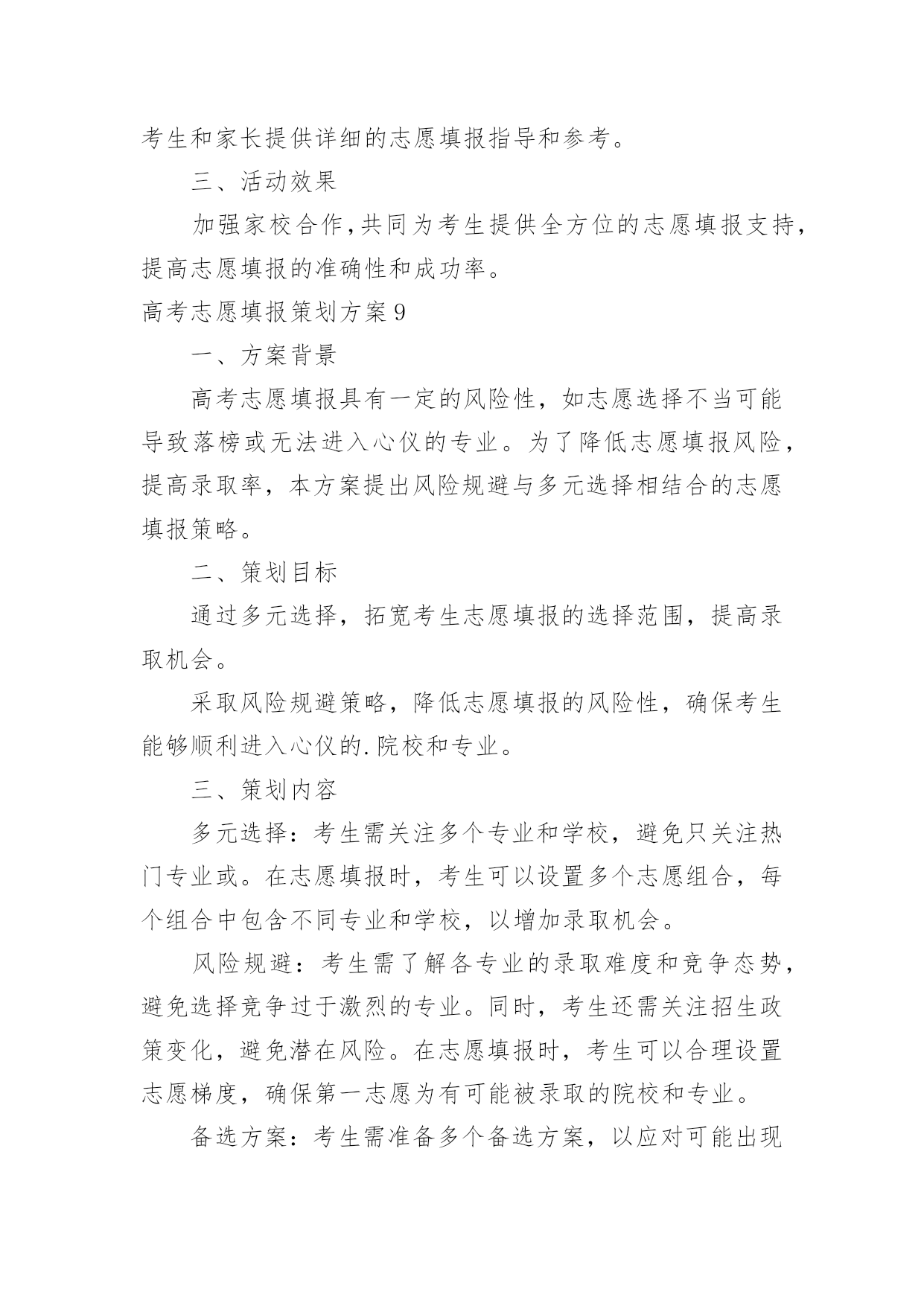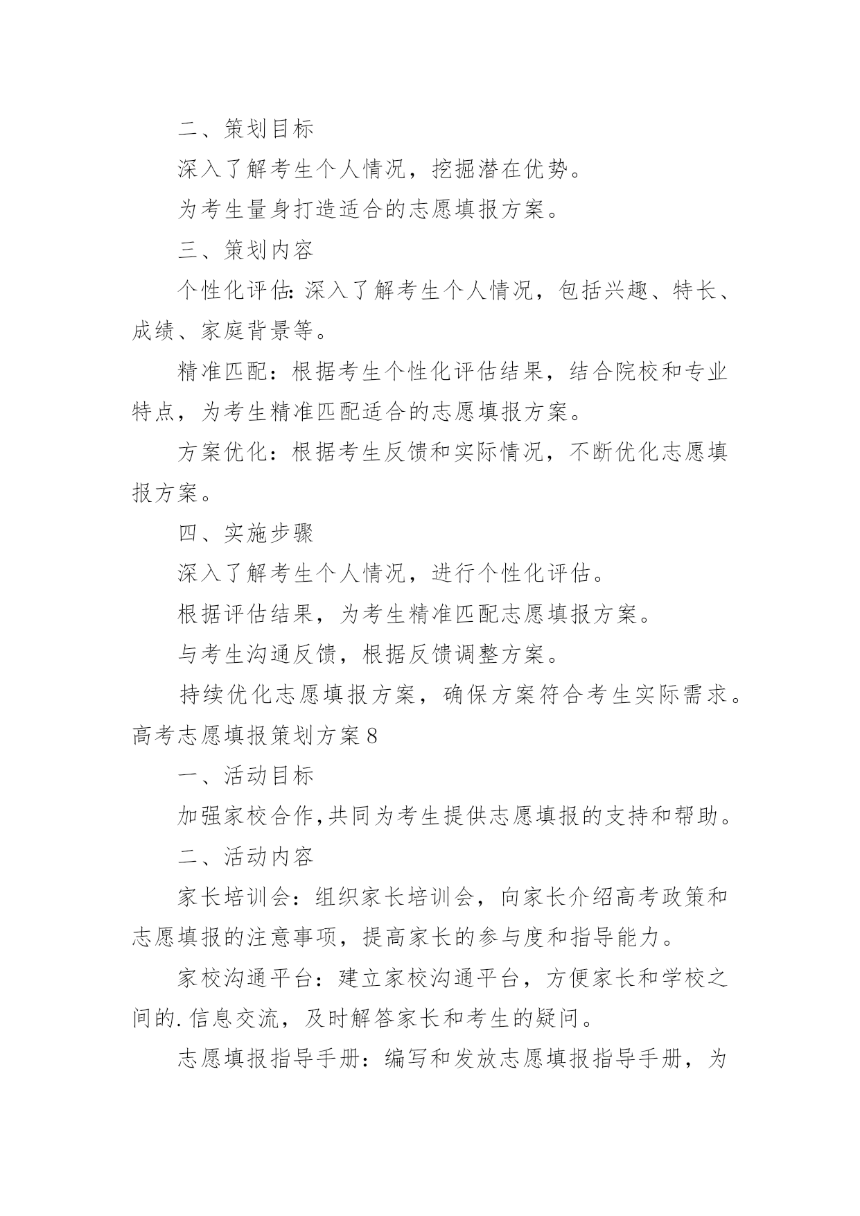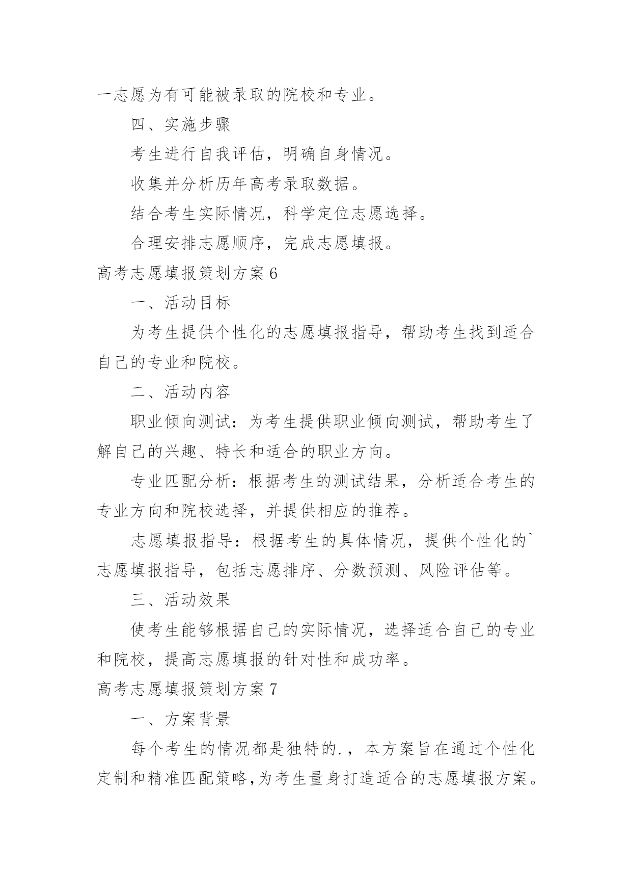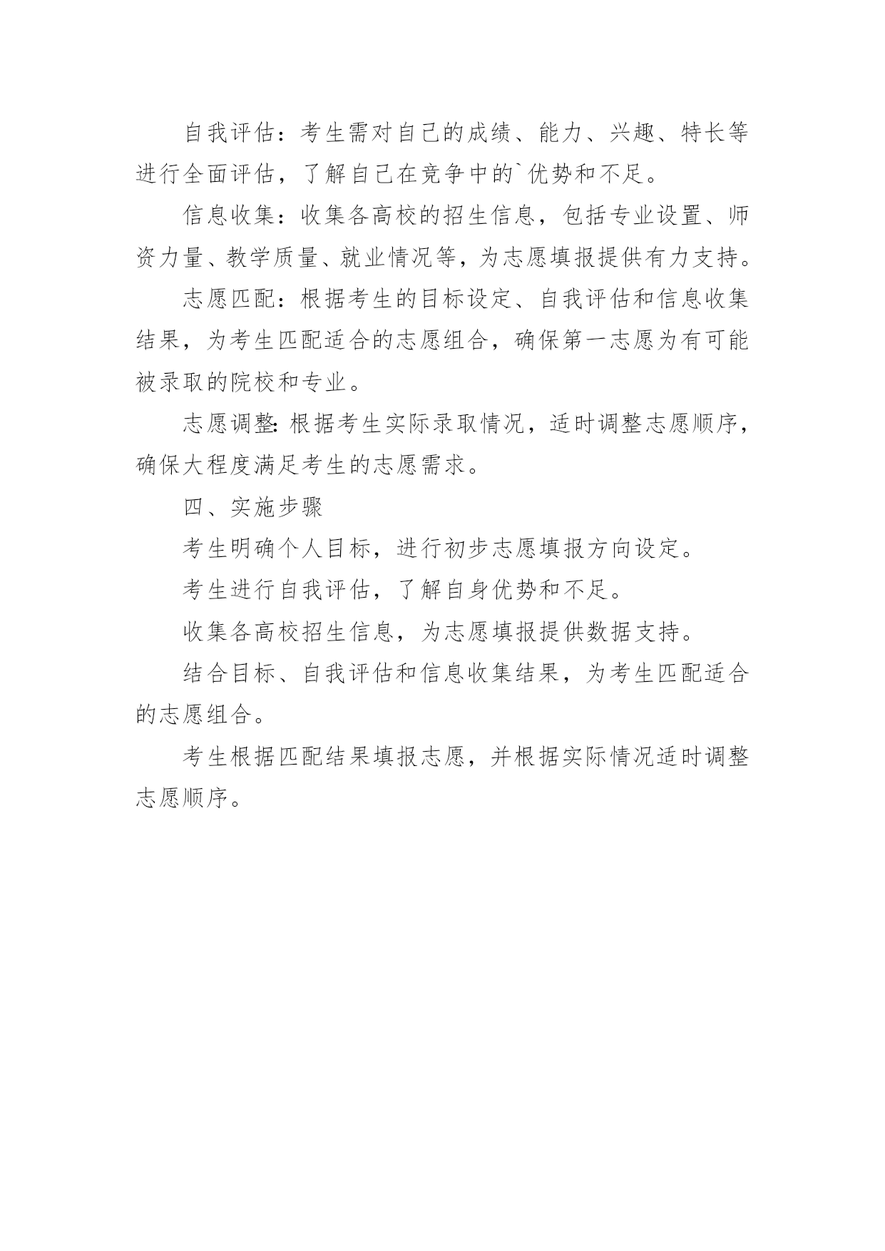 高考志愿填报策划方案高考志愿填报策划方案为了确保我们的努力取得实效,常常需要提前制定一份优秀的方案,方案是有很强可操作性的书面计划。那么制定方案需要注意哪些问题呢?下面是小编精心整理的高考志愿填报策划方案,希望对大家有所帮助。高考志愿填报策划方案1一、方案背景高考志愿填报不仅是选择大学和专业,更是对未来职业规划和长远发展的'决策。本方案旨在通过职业规划与长远发展策略,帮助考生做出更明智的志愿填报选择。二、策划目标引导考生关注未来职业规划和长远发展。结合考生职业规划,为其制定合适的志愿填报方案。三、策划内容职业规划:引导考生思考未来职业发展方向和目标,明确所需专业知识和技能。长远发展:结合社会经济发展趋势和行业需求变化,为考生分析未来职业发展前景和趋势。志愿填报:根据考生职业规划和长远发展需求,为其制定合适的志愿填报方案,包括专业方向、学校层次等。四、实施步骤引导考生思考未来职业发展方向和目标。分析社会经济发展趋势和行业需求变化,为考生提供职业规划建议。根据考生职业规划和长远发展需求,为其制定合适的志愿填报方案。指导考生完成志愿填报并持续关注后续发展动态。高考志愿填报策划方案2一、活动目标通过模拟志愿填报演练,让考生提前体验志愿填报的流程,提高实战能力和填报技巧。二、活动内容模拟志愿填报系统:开发或引入模拟志愿填报系统,让考生在线进行志愿填报演练。实战指导:组织专业的.志愿填报老师,对考生进行实时指导和解答,帮助考生解决填报过程中的问题。演练总结:对考生的模拟填报结果进行统计分析,找出存在的问题和不足,并提供相应的改进建议。三、活动效果使考生能够熟悉志愿填报的流程和要求,提高实战能力和填报技巧,为正式填报做好充分准备。高考志愿填报策划方案3一、活动目标帮助考生和家长全面了解各个专业及院校的特点,科学规划志愿填报,避免盲目填报和跟风填报。二、活动内容专业介绍会:邀请各领域的专家或高校教师,为考生和家长介绍不同专业的'课程设置、就业前景、学习难度等。院校参观:组织考生和家长参观目标院校,了解校园环境、教学设施、学生生活等。志愿填报讲座:举办志愿填报讲座,讲解志愿填报的注意事项、技巧和方法,帮助考生和家长制定科学的志愿填报方案。三、活动效果使考生和家长更加明确自己的专业方向和院校选择,减少填报过程中的盲目性和随意性。高考志愿填报策划方案4一、方案背景高考志愿填报存在不确定性,本方案旨在通过多元化选择和风险规避策略,降低填报风险,提高录取率。二、策划目标拓展考生志愿填报的`选择范围。通过合理组合志愿,降低录取风险。三、策划内容多元化选择:考生应关注多个专业和学校,避免只关注热门专业或。风险规避:合理设置志愿梯度,避免志愿过于集中或分散。同时,关注招生政策变化,避免潜在风险。备选方案:准备多个备选方案,以应对可能出现的不确定因素。四、实施步骤拓展考生志愿填报的选择范围,关注多个专业和学校。合理设置志愿梯度,降低录取风险。关注招生政策变化,及时调整志愿填报策略。准备多个备选方案,以应对可能出现的不确定因素。高考志愿填报策划方案5一、方案背景随着高考竞争日益激烈,科学合理的志愿填报策略至关重要。本方案旨在通过全面分析考生情况,科学定位志愿选择,帮助考生实现优化填报。二、策划目标全面了解考生兴趣、特长、成绩等基本情况。分析历年高考录取数据,预测今年录取趋势。结合考生实际情况,科学定位志愿选择。三、策划内容自我评估:考生需进行自我评估,明确自己的.兴趣、特长、优势科目等。数据分析:收集历年高考录取数据,分析录取趋势和竞争态势。志愿定位:根据考生自我评估和数据分析结果,科学定位志愿选择,包括专业方向、学校层次等。志愿填报:根据定位结果,合理安排志愿顺序,确保第一志愿为有可能被录取的院校和专业。四、实施步骤考生进行自我评估,明确自身情况。收集并分析历年高考录取数据。结合考生实际情况,科学定位志愿选择。合理安排志愿顺序,完成志愿填报。高考志愿填报策划方案6一、活动目标为考生提供个性化的志愿填报指导,帮助考生找到适合自己的专业和院校。二、活动内容职业倾向测试:为考生提供职业倾向测试,帮助考生了解自己的兴趣、特长和适合的职业方向。专业匹配分析:根据考生的测试结果,分析适合考生的专业方向和院校选择,并提供相应的推荐。志愿填报指导:根据考生的具体情况,提供个性化的`志愿填报指导,包括志愿排序、分数预测、风险评估等。三、活动效果使考生能够根据自己的实际情况,选择适合自己的专业和院校,提高志愿填报的针对性和成功率。高考志愿填报策划方案7一、方案背景每个考生的情况都是独特的.,本方案旨在通过个性化定制和精准匹配策略,为考生量身打造适合的志愿填报方案。二、策划目标深入了解考生个人情况,挖掘潜在优势。为考生量身打造适合的志愿填报方案。三、策划内容个性化评估:深入了解