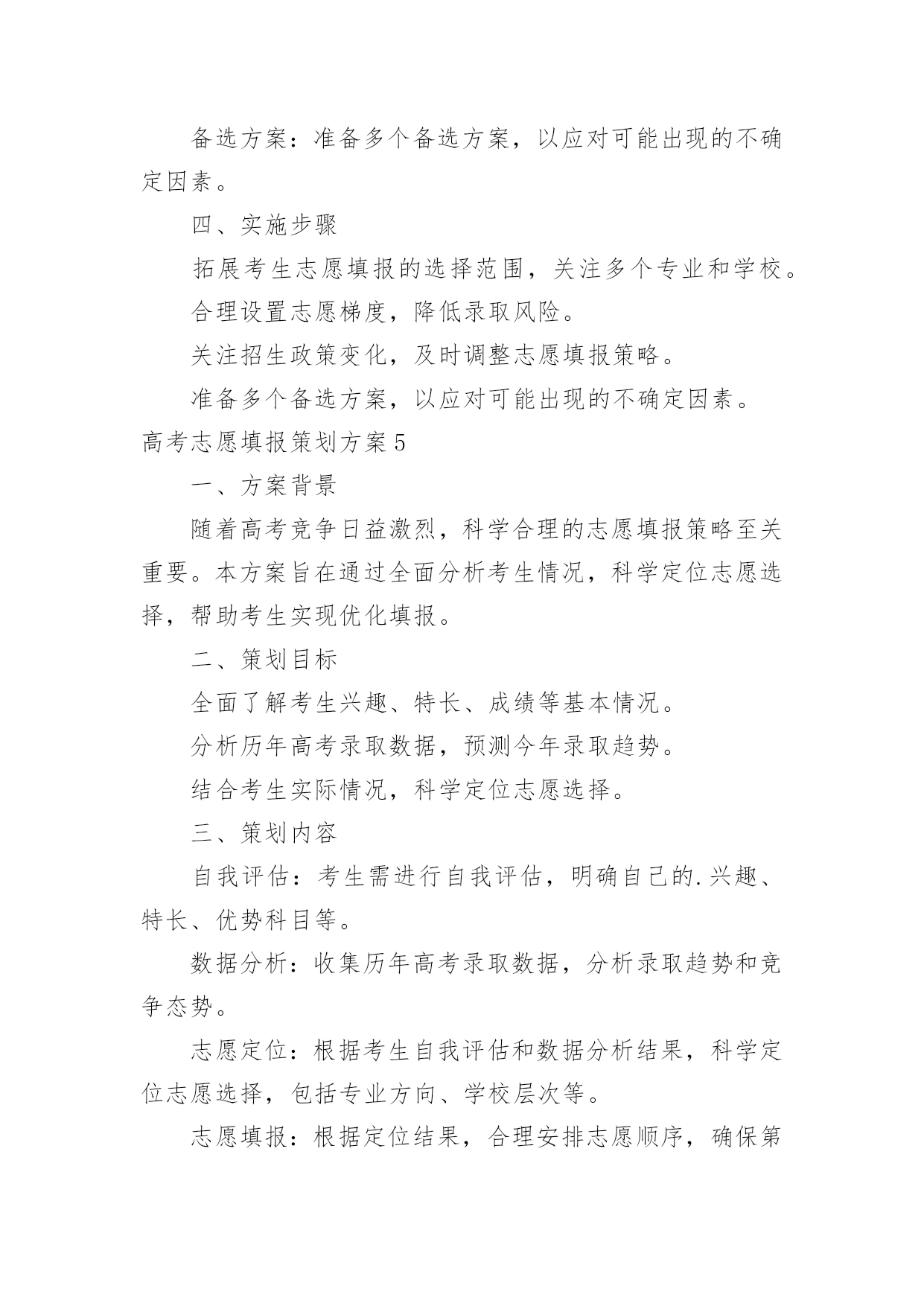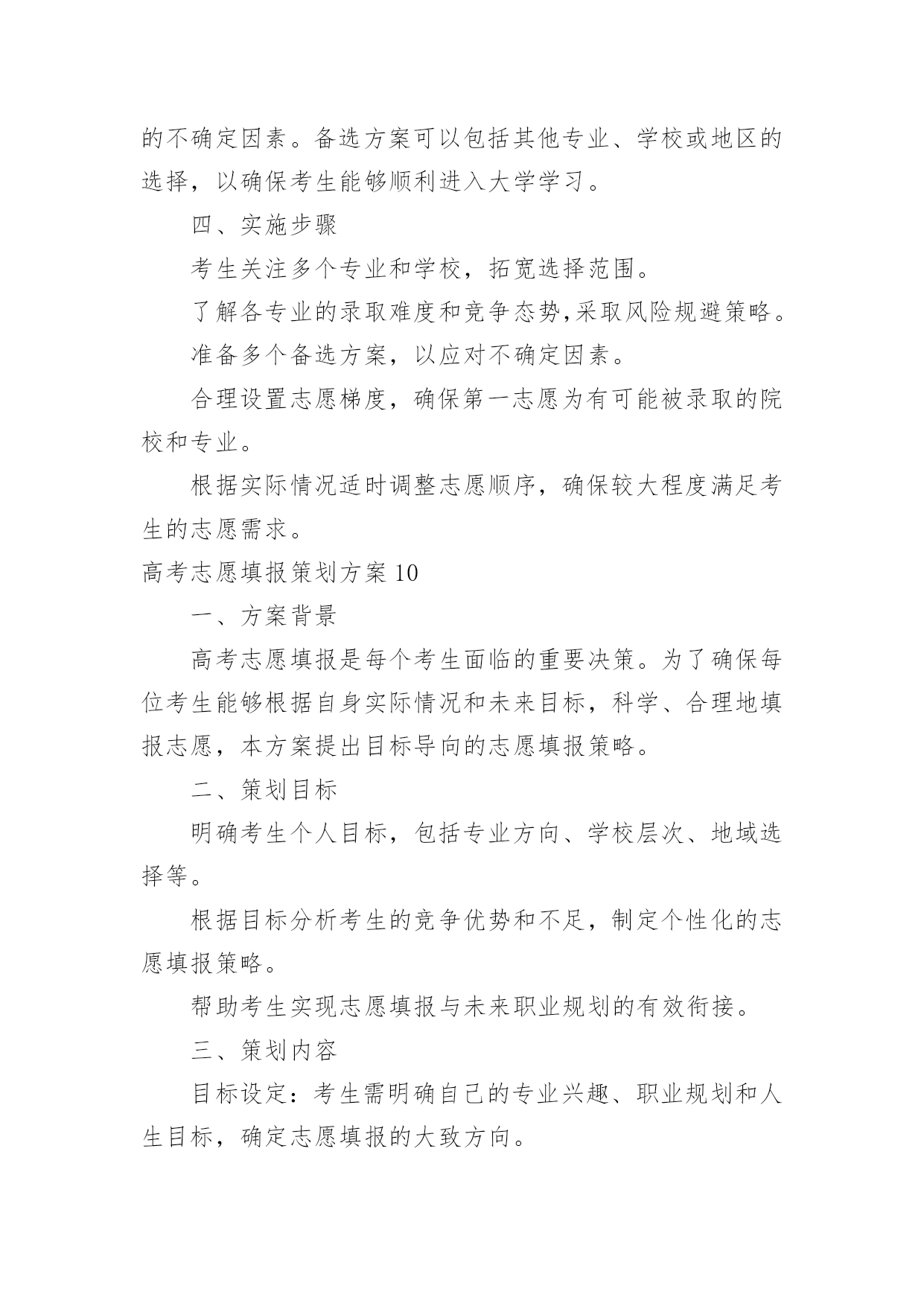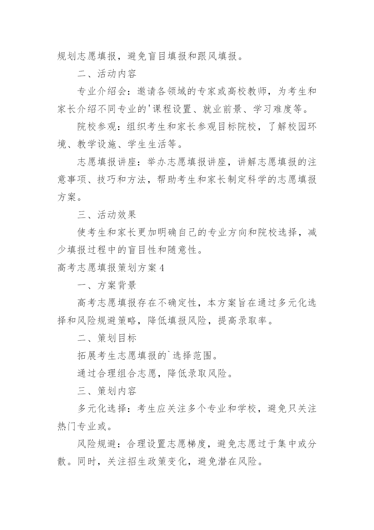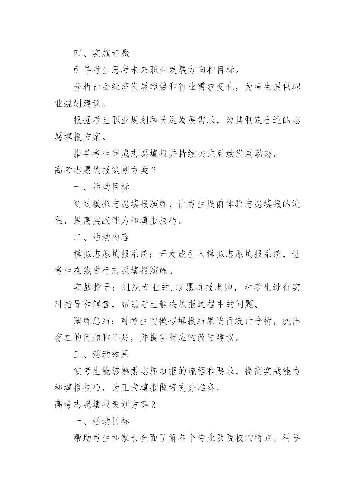 高考志愿填报策划方案高考志愿填报策划方案为了确保我们的努力取得实效,常常需要提前制定一份优秀的方案,方案是有很强可操作性的书面计划。那么制定方案需要注意哪些问题呢?下面是小编精心整理的高考志愿填报策划方案,希望对大家有所帮助。高考志愿填报策划方案1一、方案背景高考志愿填报不仅是选择大学和专业,更是对未来职业规划和长远发展的'决策。本方案旨在通过职业规划与长远发展策略,帮助考生做出更明智的志愿填报选择。二、策划目标引导考生关注未来职业规划和长远发展。结合考生职业规划,为其制定合适的志愿填报方案。三、策划内容职业规划:引导考生思考未来职业发展方向和目标,明确所需专业知识和技能。长远发展:结合社会经济发展趋势和行业需求变化,为考生分析未来职业发展前景和趋势。志愿填报:根据考生职业规划和长远发展需求,为其制定合适的志愿填报方案,包括专业方向、学校层次等。四、实施步骤引导考生思考未来职业发展方向和目标。分析社会经济发展趋势和行业需求变化,为考生提供职业规划建议。根据考生职业规划和长远发展需求,为其制定合适的志愿填报方案。指导考生完成志愿填报并持续关注后续发展动态。高考志愿填报策划方案2一、活动目标通过模拟志愿填报演练,让考生提前体验志愿填报的流程,提高实战能力和填报技巧。二、活动内容模拟志愿填报系统:开发或引入模拟志愿填报系统,让考生在线进行志愿填报演练。实战指导:组织专业的.志愿填报老师,对考生进行实时指导和解答,帮助考生解决填报过程中的问题。演练总结:对考生的模拟填报结果进行统计分析,找出存在的问题和不足,并提供相应的改进建议。三、活动效果使考生能够熟悉志愿填报的流程和要求,提高实战能力和填报技巧,为正式填报做好充分准备。高考志愿填报策划方案3一、活动目标帮助考生和家长全面了解各个专业及院校的特点,科学规划志愿填报,避免盲目填报和跟风填报。二、活动内容专业介绍会:邀请各领域的专家或高校教师,为考生和家长介绍不同专业的'课程设置、就业前景、学习难度等。院校参观:组织考生和家长参观目标院校,了解校园环境、教学设施、学生生活等。志愿填报讲座:举办志愿填报讲座,讲解志愿填报的注意事项、技巧和方法,帮助考生和家长制定科学的志愿填报方案。三、活动效果使考生和家长更加明确自己的专业方向和院校选择,减少填报过程中的盲目性和随意性。高考志愿填报策划方案4一、方案背景高考志愿填报存在不确定性,本方案旨在通过多元化选择和风险规避策略,降低填报风险,提高录取率。二、策划目标拓展考生志愿填报的`选择范围。通过合理组合志愿,降低录取风险。三、策划内容多元化选择:考生应关注多个专业和学校,避免只关注热门专业或。风险规避:合理设置志愿梯度,避免志愿过于集中或分散。同时,关注招生政策变化,避免潜在风险。备选方案:准备多个备选方案,以应对可能出现的不确定因素。四、实施步骤拓展考生志愿填报的选择范围,关注多个专业和学校。合理设置志愿梯度,降低录取风险。关注招生政策变化,及时调整志愿填报策略。准备多个备选方案,以应对可能出现的不确定因素。高考志愿填报策划方案5一、方案背景随着高考竞争日益激烈,科学合理的志愿填报策略至关重要。本方案旨在通过全面分析考生情况,科学定位志愿选择,帮助考生实现优化填报。二、策划目标全面了解考生兴趣、特长、成绩等基本情况。分析历年高考录取数据,预测今年录取趋势。结合考生实际情况,科学定位志愿选择。三、策划内容自我评估:考生需进行自我评估,明确自己的.兴趣、特长、优势科目等。数据分析:收集历年高考录取数据,分析录取趋势和竞争态势。志愿定位:根据考生自我评估和数据分析结果,科学定位志愿选择,包括专业方向、学校层次等。志愿填报:根据定位结果,合理安排志愿顺序,确保第一志愿为有可能被录取的院校和专业。四、实施步骤考生进行自我评估,明确自身情况。收集并分析历年高考录取数据。结合考生实际情况,科学定位志愿选择。合理安排志愿顺序,完成志愿填报。高考志愿填报策划方案6一、活动目标为考生提供个性化的志愿填报指导,帮助考生找到适合自己的专业和院校。二、活动内容职业倾向测试:为考生提供职业倾向测试,帮助考生了解自己的兴趣、特长和适合的职业方向。专业匹配分析:根据考生的测试结果,分析适合考生的专业方向和院校选择,并提供相应的推荐。志愿填报指导:根据考生的具体情况,提供个性化的`志愿填报指导,包括志愿排序、分数预测、风险评估等。三、活动效果使考生能够根据自己的实际情况,选择适合自己的专业和院校,提高志愿填报的针对性和成功率。高考志愿填报策划方案7一、方案背景每个考生的情况都是独特的.,本方案旨在通过个性化定制和精准匹配策略,为考生量身打造适合的志愿填报方案。二、策划目标深入了解考生个人情况,挖掘潜在优势。为考生量身打造适合的志愿填报方案。三、策划内容个性化评估:深入了解