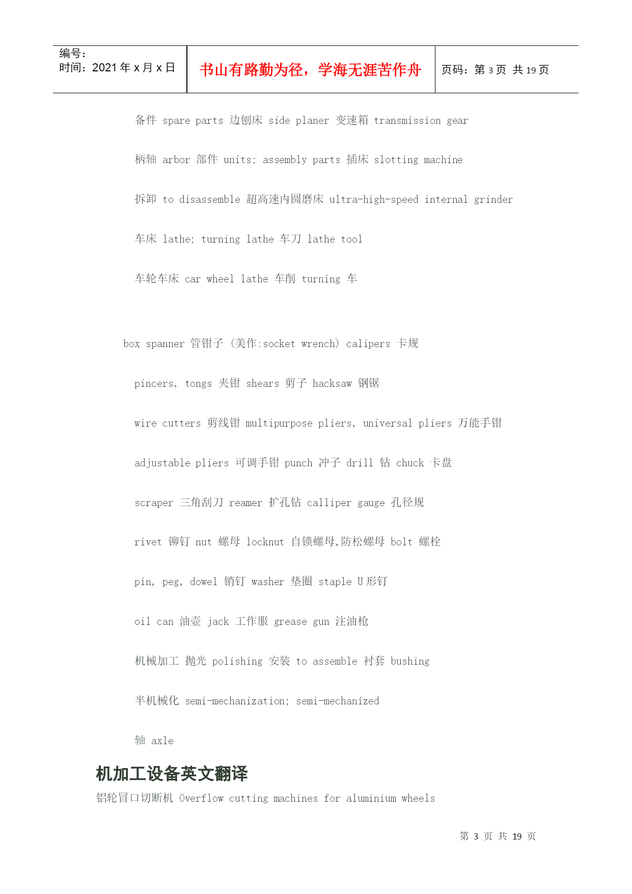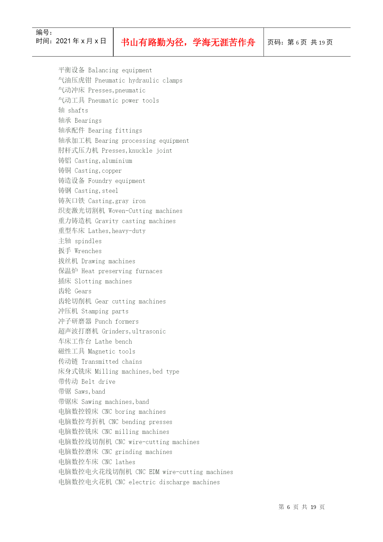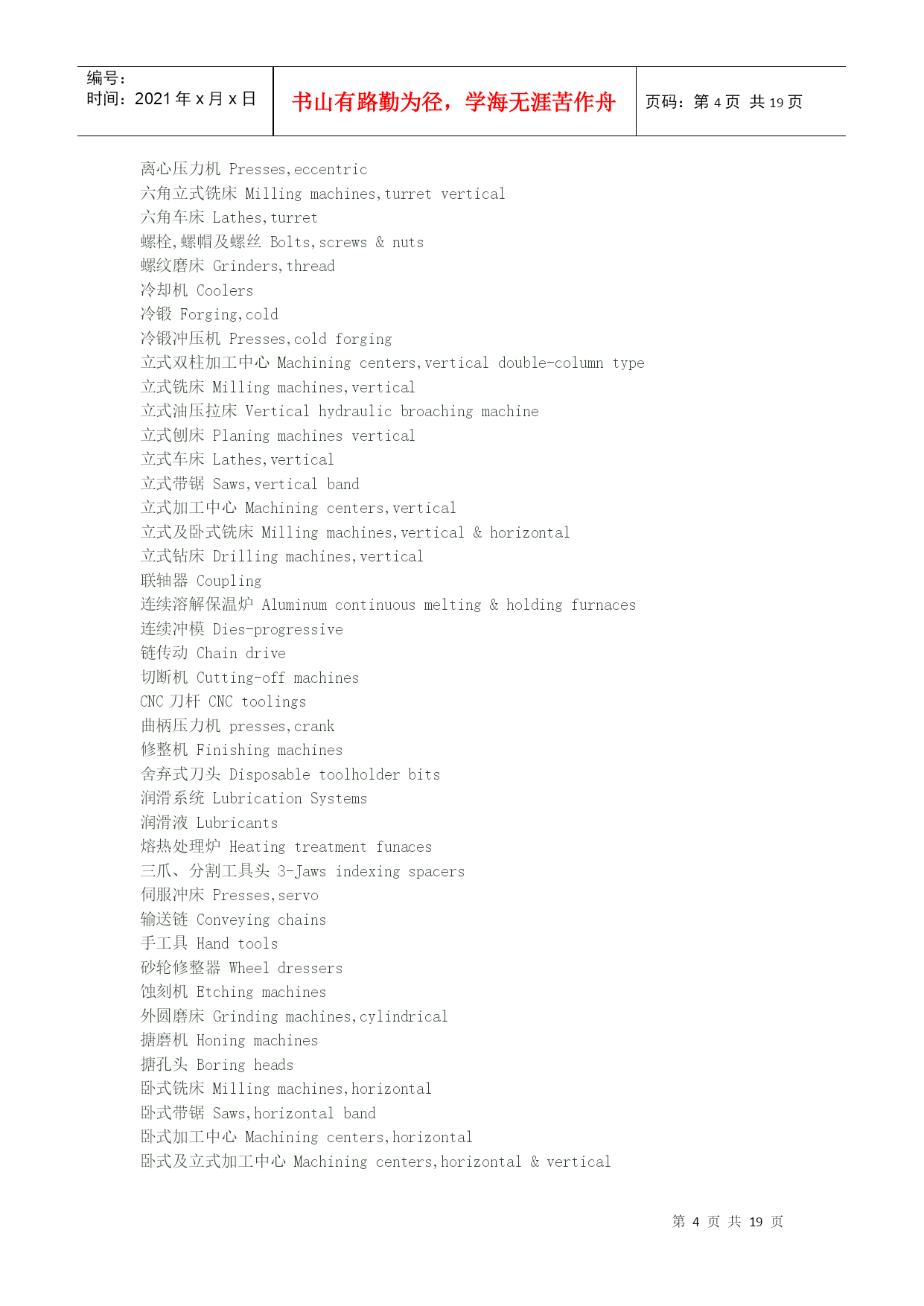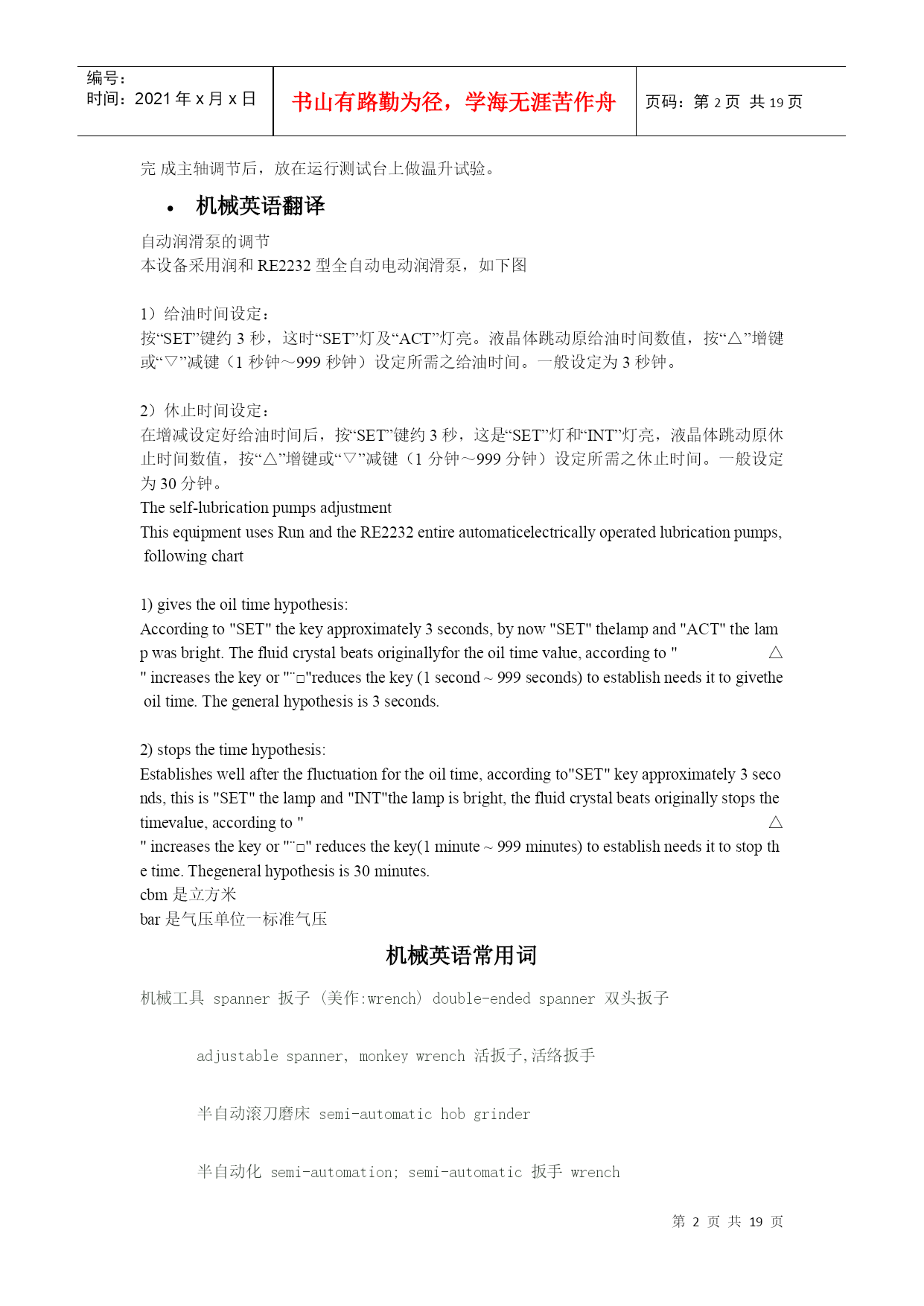编号:时间:2021年x月x日书山有路勤为径,学海无涯苦作舟页码:第PAGE19页共NUMPAGES19页第PAGE\*MERGEFORMAT19页共NUMPAGES\*MERGEFORMAT19页机械英语翻译"angularballbearing"①角接触球HYPERLINK"http://search.china.alibaba.com/selloffer/k-%D6%E1%B3%D0_n-y.html"\t"_blank"轴承“deep-grooveballbearing"②深沟槽轴承"sealingringsensingroller"③托辊密封圈Spindleorientationdogseatinstallation主轴定位卡爪位置安装Spindleshaftfixthe10x8x25doubleroundkey,theninstalltheorientationdogseat(block),thenfixthesettingscrew.主轴固定10x8x25双向圆键,然后安装定位卡爪座(定位块),再固定定位HYPERLINK"http://search.china.alibaba.com/selloffer/k-%C2%DD%B6%A4_n-y.html"\t"_blank"螺钉。Drawbarinstallment连接杆安装1.SmearthegreaseontheSpringDisc.涂油脂在弹簧盘上。2.Collet(normallyis4-petal)fixesonthedrawbar套筒(正常情况是4片)固定在连接杆上。3.Put3pcs(asoneteam)ofSpringDisctothebottomofdrawbarandtheconcavefacedown(outside),thenusethe3pcsasoneset,andtheeachset(3pcs)backtobackandfacetofaceputtheSpringdisctothedrawbar.Thetotalis114pcs(normally114pcs,butsomeofspindleisdifferent).将3个为一组,凹面向下(向外),每组HYPERLINK"http://search.china.alibaba.com/selloffer/k-%B5%AF%BB%C9_n-y.html"\t"_blank"弹簧圆盘背对背或面对面紧挨着放到连接杆底部。4.Afterfinishedthedrawbarspringdiscalignmentthenfixthespringdiscstopper,andturninletthespringdisctotallengthtothestandardlength(114pcsabout277mm),thenthedrawbartopfixtheM16x1.5nut.连接杆弹簧圆盘调整成一直线,然后固定弹簧圆盘的止动块,使之总长为标准长度(114个约277mm),再在连接杆顶部固定M16x1.5的HYPERLINK"http://search.china.alibaba.com/selloffer/k-%C2%DD%C4%B8_n-y.html"\t"_blank"螺母。Spindle'stensionforce(pull/pushforce)&Runoutinspectionandtest主轴张力(拉/推力)、跳动检验以及试验1.Putinthedrawbartothespindleshaftcenterhole.将连接杆放在主轴中心孔。3.Putthespindleontensionforceplatform,andtestthespindletensionforcewithtensionmeter(guage)andthetensionforceabout1000±100kgs.将主轴放在张力HYPERLINK"http://search.china.alibaba.com/selloffer/k-%C6%BD%CC%A8_n-y.html"\t"_blank"平台上,用张力计测试主轴张力,张力约在1000±100kgs4.Ifthetensionforcetoolargeortoosmallthatcanadjustthedrawbar'slength.(FV1200/1500BT-50thetensionforceis1500kgs±100kgs)如果张力太大或太小,可调节连接杆的长度。5.Finishabovejobthenfixthenut.完成以下工作,固定螺母。6.Clampthe300mmtest