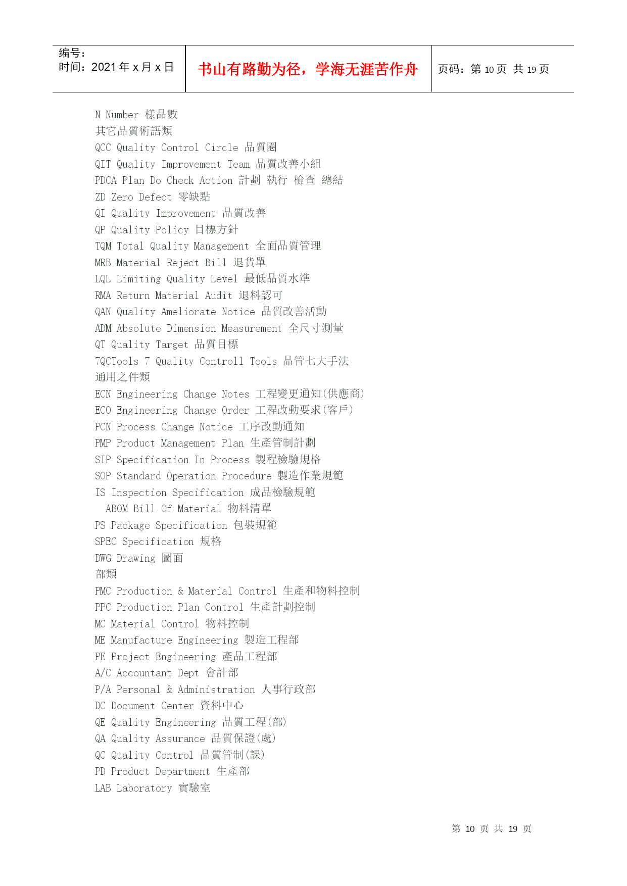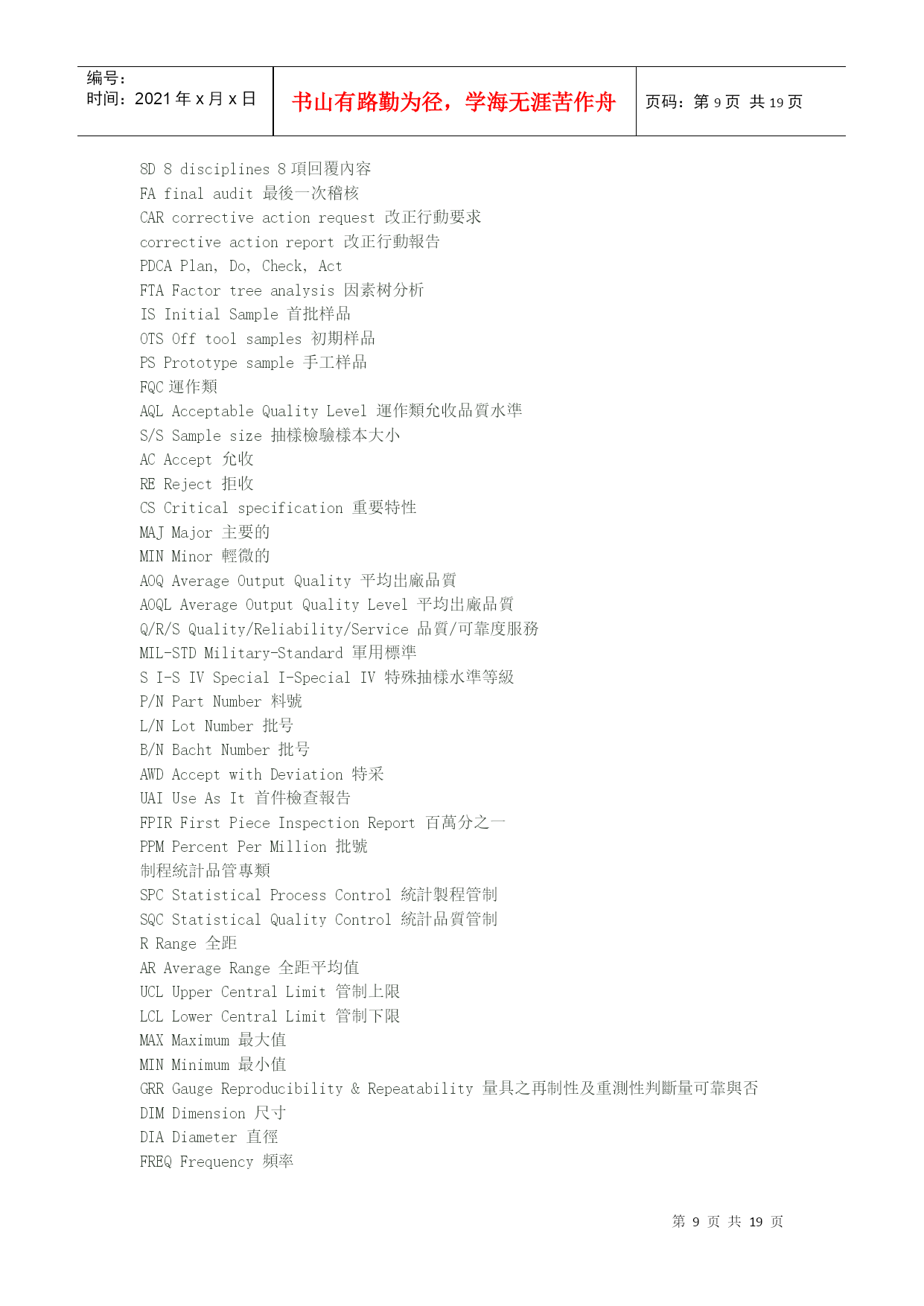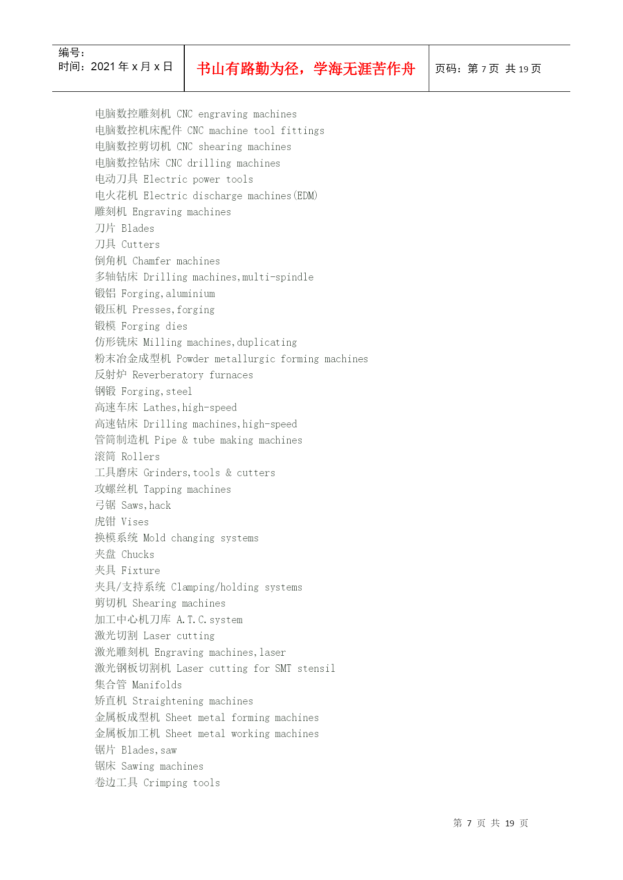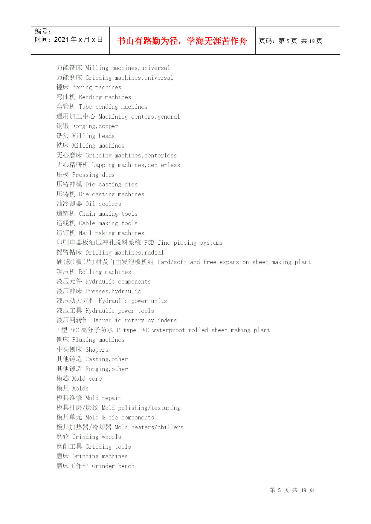 编号:时间:2021年x月x日书山有路勤为径,学海无涯苦作舟页码:第PAGE19页共NUMPAGES19页第PAGE\*MERGEFORMAT19页共NUMPAGES\*MERGEFORMAT19页机械英语翻译"angularballbearing"①角接触球HYPERLINK"http://search.china.alibaba.com/selloffer/k-%D6%E1%B3%D0_n-y.html"\t"_blank"轴承“deep-grooveballbearing"②深沟槽轴承"sealingringsensingroller"③托辊密封圈Spindleorientationdogseatinstallation主轴定位卡爪位置安装Spindleshaftfixthe10x8x25doubleroundkey,theninstalltheorientationdogseat(block),thenfixthesettingscrew.主轴固定10x8x25双向圆键,然后安装定位卡爪座(定位块),再固定定位HYPERLINK"http://search.china.alibaba.com/selloffer/k-%C2%DD%B6%A4_n-y.html"\t"_blank"螺钉。Drawbarinstallment连接杆安装1.SmearthegreaseontheSpringDisc.涂油脂在弹簧盘上。2.Collet(normallyis4-petal)fixesonthedrawbar套筒(正常情况是4片)固定在连接杆上。3.Put3pcs(asoneteam)ofSpringDisctothebottomofdrawbarandtheconcavefacedown(outside),thenusethe3pcsasoneset,andtheeachset(3pcs)backtobackandfacetofaceputtheSpringdisctothedrawbar.Thetotalis114pcs(normally114pcs,butsomeofspindleisdifferent).将3个为一组,凹面向下(向外),每组HYPERLINK"http://search.china.alibaba.com/selloffer/k-%B5%AF%BB%C9_n-y.html"\t"_blank"弹簧圆盘背对背或面对面紧挨着放到连接杆底部。4.Afterfinishedthedrawbarspringdiscalignmentthenfixthespringdiscstopper,andturninletthespringdisctotallengthtothestandardlength(114pcsabout277mm),thenthedrawbartopfixtheM16x1.5nut.连接杆弹簧圆盘调整成一直线,然后固定弹簧圆盘的止动块,使之总长为标准长度(114个约277mm),再在连接杆顶部固定M16x1.5的HYPERLINK"http://search.china.alibaba.com/selloffer/k-%C2%DD%C4%B8_n-y.html"\t"_blank"螺母。Spindle'stensionforce(pull/pushforce)&Runoutinspectionandtest主轴张力(拉/推力)、跳动检验以及试验1.Putinthedrawbartothespindleshaftcenterhole.将连接杆放在主轴中心孔。3.Putthespindleontensionforceplatform,andtestthespindletensionforcewithtensionmeter(guage)andthetensionforceabout1000±100kgs.将主轴放在张力HYPERLINK"http://search.china.alibaba.com/selloffer/k-%C6%BD%CC%A8_n-y.html"\t"_blank"平台上,用张力计测试主轴张力,张力约在1000±100kgs4.Ifthetensionforcetoolargeortoosmallthatcanadjustthedrawbar'slength.(FV1200/1500BT-50thetensionforceis1500kgs±100kgs)如果张力太大或太小,可调节连接杆的长度。5.Finishabovejobthenfixthenut.完成以下工作,固定螺母。6.Clampthe300mmtest