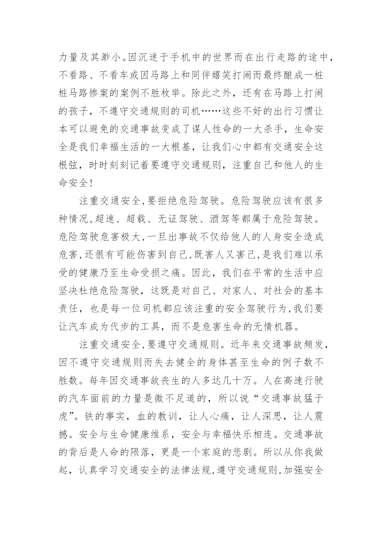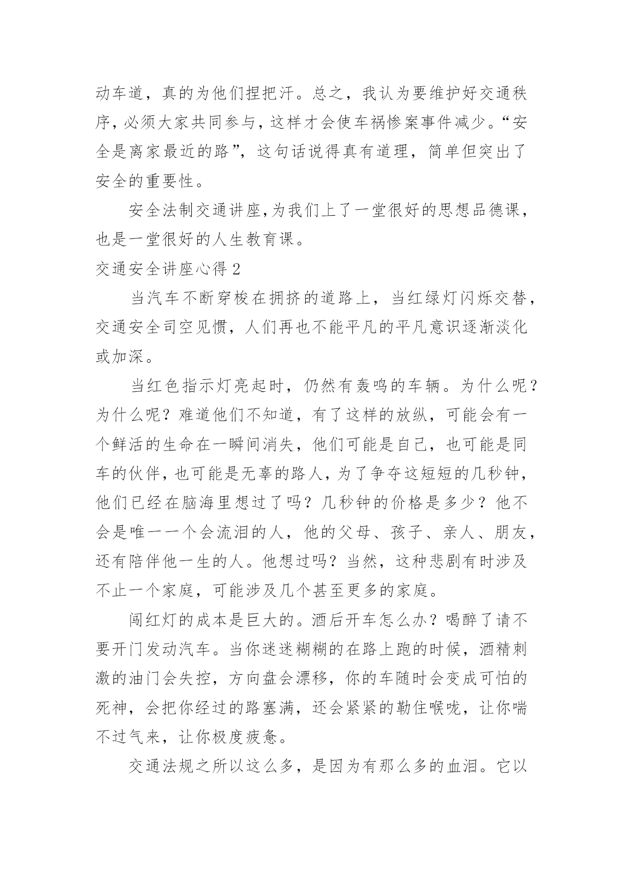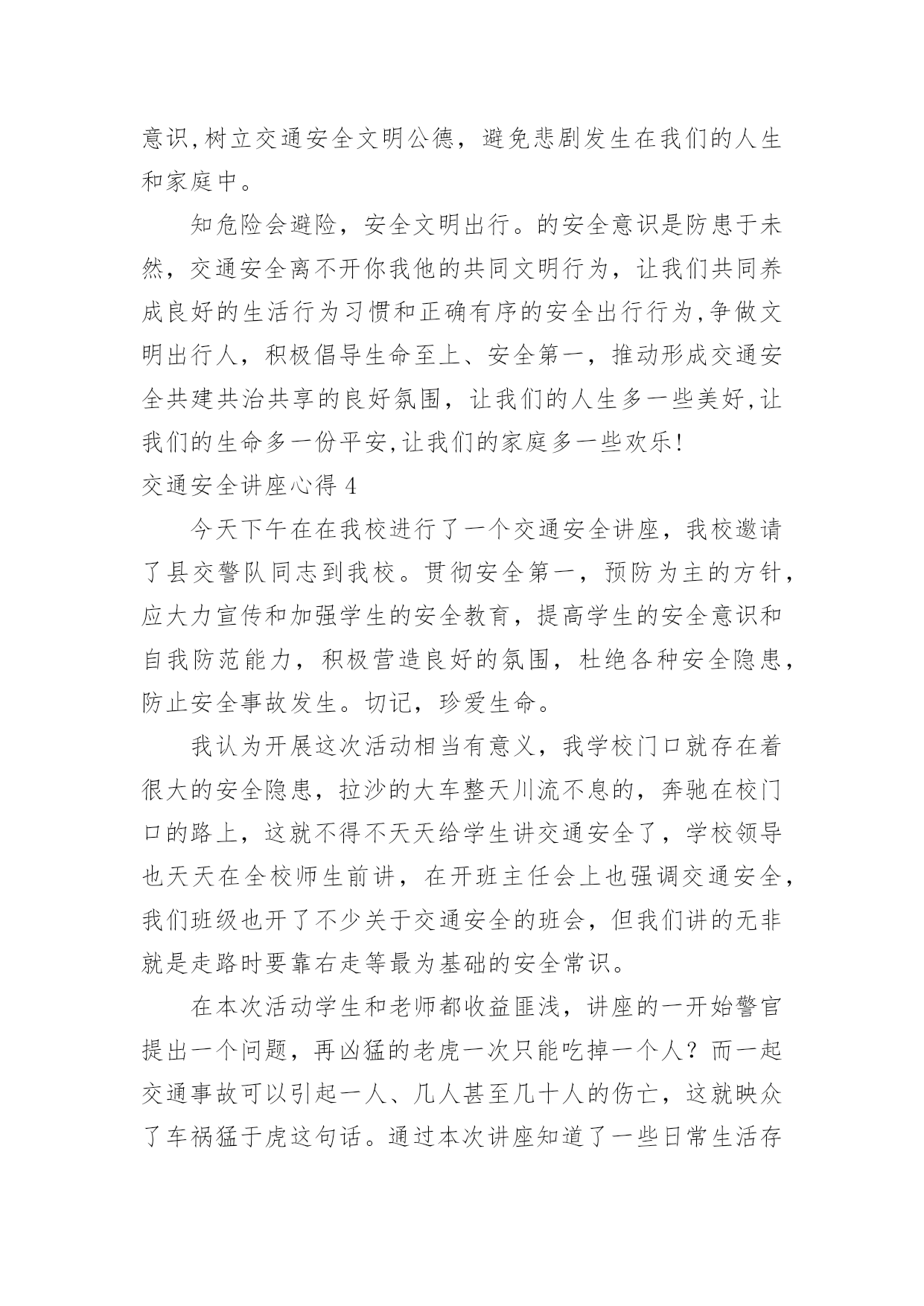 交通安全讲座心得交通安全讲座心得15篇从某件事情上得到收获以后,可以寻思将其写进心得体会中,这样就可以总结出具体的经验和想法。很多人都十分头疼怎么写一篇精彩的心得体会,以下是小编为大家整理的交通安全讲座心得,仅供参考,欢迎大家阅读。交通安全讲座心得1对于我们学生来说,了解交通和法律常识是非常必须的。为此,在这次新学期军训期间学校专门举行了有关这方面的讲座,让我受益匪浅。首先,老师就青少年犯罪的问题为我们做了详细的报告,报告通过真实的案例深入浅出的分析了青少年犯罪的原因,并提醒我们青年学生要注意自身素质的培养和提高,要学法用法,做一个对社会有用的人。在众多案例中对我触动最大的是一个同龄人的故事。这位青少年不学无术,游手好闲,一而再,再而三的犯错却不知悔改,最终走进监狱毁了自己得一生……听了这个故事,我想受到了很大的教育。其实,在我们身边也有许多类似的情况,有些学生品行不端正,在校不尊重老师,与老师顶嘴;在家不尊重父母,嫌父母唠叨;在学习上不够用心,打架斗殴;在生活上成帮结派,到处惹事生非……居然还认为自己的行为是对的,或者觉得这些都是小错误小问题,其实不然,前人说过“勿以善小而不为,毋以恶小而为之”,正是不注意在学习生活上细微处的反省和改正,许多人才一步步走上犯罪的道路。我们青少年心智还未成熟,对社会还没有较深入的了解和认识,对社会上的一些诱惑还没有一种较强的判断能力和抵抗力,所以犯错是难免的,但必须认识到自己的过错,并及时改正,下不为例。所以我们能够做的就是学好文化知识,提高自身修养。因为学好文化知识能赋予我们纯洁的心,自身修养的提高,能使我们更有内涵。我们要从故事中吸取教训,坚定自己的信念,勇敢向正确的方向前进。接着,老师又为我们做了交通安全方面的教育。其实关于交通安全方面的讲座我也听过不少,但这次因其新颖别致的形式给我留下了较以往更深的印象。老师在演讲中通过具体详实的数字形象客观地为我们分析了交通安全的现状和危害,比如,一战和二战中的死亡人数和死于车祸的人数的对比;汶川地震的死亡人数和车祸的人数对比等等,对比鲜明,触目惊心,让我们深刻认识到了交通安全的重要性。在讲座中老师还采用了互动的方式,让我们参与到活动过程中。如在讲座中,老师让我们的学生在事先画好的斑马线上按自己认为正确的方式演示行走路线,但是我们没有一个走对的。于是老师就给我们实地演示了一遍正确的走法。我是个走读生,虽然已经上高中了,但每次上学时家里的人还是会很担心。临走时总不忘说一句“路上小心”。虽然我骑车的时候总是小心翼翼,认真地遵守交通规则,但是总有学生喜欢一大帮人并排骑车,霸着整个人行道,甚至为了赶时间骑上机动车道,真的为他们捏把汗。总之,我认为要维护好交通秩序,必须大家共同参与,这样才会使车祸惨案事件减少。“安全是离家最近的路”,这句话说得真有道理,简单但突出了安全的重要性。安全法制交通讲座,为我们上了一堂很好的思想品德课,也是一堂很好的人生教育课。交通安全讲座心得2当汽车不断穿梭在拥挤的道路上,当红绿灯闪烁交替,交通安全司空见惯,人们再也不能平凡的平凡意识逐渐淡化或加深。当红色指示灯亮起时,仍然有轰鸣的车辆。为什么呢?为什么呢?难道他们不知道,有了这样的放纵,可能会有一个鲜活的生命在一瞬间消失,他们可能是自己,也可能是同车的伙伴,也可能是无辜的路人,为了争夺这短短的几秒钟,他们已经在脑海里想过了吗?几秒钟的价格是多少?他不会是唯一一个会流泪的人,他的父母、孩子、亲人、朋友,还有陪伴他一生的人。他想过吗?当然,这种悲剧有时涉及不止一个家庭,可能涉及几个甚至更多的家庭。闯红灯的成本是巨大的。酒后开车怎么办?喝醉了请不要开门发动汽车。当你迷迷糊糊的在路上跑的时候,酒精刺激的油门会失控,方向盘会漂移,你的车随时会变成可怕的死神,会把你经过的路塞满,还会紧紧的勒住喉咙,让你喘不过气来,让你极度疲惫。交通法规之所以这么多,是因为有那么多的血泪。它以多种形式出现在你我身边,如文字、符号、图片、信号等。这样我们无论走到哪里都能看到,每个人都可以谈论遵守交通法规到极致。但现实中呢?请克制这种言语上的满足,多使用自己的行动。当我们走在路上发动汽车时,我们认真地对自己说:请遵守交通规则!让我们携起手来,把交通安全刻在我们最深处,永远为我们的行动买单。交通安全——你的心和我的心,让我们停止呻吟和痛苦,建设一个交通安全的美丽星球,最美的星球。交通安全讲座心得312月2日是第x个“全国交通安全日”,公安部与中央网信办、中央文明办、教育部、司法部、交通运输部、应急管理部、共青团中央等八部门共同开展了以“知危险会避险、安全文明出行”为主题的系列活动,意在提醒每一位交通参与者,既要遵守法律法规,文明参与交通,又要了解安全隐患,掌握防护技能,确保自己和他人的生命安全,共同营造安全、文明