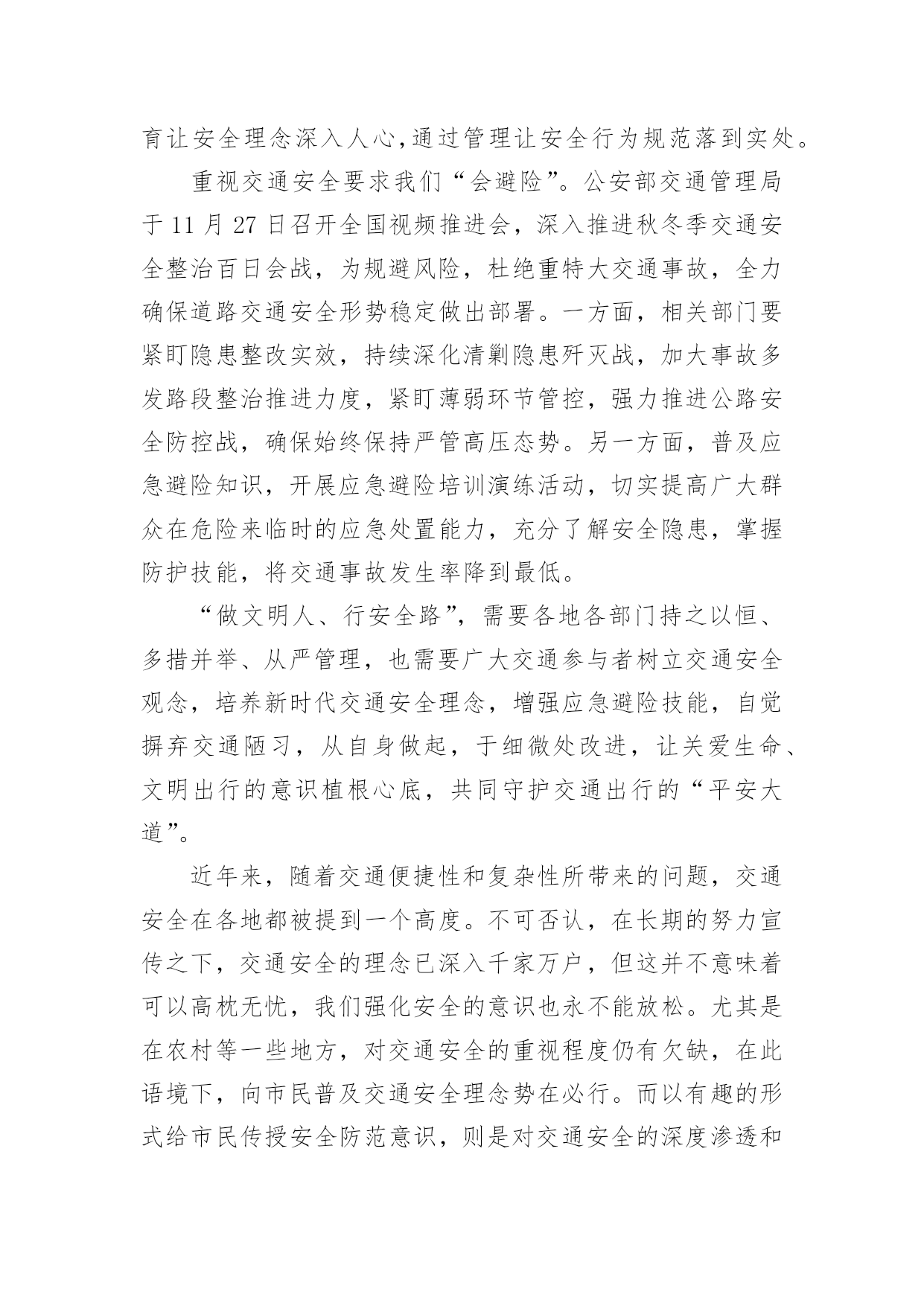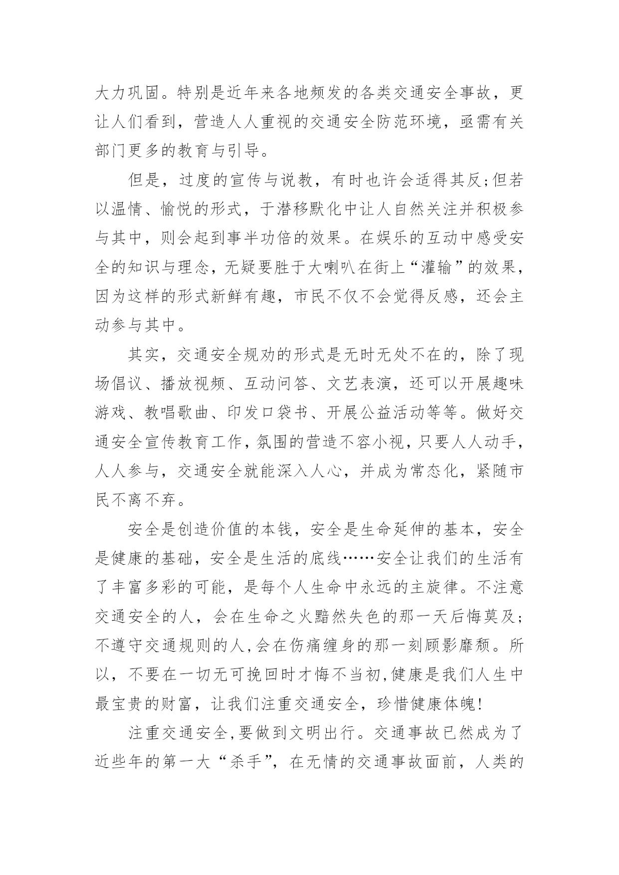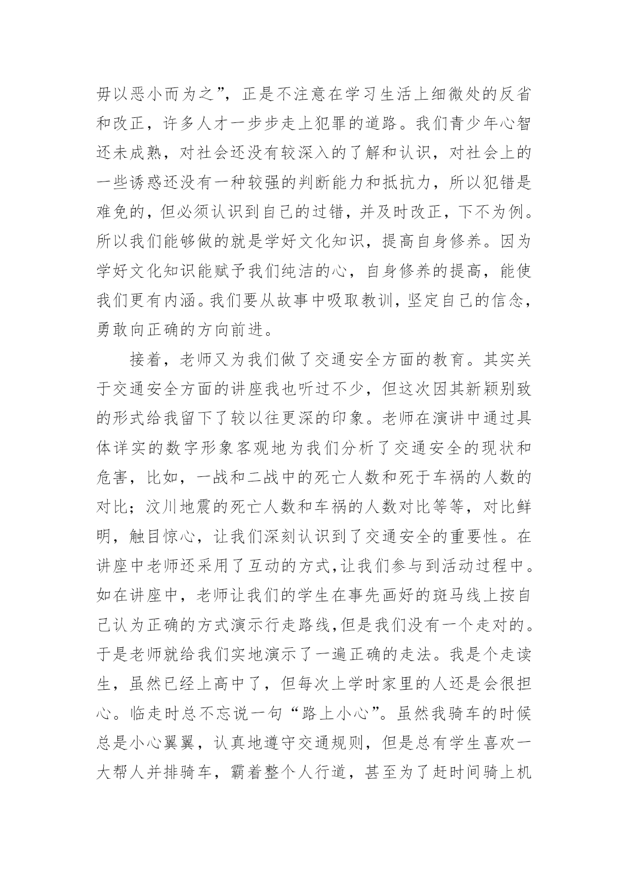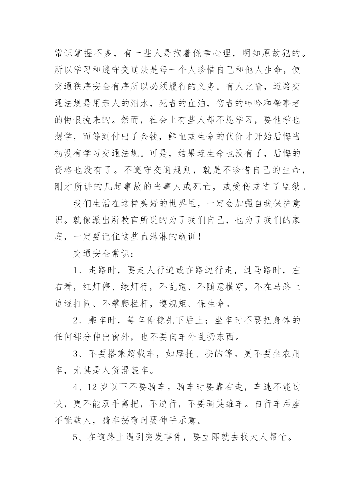 交通安全讲座心得交通安全讲座心得15篇从某件事情上得到收获以后,可以寻思将其写进心得体会中,这样就可以总结出具体的经验和想法。很多人都十分头疼怎么写一篇精彩的心得体会,以下是小编为大家整理的交通安全讲座心得,仅供参考,欢迎大家阅读。交通安全讲座心得1对于我们学生来说,了解交通和法律常识是非常必须的。为此,在这次新学期军训期间学校专门举行了有关这方面的讲座,让我受益匪浅。首先,老师就青少年犯罪的问题为我们做了详细的报告,报告通过真实的案例深入浅出的分析了青少年犯罪的原因,并提醒我们青年学生要注意自身素质的培养和提高,要学法用法,做一个对社会有用的人。在众多案例中对我触动最大的是一个同龄人的故事。这位青少年不学无术,游手好闲,一而再,再而三的犯错却不知悔改,最终走进监狱毁了自己得一生……听了这个故事,我想受到了很大的教育。其实,在我们身边也有许多类似的情况,有些学生品行不端正,在校不尊重老师,与老师顶嘴;在家不尊重父母,嫌父母唠叨;在学习上不够用心,打架斗殴;在生活上成帮结派,到处惹事生非……居然还认为自己的行为是对的,或者觉得这些都是小错误小问题,其实不然,前人说过“勿以善小而不为,毋以恶小而为之”,正是不注意在学习生活上细微处的反省和改正,许多人才一步步走上犯罪的道路。我们青少年心智还未成熟,对社会还没有较深入的了解和认识,对社会上的一些诱惑还没有一种较强的判断能力和抵抗力,所以犯错是难免的,但必须认识到自己的过错,并及时改正,下不为例。所以我们能够做的就是学好文化知识,提高自身修养。因为学好文化知识能赋予我们纯洁的心,自身修养的提高,能使我们更有内涵。我们要从故事中吸取教训,坚定自己的信念,勇敢向正确的方向前进。接着,老师又为我们做了交通安全方面的教育。其实关于交通安全方面的讲座我也听过不少,但这次因其新颖别致的形式给我留下了较以往更深的印象。老师在演讲中通过具体详实的数字形象客观地为我们分析了交通安全的现状和危害,比如,一战和二战中的死亡人数和死于车祸的人数的对比;汶川地震的死亡人数和车祸的人数对比等等,对比鲜明,触目惊心,让我们深刻认识到了交通安全的重要性。在讲座中老师还采用了互动的方式,让我们参与到活动过程中。如在讲座中,老师让我们的学生在事先画好的斑马线上按自己认为正确的方式演示行走路线,但是我们没有一个走对的。于是老师就给我们实地演示了一遍正确的走法。我是个走读生,虽然已经上高中了,但每次上学时家里的人还是会很担心。临走时总不忘说一句“路上小心”。虽然我骑车的时候总是小心翼翼,认真地遵守交通规则,但是总有学生喜欢一大帮人并排骑车,霸着整个人行道,甚至为了赶时间骑上机动车道,真的为他们捏把汗。总之,我认为要维护好交通秩序,必须大家共同参与,这样才会使车祸惨案事件减少。“安全是离家最近的路”,这句话说得真有道理,简单但突出了安全的重要性。安全法制交通讲座,为我们上了一堂很好的思想品德课,也是一堂很好的人生教育课。交通安全讲座心得2当汽车不断穿梭在拥挤的道路上,当红绿灯闪烁交替,交通安全司空见惯,人们再也不能平凡的平凡意识逐渐淡化或加深。当红色指示灯亮起时,仍然有轰鸣的车辆。为什么呢?为什么呢?难道他们不知道,有了这样的放纵,可能会有一个鲜活的生命在一瞬间消失,他们可能是自己,也可能是同车的伙伴,也可能是无辜的路人,为了争夺这短短的几秒钟,他们已经在脑海里想过了吗?几秒钟的价格是多少?他不会是唯一一个会流泪的人,他的父母、孩子、亲人、朋友,还有陪伴他一生的人。他想过吗?当然,这种悲剧有时涉及不止一个家庭,可能涉及几个甚至更多的家庭。闯红灯的成本是巨大的。酒后开车怎么办?喝醉了请不要开门发动汽车。当你迷迷糊糊的在路上跑的时候,酒精刺激的油门会失控,方向盘会漂移,你的车随时会变成可怕的死神,会把你经过的路塞满,还会紧紧的勒住喉咙,让你喘不过气来,让你极度疲惫。交通法规之所以这么多,是因为有那么多的血泪。它以多种形式出现在你我身边,如文字、符号、图片、信号等。这样我们无论走到哪里都能看到,每个人都可以谈论遵守交通法规到极致。但现实中呢?请克制这种言语上的满足,多使用自己的行动。当我们走在路上发动汽车时,我们认真地对自己说:请遵守交通规则!让我们携起手来,把交通安全刻在我们最深处,永远为我们的行动买单。交通安全——你的心和我的心,让我们停止呻吟和痛苦,建设一个交通安全的美丽星球,最美的星球。交通安全讲座心得312月2日是第x个“全国交通安全日”,公安部与中央网信办、中央文明办、教育部、司法部、交通运输部、应急管理部、共青团中央等八部门共同开展了以“知危险会避险、安全文明出行”为主题的系列活动,意在提醒每一位交通参与者,既要遵守法律法规,文明参与交通,又要了解安全隐患,掌握防护技能,确保自己和他人的生命安全,共同营造安全、文明