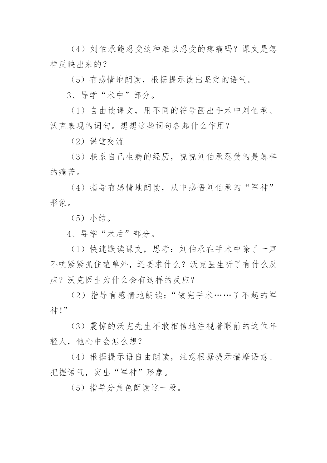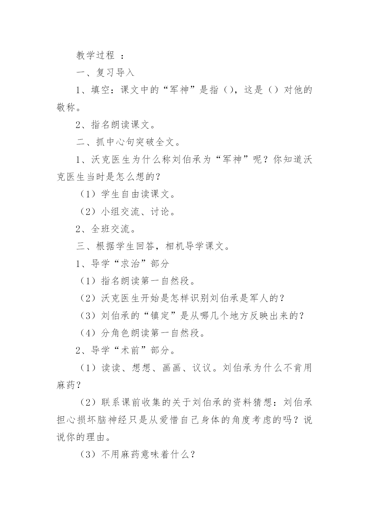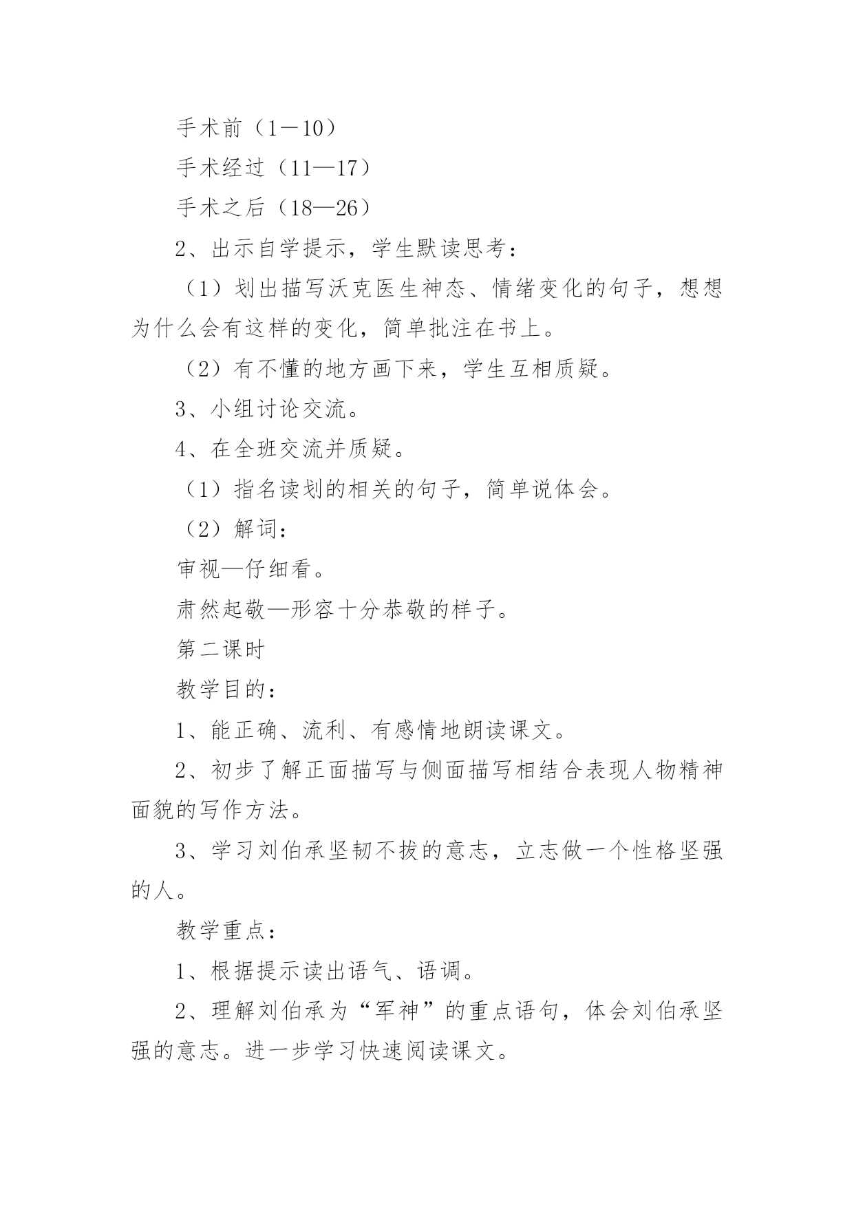 《军神》的教学设计第一课时教学目的:1、学会本课的13个生字,认识3个生字。能够正确读写下列词语:年龄、土匪、拒绝、麻醉剂、施行、勉强、过奖、诊所、惊疑、从容镇定、目光柔和、肃然起敬。2、用比较快的速度默读课文,培养良好的阅读习惯。教学重点:学会本课生字新词,用比较快的速度默读课文,理清文章思路。教学过程:一、检查预习1、出示本课生字,读一读,并组词。沃刘龄匪拒醉剂施哼晕勉堪承2、学生互相说说易错的字:容易少横的字:龄醉容易多横的字:哼注意字的笔顺:匪二、谈话导入新课军神,好响亮、好威风的称呼,为什么要称他为军神呢?用比较快的速度默读课文,想想课文讲了一件什么事?1、指名读课文,思考文章按怎样的顺序来叙述事情的?板书:手术前(1-10)手术经过(11—17)手术之后(18—26)2、出示自学提示,学生默读思考:(1)划出描写沃克医生神态、情绪变化的句子,想想为什么会有这样的变化,简单批注在书上。(2)有不懂的地方画下来,学生互相质疑。3、小组讨论交流。4、在全班交流并质疑。(1)指名读划的相关的句子,简单说体会。(2)解词:审视—仔细看。肃然起敬—形容十分恭敬的样子。第二课时教学目的:1、能正确、流利、有感情地朗读课文。2、初步了解正面描写与侧面描写相结合表现人物精神面貌的写作方法。3、学习刘伯承坚韧不拔的意志,立志做一个性格坚强的人。教学重点:1、根据提示读出语气、语调。2、理解刘伯承为“军神”的重点语句,体会刘伯承坚强的意志。进一步学习快速阅读课文。教学过程:一、复习导入1、填空:课文中的“军神”是指(),这是()对他的敬称。2、指名朗读课文。二、抓中心句突破全文。1、沃克医生为什么称刘伯承为“军神”呢?你知道沃克医生当时是怎么想的?(1)学生自由读课文。(2)小组交流、讨论。2、全班交流。三、根据学生回答,相机导学课文。1、导学“求治”部分(1)指名朗读第一自然段。(2)沃克医生开始是怎样识别刘伯承是军人的?(3)刘伯承的“镇定”是从哪几个地方反映出来的?(4)分角色朗读第一自然段。2、导学“术前”部分。(1)读读、想想、画画、议议。刘伯承为什么不肯用麻药?(2)联系课前收集的关于刘伯承的资料猜想:刘伯承担心损坏脑神经只是从爱惜自己身体的角度考虑的吗?说说你的理由。(3)不用麻药意味着什么?(4)刘伯承能忍受这种难以忍受的疼痛吗?课文是怎样反映出来的?(5)有感情地朗读,根据提示读出坚定的语气。3、导学“术中”部分。(1)自由读课文,用不同的符号画出手术中刘伯承、沃克表现的词句。想想这些词句各起什么作用?(2)课堂交流(3)联系自己生病的经历,说说刘伯承忍受的是怎样的痛苦。(4)指导有感情地朗读,从中感悟刘伯承的“军神”形象。(5)小结。4、导学“术后”部分。(1)快速默读课文,思考:刘伯承在手术中除了一声不吭紧紧抓住垫单外,还要求什么?沃克医生听了有什么反应?沃克医生为什么会有这样的反应?(2)指导有感情地朗读:“做完手术……了不起的军神!”(3)震惊的沃克先生不敢相信地注视着眼前的这位年轻人,他心中会怎么想?(4)根据提示语自由朗读,注意根据提示揣摩语意、把握语气,突出“军神”形象。(5)指导分角色朗读这一段。