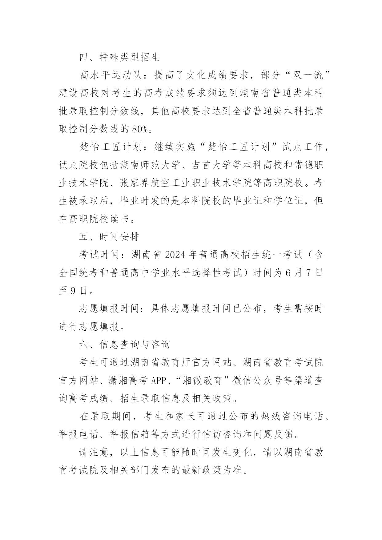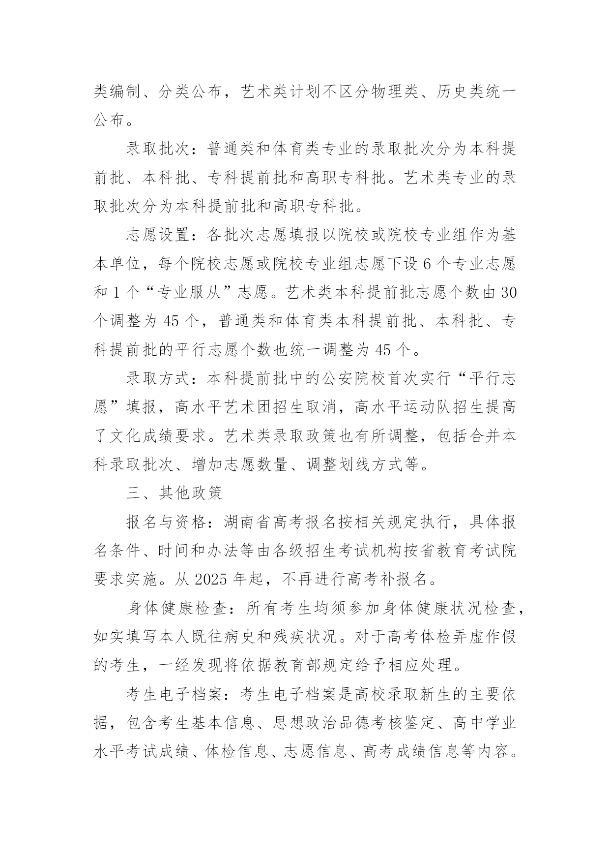 湖南最新高考政策湖南最新高考政策我国处于一个利益分化的社会转型时期,各群体的利益矛盾十分突出。而公共政策过程就是不断整合利益的过程。我国的高考政策是影响千家万户的一项公共教育政策。快来看看吧,下面是阳光网小编为你整理的湖南最新高考政策内容,希望对你有帮助。一、考试模式与科目考试模式:湖南省普通高校招生考试继续采用“3+1+2”模式。其中,“3”为语文、数学、外语(含英语、俄语、日语、法语、德语、西班牙语)3门统考科目,由全国统一命题;“1”为首选科目,从物理、历史2门科目中选择1门;“2”为再选科目,从思想政治、地理、化学、生物学4门科目中选择2门,均由湖南省自主命题。科目分值:考生高考文化总成绩满分为750分。其中,3门统考科目每科满分150分,直接以卷面原始分数计入高考总成绩;3门选考科目每科满分100分,首选科目直接以卷面原始分数计入高考总成绩,再选科目以转换后的分数计入高考总成绩。二、招生与录取招生类型:湖南省普通高校招生专业及计划分为普通类(含不组织专业考试的艺术类专业)、体育类和艺术类(组织专业考试的艺术类专业)。招生计划按物理类、历史类分类编制、分类公布,艺术类计划不区分物理类、历史类统一公布。录取批次:普通类和体育类专业的录取批次分为本科提前批、本科批、专科提前批和高职专科批。艺术类专业的录取批次分为本科提前批和高职专科批。志愿设置:各批次志愿填报以院校或院校专业组作为基本单位,每个院校志愿或院校专业组志愿下设6个专业志愿和1个“专业服从”志愿。艺术类本科提前批志愿个数由30个调整为45个,普通类和体育类本科提前批、本科批、专科提前批的平行志愿个数也统一调整为45个。录取方式:本科提前批中的公安院校首次实行“平行志愿”填报,高水平艺术团招生取消,高水平运动队招生提高了文化成绩要求。艺术类录取政策也有所调整,包括合并本科录取批次、增加志愿数量、调整划线方式等。三、其他政策报名与资格:湖南省高考报名按相关规定执行,具体报名条件、时间和办法等由各级招生考试机构按省教育考试院要求实施。从2025年起,不再进行高考补报名。身体健康检查:所有考生均须参加身体健康状况检查,如实填写本人既往病史和残疾状况。对于高考体检弄虚作假的考生,一经发现将依据教育部规定给予相应处理。考生电子档案:考生电子档案是高校录取新生的主要依据,包含考生基本信息、思想政治品德考核鉴定、高中学业水平考试成绩、体检信息、志愿信息、高考成绩信息等内容。四、特殊类型招生高水平运动队:提高了文化成绩要求,部分“双一流”建设高校对考生的高考成绩要求须达到湖南省普通类本科批录取控制分数线,其他高校要求达到全省普通类本科批录取控制分数线的80%。楚怡工匠计划:继续实施“楚怡工匠计划”试点工作,试点院校包括湖南师范大学、吉首大学等本科高校和常德职业技术学院、张家界航空工业职业技术学院等高职院校。考生被录取后,毕业时发的是本科院校的毕业证和学位证,但在高职院校读书。五、时间安排考试时间:湖南省2024年普通高校招生统一考试(含全国统考和普通高中学业水平选择性考试)时间为6月7日至9日。志愿填报时间:具体志愿填报时间已公布,考生需按时进行志愿填报。六、信息查询与咨询考生可通过湖南省教育厅官方网站、湖南省教育考试院官方网站、潇湘高考APP、“湘微教育”微信公众号等渠道查询高考成绩、招生录取信息及相关政策。在录取期间,考生和家长可通过公布的热线咨询电话、举报电话、举报信箱等方式进行信访咨询和问题反馈。请注意,以上信息可能随时间发生变化,请以湖南省教育考试院及相关部门发布的最新政策为准。