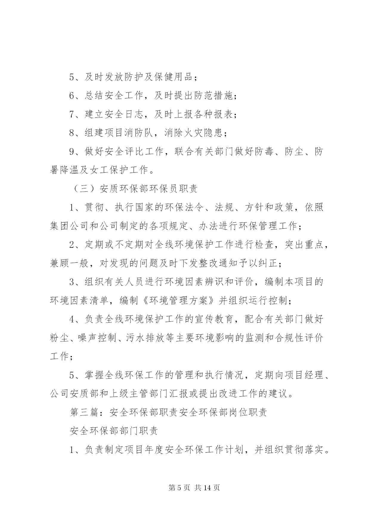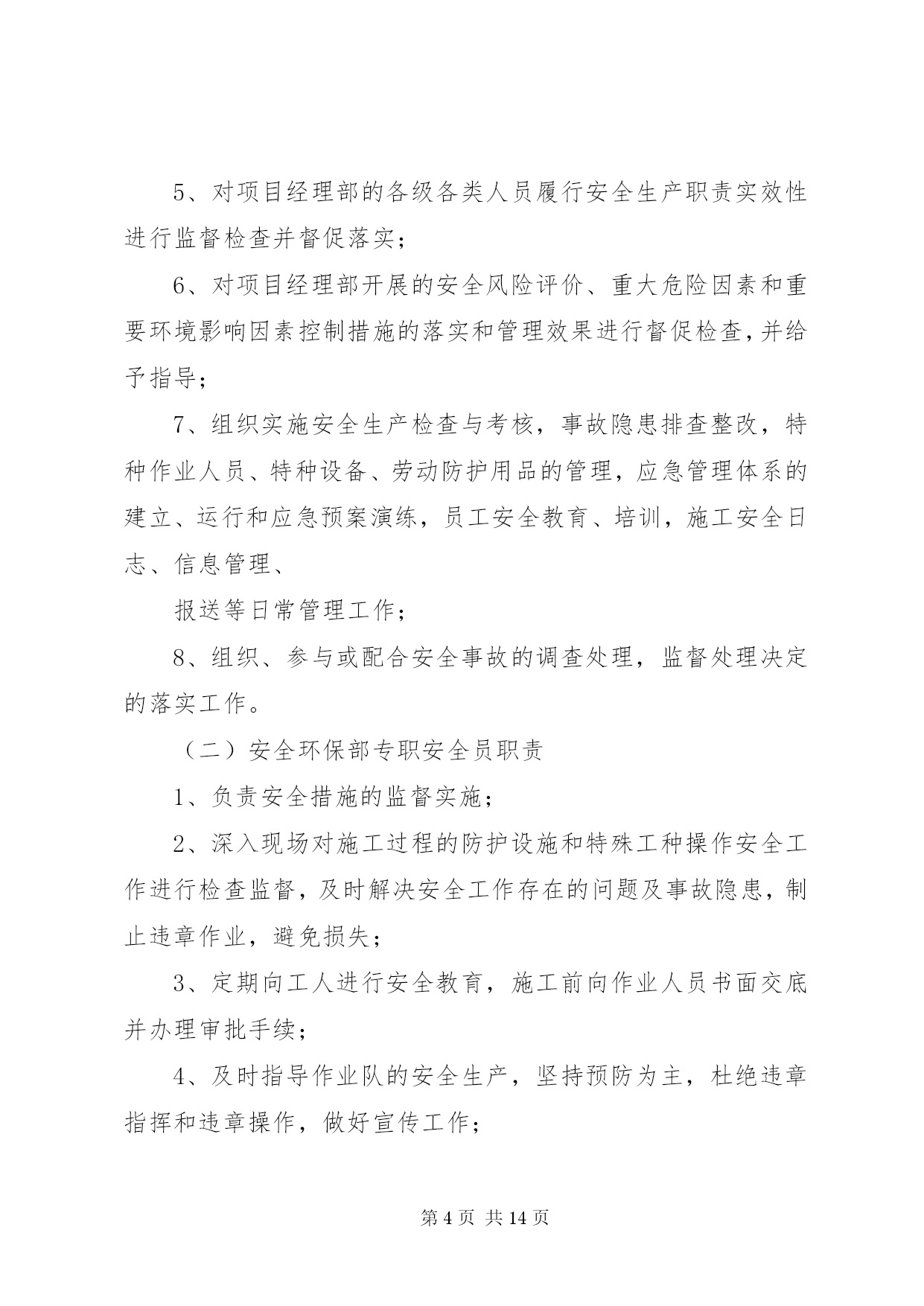 第PAGE\*Arabic\*MERGEFORMAT14页共NUMPAGES\*MERGEFORMAT14页安全环保部职责1、负责建立健全项目部安全管理的各项规章制度。2、组织制定项目部安全生产年度、季度工作计划,编制安全技术措施,会同工程部进行分部分项施工组织设计的安全技术交底工作。3、负责组织每周、每旬、每月的安全检查,跟踪落实各类事故隐患的整改。同时,落实项目部安全生产奖罚制度。4、组织和实施安全教育和培训工作,对特殊工种作业人员把好外培质量关,确保特殊工种的安全技术素质,确保持证上岗。5、组织召开安全会议和开展各类安全活动。落实消防措施,保障防火安全。参与安全事故的调查、分析、处理。负责职工劳动保护用品的计划、采购和发放工作。参与职业病的鉴定。6、抓好施工的季节性安全防范措施的制定和现场落实工作。7、抓好劳务队伍、外租机械设备的资质管理和相关证照把关,施工过程中加强督促检查,控制劳务队伍、外租机械设备的事故发生率。8、及时传达业主、监理和上级主管机关对施工现场有关安全生产的指令,抓好现场落实工作。9、负责项目部职业安全健康运行控制和服务的管理。组织制定和实施职业安全健康管理方案、应急预案及响应计划。10、负责环境、职业安全健康管理体系在本工作范围贯彻实施,落实相关的目标、指标。11、负责对危害源识别与风险评价,对重大危害源控制措施和管理方案在项目部、分包单位、租赁场所的落实。12、完成领导交办的其他工作。第二篇:安全环保部职责安全环保部职责1、对项目环境保护与安全管理工作进行管理控制;2、系统掌握国家、业主及公司关于施工安全、环境保护的方针、政策、法规、制度和要求,并在施工中督促和检查;3、做好安全环保的宣传教育和培训工作,做好安全交底工作,促使全体参建人员树立安全第一、质量兴企的思想,自觉遵守各项规章制度;4、健全安全工作的组织机构,建立健全安全生产管理体系和应急救援体系,完善安全生产包保责任制,控制安全生产成本,实现“杜绝较大的安全生产事故,杜绝安全责任事故,全力打造国家级“平安工程”示范项目”安全生产总目标;5、参与和组织各项安全生产检查活动,制止“三违”行为,排查安全隐患,制定防范措施;6、定期制定安全生产专项资金投入计划,并对投入情况进行统计、核实;7、参与编制本项目危险源辨识与风险评价,编制本项目的安全生产事故应急救援预案,并定期组织相关人员进行演练;8、制定重大危险源管理方案和保证措施,对施工现场安全重大危险源实施动态监控;9、负责本项目劳保用品的计划、发放,并监督检查劳保用品的使用情况;10、参与安全生产事故的调查、处理和事故报告,做好相应的登记工作;11、及时组织、配合项目总工做好入场人员的安全交底工作,及时对劳务队伍做好入场安全教育,及时督促项目部与分包单位签定安全生产协议书;并做好相关记录;12、完善安全内业资料,加强对内业资料的规范、管理和保存。(一)安全环保部部长职责1、贯彻落实国家安全生产方针、政策、法律、法规,上级和公司的安全生产规章制度;2、建立健全安全生产保障体系、监督体系,组织落实项目安全生产管理制度、安全生产责任制;3、负责审定项目安全生产投入计划,保证安全生产投入的有效实施,保证职业健康安全管理体系的有效运行;4、参与审核施工组织设计、施工方案的审查,监督安全技术措施的落实工作,督促设备管理部门开展设备安全管理工作;5、对项目经理部的各级各类人员履行安全生产职责实效性进行监督检查并督促落实;6、对项目经理部开展的安全风险评价、重大危险因素和重要环境影响因素控制措施的落实和管理效果进行督促检查,并给予指导;7、组织实施安全生产检查与考核,事故隐患排查整改,特种作业人员、特种设备、劳动防护用品的管理,应急管理体系的建立、运行和应急预案演练,员工安全教育、培训,施工安全日志、信息管理、报送等日常管理工作;8、组织、参与或配合安全事故的调查处理,监督处理决定的落实工作。(二)安全环保部专职安全员职责1、负责安全措施的监督实施;2、深入现场对施工过程的防护设施和特殊工种操作安全工作进行检查监督,及时解决安全工作存在的问题及事故隐患,制止违章作业,避免损失;3、定期向工人进行安全教育,施工前向作业人员书面交底并办理审批手续;4、及时指导作业队的安全生产,坚持预防为主,杜绝违章指挥和违章操作,做好宣传工作;5、及时发放防护及保健用品;6、总结安全工作,及时提出防范措施;7、建立安全日志,及时上报各种报表;8、组建项目消防队,消除火灾隐患;9、做好安全评比工作,联合有关部门做好防毒、防尘、防暑降温及女工保护工作。(三)安质环保部环保员职责1、贯彻、执行国家的环保法令、法规、方针和政策,依照集团公司和公司制定的各项规定、办法进行环保管理工作;2、定期或不定期对全线环境保护