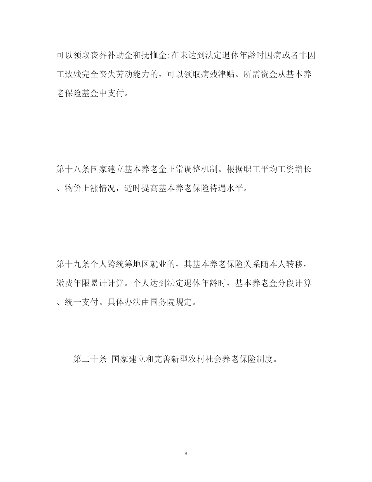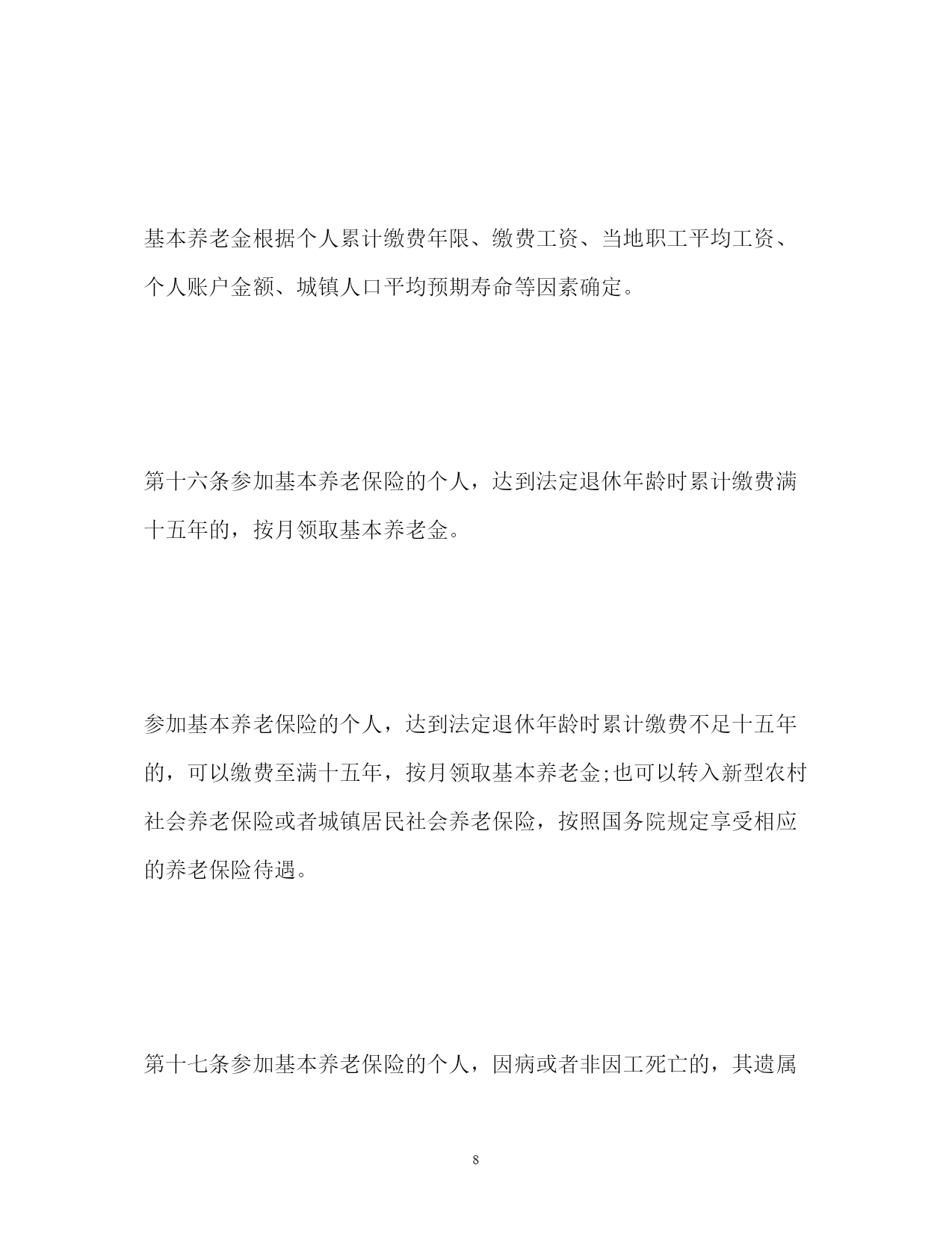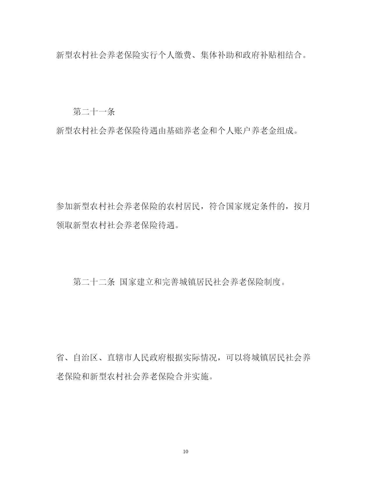 此资料由网络收集而来,如有侵权请告知上传者立即删除。资料共分享,我们负责传递知识。PAGEPAGE22最新社会保险法全文最新社会保险法全文第一章总则第一条为了规范社会保险关系,维护公民参加社会保险和享受社会保险待遇的合法权益,使公民共享发展成果,促进社会和谐稳定,根据宪法,制定本法。第二条国家建立基本养老保险、基本医疗保险、工伤保险、失业保险、生育保险等社会保险制度,保障公民在年老、疾病、工伤、失业、生育等情况下依法从国家和社会获得物质帮助的权利。第三条社会保险制度坚持广覆盖、保基本、多层次、可持续的方针,社会保险水平应当与经济社会发展水平相适应。第四条中华人民共和国境内的用人单位和个人依法缴纳社会保险费,有权查询缴费记录、个人权益记录,要求社会保险经办机构提供社会保险咨询等相关服务。个人依法享受社会保险待遇,有权监督本单位为其缴费情况。第五条县级以上人民政府将社会保险事业纳入国民经济和社会发展规划。国家多渠道筹集社会保险资金。县级以上人民政府对社会保险事业给予必要的经费支持。国家通过税收优惠政策支持社会保险事业。第六条国家对社会保险基金实行严格监管。国务院和省、自治区、直辖市人民政府建立健全社会保险基金监督管理制度,保障社会保险基金安全、有效运行。县级以上人民政府采取措施,鼓励和支持社会各方面参与社会保险基金的监督。第七条国务院社会保险行政部门负责全国的社会保险管理工作,国务院其他有关部门在各自的职责范围内负责有关的社会保险工作。县级以上地方人民政府社会保险行政部门负责本行政区域的社会保险管理工作,县级以上地方人民政府其他有关部门在各自的职责范围内负责有关的社会保险工作。第八条社会保险经办机构提供社会保险服务,负责社会保险登记、个人权益记录、社会保险待遇支付等工作。第九条工会依法维护职工的合法权益,有权参与社会保险重大事项的研究,参加社会保险监督委员会,对与职工社会保险权益有关的事项进行监督。第二章基本养老保险第十条职工应当参加基本养老保险,由用人单位和职工共同缴纳基本养老保险费。无雇工的个体工商户、未在用人单位参加基本养老保险的非全日制从业人员以及其他灵活就业人员可以参加基本养老保险,由个人缴纳基本养老保险费。公务员和参照公务员法管理的工作人员养老保险的办法由国务院规定。第十一条基本养老保险实行社会统筹与个人账户相结合。基本养老保险基金由用人单位和个人缴费以及政府补贴等组成。第十二条用人单位应当按照国家规定的本单位职工工资总额的比例缴纳基本养老保险费,记入基本养老保险统筹基金。职工应当按照国家规定的本人工资的比例缴纳基本养老保险费,记入个人账户。无雇工的个体工商户、未在用人单位参加基本养老保险的非全日制从业人员以及其他灵活就业人员参加基本养老保险的,应当按照国家规定缴纳基本养老保险费,分别记入基本养老保险统筹基金和个人账户。第十三条国有企业、事业单位职工参加基本养老保险前,视同缴费年限期间应当缴纳的基本养老保险费由政府承担。基本养老保险基金出现支付不足时,政府给予补贴。第十四条个人账户不得提前支取,记账利率不得低于银行定期存款利率,免征利息税。个人死亡的,个人账户余额可以继承。第十五条基本养老金由统筹养老金和个人账户养老金组成。基本养老金根据个人累计缴费年限、缴费工资、当地职工平均工资、个人账户金额、城镇人口平均预期寿命等因素确定。第十六条参加基本养老保险的个人,达到法定退休年龄时累计缴费满十五年的,按月领取基本养老金。参加基本养老保险的个人,达到法定退休年龄时累计缴费不足十五年的,可以缴费至满十五年,按月领取基本养老金;也可以转入新型农村社会养老保险或者城镇居民社会养老保险,按照国务院规定享受相应的养老保险待遇。第十七条参加基本养老保险的个人,因病或者非因工死亡的,其遗属可以领取丧葬补助金和抚恤金;在未达到法定退休年龄时因病或者非因工致残完全丧失劳动能力的,可以领取病残津贴。所需资金从基本养老保险基金中支付。第十八条国家建立基本养老金正常调整机制。根据职工平均工资增长、物价上涨情况,适时提高基本养老保险待遇水平。第十九条个人跨统筹地区就业的,其基本养老保险关系随本人转移,缴费年限累计计算。个人达到法定退休年龄时,基本养老金分段计算、统一支付。具体办法由国务院规定。第二十条国家建立和完善新型农村社会养老保险制度。新型农村社会养老保险实行个人缴费、集体补助和政府补贴相结合。第二十一条新型农村社会养老保险待遇由基础养老金和个人账户养老金组成。参加新型农村社会养老保险的农