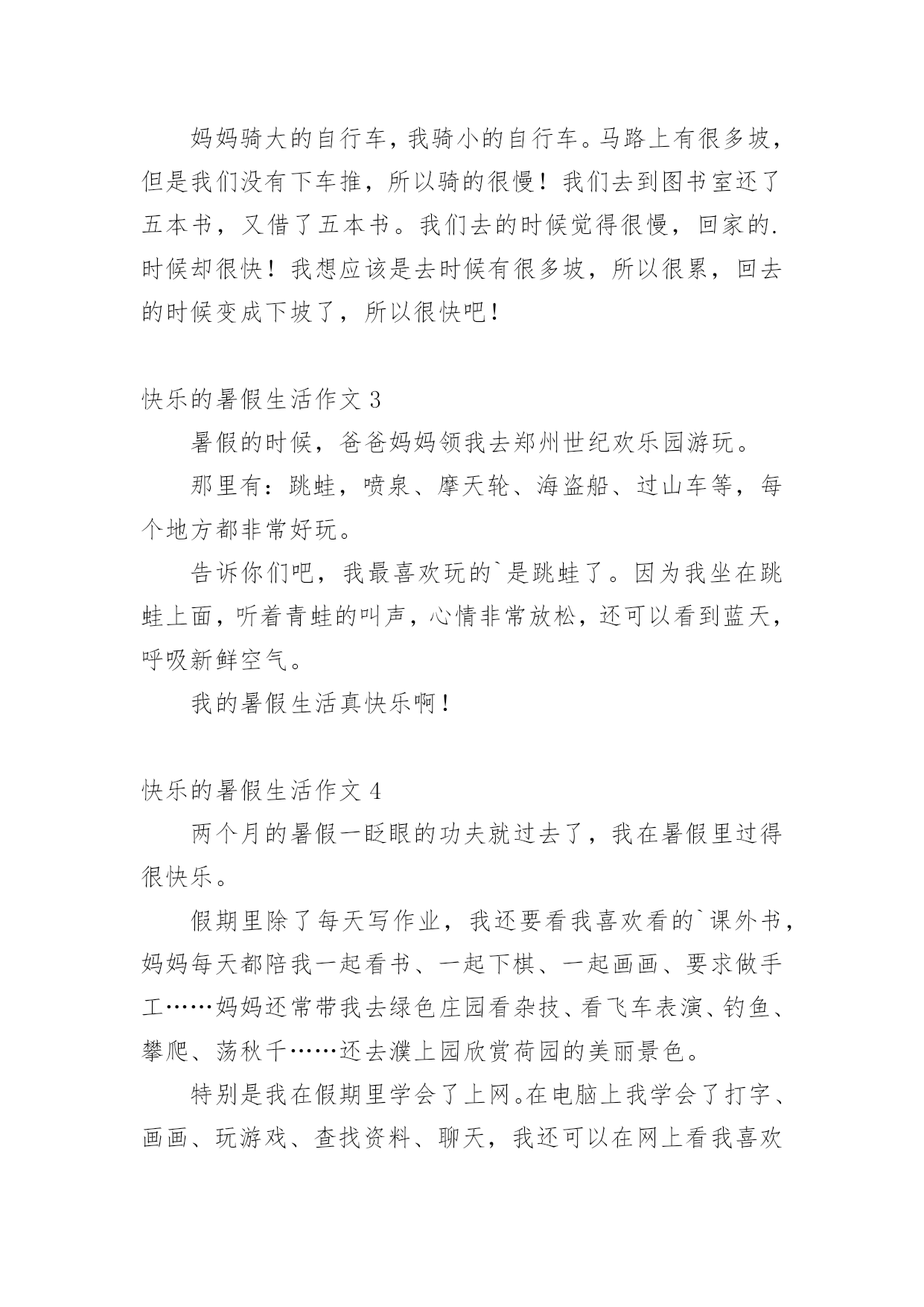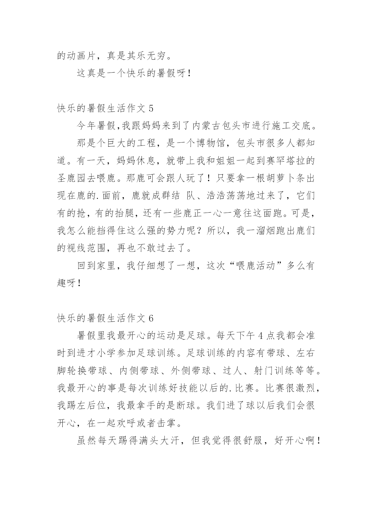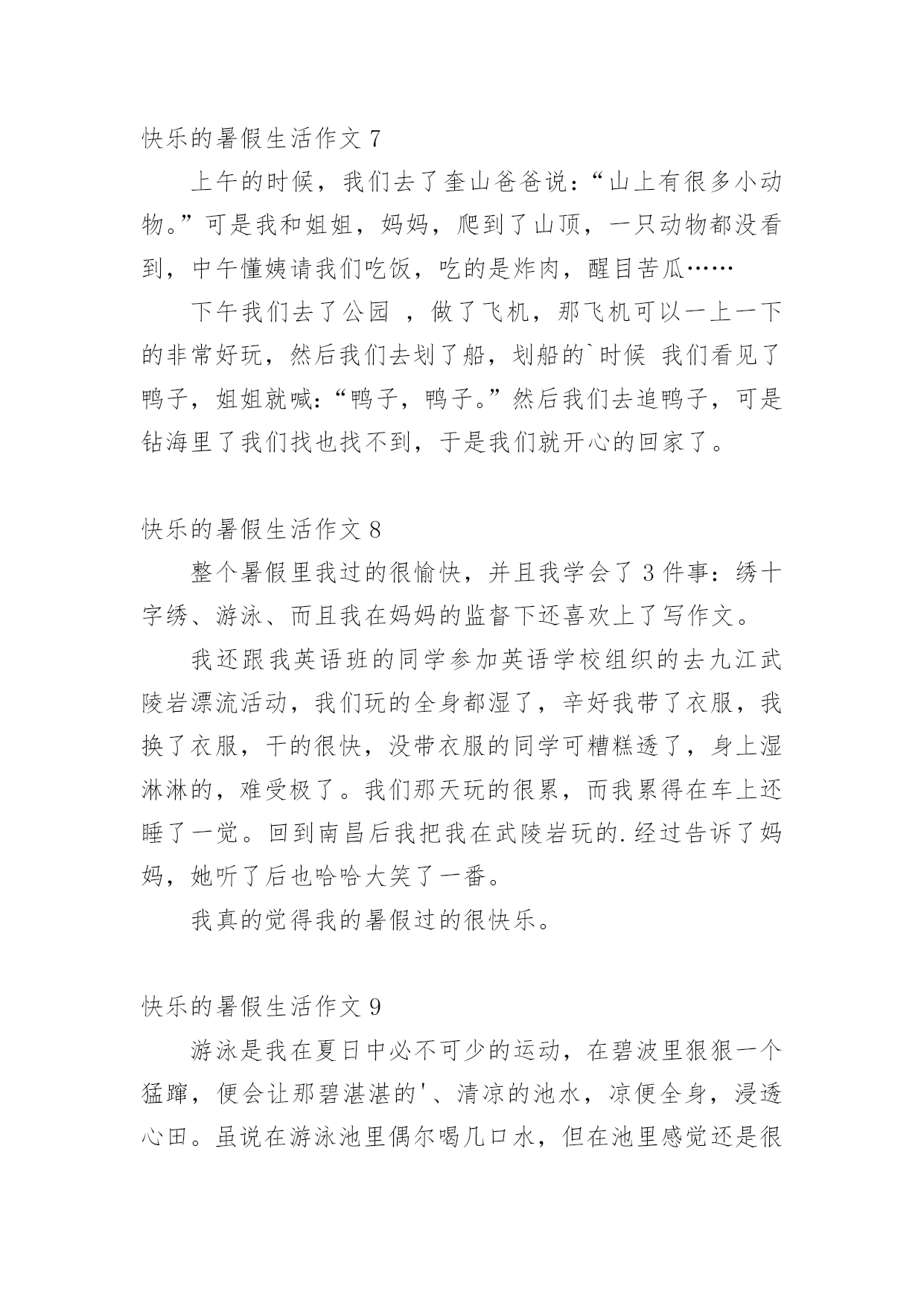 快乐的暑假生活作文【推荐】快乐的暑假生活作文无论是身处学校还是步入社会,大家对作文都再熟悉不过了吧,作文是人们把记忆中所存储的有关知识、经验和思想用书面形式表达出来的记叙方式。那么问题来了,到底应如何写一篇优秀的作文呢?下面是小编帮大家整理的快乐的暑假生活作文,仅供参考,欢迎大家阅读。快乐的暑假生活作文1这个暑假是我上小学的第一个暑假生活哦,在这个暑假里我把我的生活安排的可充实了(不过也有妈妈帮我安排的哦),7月份每天上午去上围棋课,我很喜欢围棋,遗憾的`是这次围棋考段我只赢了3盘,还差一盘棋才能升段成功,不过妈妈说了不要紧,要开开心心的,心情好下次肯定能通过,呵呵,我相信妈妈的话。8月份每天下午我都去学习游泳,学自由泳,我已经学会了哦,太开心了,以后我就是妈妈的游泳教练了......还参加了“雏鹰假日活动”,每周妈妈都带我看电影,当然同时还完成了暑假该完成的作业,呵呵,这个我过得充实吧。快乐的暑假生活作文2今天早上,我和妈妈去借书,而且是骑自行车去的。妈妈骑大的自行车,我骑小的自行车。马路上有很多坡,但是我们没有下车推,所以骑的很慢!我们去到图书室还了五本书,又借了五本书。我们去的时候觉得很慢,回家的.时候却很快!我想应该是去时候有很多坡,所以很累,回去的时候变成下坡了,所以很快吧!快乐的暑假生活作文3暑假的时候,爸爸妈妈领我去郑州世纪欢乐园游玩。那里有:跳蛙,喷泉、摩天轮、海盗船、过山车等,每个地方都非常好玩。告诉你们吧,我最喜欢玩的`是跳蛙了。因为我坐在跳蛙上面,听着青蛙的叫声,心情非常放松,还可以看到蓝天,呼吸新鲜空气。我的暑假生活真快乐啊!快乐的暑假生活作文4两个月的暑假一眨眼的功夫就过去了,我在暑假里过得很快乐。假期里除了每天写作业,我还要看我喜欢看的`课外书,妈妈每天都陪我一起看书、一起下棋、一起画画、要求做手工……妈妈还常带我去绿色庄园看杂技、看飞车表演、钓鱼、攀爬、荡秋千……还去濮上园欣赏荷园的美丽景色。特别是我在假期里学会了上网。在电脑上我学会了打字、画画、玩游戏、查找资料、聊天,我还可以在网上看我喜欢的动画片,真是其乐无穷。这真是一个快乐的暑假呀!快乐的暑假生活作文5今年暑假,我跟妈妈来到了内蒙古包头市进行施工交底。那是个巨大的工程,是一个博物馆,包头市很多人都知道。有一天,妈妈休息,就带上我和姐姐一起到赛罕塔拉的圣鹿园去喂鹿。那鹿可会跟人玩了!只要拿一根胡萝卜条出现在鹿的.面前,鹿就成群结队、浩浩荡荡地过来了,它们有的抢,有的抬腿,还有一些鹿正一心一意往这面跑。可是,我怎么能挡得住这么强的势力呢?所以,我一溜烟跑出鹿们的视线范围,再也不敢过去了。回到家里,我仔细想了一想,这次“喂鹿活动”多么有趣呀!快乐的暑假生活作文6暑假里我最开心的运动是足球。每天下午4点我都会准时到进才小学参加足球训练。足球训练的内容有带球、左右脚轮换带球、内侧带球、外侧带球、过人、射门训练等等。我最开心的事是每次训练好技能以后的.比赛。比赛很激烈,我踢左后位,我最拿手的是断球。我们进了球以后我们会很开心,在一起欢呼或者击掌。虽然每天踢得满头大汗,但我觉得很舒服,好开心啊!快乐的暑假生活作文7上午的时候,我们去了奎山爸爸说:“山上有很多小动物。”可是我和姐姐,妈妈,爬到了山顶,一只动物都没看到,中午懂姨请我们吃饭,吃的是炸肉,醒目苦瓜……下午我们去了公园,做了飞机,那飞机可以一上一下的非常好玩,然后我们去划了船,划船的`时候我们看见了鸭子,姐姐就喊:“鸭子,鸭子。”然后我们去追鸭子,可是钻海里了我们找也找不到,于是我们就开心的回家了。快乐的暑假生活作文8整个暑假里我过的很愉快,并且我学会了3件事:绣十字绣、游泳、而且我在妈妈的监督下还喜欢上了写作文。我还跟我英语班的同学参加英语学校组织的去九江武陵岩漂流活动,我们玩的全身都湿了,辛好我带了衣服,我换了衣服,干的很快,没带衣服的同学可糟糕透了,身上湿淋淋的,难受极了。我们那天玩的很累,而我累得在车上还睡了一觉。回到南昌后我把我在武陵岩玩的.经过告诉了妈妈,她听了后也哈哈大笑了一番。我真的觉得我的暑假过的很快乐。快乐的暑假生活作文9游泳是我在夏日中必不可少的运动,在碧波里狠狠一个猛蹿,便会让那碧湛湛的'、清凉的池水,凉便全身,浸透心田。虽说在游泳池里偶尔喝几口水,但在池里感觉还是很棒、很爽的!在炎热的夏,来几个狗爬式,几下蛙泳,有一种休闲时尚的感觉,夏天,如果没这个项目,老实说,我是没法活的!快乐的暑假生活作文10今年暑假的8月1日,我和家人去连云港的花果山旅游。我们坐上电缆车到达山顶,从山顶往下看,花果山非常漂亮,有绿绿的草、高高的'大树、五颜六色的花朵,还看到了九龙桥、美丽的湖。从山顶上下来,我们走在九龙桥上,跟小猴拍照,我还和小猴握手了呢,太有趣了!我们还去了水帘洞,水帘洞口像