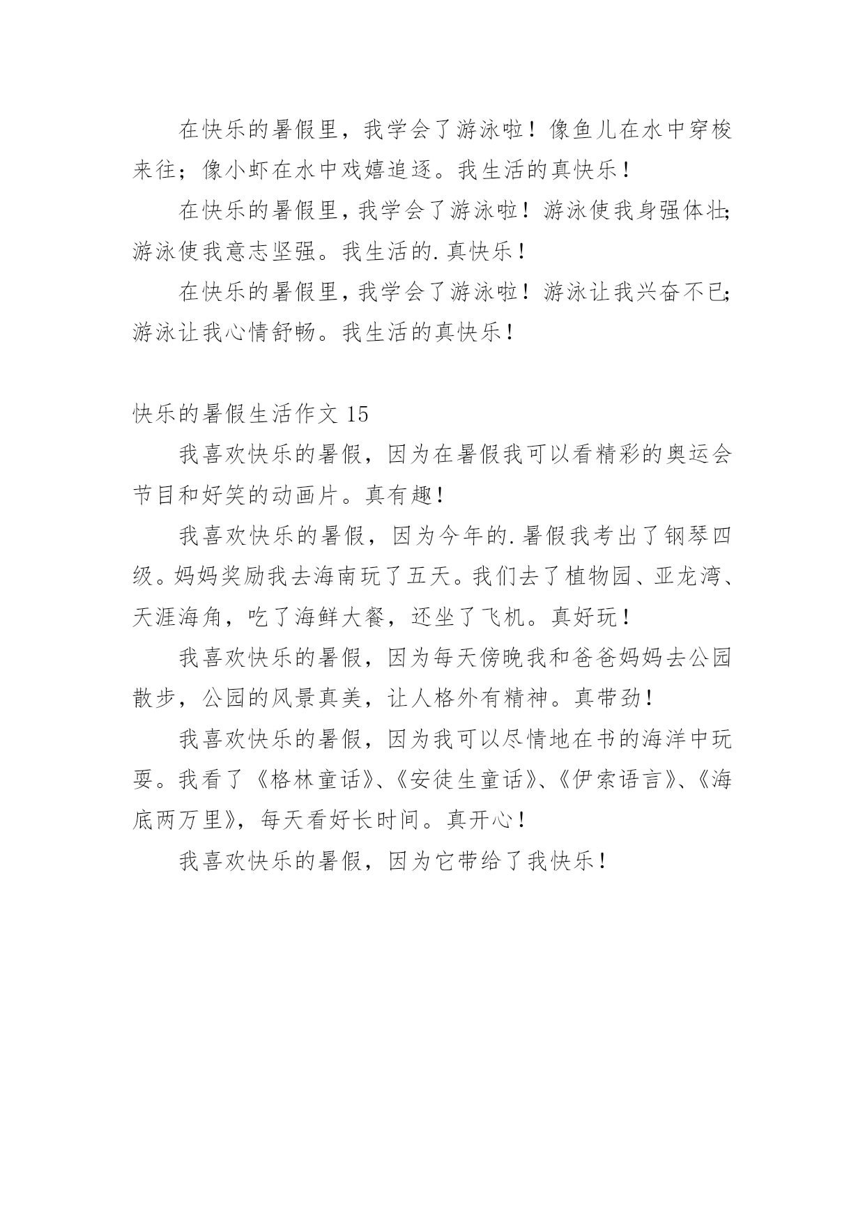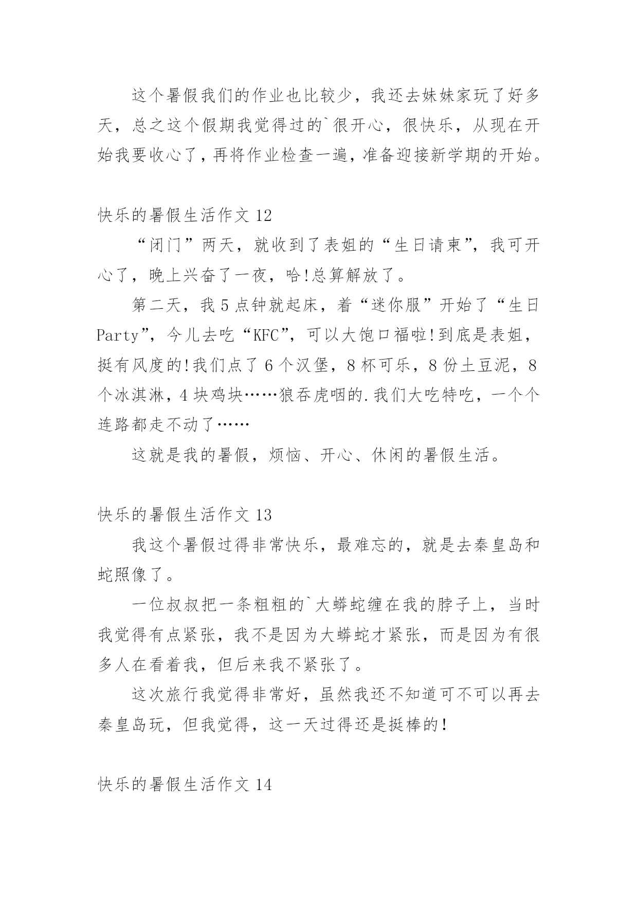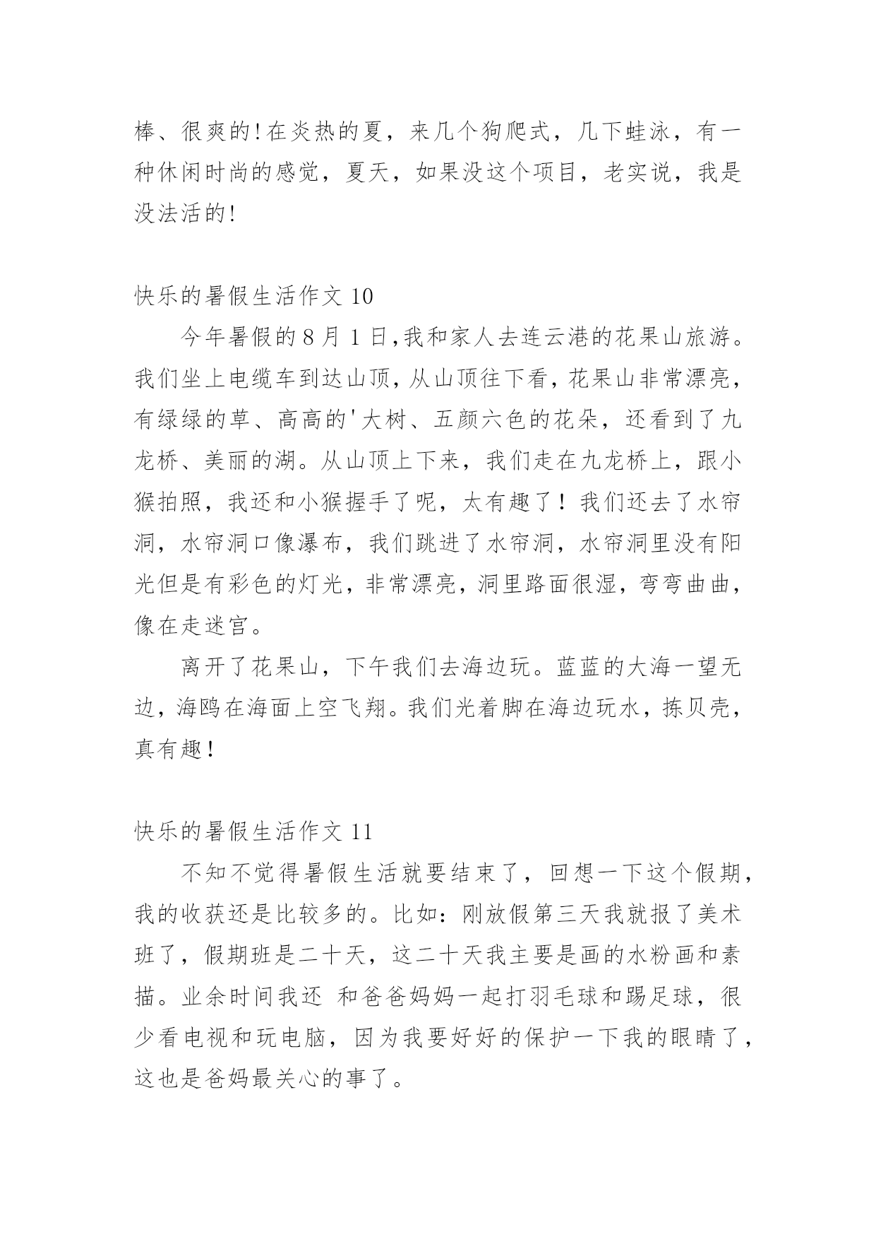 快乐的暑假生活作文【推荐】快乐的暑假生活作文无论是身处学校还是步入社会,大家对作文都再熟悉不过了吧,作文是人们把记忆中所存储的有关知识、经验和思想用书面形式表达出来的记叙方式。那么问题来了,到底应如何写一篇优秀的作文呢?下面是小编帮大家整理的快乐的暑假生活作文,仅供参考,欢迎大家阅读。快乐的暑假生活作文1这个暑假是我上小学的第一个暑假生活哦,在这个暑假里我把我的生活安排的可充实了(不过也有妈妈帮我安排的哦),7月份每天上午去上围棋课,我很喜欢围棋,遗憾的`是这次围棋考段我只赢了3盘,还差一盘棋才能升段成功,不过妈妈说了不要紧,要开开心心的,心情好下次肯定能通过,呵呵,我相信妈妈的话。8月份每天下午我都去学习游泳,学自由泳,我已经学会了哦,太开心了,以后我就是妈妈的游泳教练了......还参加了“雏鹰假日活动”,每周妈妈都带我看电影,当然同时还完成了暑假该完成的作业,呵呵,这个我过得充实吧。快乐的暑假生活作文2今天早上,我和妈妈去借书,而且是骑自行车去的。妈妈骑大的自行车,我骑小的自行车。马路上有很多坡,但是我们没有下车推,所以骑的很慢!我们去到图书室还了五本书,又借了五本书。我们去的时候觉得很慢,回家的.时候却很快!我想应该是去时候有很多坡,所以很累,回去的时候变成下坡了,所以很快吧!快乐的暑假生活作文3暑假的时候,爸爸妈妈领我去郑州世纪欢乐园游玩。那里有:跳蛙,喷泉、摩天轮、海盗船、过山车等,每个地方都非常好玩。告诉你们吧,我最喜欢玩的`是跳蛙了。因为我坐在跳蛙上面,听着青蛙的叫声,心情非常放松,还可以看到蓝天,呼吸新鲜空气。我的暑假生活真快乐啊!快乐的暑假生活作文4两个月的暑假一眨眼的功夫就过去了,我在暑假里过得很快乐。假期里除了每天写作业,我还要看我喜欢看的`课外书,妈妈每天都陪我一起看书、一起下棋、一起画画、要求做手工……妈妈还常带我去绿色庄园看杂技、看飞车表演、钓鱼、攀爬、荡秋千……还去濮上园欣赏荷园的美丽景色。特别是我在假期里学会了上网。在电脑上我学会了打字、画画、玩游戏、查找资料、聊天,我还可以在网上看我喜欢的动画片,真是其乐无穷。这真是一个快乐的暑假呀!快乐的暑假生活作文5今年暑假,我跟妈妈来到了内蒙古包头市进行施工交底。那是个巨大的工程,是一个博物馆,包头市很多人都知道。有一天,妈妈休息,就带上我和姐姐一起到赛罕塔拉的圣鹿园去喂鹿。那鹿可会跟人玩了!只要拿一根胡萝卜条出现在鹿的.面前,鹿就成群结队、浩浩荡荡地过来了,它们有的抢,有的抬腿,还有一些鹿正一心一意往这面跑。可是,我怎么能挡得住这么强的势力呢?所以,我一溜烟跑出鹿们的视线范围,再也不敢过去了。回到家里,我仔细想了一想,这次“喂鹿活动”多么有趣呀!快乐的暑假生活作文6暑假里我最开心的运动是足球。每天下午4点我都会准时到进才小学参加足球训练。足球训练的内容有带球、左右脚轮换带球、内侧带球、外侧带球、过人、射门训练等等。我最开心的事是每次训练好技能以后的.比赛。比赛很激烈,我踢左后位,我最拿手的是断球。我们进了球以后我们会很开心,在一起欢呼或者击掌。虽然每天踢得满头大汗,但我觉得很舒服,好开心啊!快乐的暑假生活作文7上午的时候,我们去了奎山爸爸说:“山上有很多小动物。”可是我和姐姐,妈妈,爬到了山顶,一只动物都没看到,中午懂姨请我们吃饭,吃的是炸肉,醒目苦瓜……下午我们去了公园,做了飞机,那飞机可以一上一下的非常好玩,然后我们去划了船,划船的`时候我们看见了鸭子,姐姐就喊:“鸭子,鸭子。”然后我们去追鸭子,可是钻海里了我们找也找不到,于是我们就开心的回家了。快乐的暑假生活作文8整个暑假里我过的很愉快,并且我学会了3件事:绣十字绣、游泳、而且我在妈妈的监督下还喜欢上了写作文。我还跟我英语班的同学参加英语学校组织的去九江武陵岩漂流活动,我们玩的全身都湿了,辛好我带了衣服,我换了衣服,干的很快,没带衣服的同学可糟糕透了,身上湿淋淋的,难受极了。我们那天玩的很累,而我累得在车上还睡了一觉。回到南昌后我把我在武陵岩玩的.经过告诉了妈妈,她听了后也哈哈大笑了一番。我真的觉得我的暑假过的很快乐。快乐的暑假生活作文9游泳是我在夏日中必不可少的运动,在碧波里狠狠一个猛蹿,便会让那碧湛湛的'、清凉的池水,凉便全身,浸透心田。虽说在游泳池里偶尔喝几口水,但在池里感觉还是很棒、很爽的!在炎热的夏,来几个狗爬式,几下蛙泳,有一种休闲时尚的感觉,夏天,如果没这个项目,老实说,我是没法活的!快乐的暑假生活作文10今年暑假的8月1日,我和家人去连云港的花果山旅游。我们坐上电缆车到达山顶,从山顶往下看,花果山非常漂亮,有绿绿的草、高高的'大树、五颜六色的花朵,还看到了九龙桥、美丽的湖。从山顶上下来,我们走在九龙桥上,跟小猴拍照,我还和小猴握手了呢,太有趣了!我们还去了水帘洞,水帘洞口像