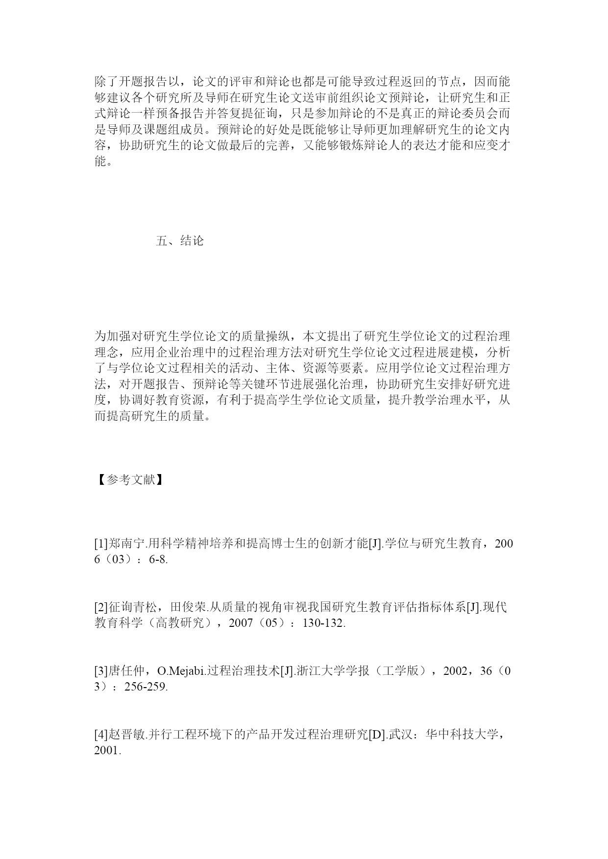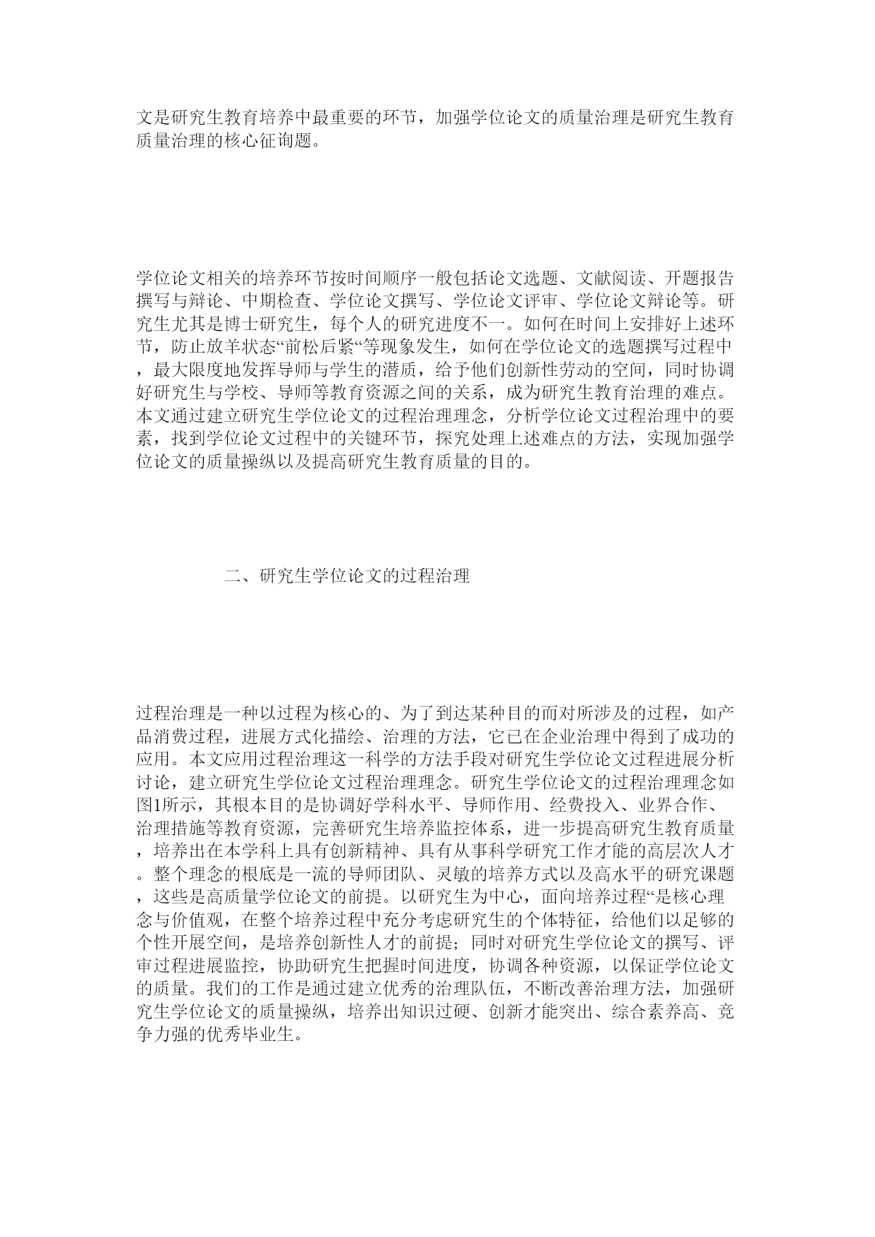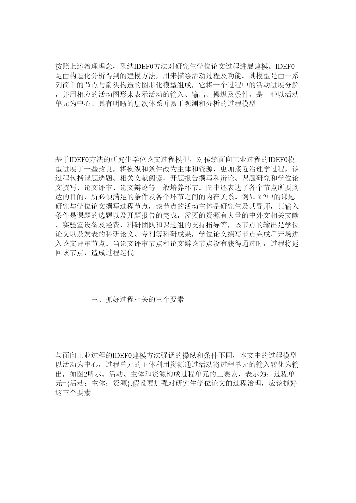 研究生学位论文过程治理研究研究生学位论文过程治理研究关键词:学位,研究生,过程,研究,论文研究生学位论文过程治理研究介绍:一、学位论文过程治理的意义研究生教育是高等教育的最高层次,代表着一个国家的人才培养水平,对提高我国国际竞争力、建立创新型国家和实现人才强国的战略目的具有严峻意义。陈至立同志在国务院学位委员会第二十四次会议上曾强调指出:要深化贯彻落实科学开展观,深化改革,优化构造,创新机制,提高质量,把研究生学位论文过程治理研究详情:一、学位论文过程治理的意义研究生教育是高等教育的最高层次,代表着一个国家的人才培养水平,对提高我国国际竞争力、建立创新型国家和实现人才强国的战略目的具有严峻意义。陈至立同志在国务院学位委员会第二十四次会议上曾强调指出:要深化贯彻落实科学开展观,深化改革,优化构造,创新机制,提高质量,把我国研究生教育提高到一个新水平。“近年来,随着研究生教育的快速开展以及培养规模的不断扩大,如何进一步提高研究生教育质量,已成为摆在研究生教育治理人员面前的重要课题。研究生的培养一般包括招生录用、教学课程学习、课题选题研究、开题报告、学位论文撰写、论文评审辩论等环节。其中,学位论文质量的高低是衡量研究生培养质量的重要标志。关于一位工程专业的研究生来说,其学位论文的质量,能综合地表达该研究生运用科学理论、方法和技术手段处理工程实际征询题的才能,同时又是评判其能否获得研究生学位的最重要的按照。因而,学位论文是研究生教育培养中最重要的环节,加强学位论文的质量治理是研究生教育质量治理的核心征询题。学位论文相关的培养环节按时间顺序一般包括论文选题、文献阅读、开题报告撰写与辩论、中期检查、学位论文撰写、学位论文评审、学位论文辩论等。研究生尤其是博士研究生,每个人的研究进度不一。如何在时间上安排好上述环节,防止放羊状态“前松后紧“等现象发生,如何在学位论文的选题撰写过程中,最大限度地发挥导师与学生的潜质,给予他们创新性劳动的空间,同时协调好研究生与学校、导师等教育资源之间的关系,成为研究生教育治理的难点。本文通过建立研究生学位论文的过程治理理念,分析学位论文过程治理中的要素,找到学位论文过程中的关键环节,探究处理上述难点的方法,实现加强学位论文的质量操纵以及提高研究生教育质量的目的。二、研究生学位论文的过程治理过程治理是一种以过程为核心的、为了到达某种目的而对所涉及的过程,如产品消费过程,进展方式化描绘、治理的方法,它已在企业治理中得到了成功的应用。本文应用过程治理这一科学的方法手段对研究生学位论文过程进展分析讨论,建立研究生学位论文过程治理理念。研究生学位论文的过程治理理念如图1所示,其根本目的是协调好学科水平、导师作用、经费投入、业界合作、治理措施等教育资源,完善研究生培养监控体系,进一步提高研究生教育质量,培养出在本学科上具有创新精神、具有从事科学研究工作才能的高层次人才。整个理念的根底是一流的导师团队、灵敏的培养方式以及高水平的研究课题,这些是高质量学位论文的前提。以研究生为中心,面向培养过程“是核心理念与价值观,在整个培养过程中充分考虑研究生的个体特征,给他们以足够的个性开展空间,是培养创新性人才的前提;同时对研究生学位论文的撰写、评审过程进展监控,协助研究生把握时间进度,协调各种资源,以保证学位论文的质量。我们的工作是通过建立优秀的治理队伍,不断改善治理方法,加强研究生学位论文的质量操纵,培养出知识过硬、创新才能突出、综合素养高、竞争力强的优秀毕业生。按照上述治理理念,采纳IDEF0方法对研究生学位论文过程进展建模。IDEF0是由构造化分析得到的建模方法,用来描绘活动过程及功能。其模型是由一系列简单的节点与箭头构造的图形化模型组成,它将一个过程中的活动进展分解,并用相应的活动图形来表示活动的输入、输出、操纵及条件,是一种以活动单元为中心、具有明晰的层次体系并易于观测和分析的过程模型。基于IDEF0方法的研究生学位论文过程模型,对传统面向工业过程的IDEF0模型进展了一些改良,将操纵和条件改为主体和资源,更加接近治理学过程,该过程包括课题选题、相关文献阅读、开题报告撰写和辩论、课题研究和学位论文撰写、论文评审、论文辩论等一般培养环节。图中还表达了各个节点所要到达的目的、所必须满足的条件及各个环节之间的内在关系。例如图2中的课题研究与学位论文撰写过程节点,该节点的活动主体是研究生及其导师,其输入条件是课题的选题以及开题报告的完成,需要的资源有大量的中外文相关文献、实验室设备及经费、科研团队和课题组的支持指导等,该节点的输出是学位论文以及发表的科研论文、专利等科研成果,学位论文撰写节点完成后开场进入论文评审节点