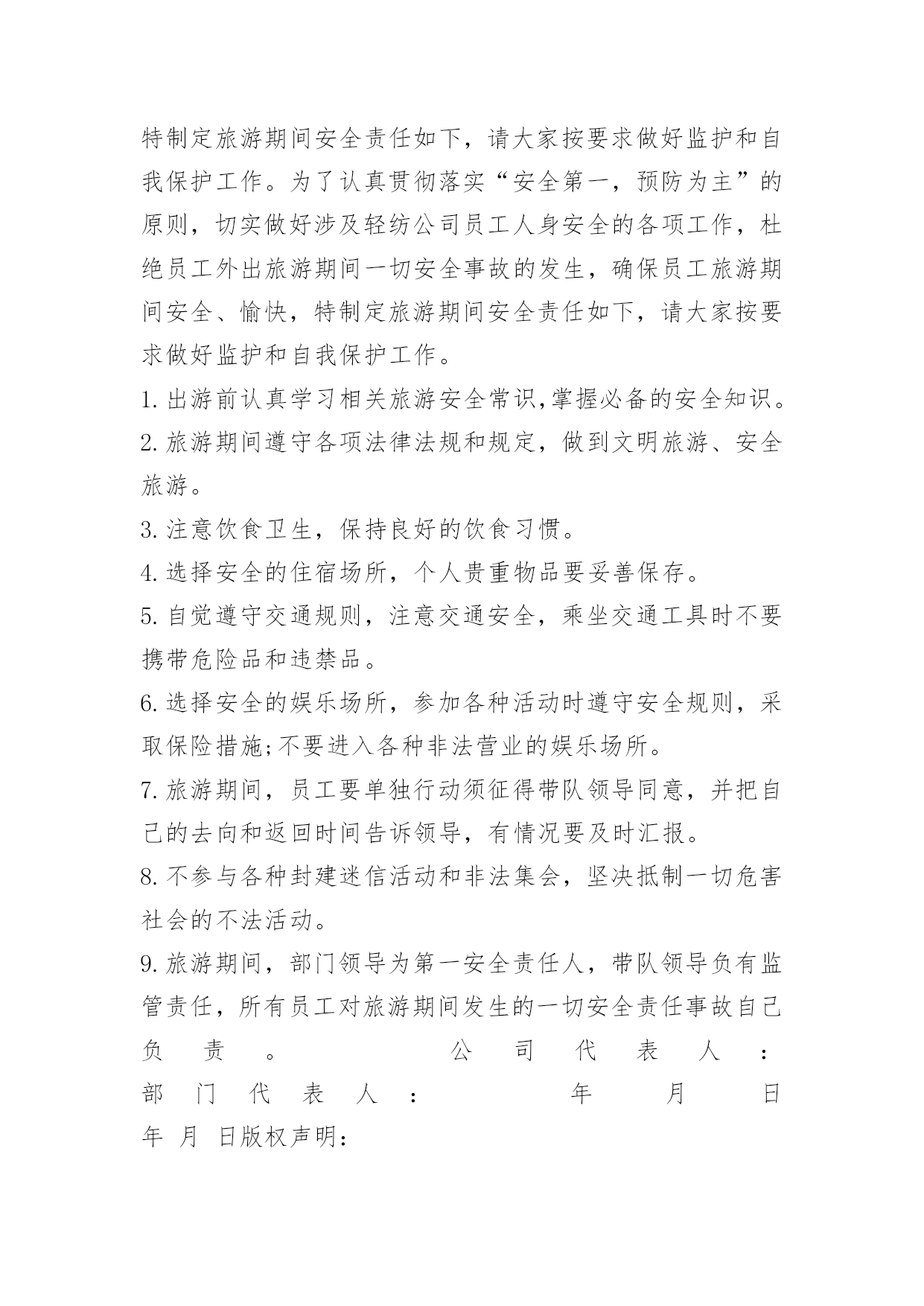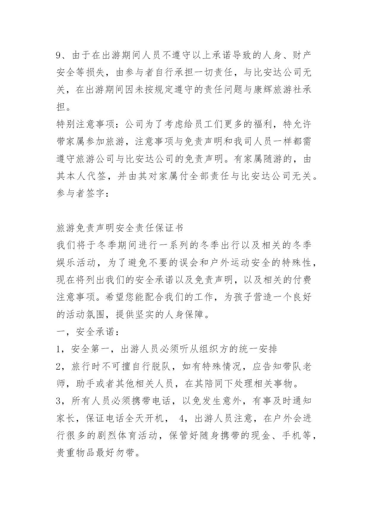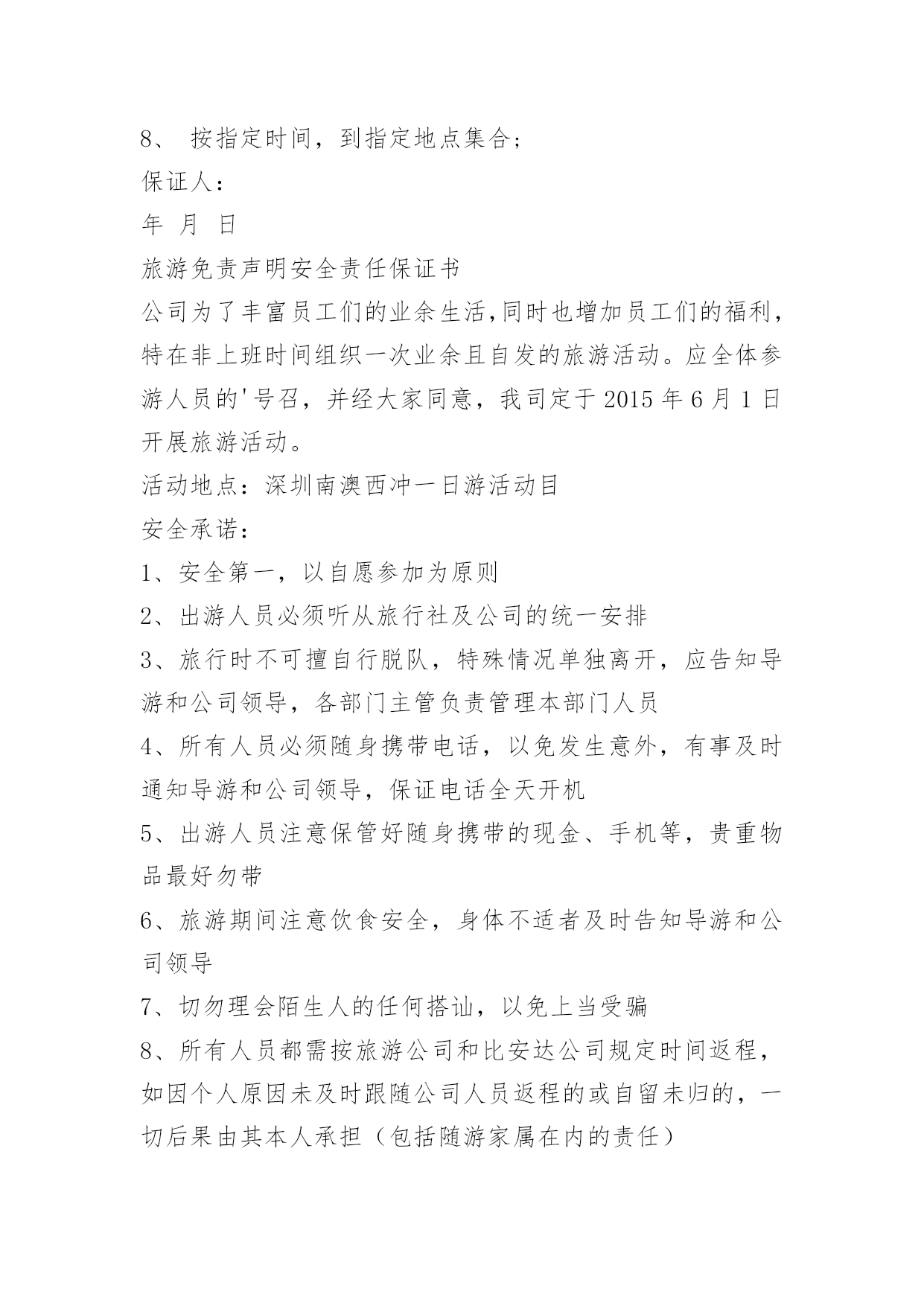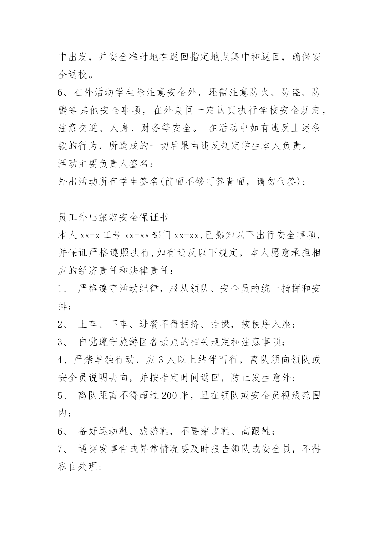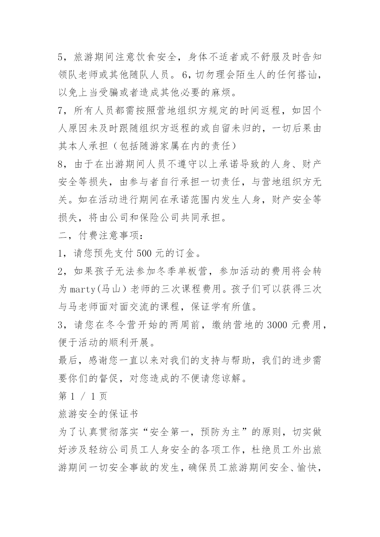 旅游安全保证书旅游安全保证书xx-xx学校x(x)班学生将于xx-xx年xx月xx日组织集体青檀寺旅游活动,为保证活动的顺利进行,考虑到本次活动的安全防护与安全教育工作,结合出游特点,为此,本班向学校做出如下保证:1、在活动中严格遵守国家法令和校纪校规,不参与任何违法犯罪活动。不准擅自离队,不擅自单独活动。如果有特殊情况不与班级同学一起集体活动或返校,必须向班委申请同意后方能单独活动(在申请中明确单独活动的原因、返回时间、联系电话等,同时明确单独活动期间发生的任何事故后果,由单独活动学生自己负责)。2、在活动的过程中,一切行动听从班委和活动组织者的指挥,时刻把安全放在第一位,每时每刻要注意安全,不到有危险的地方去;对违反工作纪律,不服从管理的学生,出现安全事故由学生自行负责。3、活动时学生在负责人的带领下有组织、按顺序依照指定路线认真开展活动、参观(游玩),带队负责人和外出活动的学生实行点名制度,并及时向指导老师汇报学生活动情况、安全状况。4、在活动的过程中,互助互爱,相互关心,处理好同学之间的关系。5、在活动中遵守纪律,遵守时间安排,准时在指定地点集中出发,并安全准时地在返回指定地点集中和返回,确保安全返校。6、在外活动学生除注意安全外,还需注意防火、防盗、防骗等其他安全事项,在外期间一定认真执行学校安全规定,注意交通、人身、财务等安全。在活动中如有违反上述条款的行为,所造成的一切后果由违反规定学生本人负责。活动主要负责人签名:外出活动所有学生签名(前面不够可签背面,请勿代签):员工外出旅游安全保证书本人xx-x工号xx-xx部门xx-xx,已熟知以下出行安全事项,并保证严格遵照执行,如有违反以下规定,本人愿意承担相应的经济责任和法律责任:1、严格遵守活动纪律,服从领队、安全员的统一指挥和安排;2、上车、下车、进餐不得拥挤、推搡,按秩序入座;3、自觉遵守旅游区各景点的相关规定和注意事项;4、严禁单独行动,应3人以上结伴而行,离队须向领队或安全员说明去向,并按指定时间返回,防止发生意外;5、离队距离不得超过200米,且在领队或安全员视线范围内;6、备好运动鞋、旅游鞋,不要穿皮鞋、高跟鞋;7、遇突发事件或异常情况要及时报告领队或安全员,不得私自处理;8、按指定时间,到指定地点集合;保证人:年月日旅游免责声明安全责任保证书公司为了丰富员工们的业余生活,同时也增加员工们的福利,特在非上班时间组织一次业余且自发的旅游活动。应全体参游人员的'号召,并经大家同意,我司定于2015年6月1日开展旅游活动。活动地点:深圳南澳西冲一日游活动目安全承诺:1、安全第一,以自愿参加为原则2、出游人员必须听从旅行社及公司的统一安排3、旅行时不可擅自行脱队,特殊情况单独离开,应告知导游和公司领导,各部门主管负责管理本部门人员4、所有人员必须随身携带电话,以免发生意外,有事及时通知导游和公司领导,保证电话全天开机5、出游人员注意保管好随身携带的现金、手机等,贵重物品最好勿带6、旅游期间注意饮食安全,身体不适者及时告知导游和公司领导7、切勿理会陌生人的任何搭讪,以免上当受骗8、所有人员都需按旅游公司和比安达公司规定时间返程,如因个人原因未及时跟随公司人员返程的或自留未归的,一切后果由其本人承担(包括随游家属在内的责任)9、由于在出游期间人员不遵守以上承诺导致的人身、财产安全等损失,由参与者自行承担一切责任,与比安达公司无关,在出游期间因未按规定遵守的责任问题与康辉旅游社承担。特别注意事项:公司为了考虑给员工们更多的福利,特允许带家属参加旅游,注意事项与免责声明和我司人员一样都需遵守旅游公司与比安达公司的免责声明。有家属随游的,由其本人代签,并由其对家属付全部责任与比安达公司无关。参与者签字:旅游免责声明安全责任保证书我们将于冬季期间进行一系列的冬季出行以及相关的冬季娱乐活动,为了避免不要的误会和户外运动安全的特殊性,现在将列出我们的安全承诺以及免责声明,以及相关的付费注意事项。希望您能配合我们的工作,为孩子营造一个良好的活动氛围,提供坚实的人身保障。一,安全承诺:1,安全第一,出游人员必须听从组织方的统一安排2,旅行时不可擅自行脱队,如有特殊情况,应告知带队老师,助手或者其他相关人员,在其陪同下处理相关事物。3,所有人员必须携带电话,以免发生意外,有事及时通知家长,保证电话全天开机,4,出游人员注意,在户外会进行很多的剧烈体育活动,保管好随身携带的现金、手机等,贵重物品最好勿带。5,旅游期间注意饮食安全,身体不适者或不舒服及时告知领队老师或其他随队人员。6,切勿理会陌生人的任何搭讪,以免上当受骗或者造成其他必要的麻烦。7,所有人员都需按照营地组织方规定的时间返程,如因个人原因未及时跟随组织方返程的或自留未归的,一切后果由其本人承担(包括随游家属在内的责任