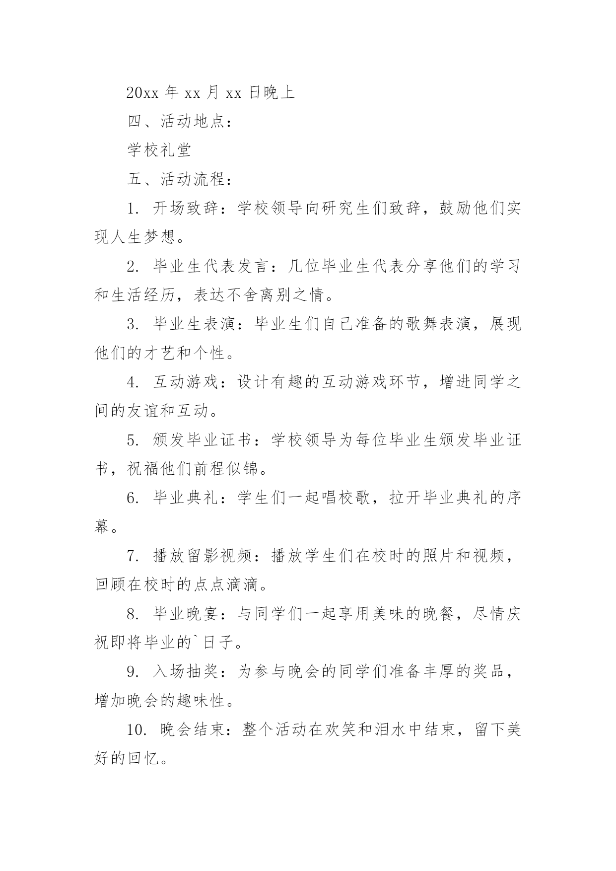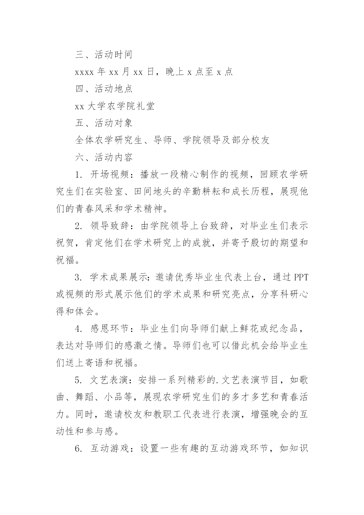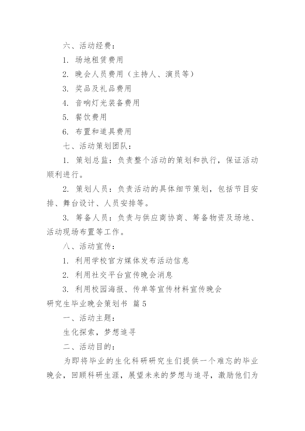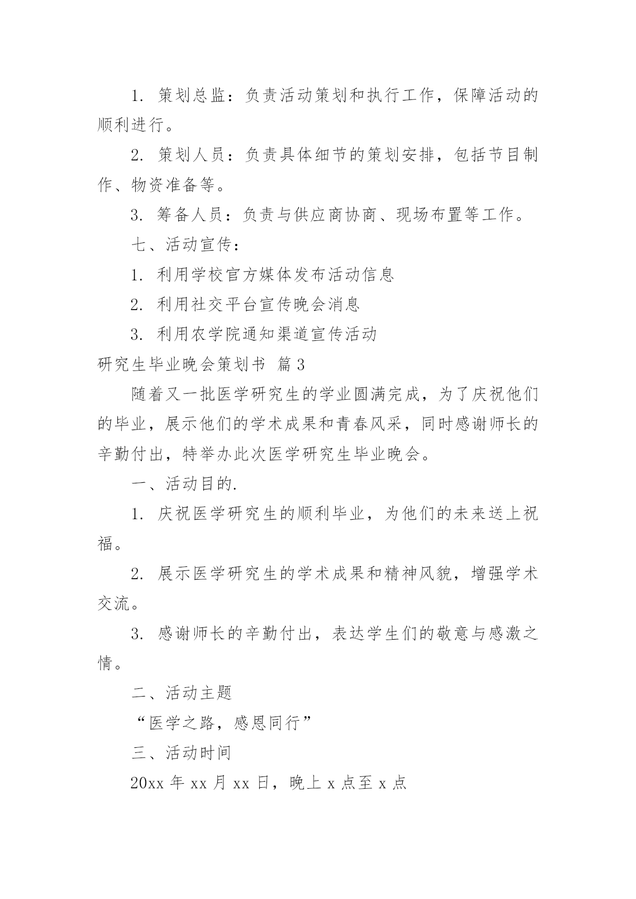 研究生毕业晚会策划书研究生毕业晚会策划书集合[5篇]不经意间,一段时间的工作已经结束了,我们的工作将会有更高的难度,更高的工作目标,是不是要好好写一份策划书了。现在你是否对策划书一筹莫展呢?以下是小编精心整理的研究生毕业晚会策划书,仅供参考,大家一起来看看吧。研究生毕业晚会策划书篇1随着春天的脚步渐近,我校农学研究生们也将迎来他们人生中的一个重要时刻——毕业。为了庆祝这一特殊时刻,展现农学研究生的风采,同时为他们的未来送上祝福,我们计划举办一场别开生面的农学研究生毕业晚会。一、活动目的1.庆祝农学研究生的顺利毕业,肯定他们在学术研究上的辛勤付出。2.展示农学研究生的学术成果和创新能力,增强学科自豪感。3.搭建一个交流的平台,让毕业生们回顾过去,展望未来,共叙师生情谊。4.营造温馨、感人的氛围,让毕业生们感受到学校、老师和同学们的深深祝福。二、活动主题“耕耘梦想,收获未来”三、活动时间xxxx年xx月xx日,晚上x点至x点四、活动地点xx大学农学院礼堂五、活动对象全体农学研究生、导师、学院领导及部分校友六、活动内容1.开场视频:播放一段精心制作的视频,回顾农学研究生们在实验室、田间地头的辛勤耕耘和成长历程,展现他们的青春风采和学术精神。2.领导致辞:由学院领导上台致辞,对毕业生们表示祝贺,肯定他们在学术研究上的成就,并寄予殷切的期望和祝福。3.学术成果展示:邀请优秀毕业生代表上台,通过PPT或视频的形式展示他们的学术成果和研究亮点,分享科研心得和体会。4.感恩环节:毕业生们向导师们献上鲜花或纪念品,表达对导师们的感激之情。导师们也可以借此机会给毕业生们送上寄语和祝福。5.文艺表演:安排一系列精彩的.文艺表演节目,如歌曲、舞蹈、小品等,展现农学研究生们的多才多艺和青春活力。同时,邀请校友和教职工代表进行表演,增强晚会的互动性和参与感。6.互动游戏:设置一些有趣的互动游戏环节,如知识问答、抽奖等,让毕业生们在轻松愉快的氛围中增进友谊,加深感情。7.合影留念:晚会最后,全体人员上台合影留念,留下这一难忘时刻的美好回忆。七、活动宣传通过学院官方网站、微信公众号等渠道进行线上宣传,同时在校园内张贴海报和发放传单进行线下宣传。八、活动组织成立专门的筹备小组,负责活动的策划、组织、执行和后续总结工作。确保活动的顺利进行并达到预期效果。研究生毕业晚会策划书篇2一、活动目的:为即将毕业的农学研究生们举办一场难忘的毕业晚会,回顾学习阶段的点滴成长,展示研究成果,为他们送上祝福与鼓励,激励他们继续在农学领域探索与发展。二、活动时间:20xx年xx月xx日三、活动地点:学校农学院大礼堂四、活动流程:1.开场致辞:农学院院长或系主任向毕业生致辞,鼓励他们将所学知识运用到农业实践中,为农业发展贡献力量。2.毕业生代表分享:几位毕业生代表分享自己的研究成果和在校学习生活中的经历,感慨求学之路的艰辛与收获。3.研究成果展示:展示毕业生的研究成果海报,让同学们互相学习分享,促进学术交流。4.农业科普知识竞赛:设计有趣的'农业科普知识竞赛环节,增加活动的互动性。5.毕业生表演:毕业生们自己准备的农业相关表演,展现他们的创意和团队合作能力。6.颁发毕业证书:学校领导为每位毕业生颁发毕业证书,祝福他们未来的道路顺利。7.毕业典礼:农学院的毕业生们共同合唱农业颂歌,庆祝毕业典礼的成功举办。8.群体照留念:与同学们合影留念,永远铭记毕业时刻的美好。9.毕业晚宴:品尝农学主题晚宴,共同庆祝毕业生们的辛勤付出与成就。10.农业发展展望分享:邀请农业领域的专家学者分享农业发展前景和未来趋势,启发毕业生继续研究与实践。五、活动经费:1.场地租赁费2.晚会人员费用(主持人、演员等)3.奖品及礼品费用4.音响灯光装备费用5.餐饮费用6.海报、证书等制作费用六、活动策划团队:1.策划总监:负责活动策划和执行工作,保障活动的顺利进行。2.策划人员:负责具体细节的策划安排,包括节目制作、物资准备等。3.筹备人员:负责与供应商协商、现场布置等工作。七、活动宣传:1.利用学校官方媒体发布活动信息2.利用社交平台宣传晚会消息3.利用农学院通知渠道宣传活动研究生毕业晚会策划书篇3随着又一批医学研究生的学业圆满完成,为了庆祝他们的毕业,展示他们的学术成果和青春风采,同时感谢师长的辛勤付出,特举办此次医学研究生毕业晚会。一、活动目的.1.庆祝医学研究生的顺利毕业,为他们的未来送上祝福。2.展示医学研究生的学术成果和精神风貌,增强学术交流。3.感谢师长的辛勤付出,表达学生们的敬意与感激之情。二、活动主题“医学之路,感恩同行”三、活动时间20xx年xx月xx日,晚上x点至x点四、活动地点xx大学医学院礼堂五、活动对象全体医学研究生、导师、学院领导及部分校友六、活动内容1.开场舞:由医学研究生舞蹈社团带
