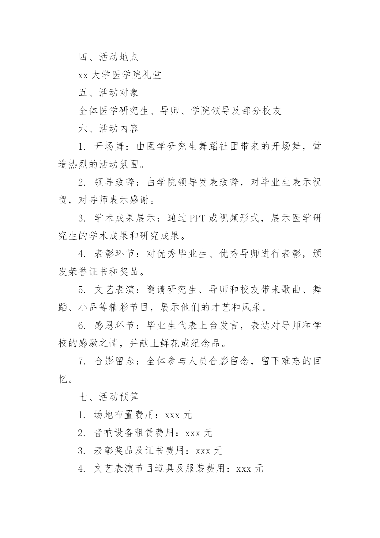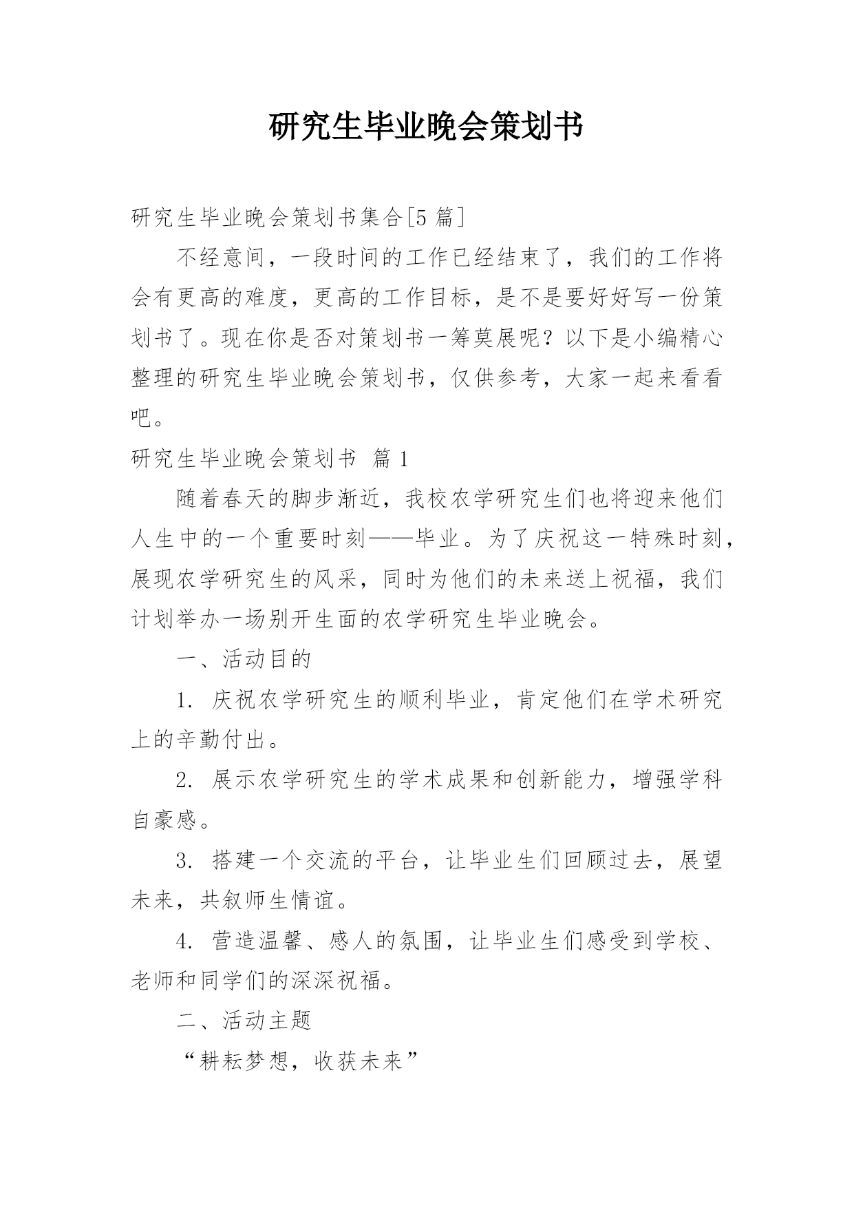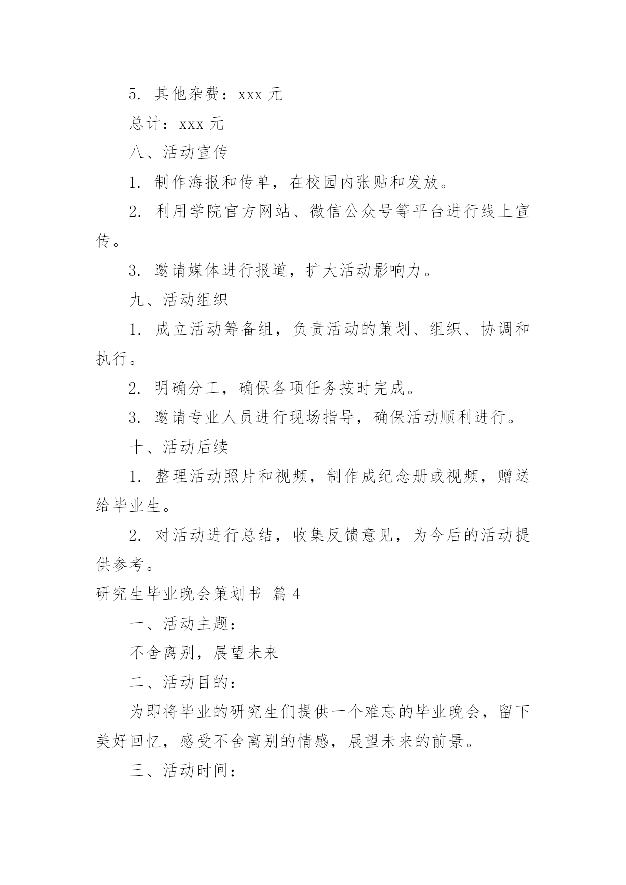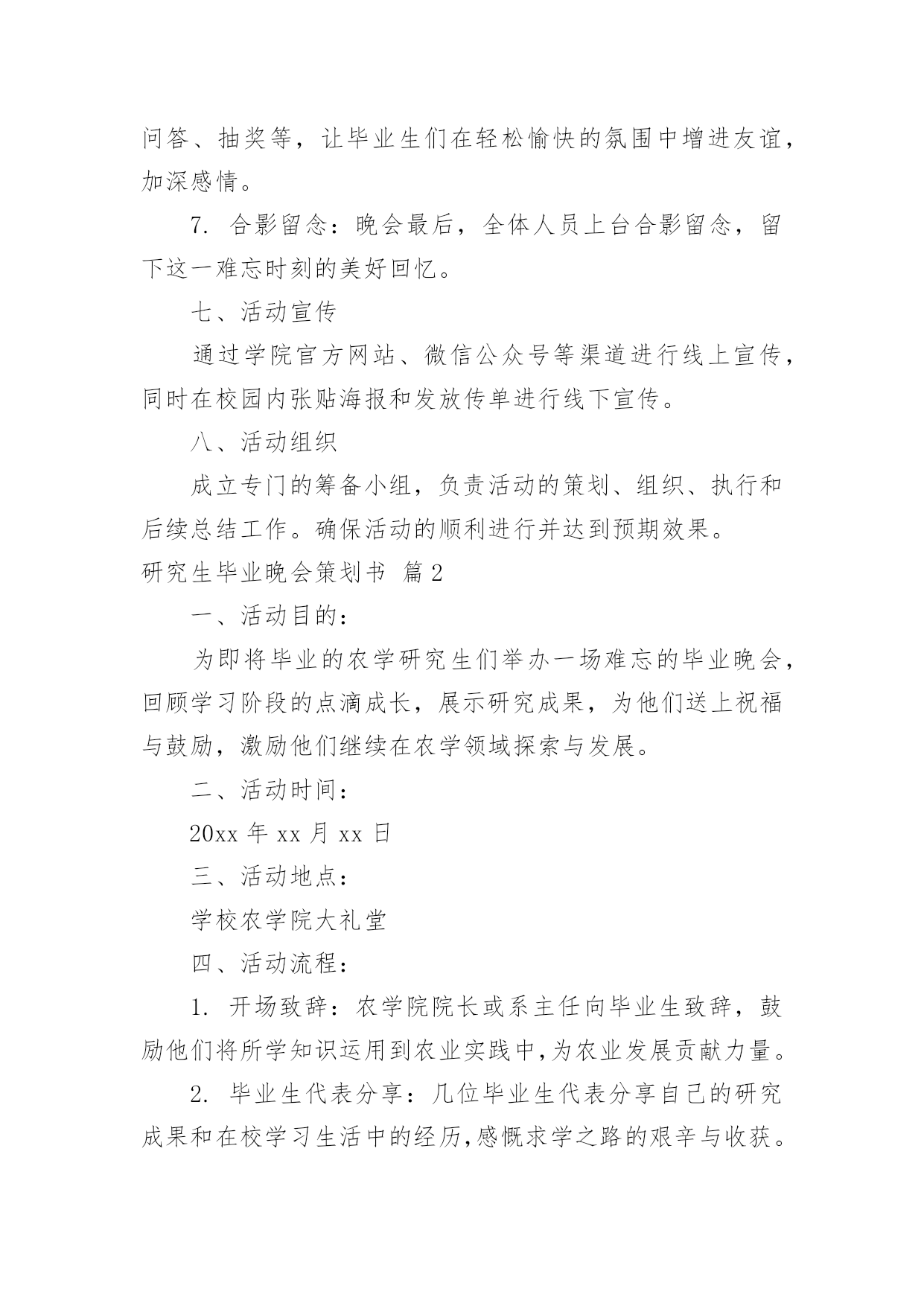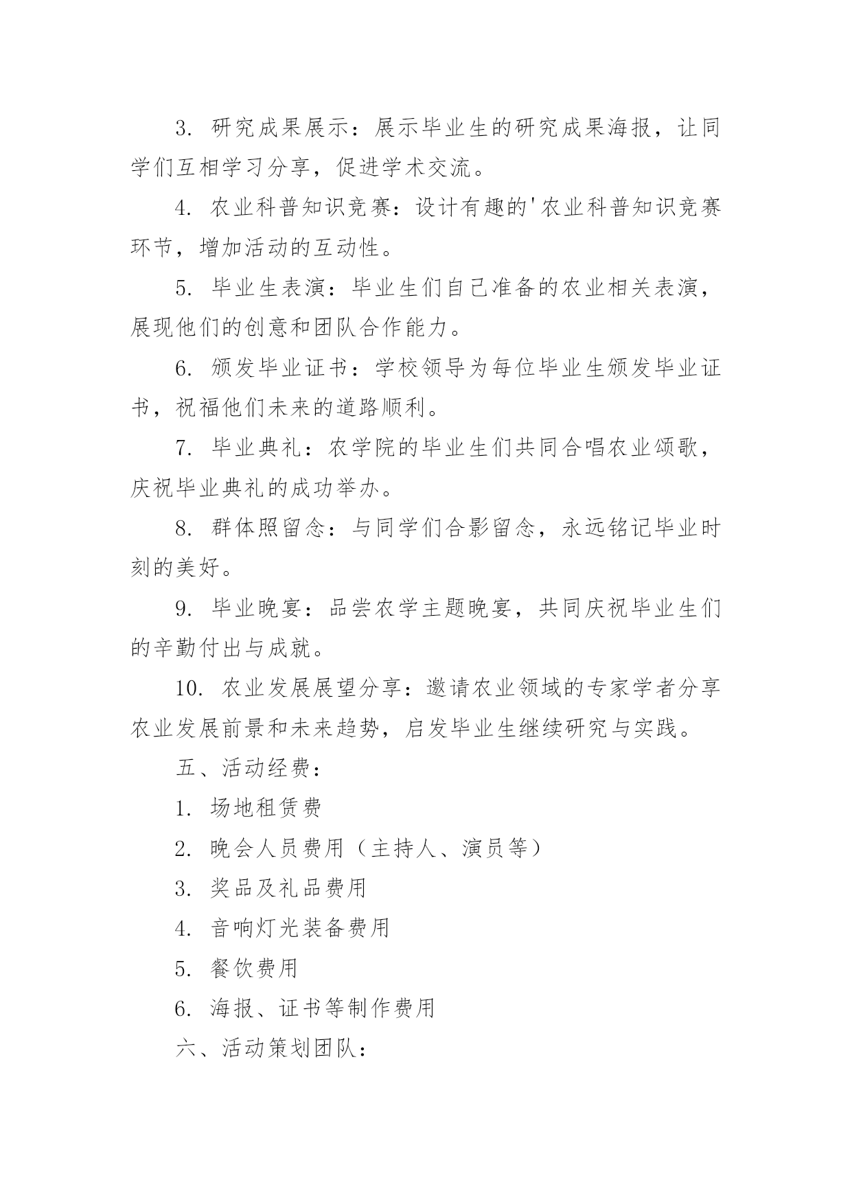 研究生毕业晚会策划书研究生毕业晚会策划书集合[5篇]不经意间,一段时间的工作已经结束了,我们的工作将会有更高的难度,更高的工作目标,是不是要好好写一份策划书了。现在你是否对策划书一筹莫展呢?以下是小编精心整理的研究生毕业晚会策划书,仅供参考,大家一起来看看吧。研究生毕业晚会策划书篇1随着春天的脚步渐近,我校农学研究生们也将迎来他们人生中的一个重要时刻——毕业。为了庆祝这一特殊时刻,展现农学研究生的风采,同时为他们的未来送上祝福,我们计划举办一场别开生面的农学研究生毕业晚会。一、活动目的1.庆祝农学研究生的顺利毕业,肯定他们在学术研究上的辛勤付出。2.展示农学研究生的学术成果和创新能力,增强学科自豪感。3.搭建一个交流的平台,让毕业生们回顾过去,展望未来,共叙师生情谊。4.营造温馨、感人的氛围,让毕业生们感受到学校、老师和同学们的深深祝福。二、活动主题“耕耘梦想,收获未来”三、活动时间xxxx年xx月xx日,晚上x点至x点四、活动地点xx大学农学院礼堂五、活动对象全体农学研究生、导师、学院领导及部分校友六、活动内容1.开场视频:播放一段精心制作的视频,回顾农学研究生们在实验室、田间地头的辛勤耕耘和成长历程,展现他们的青春风采和学术精神。2.领导致辞:由学院领导上台致辞,对毕业生们表示祝贺,肯定他们在学术研究上的成就,并寄予殷切的期望和祝福。3.学术成果展示:邀请优秀毕业生代表上台,通过PPT或视频的形式展示他们的学术成果和研究亮点,分享科研心得和体会。4.感恩环节:毕业生们向导师们献上鲜花或纪念品,表达对导师们的感激之情。导师们也可以借此机会给毕业生们送上寄语和祝福。5.文艺表演:安排一系列精彩的.文艺表演节目,如歌曲、舞蹈、小品等,展现农学研究生们的多才多艺和青春活力。同时,邀请校友和教职工代表进行表演,增强晚会的互动性和参与感。6.互动游戏:设置一些有趣的互动游戏环节,如知识问答、抽奖等,让毕业生们在轻松愉快的氛围中增进友谊,加深感情。7.合影留念:晚会最后,全体人员上台合影留念,留下这一难忘时刻的美好回忆。七、活动宣传通过学院官方网站、微信公众号等渠道进行线上宣传,同时在校园内张贴海报和发放传单进行线下宣传。八、活动组织成立专门的筹备小组,负责活动的策划、组织、执行和后续总结工作。确保活动的顺利进行并达到预期效果。研究生毕业晚会策划书篇2一、活动目的:为即将毕业的农学研究生们举办一场难忘的毕业晚会,回顾学习阶段的点滴成长,展示研究成果,为他们送上祝福与鼓励,激励他们继续在农学领域探索与发展。二、活动时间:20xx年xx月xx日三、活动地点:学校农学院大礼堂四、活动流程:1.开场致辞:农学院院长或系主任向毕业生致辞,鼓励他们将所学知识运用到农业实践中,为农业发展贡献力量。2.毕业生代表分享:几位毕业生代表分享自己的研究成果和在校学习生活中的经历,感慨求学之路的艰辛与收获。3.研究成果展示:展示毕业生的研究成果海报,让同学们互相学习分享,促进学术交流。4.农业科普知识竞赛:设计有趣的'农业科普知识竞赛环节,增加活动的互动性。5.毕业生表演:毕业生们自己准备的农业相关表演,展现他们的创意和团队合作能力。6.颁发毕业证书:学校领导为每位毕业生颁发毕业证书,祝福他们未来的道路顺利。7.毕业典礼:农学院的毕业生们共同合唱农业颂歌,庆祝毕业典礼的成功举办。8.群体照留念:与同学们合影留念,永远铭记毕业时刻的美好。9.毕业晚宴:品尝农学主题晚宴,共同庆祝毕业生们的辛勤付出与成就。10.农业发展展望分享:邀请农业领域的专家学者分享农业发展前景和未来趋势,启发毕业生继续研究与实践。五、活动经费:1.场地租赁费2.晚会人员费用(主持人、演员等)3.奖品及礼品费用4.音响灯光装备费用5.餐饮费用6.海报、证书等制作费用六、活动策划团队:1.策划总监:负责活动策划和执行工作,保障活动的顺利进行。2.策划人员:负责具体细节的策划安排,包括节目制作、物资准备等。3.筹备人员:负责与供应商协商、现场布置等工作。七、活动宣传:1.利用学校官方媒体发布活动信息2.利用社交平台宣传晚会消息3.利用农学院通知渠道宣传活动研究生毕业晚会策划书篇3随着又一批医学研究生的学业圆满完成,为了庆祝他们的毕业,展示他们的学术成果和青春风采,同时感谢师长的辛勤付出,特举办此次医学研究生毕业晚会。一、活动目的.1.庆祝医学研究生的顺利毕业,为他们的未来送上祝福。2.展示医学研究生的学术成果和精神风貌,增强学术交流。3.感谢师长的辛勤付出,表达学生们的敬意与感激之情。二、活动主题“医学之路,感恩同行”三、活动时间20xx年xx月xx日,晚上x点至x点四、活动地点xx大学医学院礼堂五、活动对象全体医学研究生、导师、学院领导及部分校友六、活动内容1.开场舞:由医学研究生舞蹈社团带