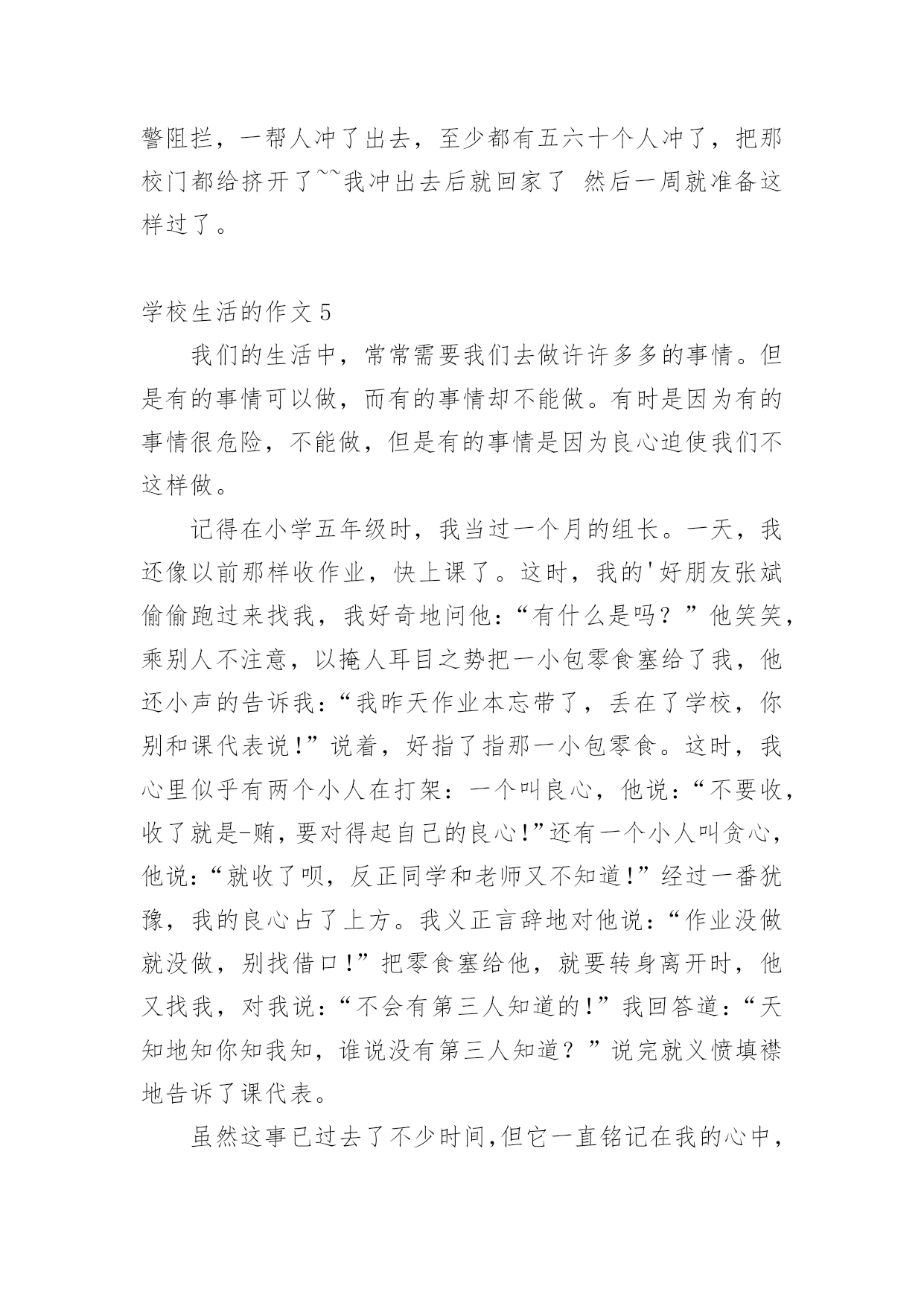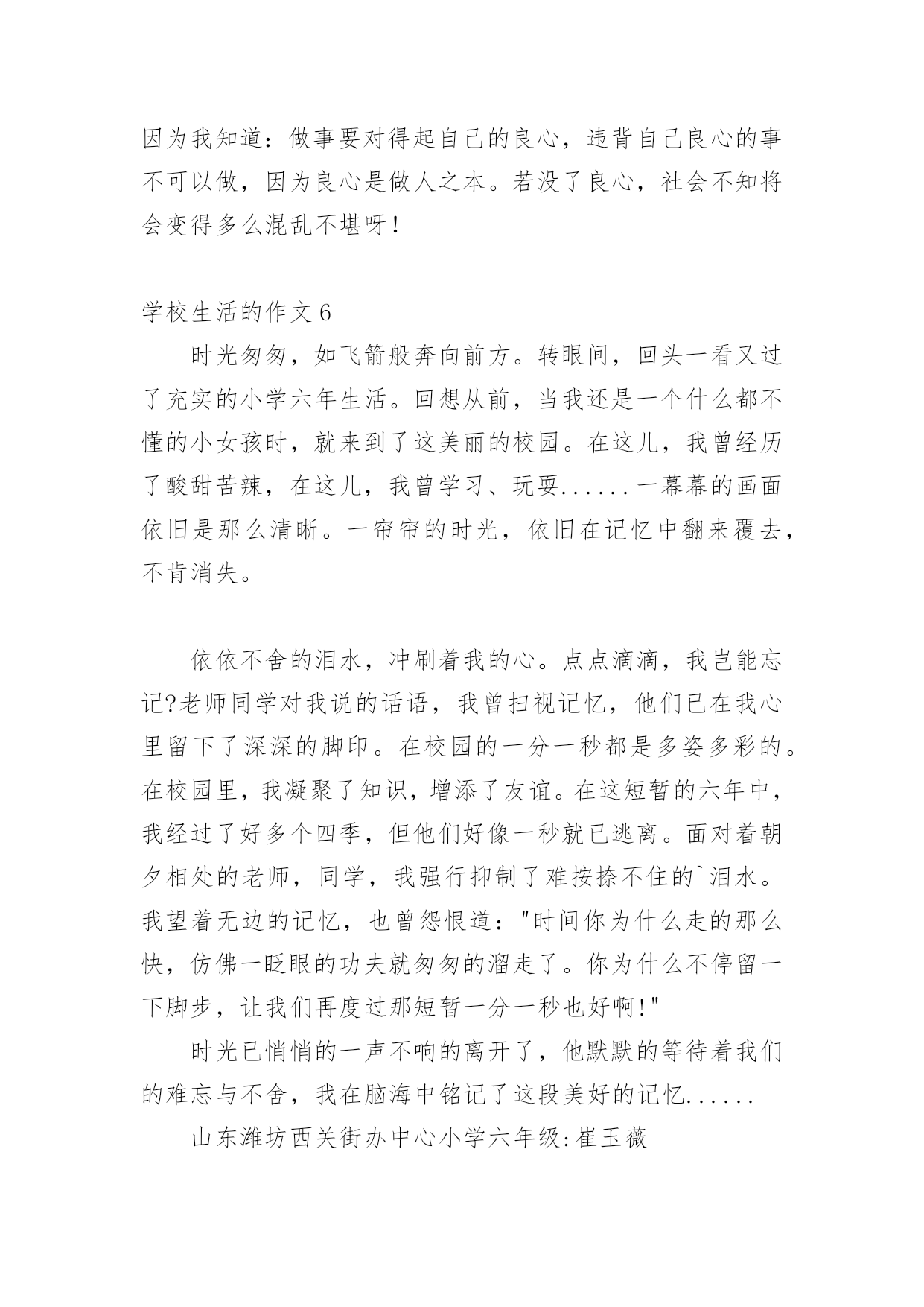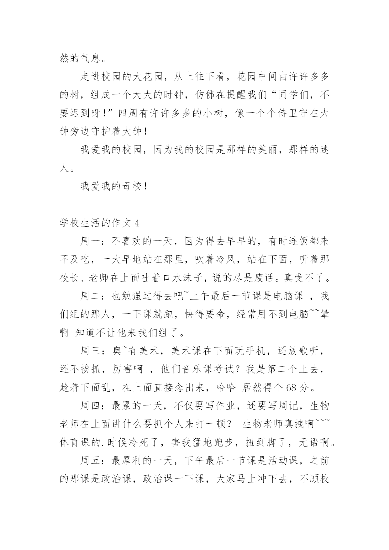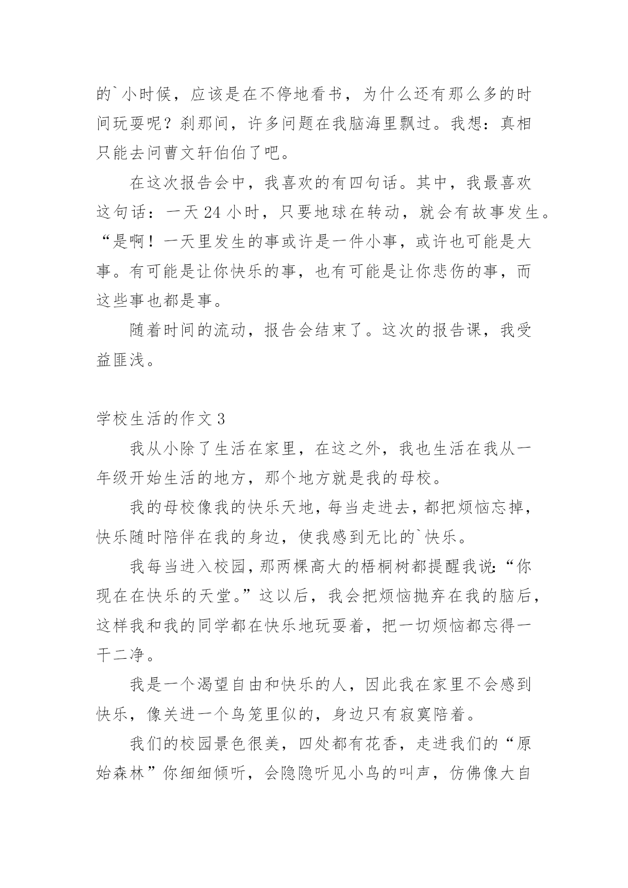 学校生活的作文学校生活的作文汇编15篇在日常学习、工作抑或是生活中,大家都经常接触到作文吧,作文根据体裁的不同可以分为记叙文、说明文、应用文、议论文。那么你有了解过作文吗?下面是小编帮大家整理的学校生活的作文,希望对大家有所帮助。学校生活的作文1这段时间,郑州市有许多小学开始了一件不同寻常的事,那就是中午学生们可以在学校用午餐,我们学校也在11月初开始实行。每天上午我们放学前配餐公司都会把午餐送到我们学校,我们一放学就能吃上饭。这一举动无疑令学生们十分开心,我们班20多名同学报名在校用餐。我因为离家比较远,所以也申请了在校用餐,由于同学们比较多,老师忙不过来,每天都有家长志愿者来帮忙,还有两位同学也会成为午餐的负责人员,给同学们发饭。这样每位同学都贡献了自己的服务,不再是一直接受别人的付出。校吃饭我觉得非常好。开始我们都不是对饭有什么兴趣,为的就是吃完饭那段休闲时刻,所以报名许多同学觉得在学校吃饭是一件很非常开心的.事。第一天我们对这个活动的印象是饭菜不是很好吃,但也不难吃。吃完饭休息一会儿就可以自由活动一会,娱乐时间不短,同学们三个一堆儿,五个一群凑在一起做游戏,我们玩儿的不亦乐乎。我们午饭后最喜欢的游戏就是狼人杀,每次都是一大堆的同学在一起,这种娱乐一直到现在都颇得同学们的喜爱,几个星期了也没有厌烦。之后就是午自习的时间,大部分同学都有的写作业,有的看书,有的午睡。这样一来,同学们在校的午餐时间也挺充实。在校用餐的这个活动,我个人觉得非常满意,既能放学就吃上饭省去了来回跑的时间,又丰富了我的课余生活!学校生活的作文2今天,天空中烟雨蒙蒙的,似乎有点冷。可是我们的心却特别的兴奋和激动。因为北京大学的教授,著名儿童文学作家————曹文轩伯伯要来我们学校讲课。冒着蒙蒙细雨,我们向东湖体育馆前进。一进大门,“教孩子读书,给孩子未来。”这十个打字便随之布入眼帘。接着我们坐在自己班级的位置上等待报告会的开始。同学们陆陆续续地进入会场。当大家坐满整个会场时,报告会开始了。当曹文轩伯伯走上台时,同学们都显得特别激动,都兴奋地说:“他就是著名的大作家曹文轩伯伯呀…”有的人都恨不得马上拿出照相机和曹文轩伯伯合个影呢!当曹文轩伯伯聊到自己写的书《草房子》时,同学们的耳朵都是竖起来的。当伯伯说。《草房子》中的男孩桑桑讲的就是自己的时候,我呆住了。因为在我的印象里,大作家的`小时候,应该是在不停地看书,为什么还有那么多的时间玩耍呢?刹那间,许多问题在我脑海里飘过。我想:真相只能去问曹文轩伯伯了吧。在这次报告会中,我喜欢的有四句话。其中,我最喜欢这句话:一天24小时,只要地球在转动,就会有故事发生。“是啊!一天里发生的事或许是一件小事,或许也可能是大事。有可能是让你快乐的事,也有可能是让你悲伤的事,而这些事也都是事。随着时间的流动,报告会结束了。这次的报告课,我受益匪浅。学校生活的作文3我从小除了生活在家里,在这之外,我也生活在我从一年级开始生活的地方,那个地方就是我的母校。我的母校像我的快乐天地,每当走进去,都把烦恼忘掉,快乐随时陪伴在我的身边,使我感到无比的`快乐。我每当进入校园,那两棵高大的梧桐树都提醒我说:“你现在在快乐的天堂。”这以后,我会把烦恼抛弃在我的脑后,这样我和我的同学都在快乐地玩耍着,把一切烦恼都忘得一干二净。我是一个渴望自由和快乐的人,因此我在家里不会感到快乐,像关进一个鸟笼里似的,身边只有寂寞陪着。我们的校园景色很美,四处都有花香,走进我们的“原始森林”你细细倾听,会隐隐听见小鸟的叫声,仿佛像大自然的气息。走进校园的大花园,从上往下看,花园中间由许许多多的树,组成一个大大的时钟,仿佛在提醒我们“同学们,不要迟到呀!”四周有许许多多的小树,像一个个侍卫守在大钟旁边守护着大钟!我爱我的校园,因为我的校园是那样的美丽,那样的迷人。我爱我的母校!学校生活的作文4周一:不喜欢的一天,因为得去早早的,有时连饭都来不及吃,一大早地站在那里,吹着冷风,站在下面,听着那校长、老师在上面吐着口水沫子,说的尽是废话。真受不了。周二:也勉强过得去吧~上午最后一节课是电脑课,我们组的那人,一下课就跑,快得要命,经常用不到电脑~~晕啊知道不让他来我们组了。周三:奥~有美术,美术课在下面玩手机,还放歌听,还不挨抓,厉害啊,他们音乐课考试?我是第二个上去,趁着下面乱,在上面直接念出来,哈哈居然得个68分。周四:最累的一天,不仅要写作业,还要写周记,生物老师在上面讲什么要抓个人来打一顿?生物老师真拽啊~~~体育课的.时候冷死了,害我猛地跑步,扭到脚了,无语啊。周五:最犀利的一天,下午最后一节课是活动课,之前的那课是政治课,政治课一下课,大家马上冲下去,不顾校警阻拦,一帮人冲了出去,至少都有五六十个人冲了,把那校门都给挤开了~~我冲出去后就回家了然后一周就准
