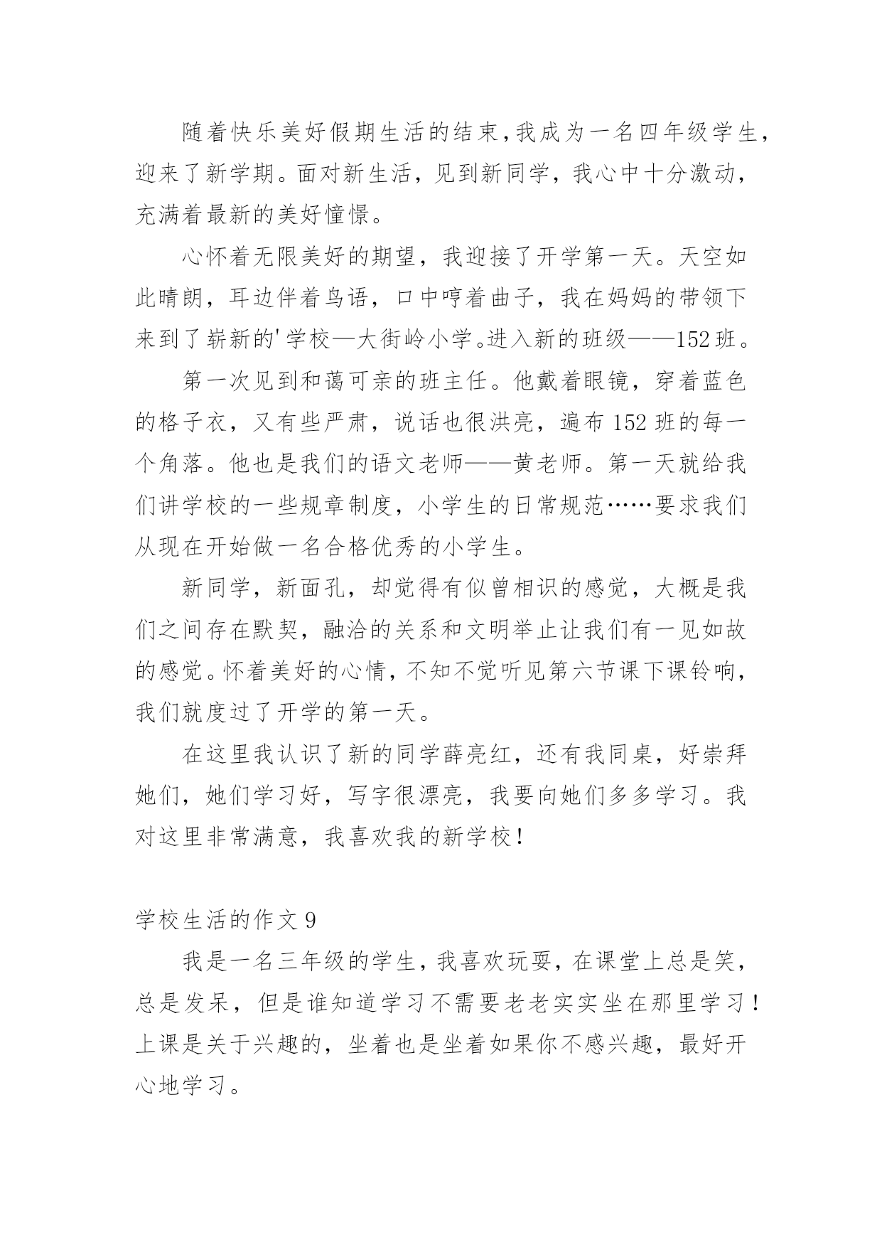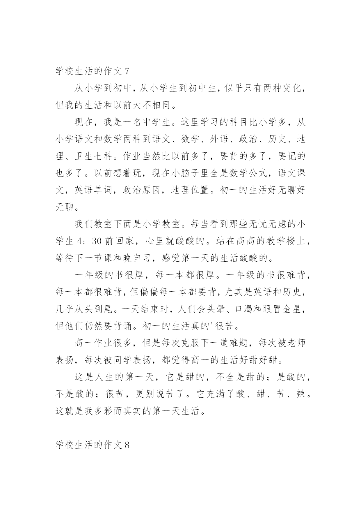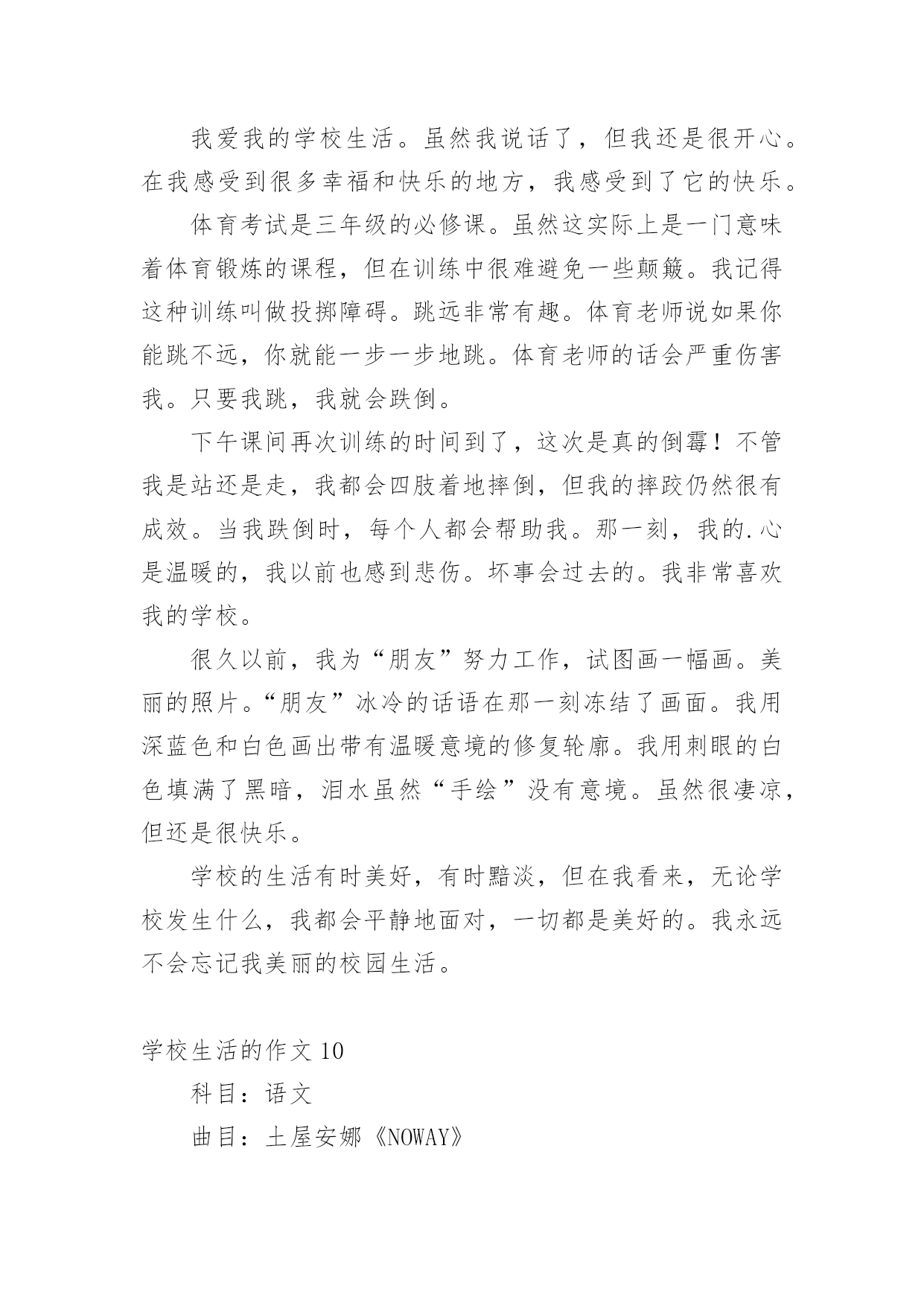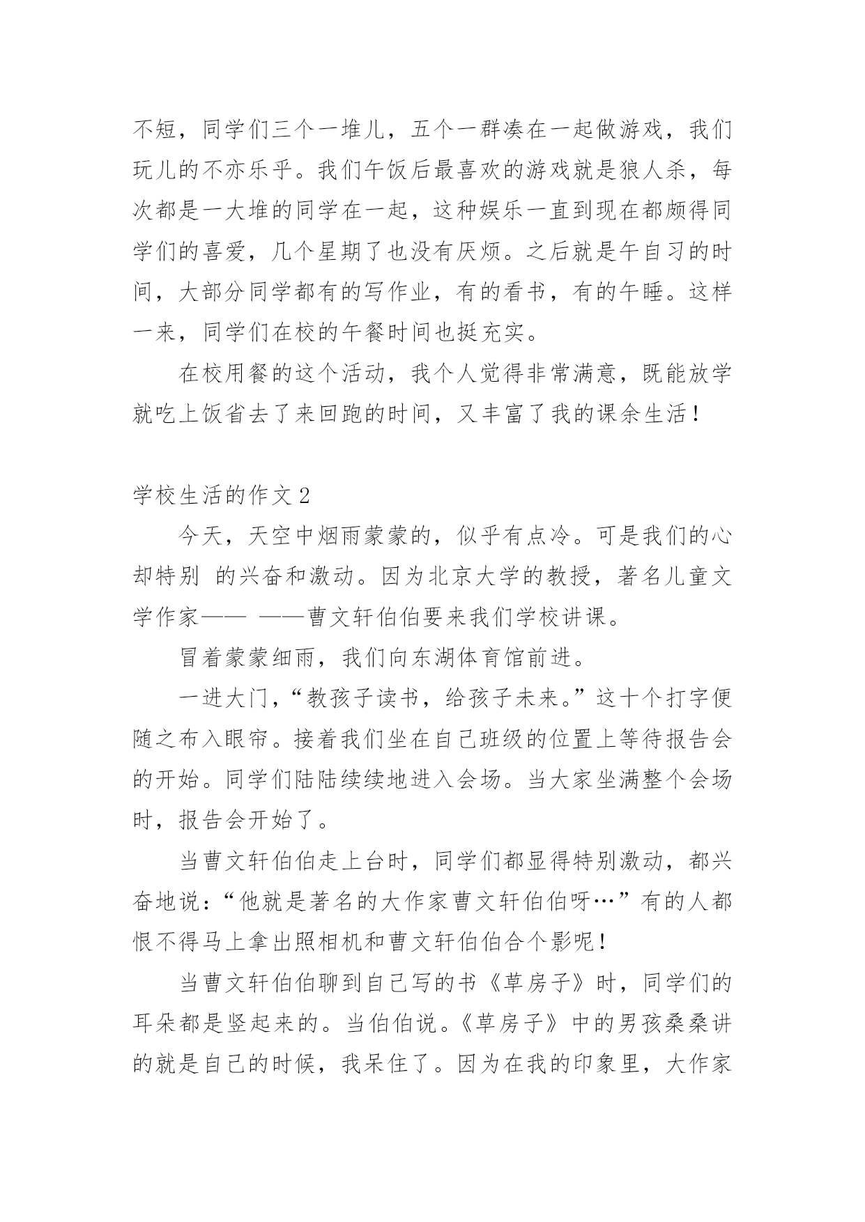 学校生活的作文学校生活的作文汇编15篇在日常学习、工作抑或是生活中,大家都经常接触到作文吧,作文根据体裁的不同可以分为记叙文、说明文、应用文、议论文。那么你有了解过作文吗?下面是小编帮大家整理的学校生活的作文,希望对大家有所帮助。学校生活的作文1这段时间,郑州市有许多小学开始了一件不同寻常的事,那就是中午学生们可以在学校用午餐,我们学校也在11月初开始实行。每天上午我们放学前配餐公司都会把午餐送到我们学校,我们一放学就能吃上饭。这一举动无疑令学生们十分开心,我们班20多名同学报名在校用餐。我因为离家比较远,所以也申请了在校用餐,由于同学们比较多,老师忙不过来,每天都有家长志愿者来帮忙,还有两位同学也会成为午餐的负责人员,给同学们发饭。这样每位同学都贡献了自己的服务,不再是一直接受别人的付出。校吃饭我觉得非常好。开始我们都不是对饭有什么兴趣,为的就是吃完饭那段休闲时刻,所以报名许多同学觉得在学校吃饭是一件很非常开心的.事。第一天我们对这个活动的印象是饭菜不是很好吃,但也不难吃。吃完饭休息一会儿就可以自由活动一会,娱乐时间不短,同学们三个一堆儿,五个一群凑在一起做游戏,我们玩儿的不亦乐乎。我们午饭后最喜欢的游戏就是狼人杀,每次都是一大堆的同学在一起,这种娱乐一直到现在都颇得同学们的喜爱,几个星期了也没有厌烦。之后就是午自习的时间,大部分同学都有的写作业,有的看书,有的午睡。这样一来,同学们在校的午餐时间也挺充实。在校用餐的这个活动,我个人觉得非常满意,既能放学就吃上饭省去了来回跑的时间,又丰富了我的课余生活!学校生活的作文2今天,天空中烟雨蒙蒙的,似乎有点冷。可是我们的心却特别的兴奋和激动。因为北京大学的教授,著名儿童文学作家————曹文轩伯伯要来我们学校讲课。冒着蒙蒙细雨,我们向东湖体育馆前进。一进大门,“教孩子读书,给孩子未来。”这十个打字便随之布入眼帘。接着我们坐在自己班级的位置上等待报告会的开始。同学们陆陆续续地进入会场。当大家坐满整个会场时,报告会开始了。当曹文轩伯伯走上台时,同学们都显得特别激动,都兴奋地说:“他就是著名的大作家曹文轩伯伯呀…”有的人都恨不得马上拿出照相机和曹文轩伯伯合个影呢!当曹文轩伯伯聊到自己写的书《草房子》时,同学们的耳朵都是竖起来的。当伯伯说。《草房子》中的男孩桑桑讲的就是自己的时候,我呆住了。因为在我的印象里,大作家的`小时候,应该是在不停地看书,为什么还有那么多的时间玩耍呢?刹那间,许多问题在我脑海里飘过。我想:真相只能去问曹文轩伯伯了吧。在这次报告会中,我喜欢的有四句话。其中,我最喜欢这句话:一天24小时,只要地球在转动,就会有故事发生。“是啊!一天里发生的事或许是一件小事,或许也可能是大事。有可能是让你快乐的事,也有可能是让你悲伤的事,而这些事也都是事。随着时间的流动,报告会结束了。这次的报告课,我受益匪浅。学校生活的作文3我从小除了生活在家里,在这之外,我也生活在我从一年级开始生活的地方,那个地方就是我的母校。我的母校像我的快乐天地,每当走进去,都把烦恼忘掉,快乐随时陪伴在我的身边,使我感到无比的`快乐。我每当进入校园,那两棵高大的梧桐树都提醒我说:“你现在在快乐的天堂。”这以后,我会把烦恼抛弃在我的脑后,这样我和我的同学都在快乐地玩耍着,把一切烦恼都忘得一干二净。我是一个渴望自由和快乐的人,因此我在家里不会感到快乐,像关进一个鸟笼里似的,身边只有寂寞陪着。我们的校园景色很美,四处都有花香,走进我们的“原始森林”你细细倾听,会隐隐听见小鸟的叫声,仿佛像大自然的气息。走进校园的大花园,从上往下看,花园中间由许许多多的树,组成一个大大的时钟,仿佛在提醒我们“同学们,不要迟到呀!”四周有许许多多的小树,像一个个侍卫守在大钟旁边守护着大钟!我爱我的校园,因为我的校园是那样的美丽,那样的迷人。我爱我的母校!学校生活的作文4周一:不喜欢的一天,因为得去早早的,有时连饭都来不及吃,一大早地站在那里,吹着冷风,站在下面,听着那校长、老师在上面吐着口水沫子,说的尽是废话。真受不了。周二:也勉强过得去吧~上午最后一节课是电脑课,我们组的那人,一下课就跑,快得要命,经常用不到电脑~~晕啊知道不让他来我们组了。周三:奥~有美术,美术课在下面玩手机,还放歌听,还不挨抓,厉害啊,他们音乐课考试?我是第二个上去,趁着下面乱,在上面直接念出来,哈哈居然得个68分。周四:最累的一天,不仅要写作业,还要写周记,生物老师在上面讲什么要抓个人来打一顿?生物老师真拽啊~~~体育课的.时候冷死了,害我猛地跑步,扭到脚了,无语啊。周五:最犀利的一天,下午最后一节课是活动课,之前的那课是政治课,政治课一下课,大家马上冲下去,不顾校警阻拦,一帮人冲了出去,至少都有五六十个人冲了,把那校门都给挤开了~~我冲出去后就回家了然后一周就准