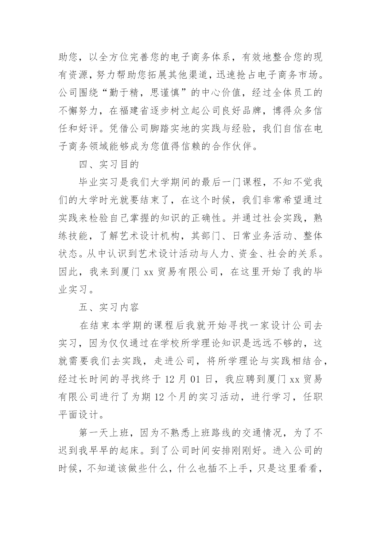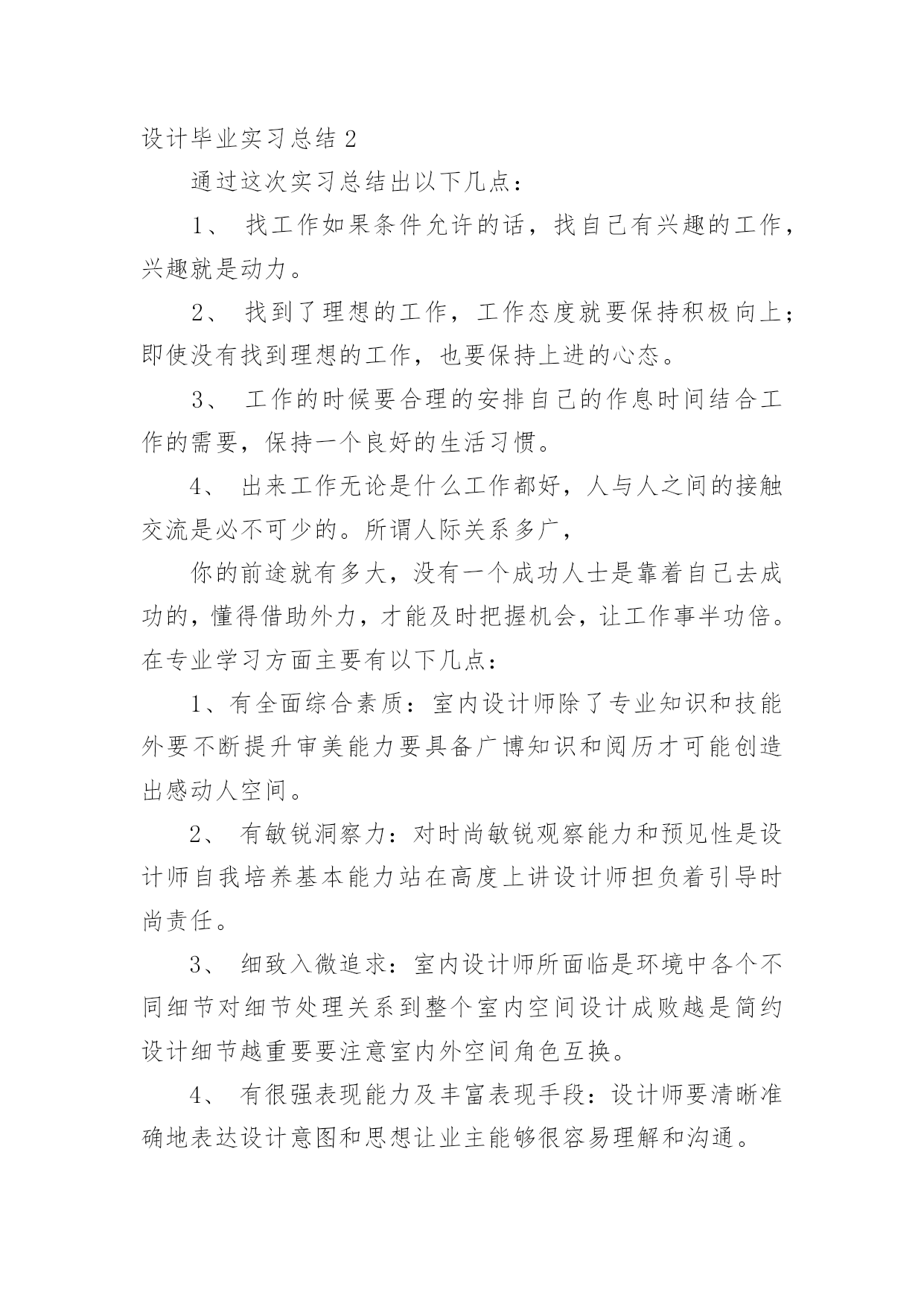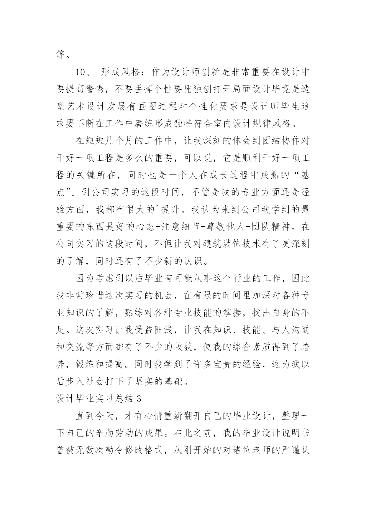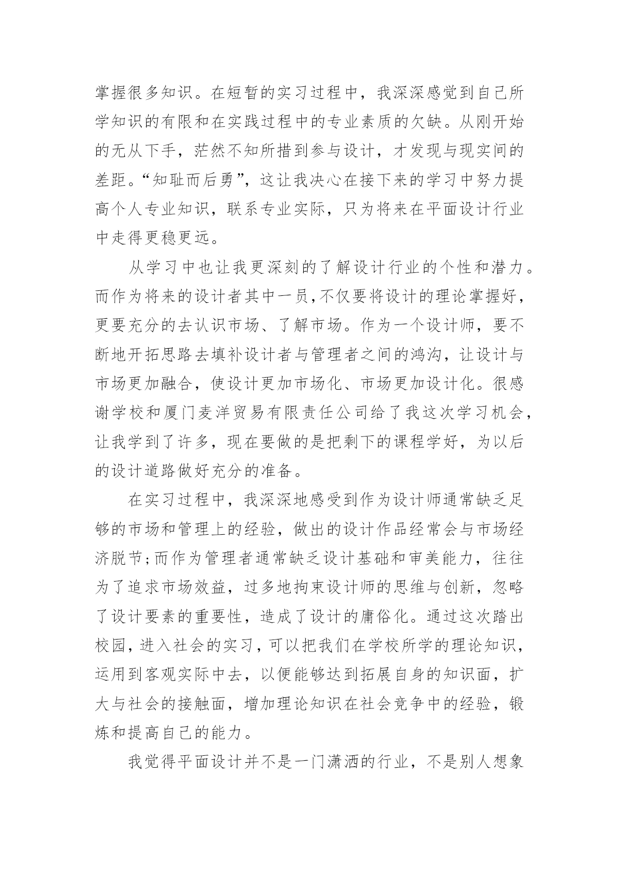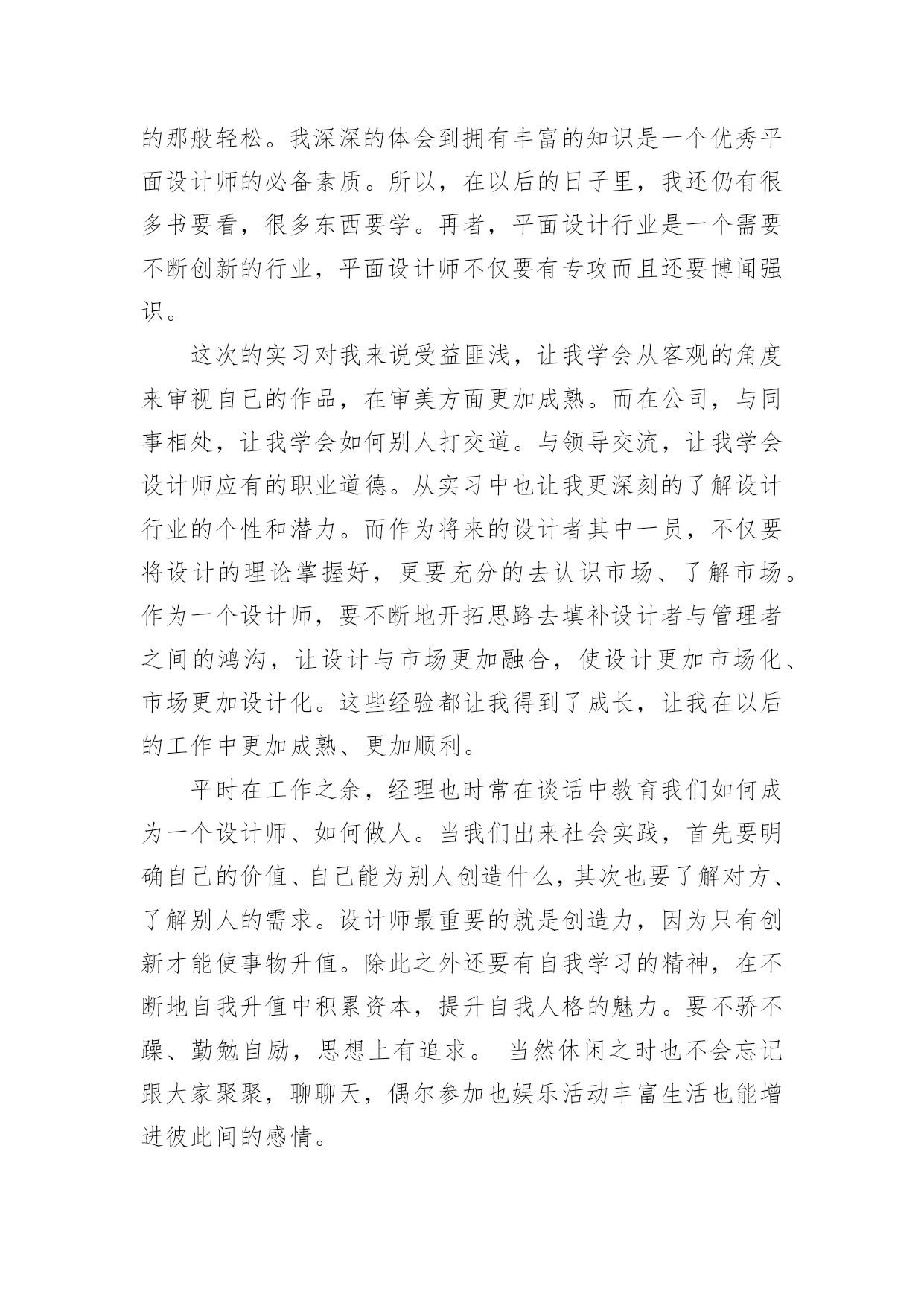 设计毕业实习总结设计毕业实习总结通用15篇总结是事后对某一阶段的学习或工作情况作加以回顾检查并分析评价的书面材料,写总结有利于我们学习和工作能力的提高,是时候写一份总结了。我们该怎么去写总结呢?下面是小编为大家收集的设计毕业实习总结,欢迎阅读与收藏。设计毕业实习总结1我在实习的过程中学到了许多课本上无法学到的经验,因为在学校中我们的创意和设计都只局限于作业之中,但如果在公司里,我们的创意还必须得到客户和经理的认同,这是严格许多的。我们必须尽量发挥自己的创意,同时也要兼顾客户的要求和市场的效益。要多与客户沟通,多向主管询问意见,多向身边同事请教。从多方面学习知识不断丰富自己,让自己不断进步。并运用校内所学的知识,同时也要兼顾客户的要求和市场的效益。多与客户沟通,多向主管询问意见,多向身边同事请教。学习作为一个平面设计师的职业规范和素养;视觉设计能力、美工基础,色彩搭配能力等。从多方面学习知识不断丰富自己,让自己不断进步。在平面设计实习期间,让我真正的了解到一名合格的.平面设计师不是那么容易做的,从事平面设计这一行业需要掌握很多知识。在短暂的实习过程中,我深深感觉到自己所学知识的有限和在实践过程中的专业素质的欠缺。从刚开始的无从下手,茫然不知所措到参与设计,才发现与现实间的差距。“知耻而后勇”,这让我决心在接下来的学习中努力提高个人专业知识,联系专业实际,只为将来在平面设计行业中走得更稳更远。从学习中也让我更深刻的了解设计行业的个性和潜力。而作为将来的设计者其中一员,不仅要将设计的理论掌握好,更要充分的去认识市场、了解市场。作为一个设计师,要不断地开拓思路去填补设计者与管理者之间的鸿沟,让设计与市场更加融合,使设计更加市场化、市场更加设计化。很感谢学校和厦门麦洋贸易有限责任公司给了我这次学习机会,让我学到了许多,现在要做的是把剩下的课程学好,为以后的设计道路做好充分的准备。在实习过程中,我深深地感受到作为设计师通常缺乏足够的市场和管理上的经验,做出的设计作品经常会与市场经济脱节;而作为管理者通常缺乏设计基础和审美能力,往往为了追求市场效益,过多地拘束设计师的思维与创新,忽略了设计要素的重要性,造成了设计的庸俗化。通过这次踏出校园,进入社会的实习,可以把我们在学校所学的理论知识,运用到客观实际中去,以便能够达到拓展自身的知识面,扩大与社会的接触面,增加理论知识在社会竞争中的经验,锻炼和提高自己的能力。我觉得平面设计并不是一门潇洒的行业,不是别人想象的那般轻松。我深深的体会到拥有丰富的知识是一个优秀平面设计师的必备素质。所以,在以后的日子里,我还仍有很多书要看,很多东西要学。再者,平面设计行业是一个需要不断创新的行业,平面设计师不仅要有专攻而且还要博闻强识。这次的实习对我来说受益匪浅,让我学会从客观的角度来审视自己的作品,在审美方面更加成熟。而在公司,与同事相处,让我学会如何别人打交道。与领导交流,让我学会设计师应有的职业道德。从实习中也让我更深刻的了解设计行业的个性和潜力。而作为将来的设计者其中一员,不仅要将设计的理论掌握好,更要充分的去认识市场、了解市场。作为一个设计师,要不断地开拓思路去填补设计者与管理者之间的鸿沟,让设计与市场更加融合,使设计更加市场化、市场更加设计化。这些经验都让我得到了成长,让我在以后的工作中更加成熟、更加顺利。平时在工作之余,经理也时常在谈话中教育我们如何成为一个设计师、如何做人。当我们出来社会实践,首先要明确自己的价值、自己能为别人创造什么,其次也要了解对方、了解别人的需求。设计师最重要的就是创造力,因为只有创新才能使事物升值。除此之外还要有自我学习的精神,在不断地自我升值中积累资本,提升自我人格的魅力。要不骄不躁、勤勉自励,思想上有追求。当然休闲之时也不会忘记跟大家聚聚,聊聊天,偶尔参加也娱乐活动丰富生活也能增进彼此间的感情。设计毕业实习总结2通过这次实习总结出以下几点:1、找工作如果条件允许的话,找自己有兴趣的工作,兴趣就是动力。2、找到了理想的工作,工作态度就要保持积极向上;即使没有找到理想的工作,也要保持上进的心态。3、工作的时候要合理的安排自己的作息时间结合工作的需要,保持一个良好的生活习惯。4、出来工作无论是什么工作都好,人与人之间的接触交流是必不可少的。所谓人际关系多广,你的前途就有多大,没有一个成功人士是靠着自己去成功的,懂得借助外力,才能及时把握机会,让工作事半功倍。在专业学习方面主要有以下几点:1、有全面综合素质:室内设计师除了专业知识和技能外要不断提升审美能力要具备广博知识和阅历才可能创造出感动人空间。2、有敏锐洞察力:对时尚敏锐观察能力和预见性是设计师自我培养基本能力站在高度上讲设计师担负着引导时尚责任。3、细致入微追求:室内设计师所面临是环境中各个不同细节对细节处理关系到整