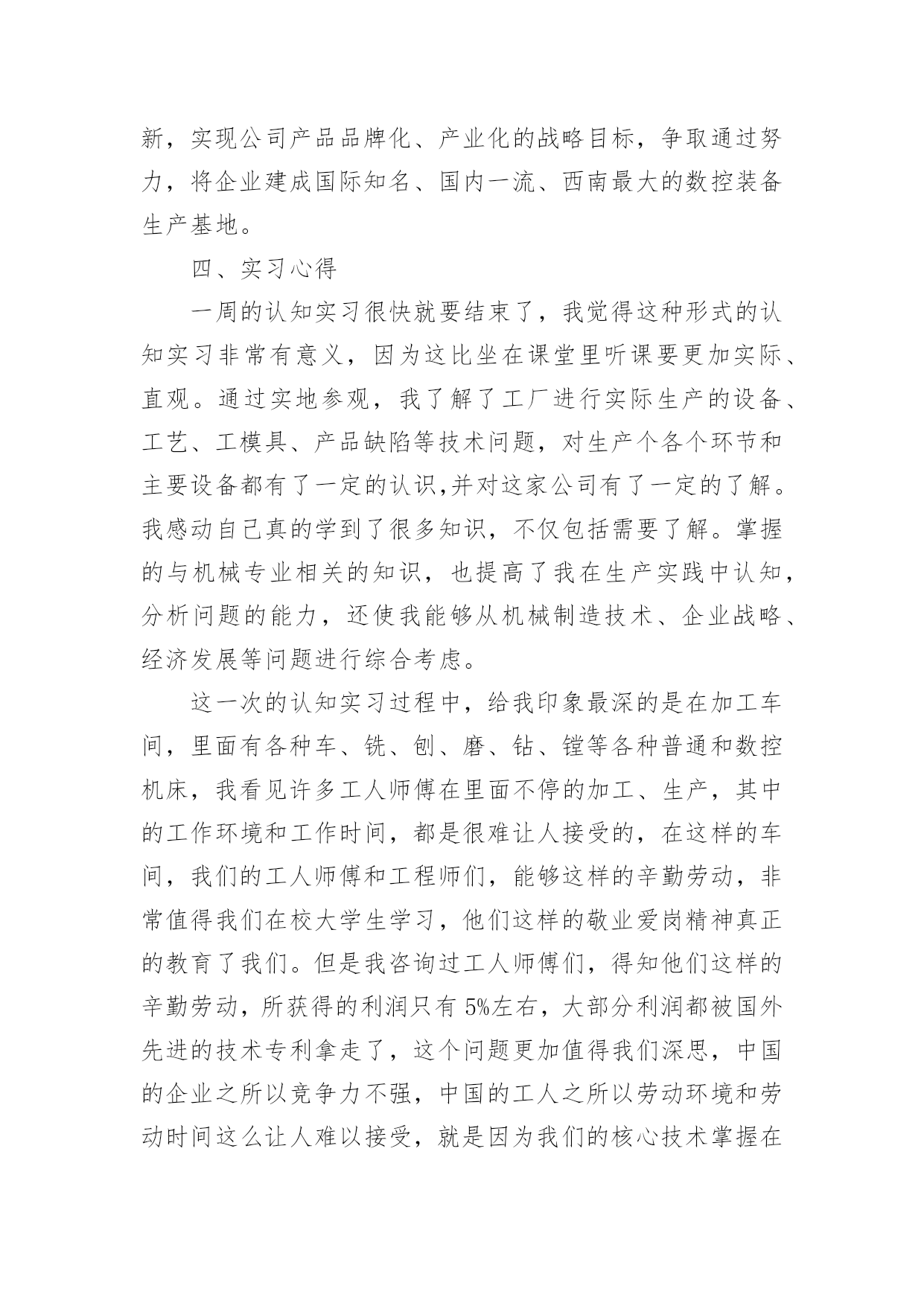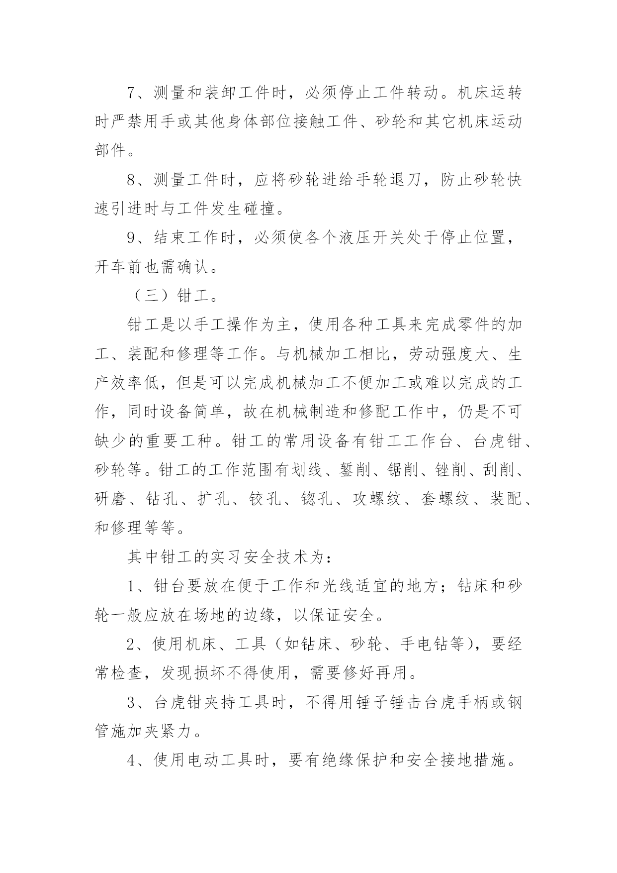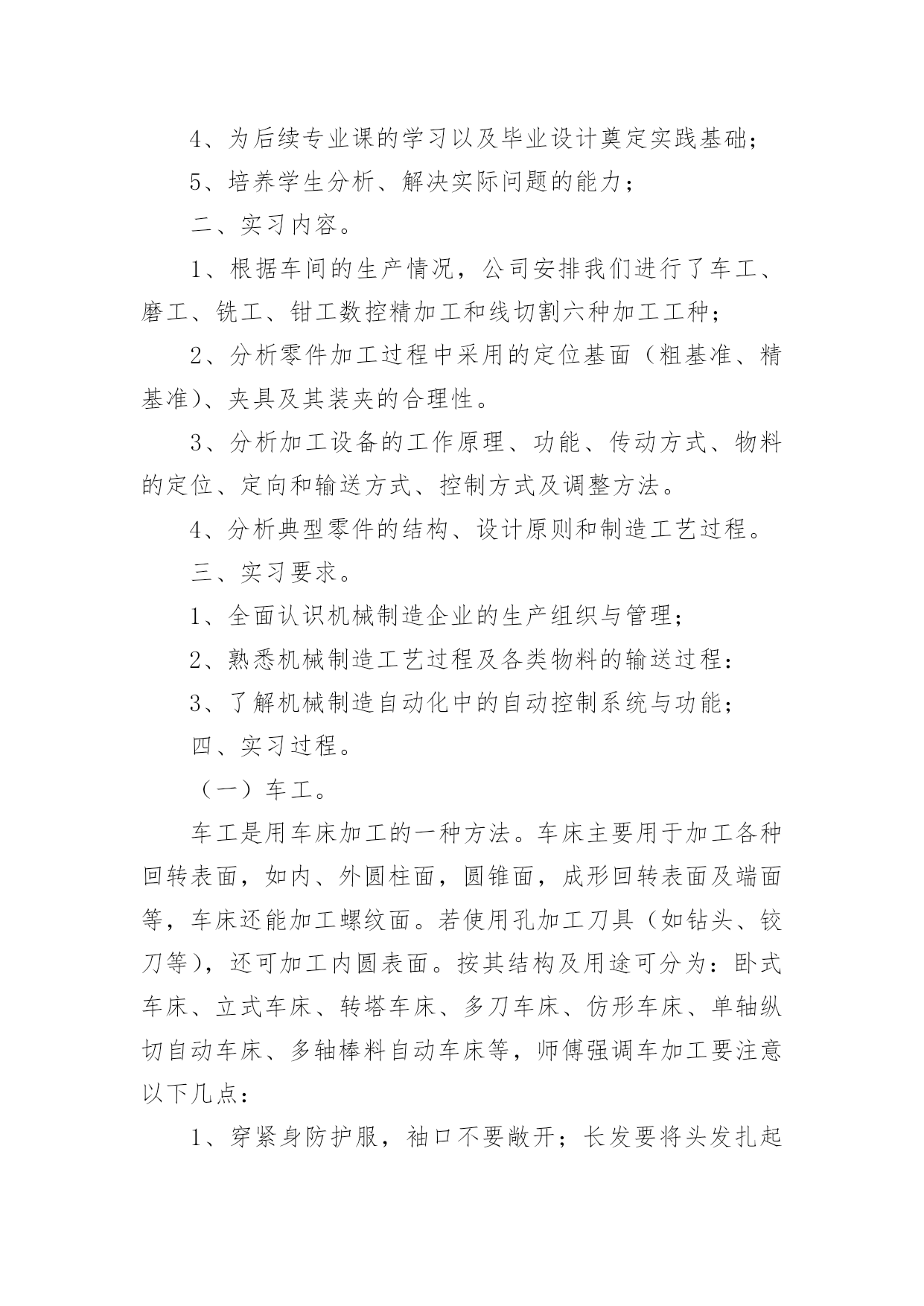 机械专业认识实习报告随着个人的文明素养不断提升,报告与我们的生活紧密相连,报告具有语言陈述性的特点。那么一般报告是怎么写的呢?下面是小编帮大家整理的机械专业认识实习报告,仅供参考,欢迎大家阅读。机械专业认识实习报告1生产实习是我们机械专业学习的一个重要环节,是我们将课堂上学到的理论知识与实际相结合的一个很好的机会,是对我们所学到的知识和检测所学知识的掌握程度一种重要手段。我们在xx模具分厂进行了为期两周的生产认识实习,在实习当中,我们学到了许多课本上没有的知识,培养我们的实践能力和创新能力,开拓我们的视野,培养我们生产实际中研究、观察、分析、解决问题的能力,真的是受益匪浅。一、实习目的、方法及任务。认识实习是本专业教学计划中的一个重要的实践性教学环节,主要目的如下:1、使学生对机械设计、制造及其自动化全过程有一个完整的理性认识;2、在生产实际学习生产技术、制造工艺、生产管理、加工设备、质量控制、车间及工厂布置等方面的知识;3、验证、巩固、加深和扩大已学课程的理论知识;4、为后续专业课的学习以及毕业设计奠定实践基础;5、培养学生分析、解决实际问题的能力;二、实习内容。1、根据车间的生产情况,公司安排我们进行了车工、磨工、铣工、钳工数控精加工和线切割六种加工工种;2、分析零件加工过程中采用的定位基面(粗基准、精基准)、夹具及其装夹的合理性。3、分析加工设备的工作原理、功能、传动方式、物料的定位、定向和输送方式、控制方式及调整方法。4、分析典型零件的结构、设计原则和制造工艺过程。三、实习要求。1、全面认识机械制造企业的生产组织与管理;2、熟悉机械制造工艺过程及各类物料的输送过程:3、了解机械制造自动化中的自动控制系统与功能;四、实习过程。(一)车工。车工是用车床加工的一种方法。车床主要用于加工各种回转表面,如内、外圆柱面,圆锥面,成形回转表面及端面等,车床还能加工螺纹面。若使用孔加工刀具(如钻头、铰刀等),还可加工内圆表面。按其结构及用途可分为:卧式车床、立式车床、转塔车床、多刀车床、仿形车床、单轴纵切自动车床、多轴棒料自动车床等,师傅强调车加工要注意以下几点:1、穿紧身防护服,袖口不要敞开;长发要将头发扎起来;在操作时,不能戴手套。2、在机床主轴上装卸卡盘要停机后进行,不可用电动机的力量来取卡盘。3、夹持工件的卡盘、拨盘、鸡心夹的凸出部分最好使用防护罩,以免绞住衣服或身体的其他部分,如无护罩,操作时就注意离开,不要靠得太近。4、车削细长工件时,为保证安全应采用中心架或跟刀架,长出车床部分应有标志。5、车削形状不规则的工件时,应装平衡块,并试转平衡后再切削。6、对切削下来的带状切屑、螺旋状长切屑,应用钩子及时清除,切忌用手拉。(二)磨削加工工。由于砂轮在磨削加工时具有超高速性、易脆性等特点,相比其他工种,更易造成安全事故,1、严禁两人或多人同时操纵一台磨床。更换新砂轮时,必须进行静平衡试验。2、磨削工件时,不能进刀过猛,以防止零件烧伤、退火现象发生,或砂轮破裂,造成设备损坏及人身安全事故。3、操作时应尽量避免正对砂轮,以防砂轮飞溅伤人。5、平面磨床吸盘可能失灵,工件未被吸稳,不得开动砂轮,防备工件飞出伤人或损坏设备。6、换向挡块必须仔细定位,防止机床部件越程,砂轮碰在机床上。7、测量和装卸工件时,必须停止工件转动。机床运转时严禁用手或其他身体部位接触工件、砂轮和其它机床运动部件。8、测量工件时,应将砂轮进给手轮退刀,防止砂轮快速引进时与工件发生碰撞。9、结束工作时,必须使各个液压开关处于停止位置,开车前也需确认。(三)钳工。钳工是以手工操作为主,使用各种工具来完成零件的加工、装配和修理等工作。与机械加工相比,劳动强度大、生产效率低,但是可以完成机械加工不便加工或难以完成的工作,同时设备简单,故在机械制造和修配工作中,仍是不可缺少的重要工种。钳工的常用设备有钳工工作台、台虎钳、砂轮等。钳工的工作范围有划线、錾削、锯削、锉削、刮削、研磨、钻孔、扩孔、铰孔、锪孔、攻螺纹、套螺纹、装配、和修理等等。其中钳工的实习安全技术为:1、钳台要放在便于工作和光线适宜的地方;钻床和砂轮一般应放在场地的边缘,以保证安全。2、使用机床、工具(如钻床、砂轮、手电钻等),要经常检查,发现损坏不得使用,需要修好再用。3、台虎钳夹持工具时,不得用锤子锤击台虎手柄或钢管施加夹紧力。4、使用电动工具时,要有绝缘保护和安全接地措施。使用砂轮时,要戴好防护眼镜。在钳台上进行操作加工要有防护网。5、钳工是以手工操作为主,使用各种工具来完成零件的加工、装配和修理等工作。与机械加工相比,劳动强度大、生产效率低,但是可以完成机械加工不便加工或难以完成的工作,同时设备简单,故在机械制造和修配工作中,仍是不可缺少的重要工种。钳工的常用设备有钳工工作台、台虎钳、砂轮等。钳工的工作范